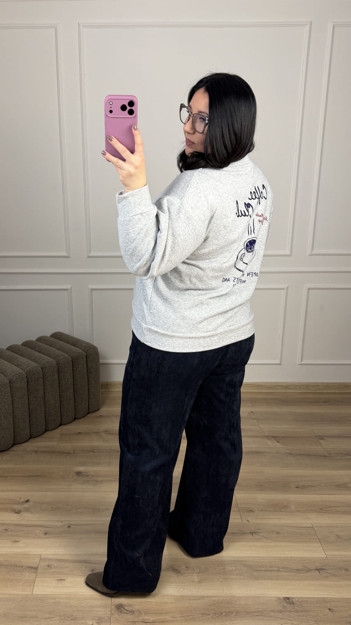 Klasyczna bluza z ozdobnymi plecami. Bluza o prostym klasycznym kroju, posiada okrągły dekolt, dużą kieszeń z przodu oraz ozdobny nadruk na plecach. Idealna w połączaniu z klasycznymi czarnymi spodniami jak i z jeansami.