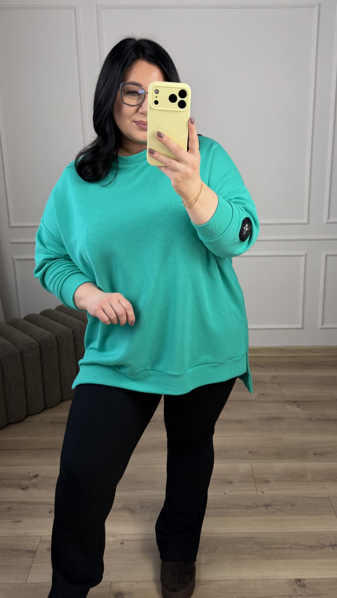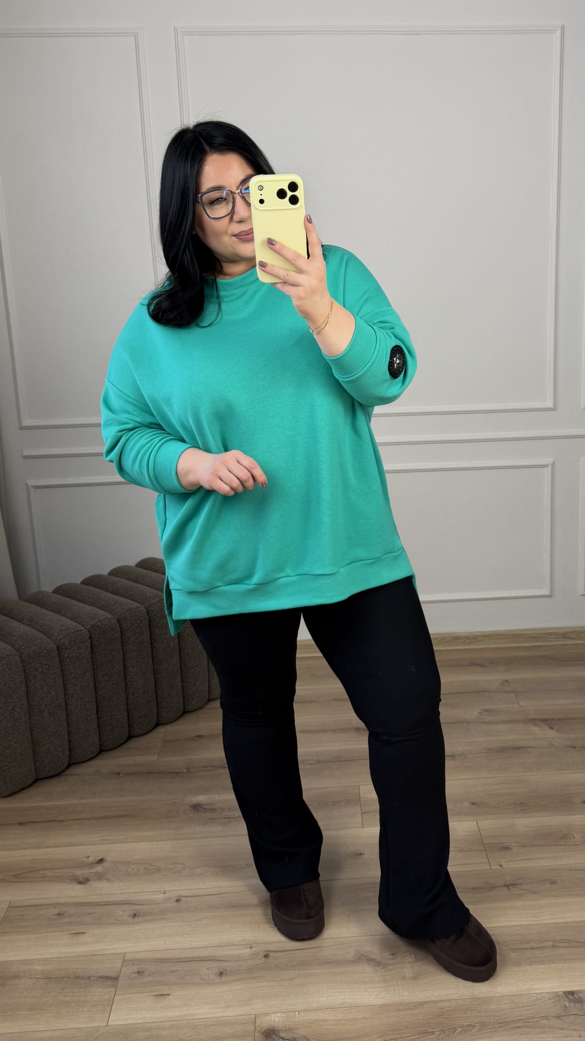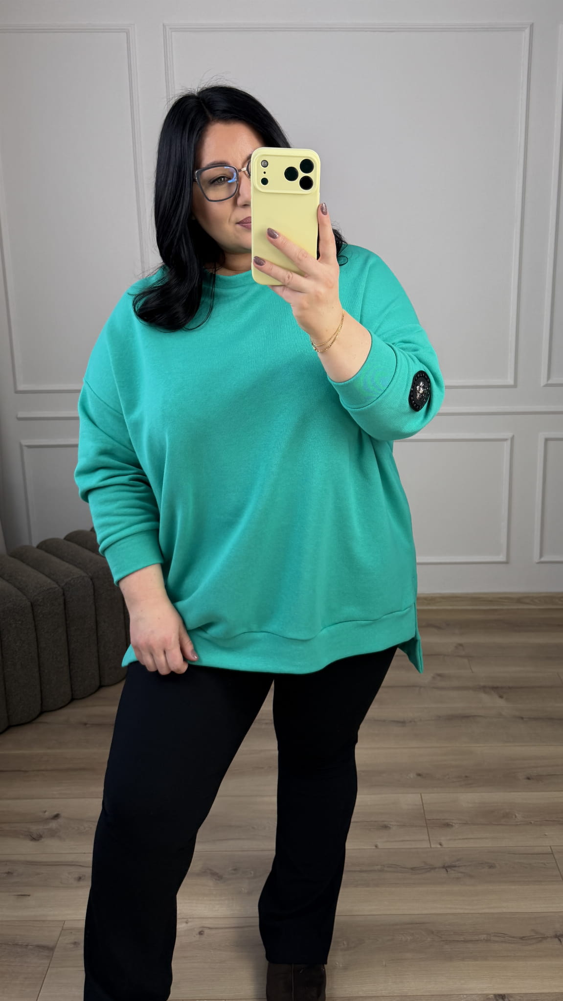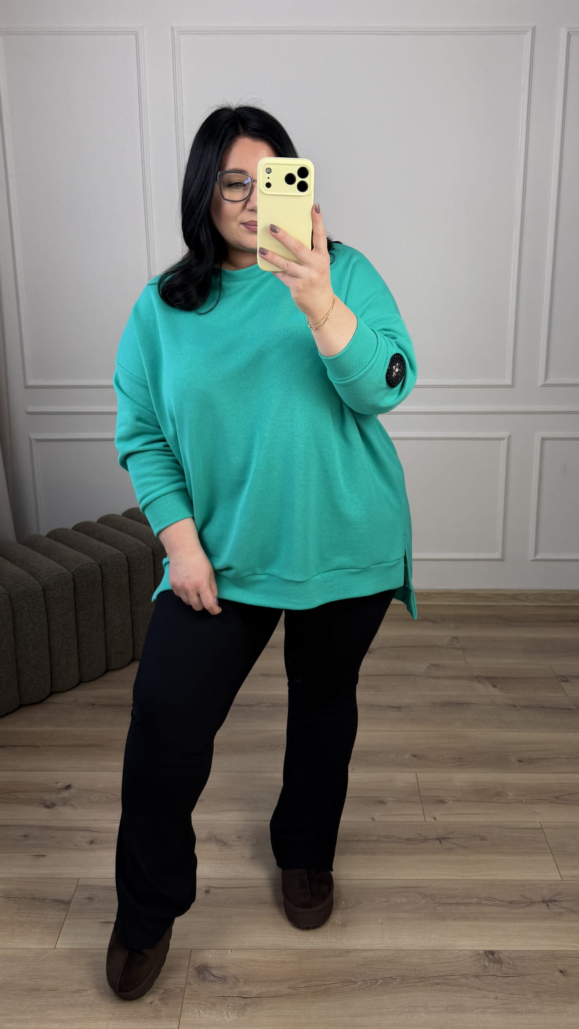 Bluza o kroju oversize. Z okrągłym dekoltem zakończonym ściągaczem. Rękaw 7/8 zakończony ściągaczem z okrągłą naszywką. Przód delikatnie krótszy oraz delikatne rozcięcia po bokach. Można stylizować na sportowo oraz na elegancko.