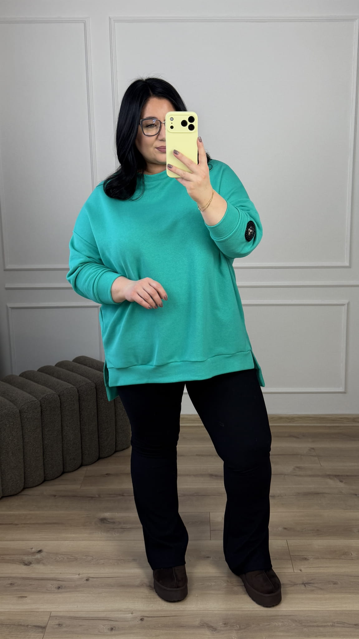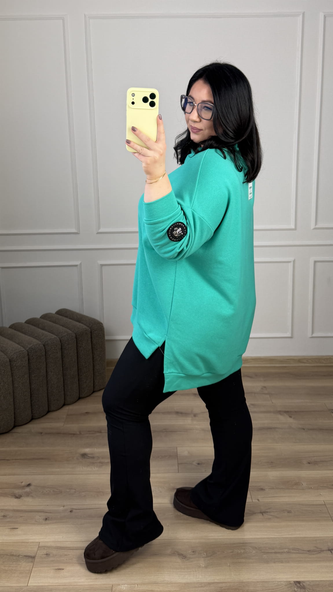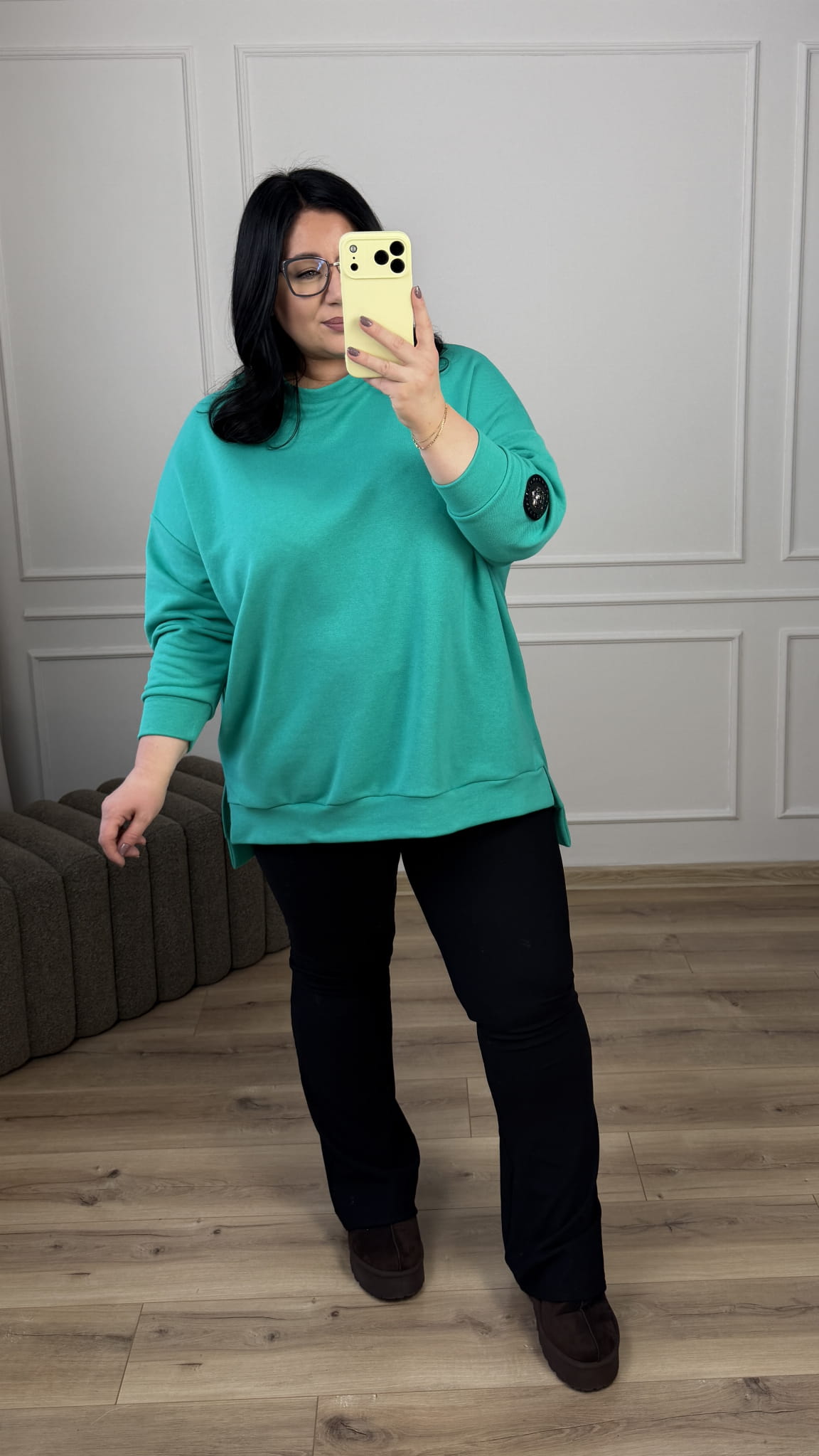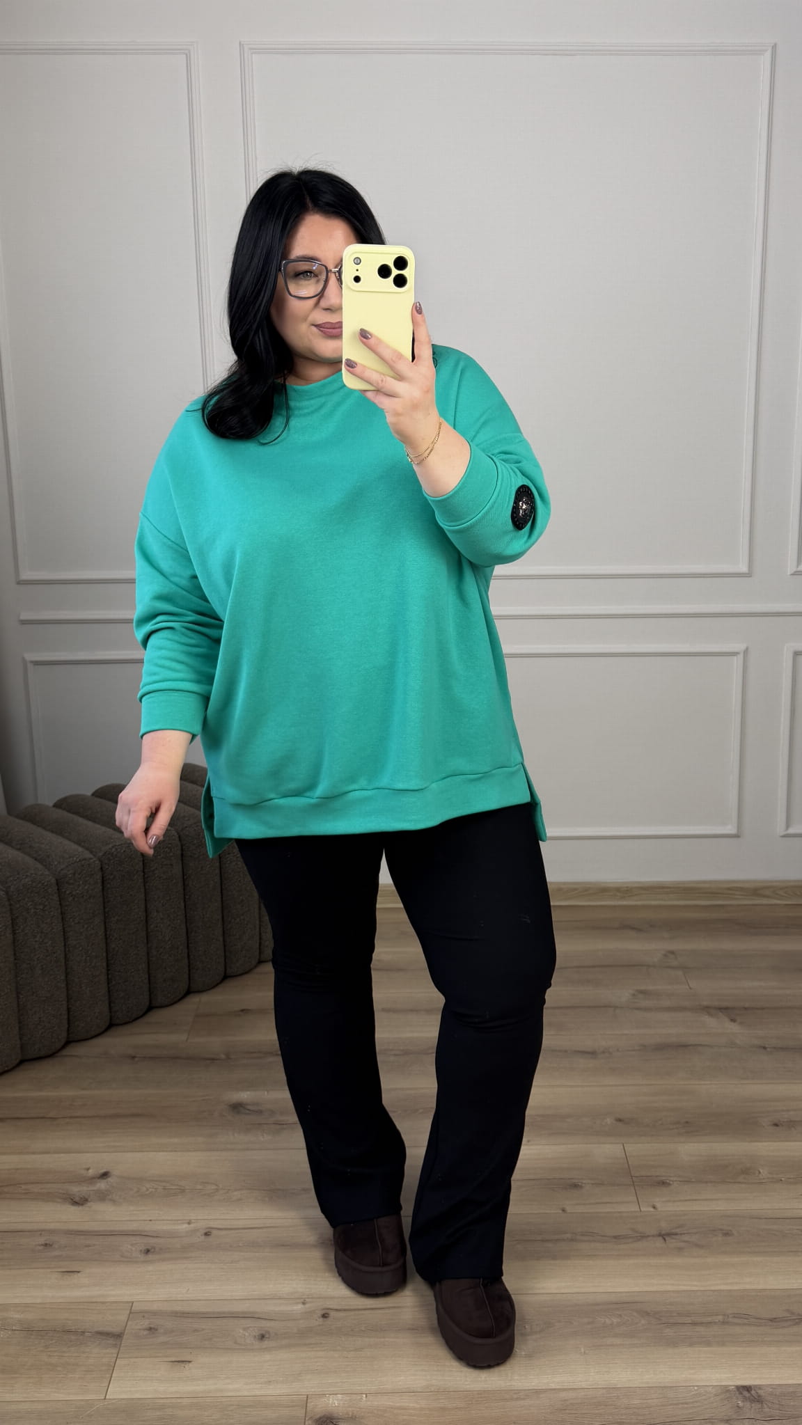 Bluza o kroju oversize. Z okrągłym dekoltem zakończonym ściągaczem. Rękaw 7/8 zakończony ściągaczem z okrągłą naszywką. Przód delikatnie krótszy oraz delikatne rozcięcia po bokach. Można stylizować na sportowo oraz na elegancko.