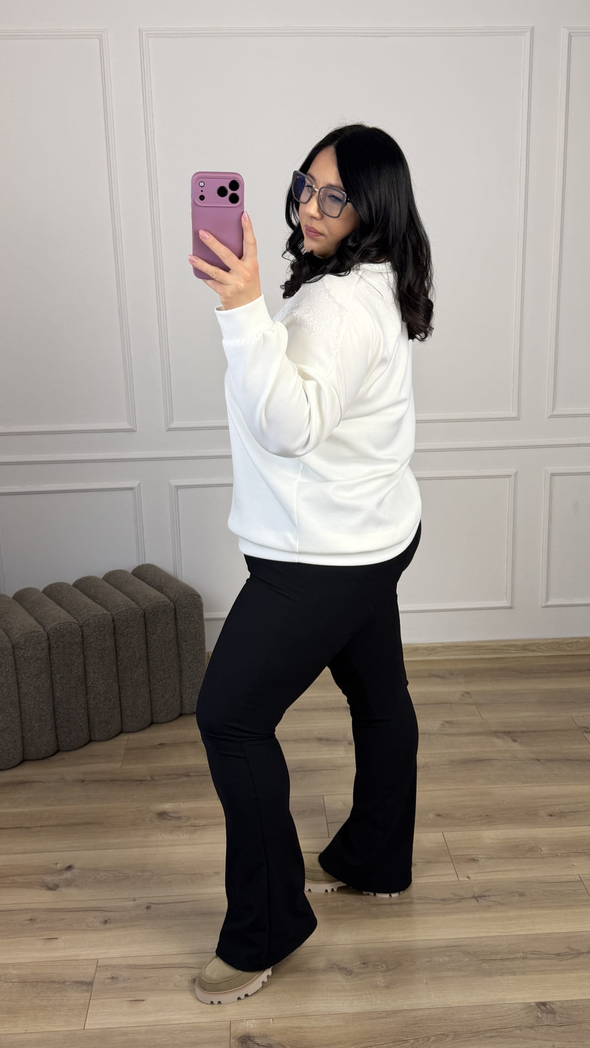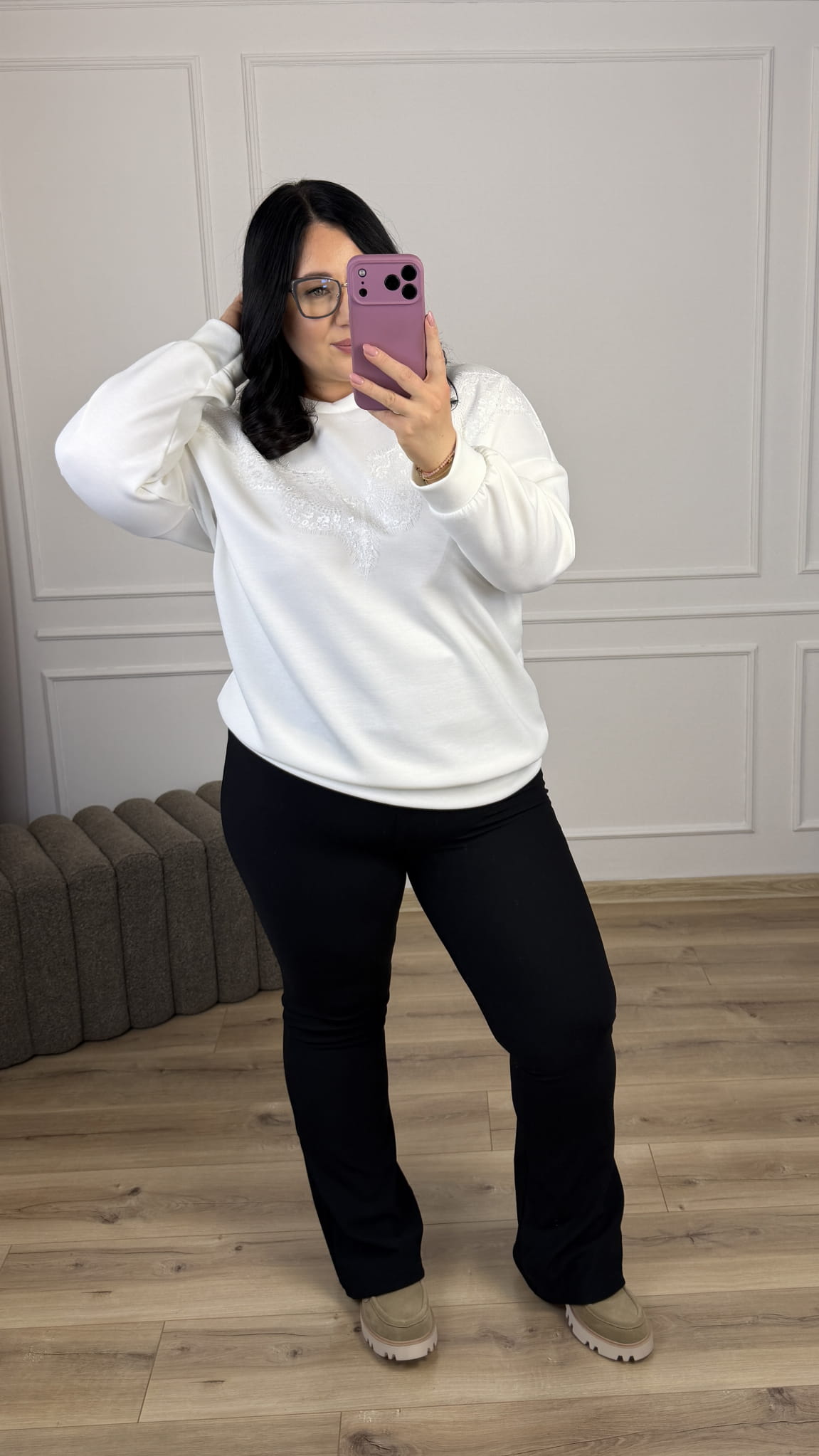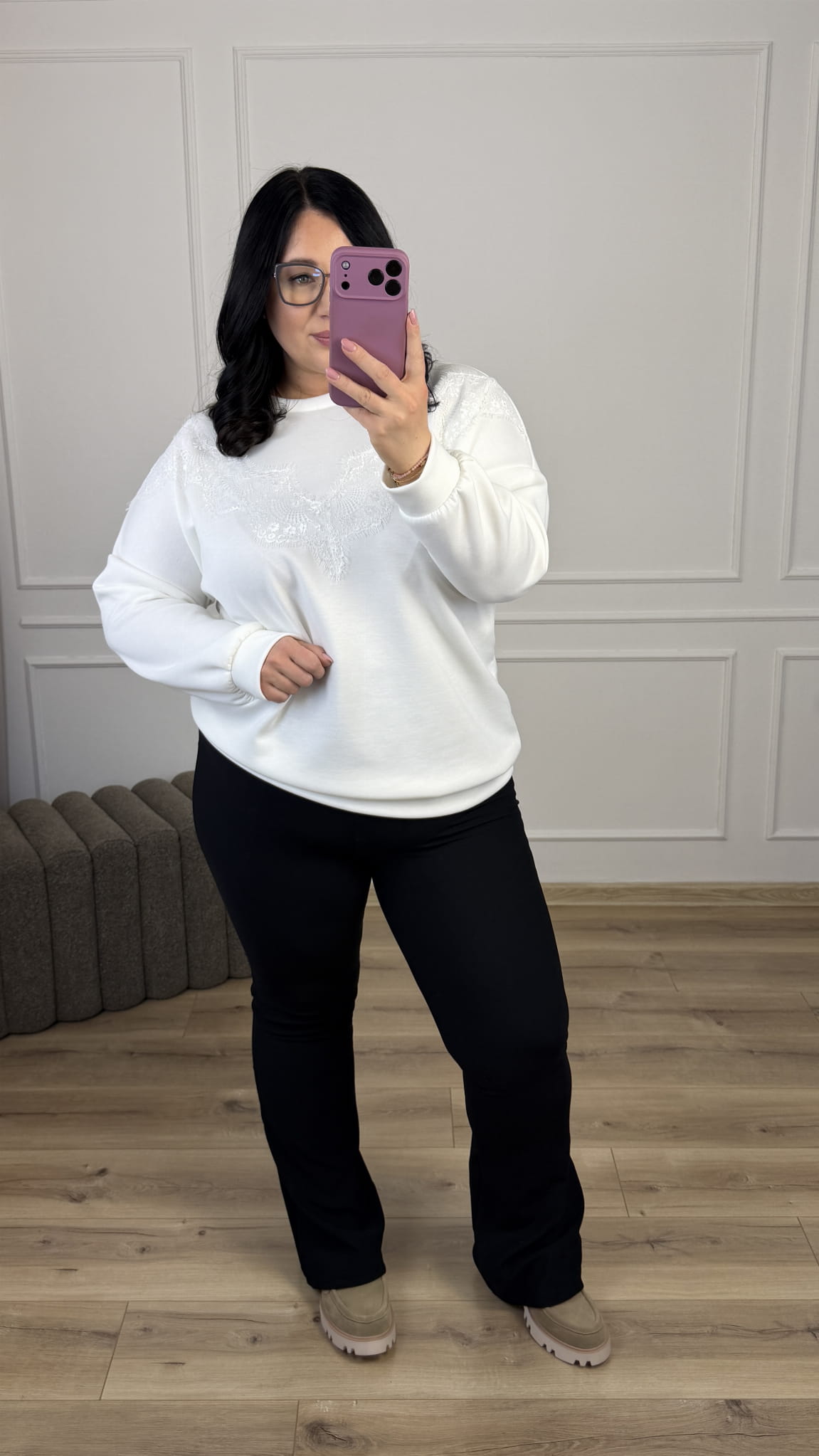 Bluza zakładana przez głowę z materiału typu masełko o klasycznym kroju. Bluza posiada długi rękaw wykończony ściągaczem z ozdobnym koronkowym detalem z przodu. Model świetnie sprawdzi się w połączeniu ze spódnicą czy ze spodniami.