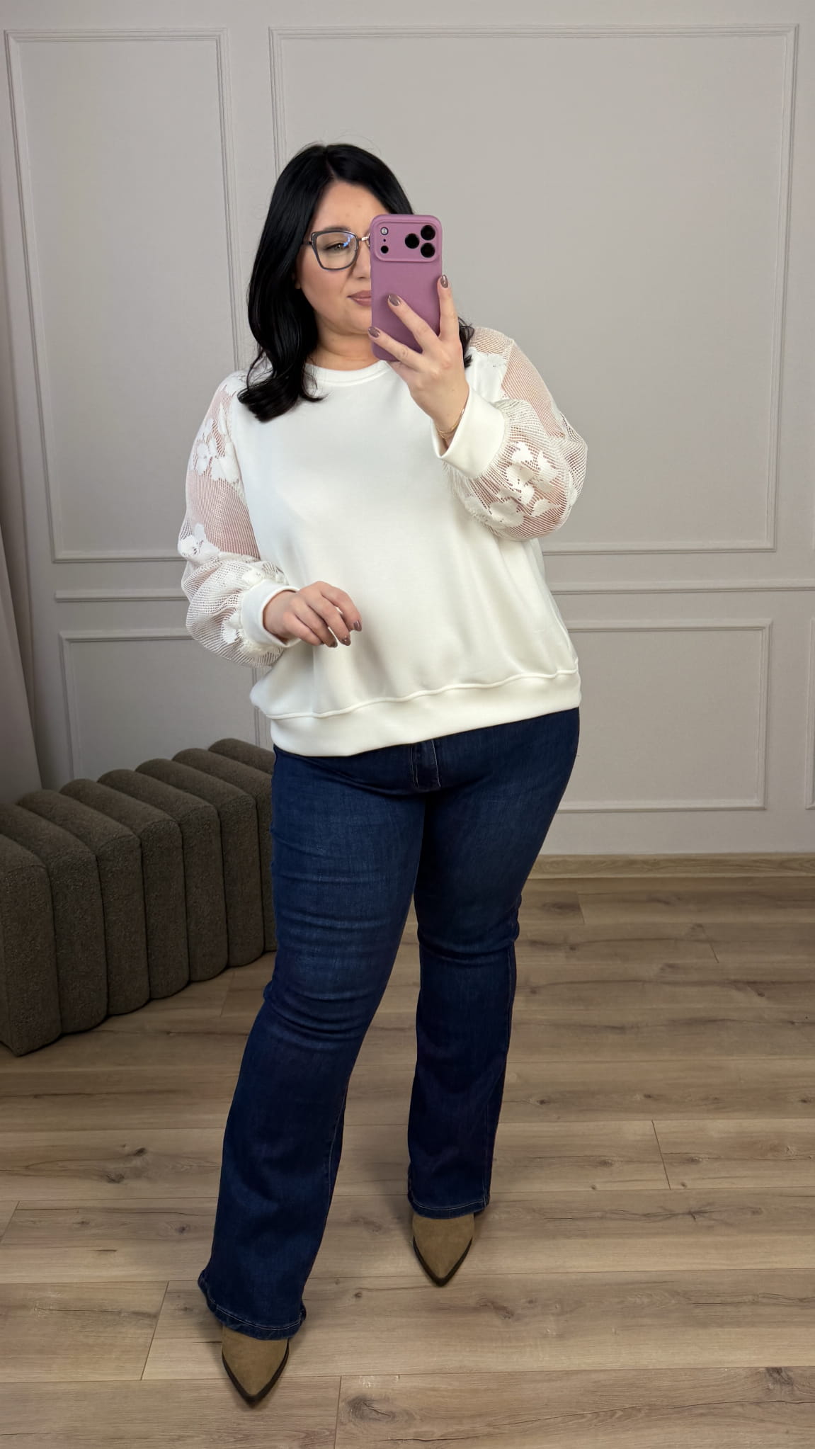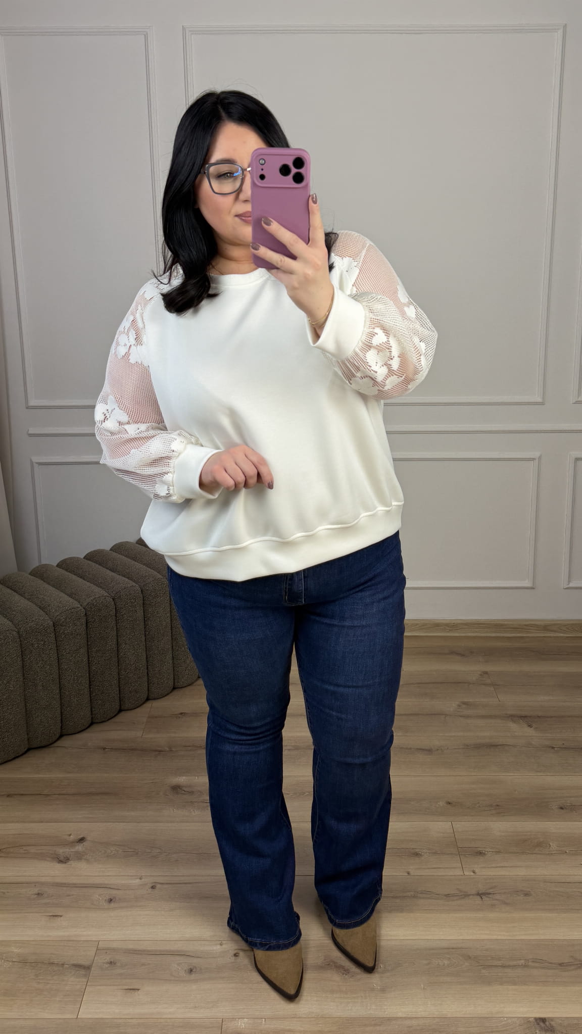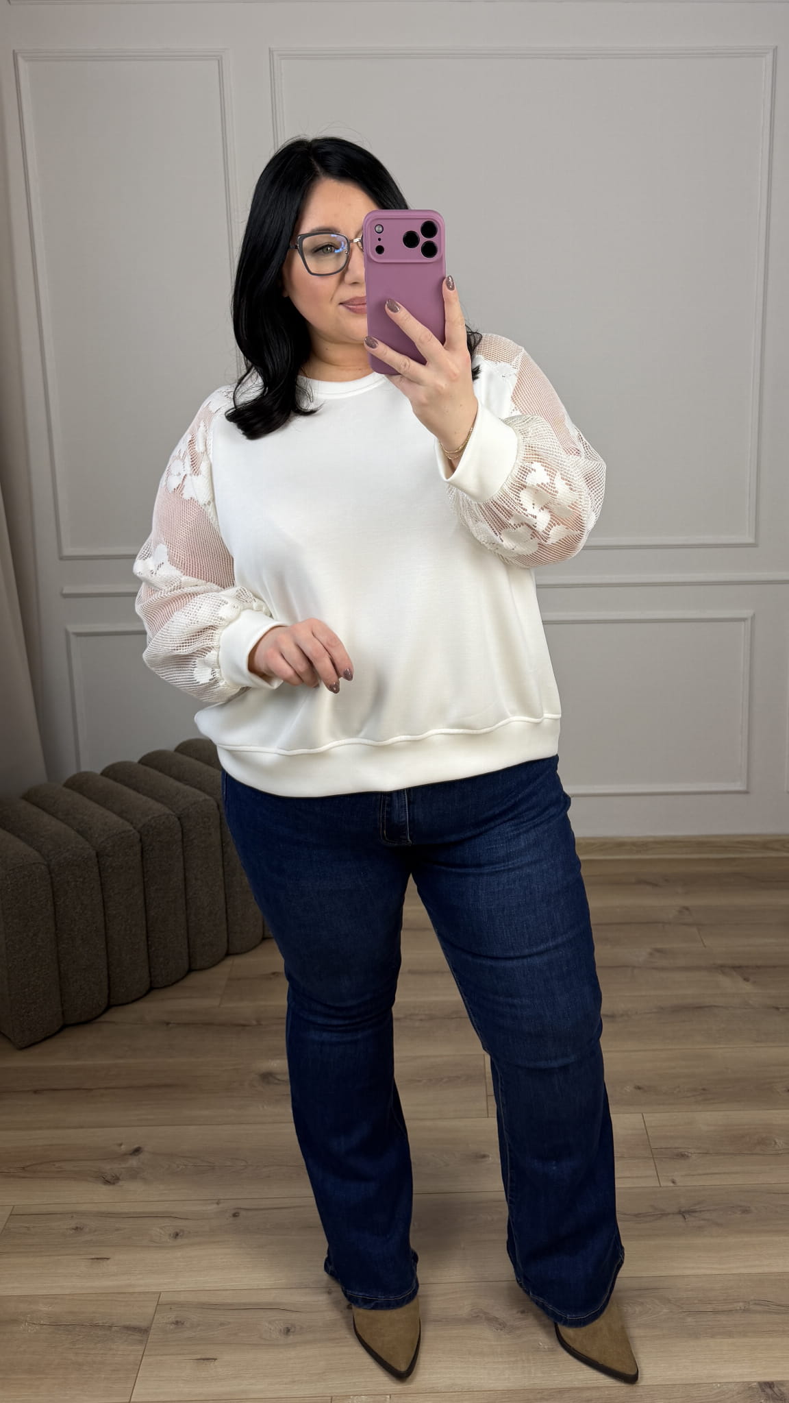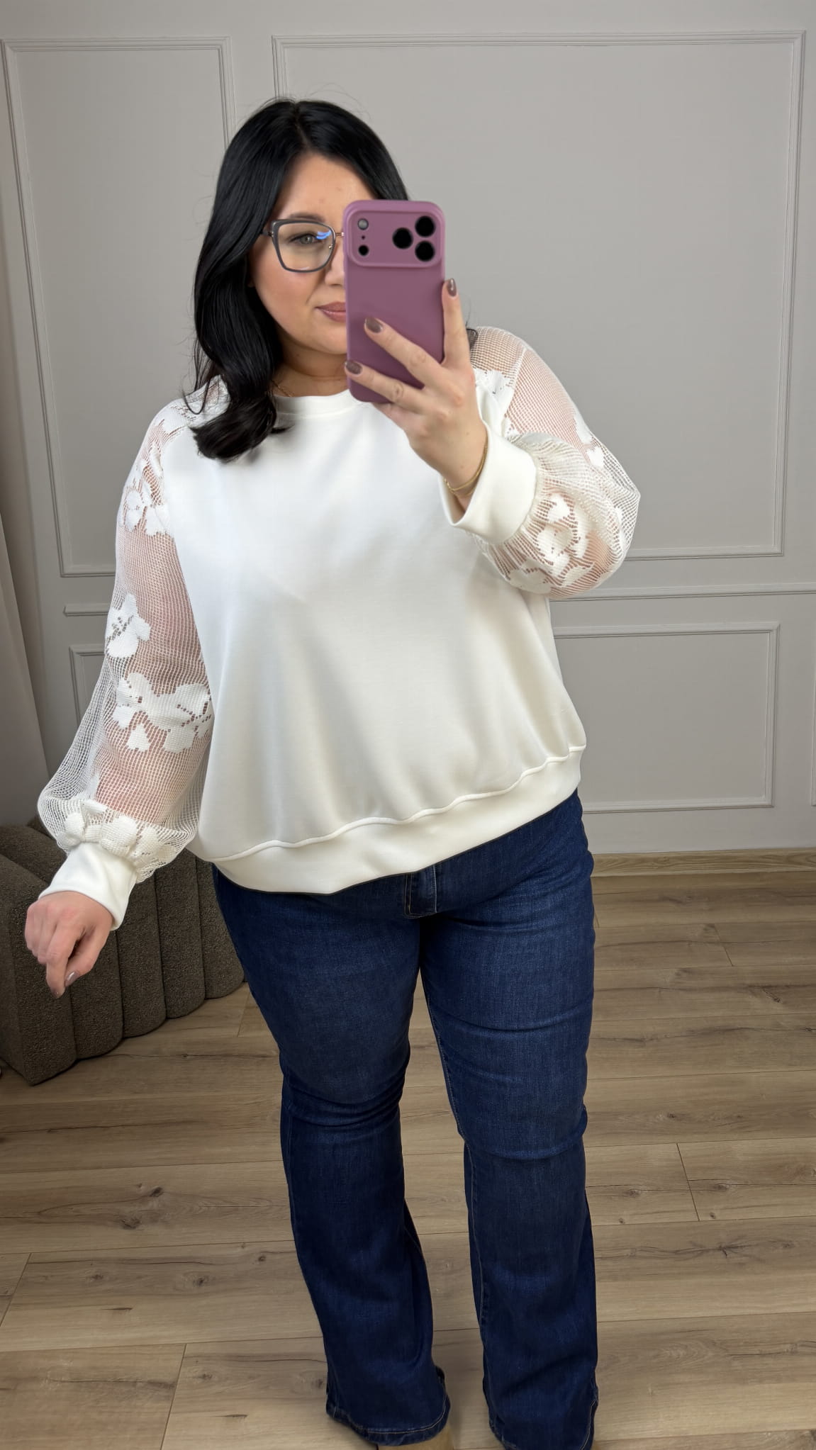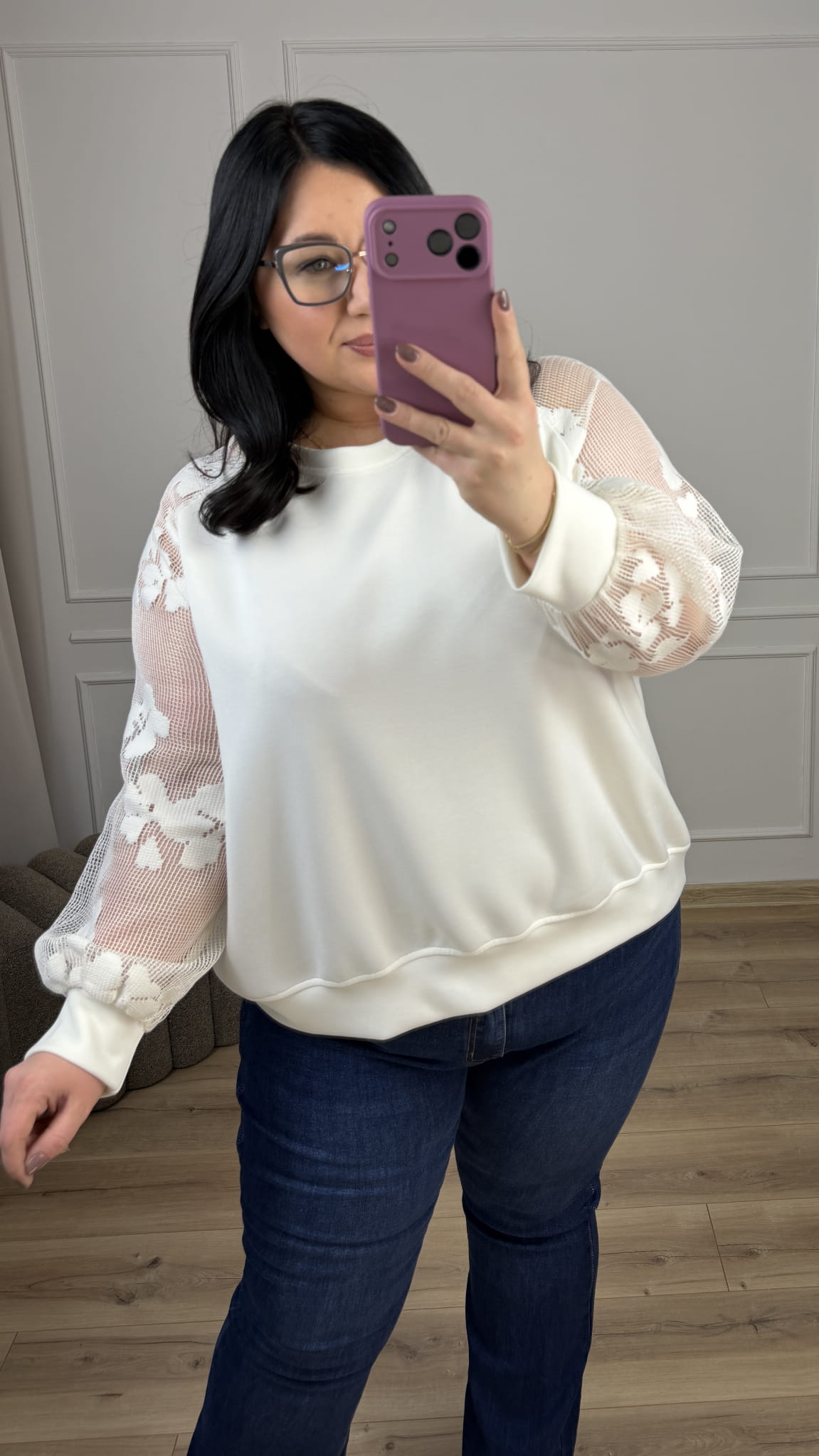 Efektowna bluza z materiału typu masełko z siateczkowymi rękawami. Bluza o klasycznym luźnym kroju, okrągły dekolt oraz siateczkowe rękawy z kwiatowym wzorem. Bluza dzięki ozdobnym rękawom świetnie sprawdzi się na co dzień jak i również na większe wyjścia. Idealna w połączaniu z klasycznymi czarnymi spodniami jak i z jeansami.