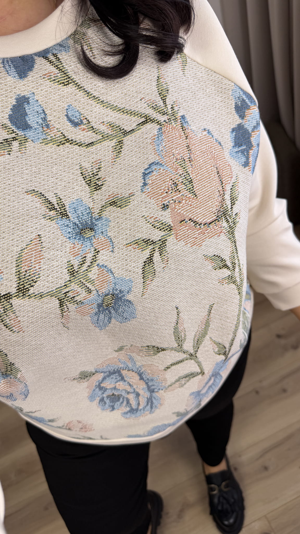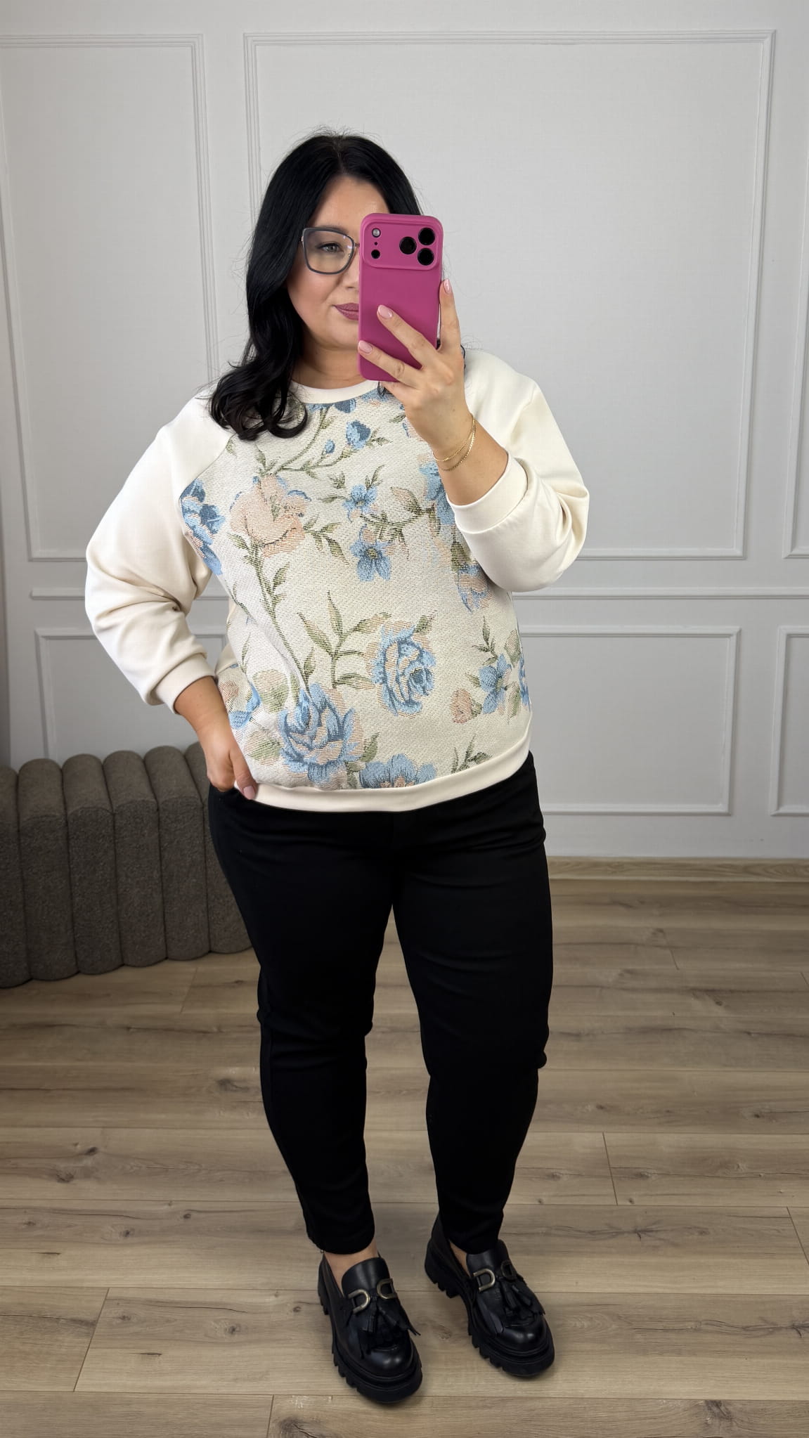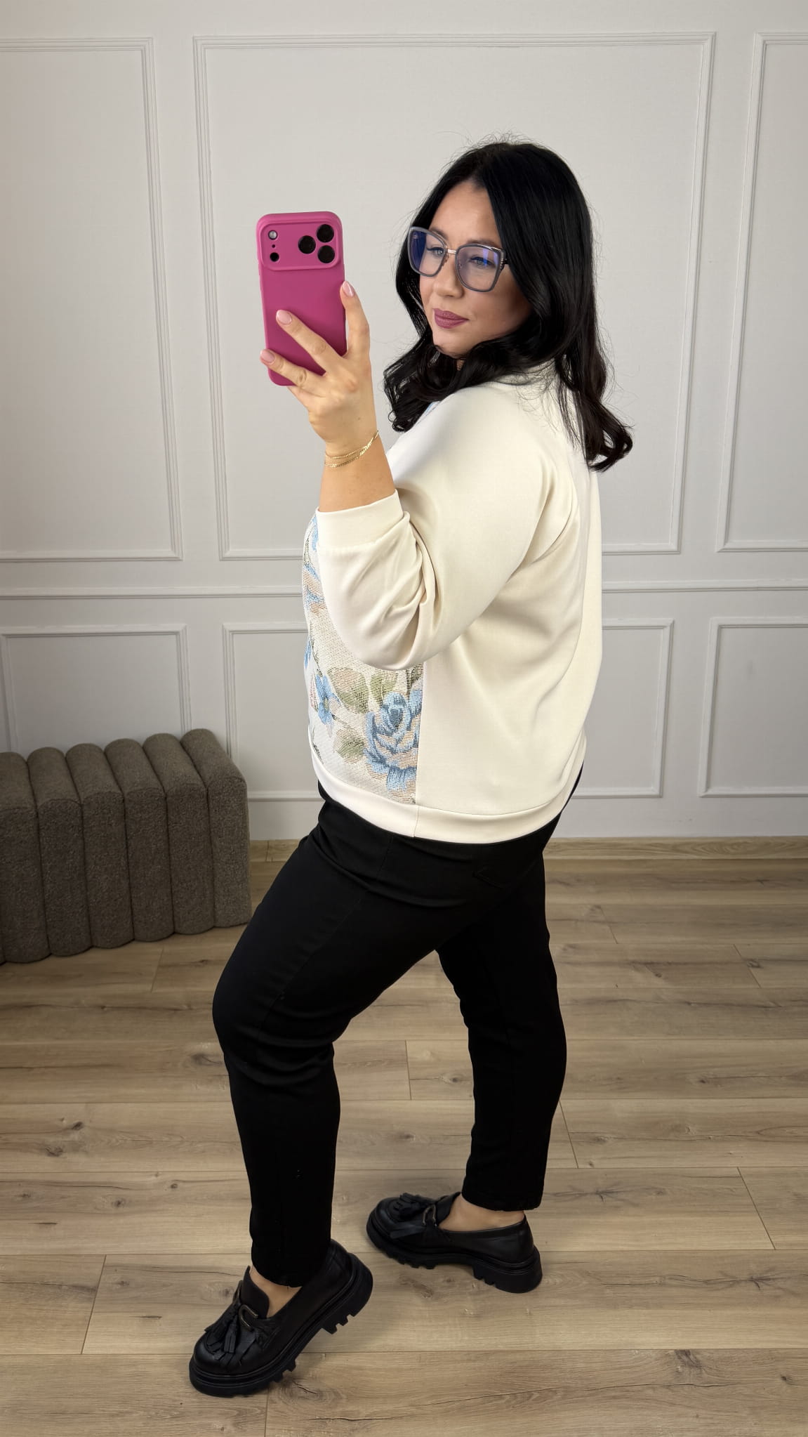 Stylowa bluza ze zdobionym materiałem z przodu, która łączy wygodę z wyjątkowym designem. Model dzięki uniwersalnemu wzorowi świetnie sprawdzi się w casualowych stylizacjach jak i bardziej kobiecych. Bluza z bawełny masełkowej miła w dotyku, zakończona ściągaczem.
