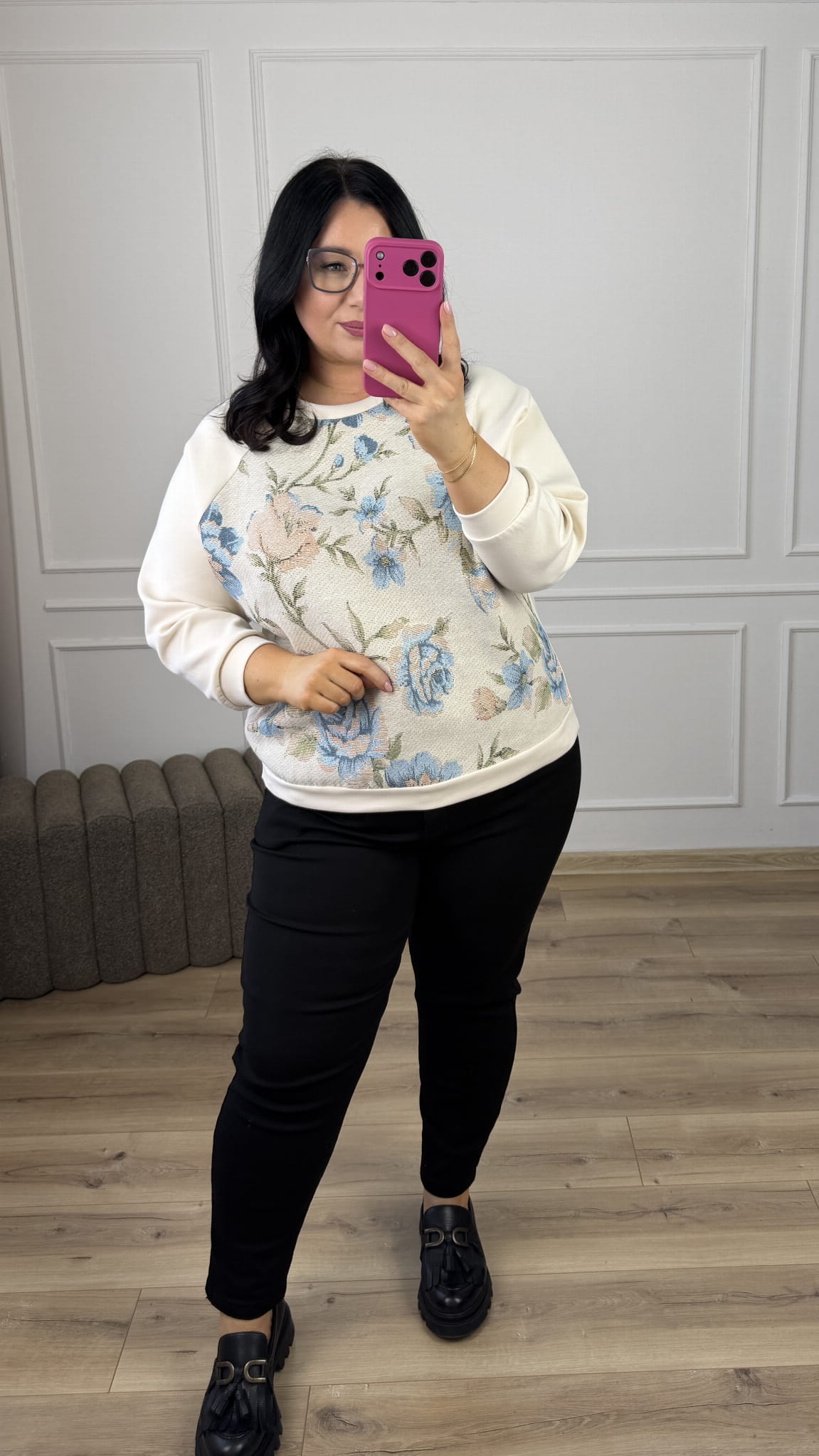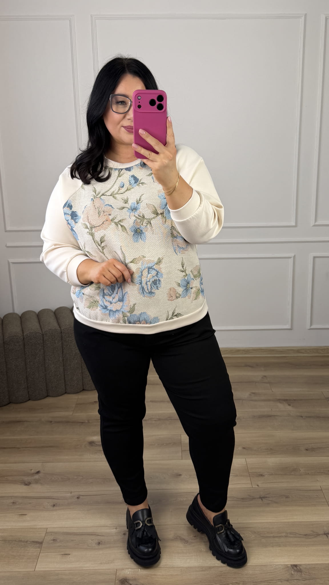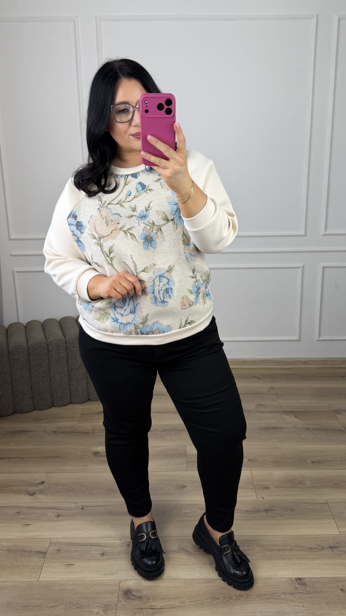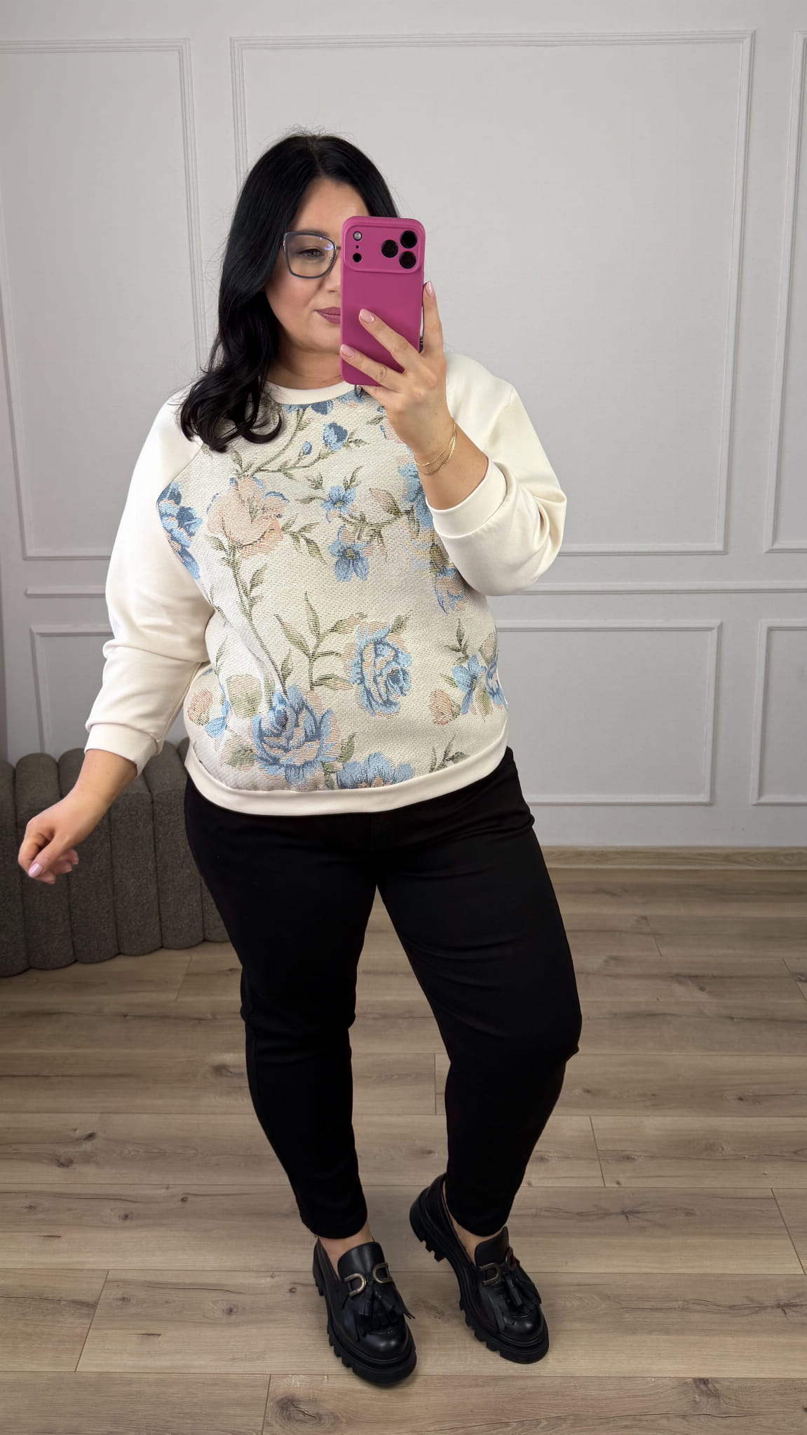 Stylowa bluza ze zdobionym materiałem z przodu, która łączy wygodę z wyjątkowym designem. Model dzięki uniwersalnemu wzorowi świetnie sprawdzi się w casualowych stylizacjach jak i bardziej kobiecych. Bluza z bawełny masełkowej miła w dotyku, zakończona ściągaczem.