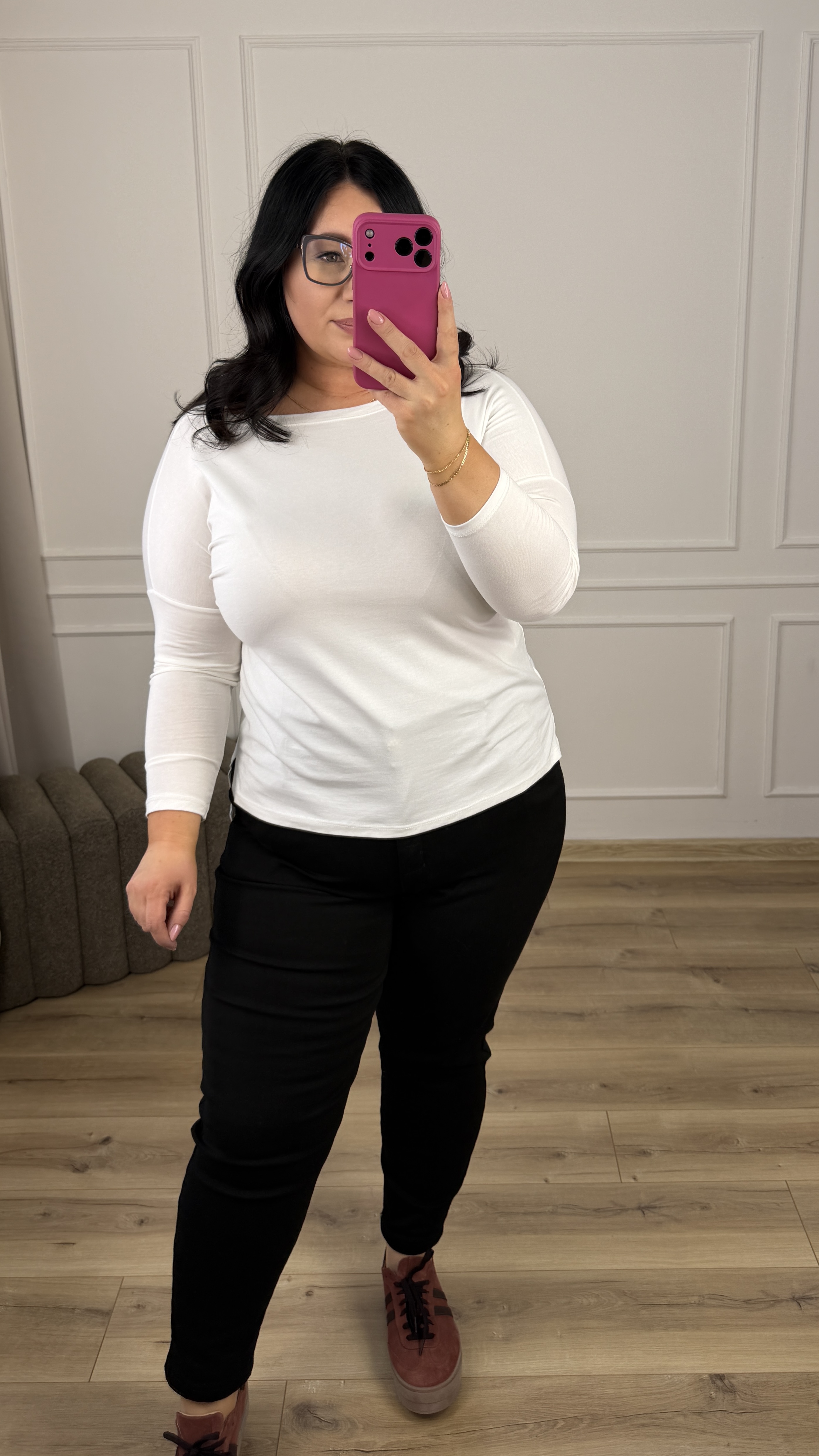Bazowa bluzka z bawełny z dekoltem typu łódka. Długi rękaw, delikatnie dłuższy tył. Model dzięki swojej uniwersalności świetnie sprawdzi się jako baza do większości wiosennych stylizacji.