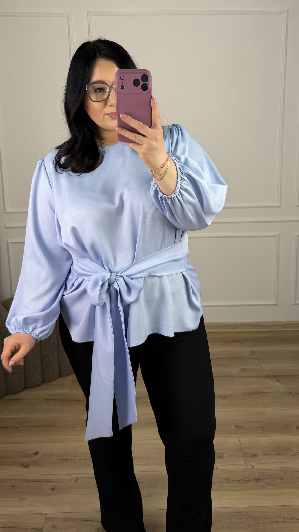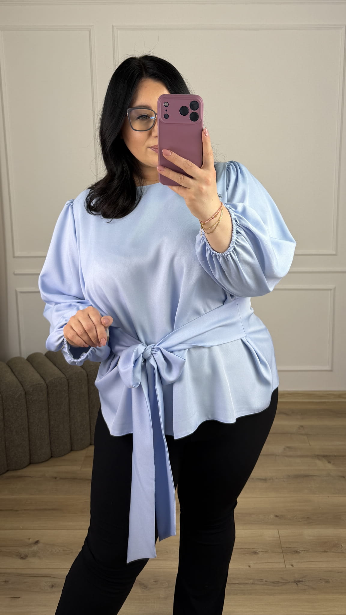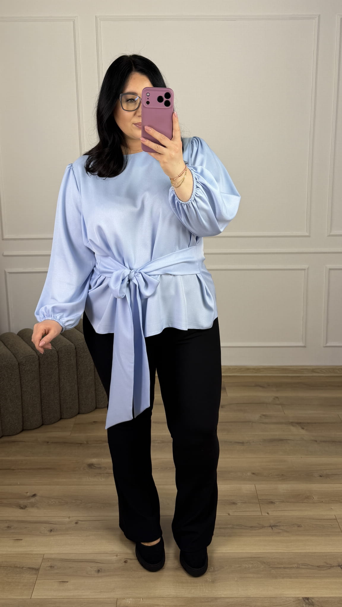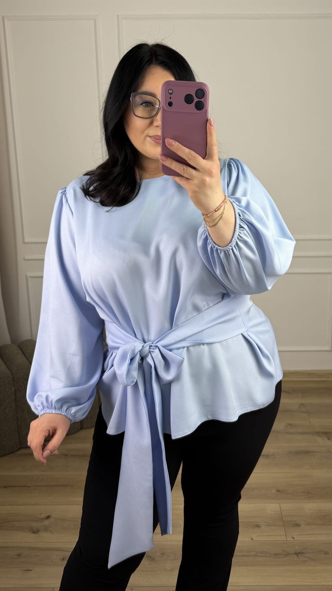 Efektowna bluzka z wiązaną kokardką - ty wybierasz gdzie ją zawiązać. Długi szeroki rękaw, okrągły dekolt. Prosty krój. Koszula dzięki wiązanej kokardzie świetnie wypełni każdą stylizację. Dostępna w 4 wiosennych kolorach.