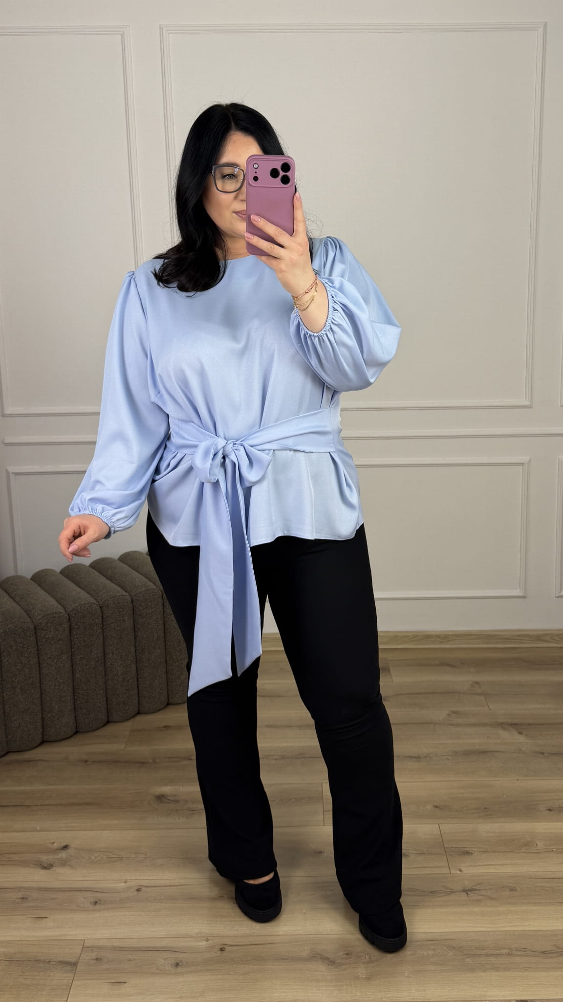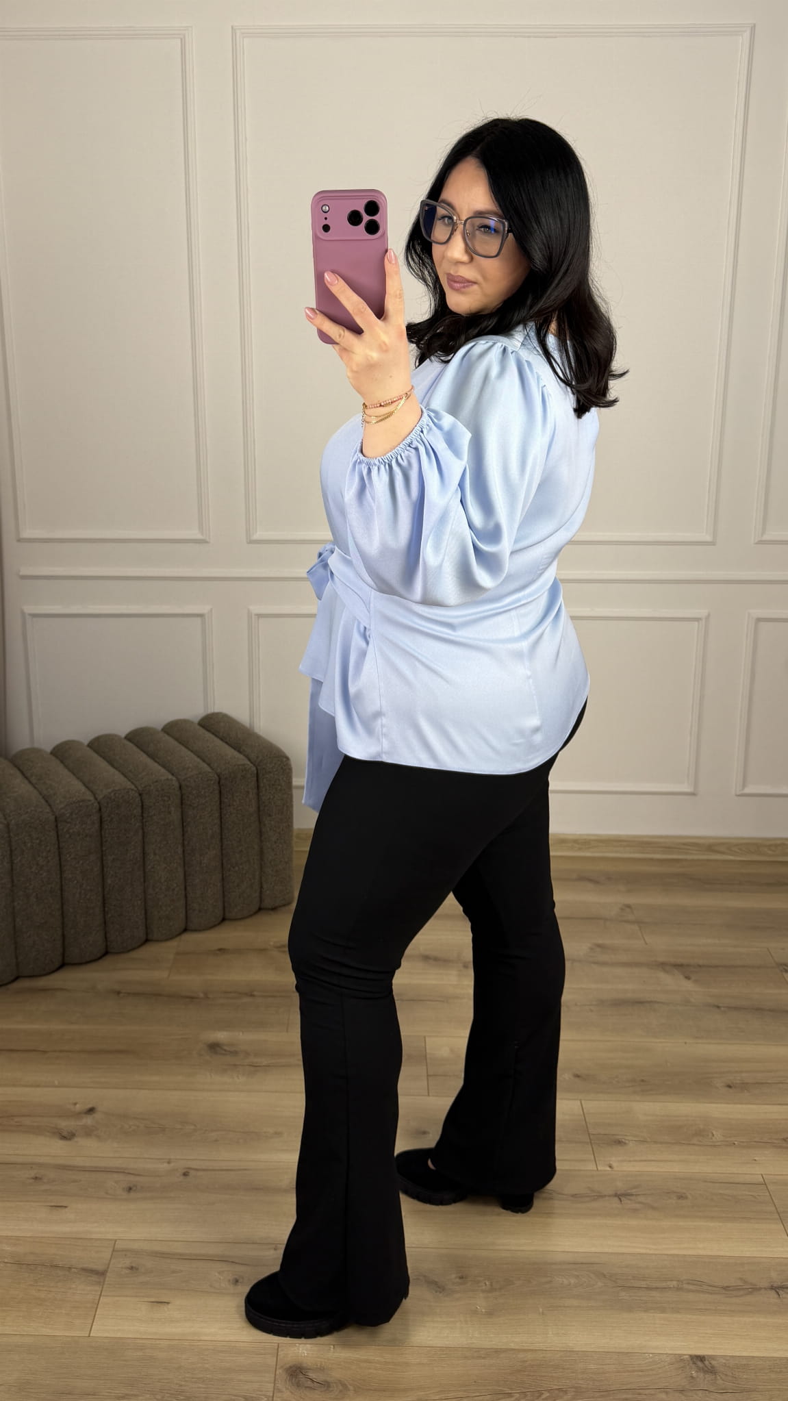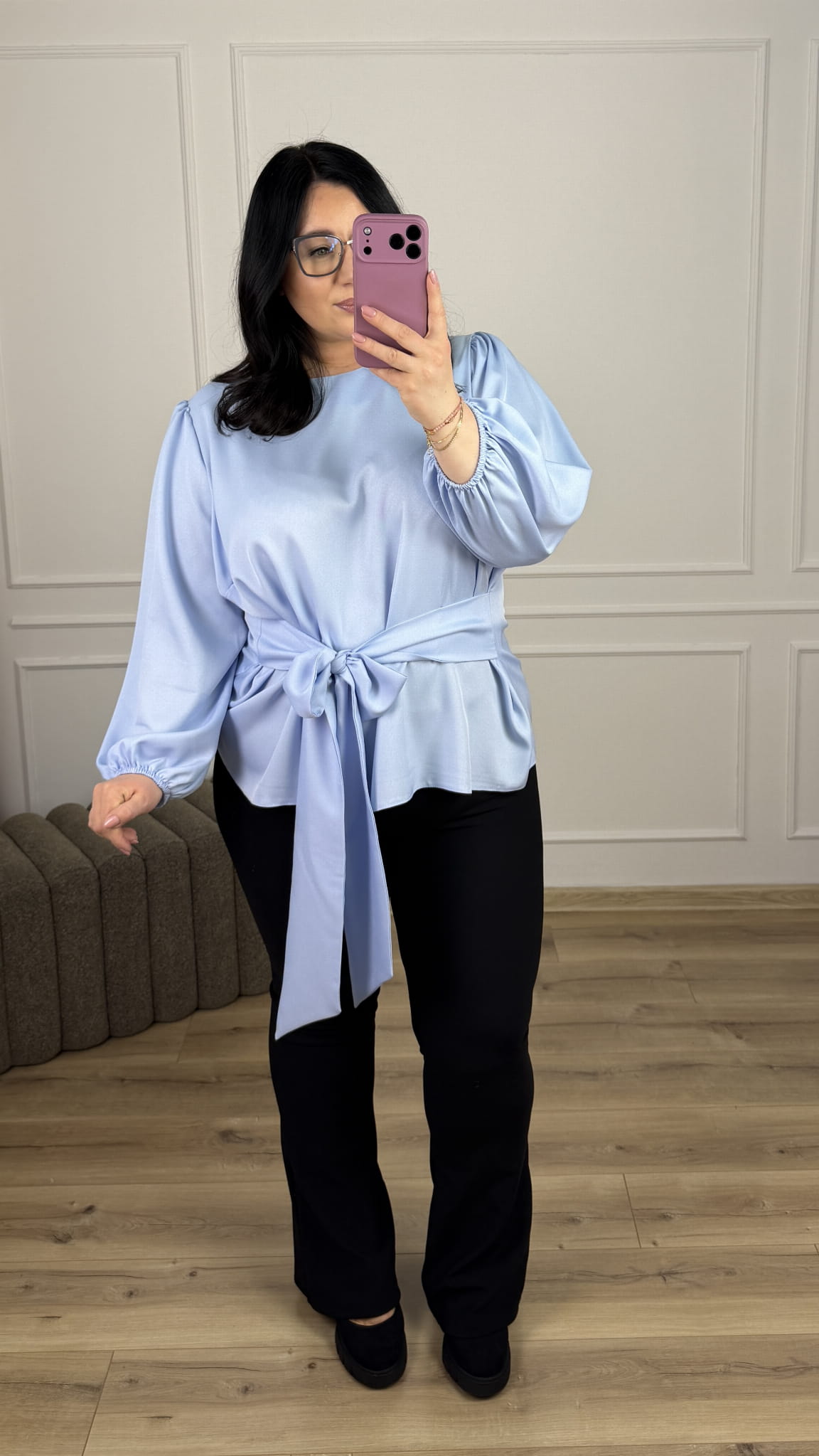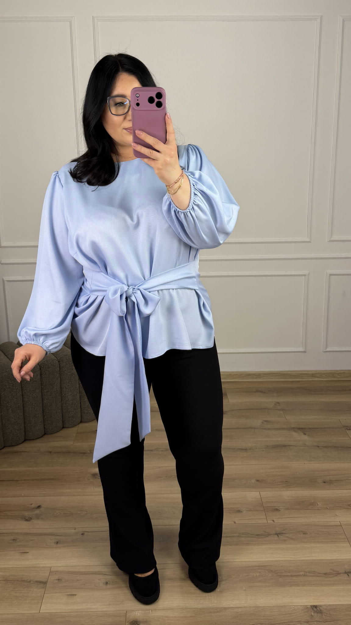 Efektowna bluzka z wiązaną kokardką - ty wybierasz gdzie ją zawiązać. Długi szeroki rękaw, okrągły dekolt. Prosty krój. Koszula dzięki wiązanej kokardzie świetnie wypełni każdą stylizację. Dostępna w 4 wiosennych kolorach.