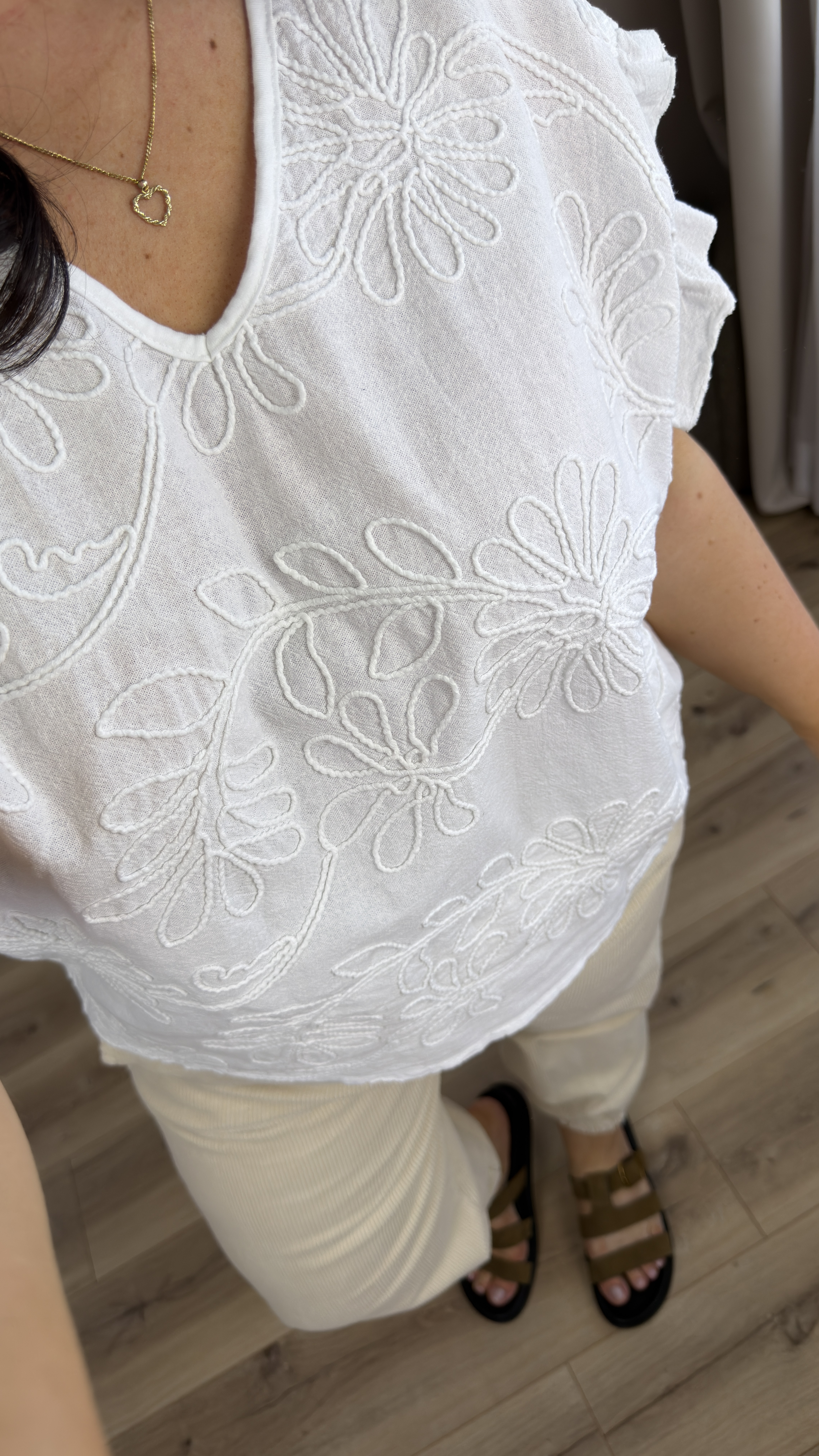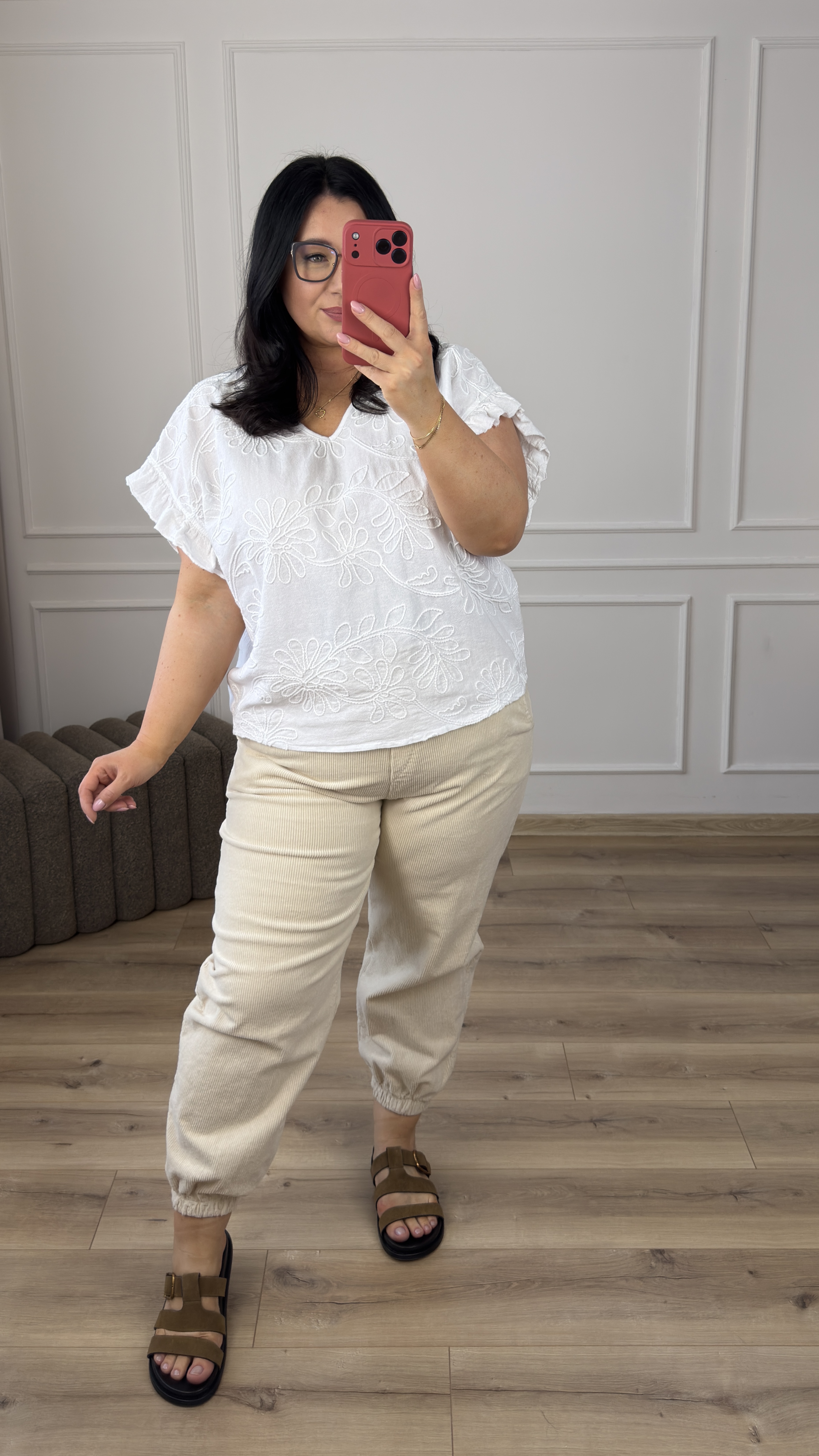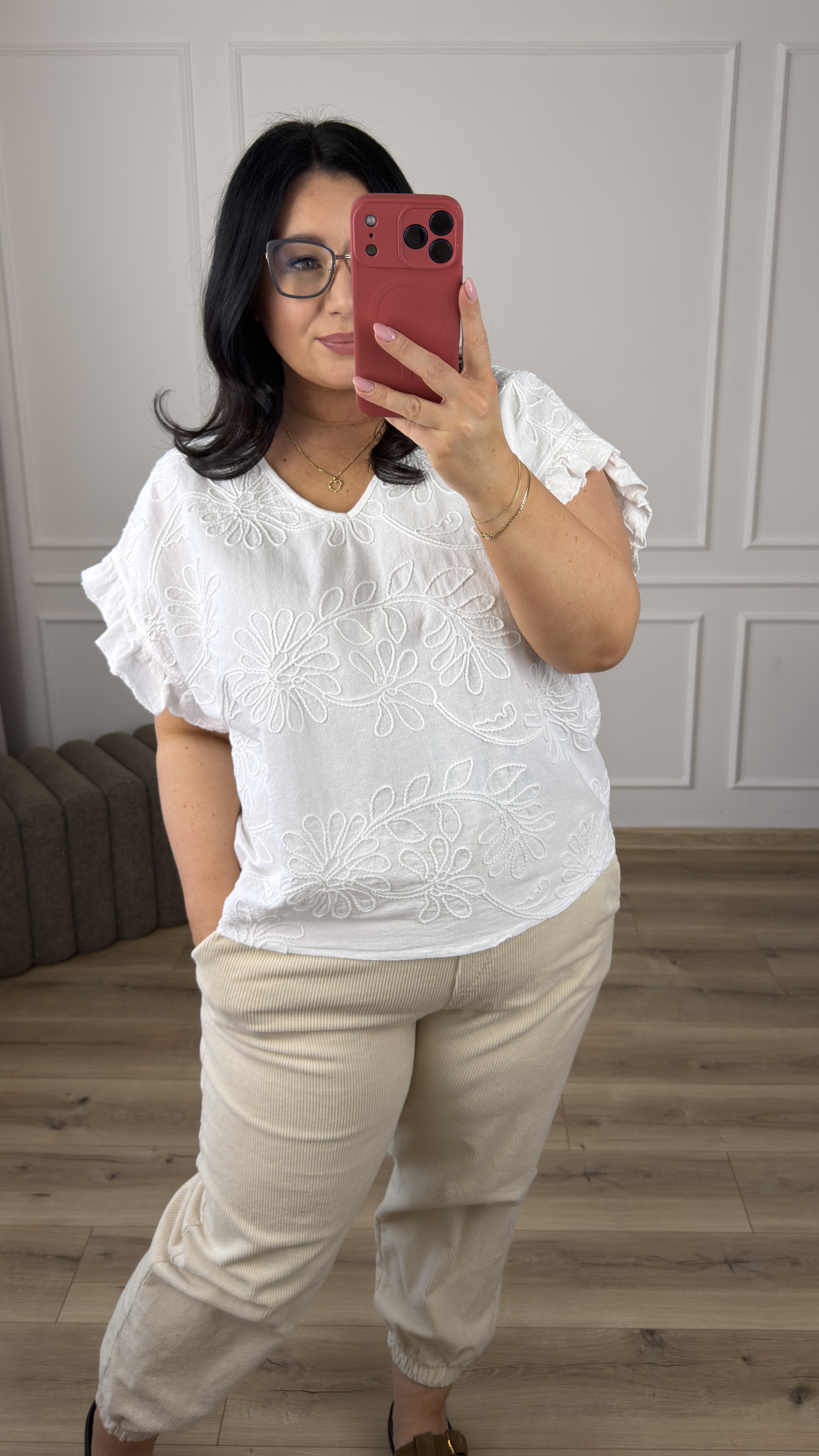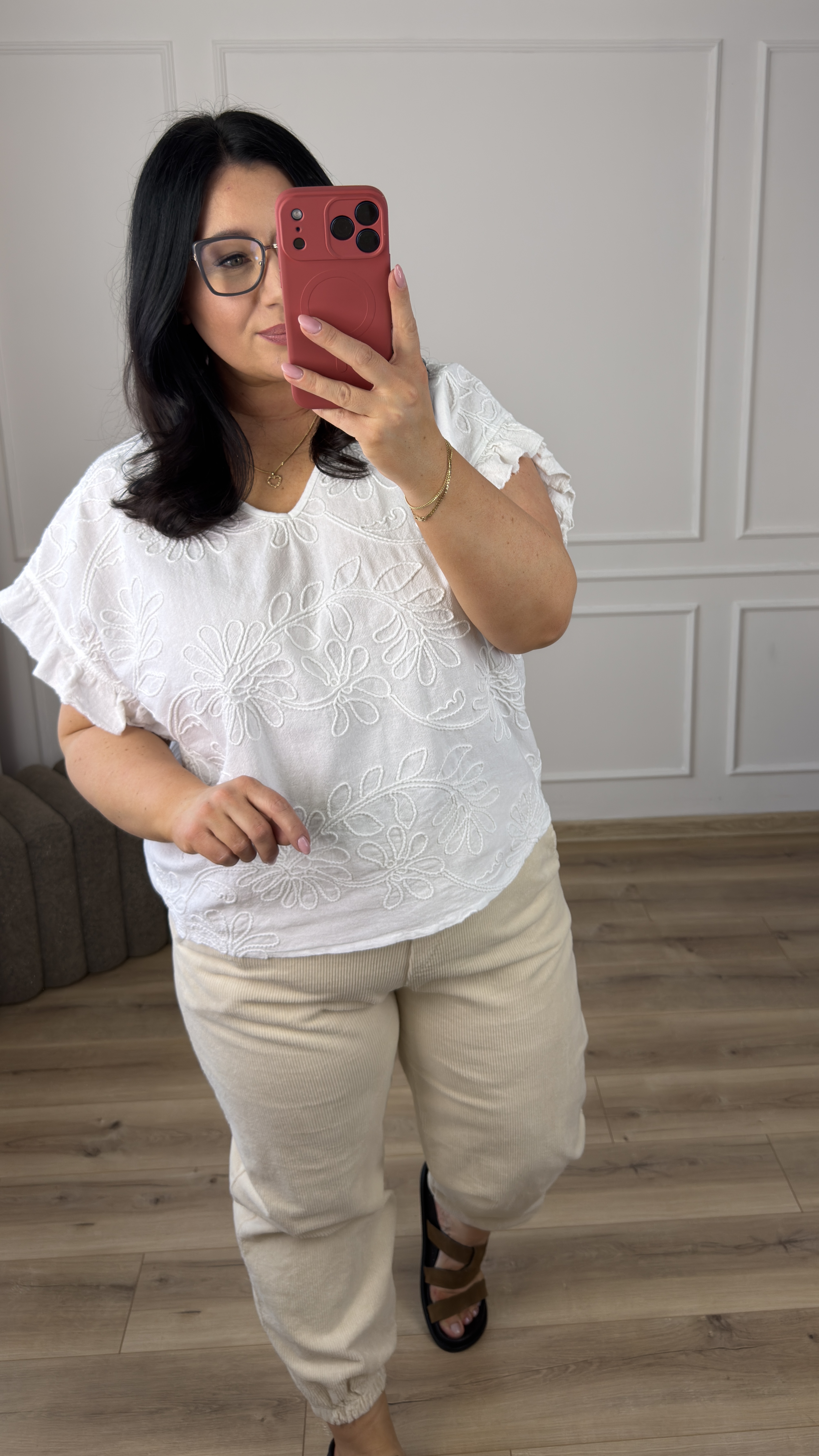 Świetna bluzka o luźnym lekko nietoperzowym kroju posiada haftowanie materiału z przodu. Tył bluzki gładki. Krótki rękaw wykończony falbanką.