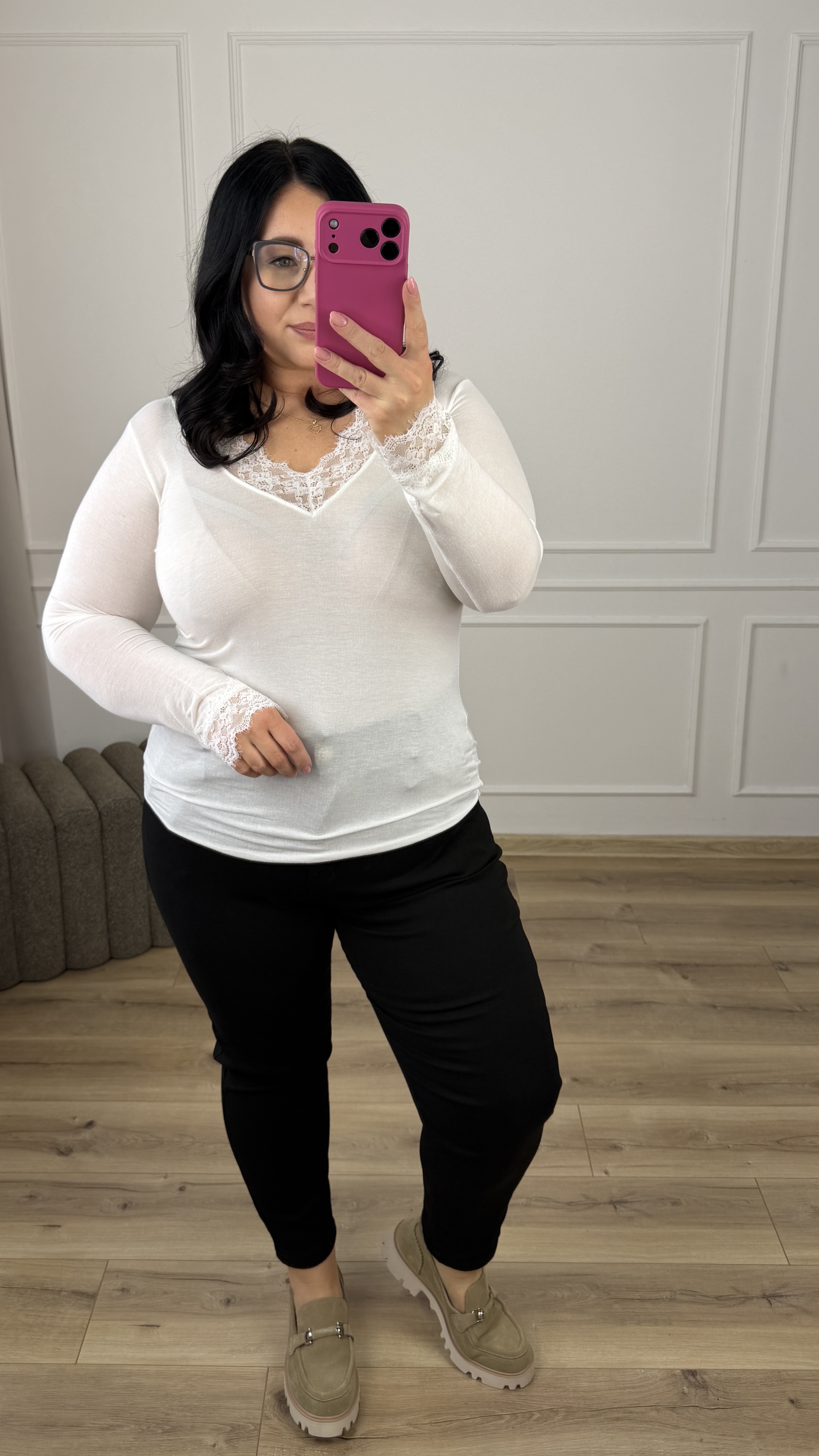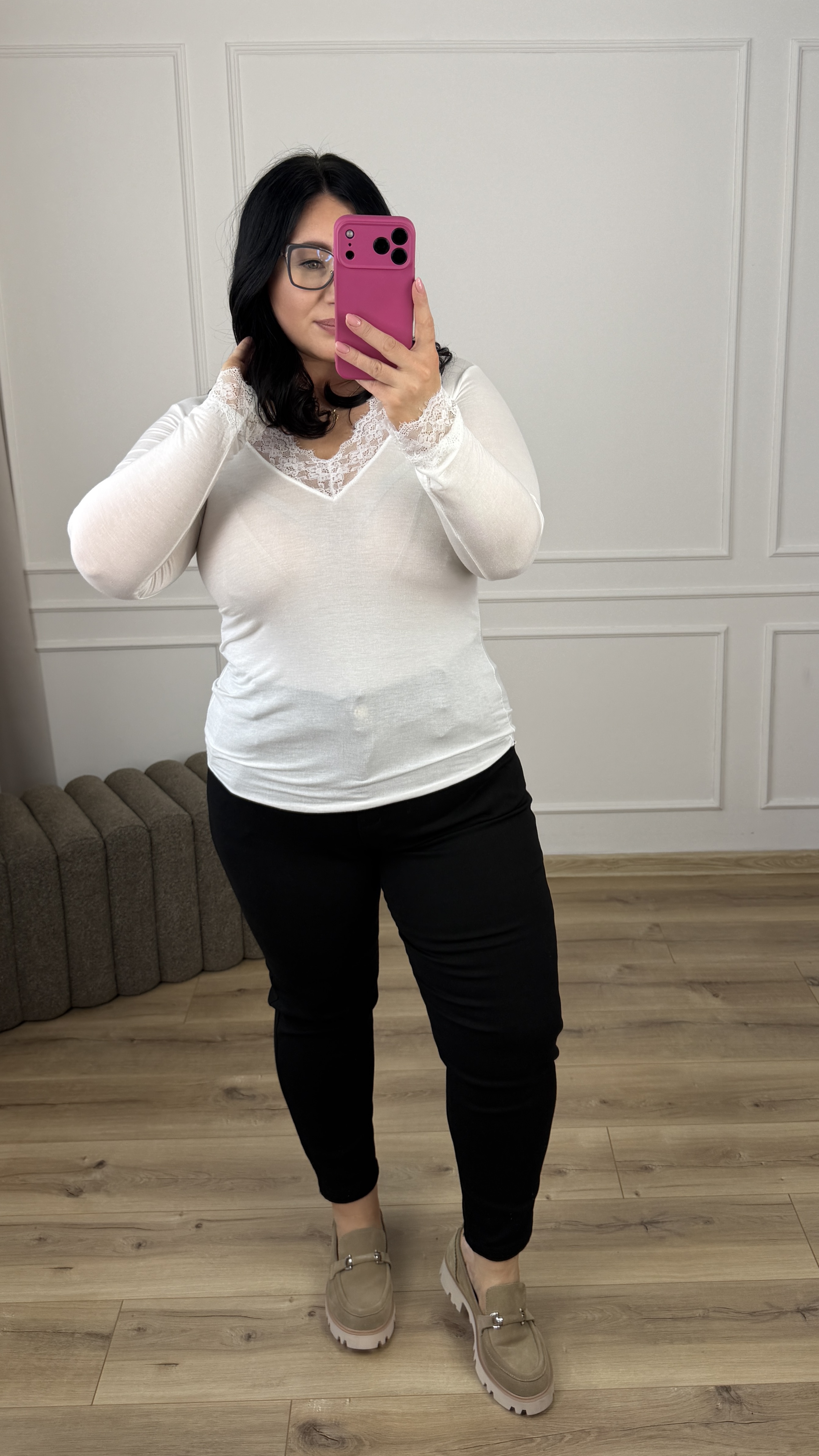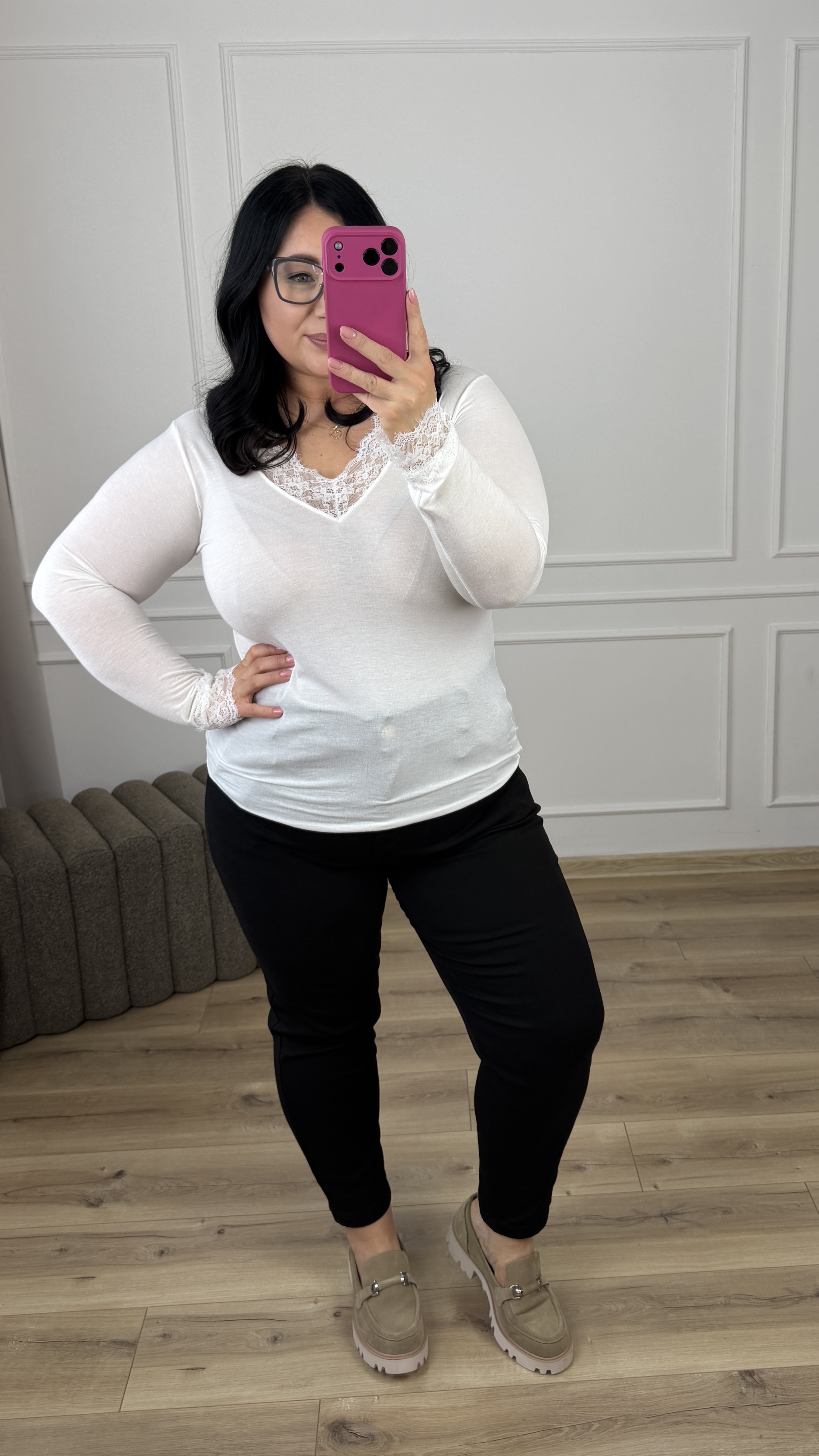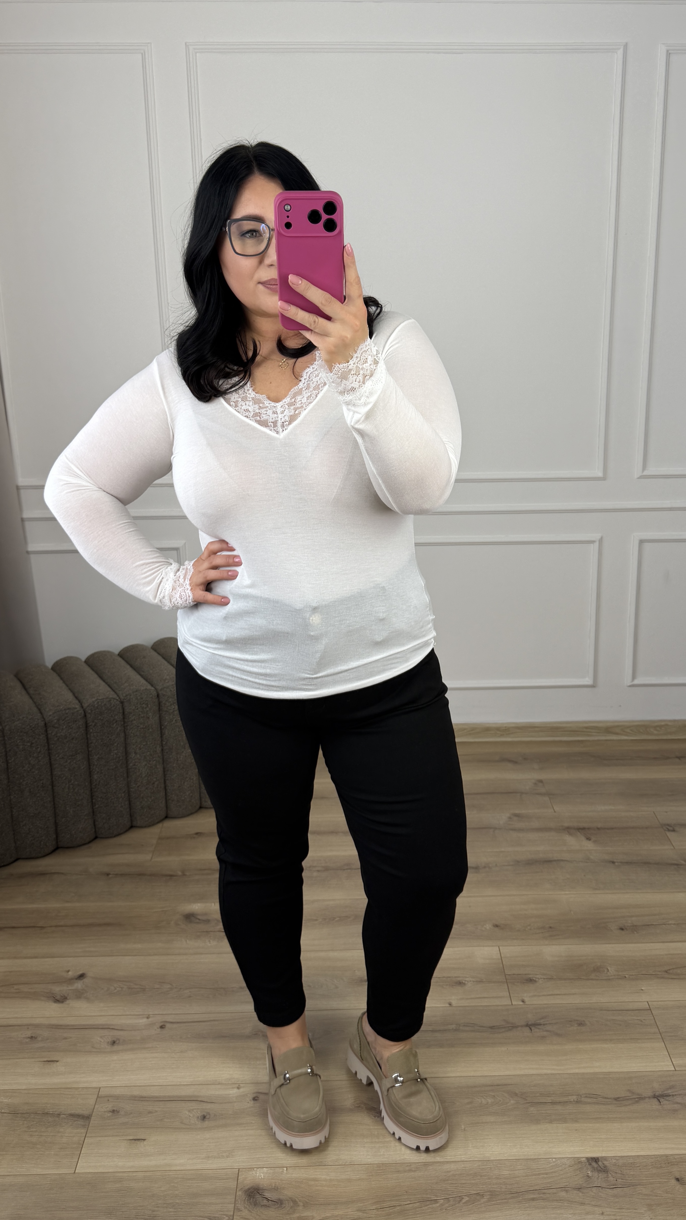 Świetna bazowa bluzka z naturalnego, delikatnego dla skóry materiału - modal. Model idealnie dopasowuje się do ciała - posiada dekolt w serek wykończony koronką oraz długi rękaw - wykończony koronką. Model idealnie sprawdzi się jako baza stylizacji - pod marynarkę, sweter, koszulę.