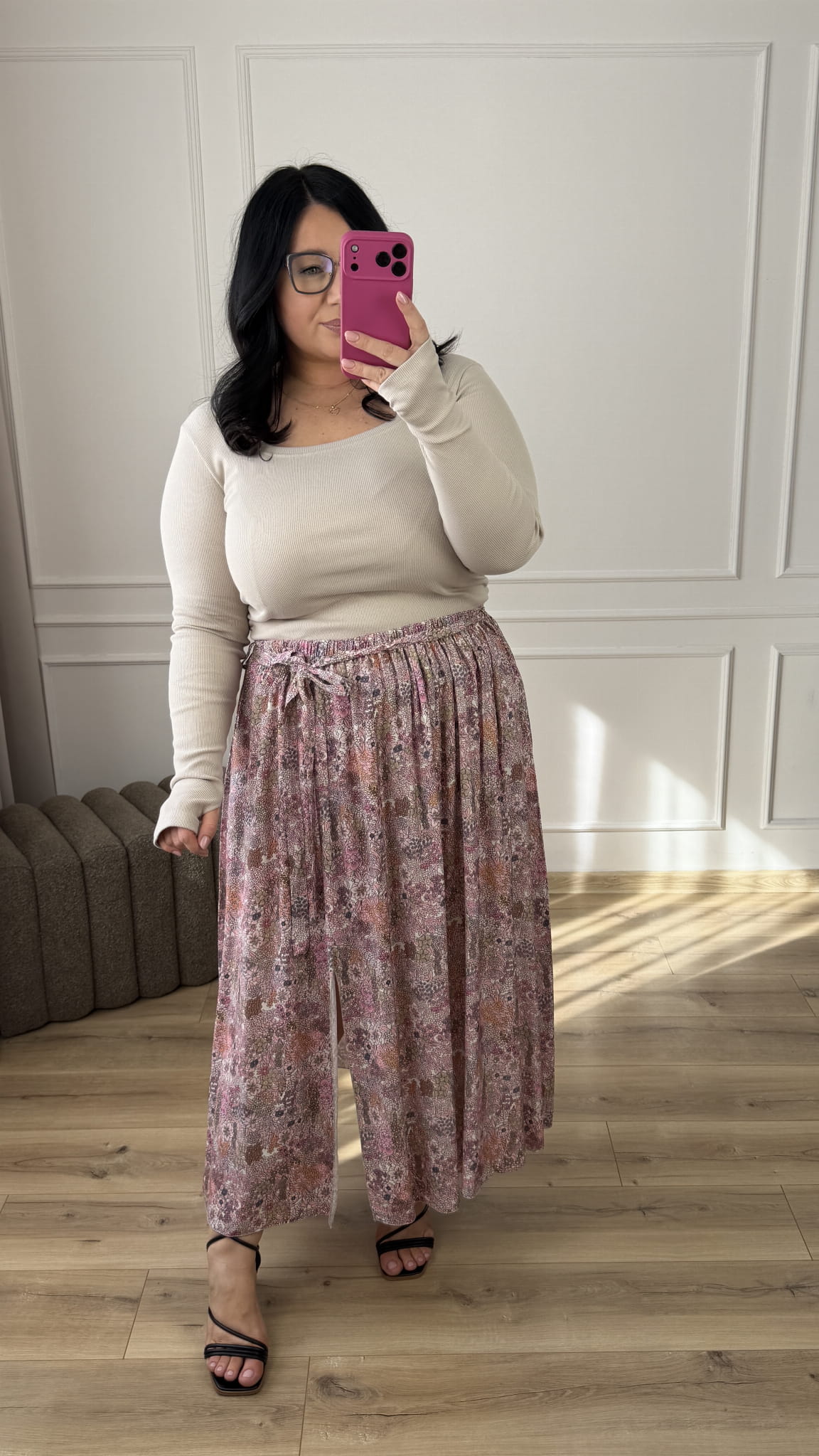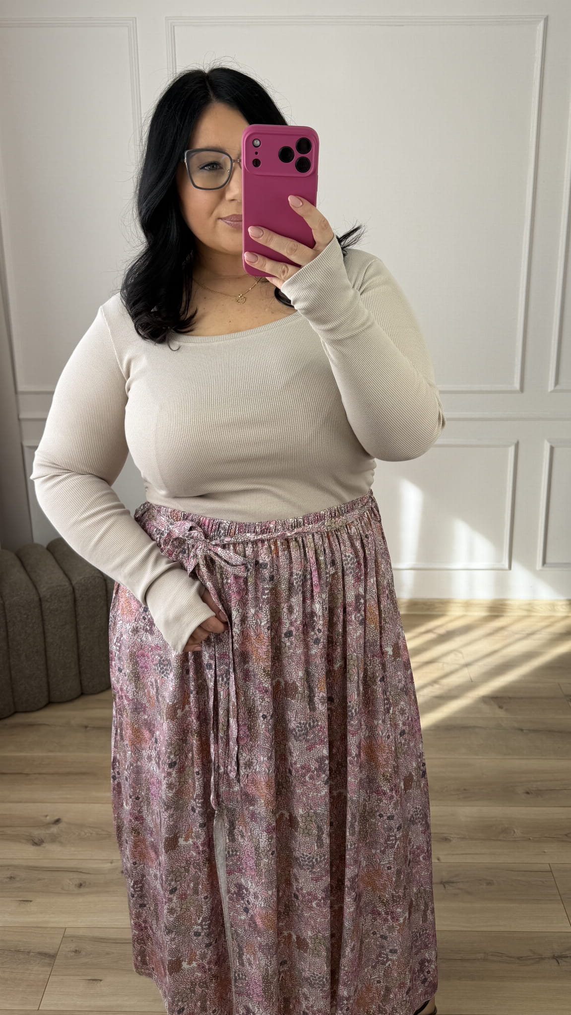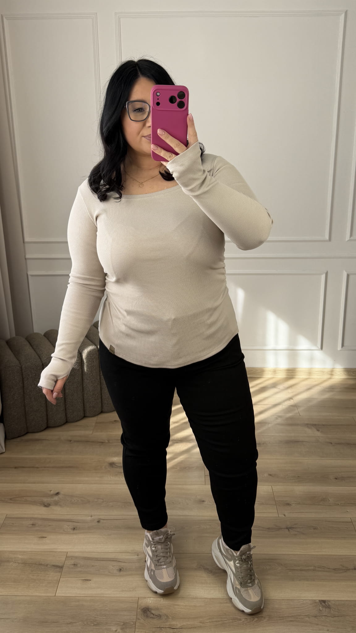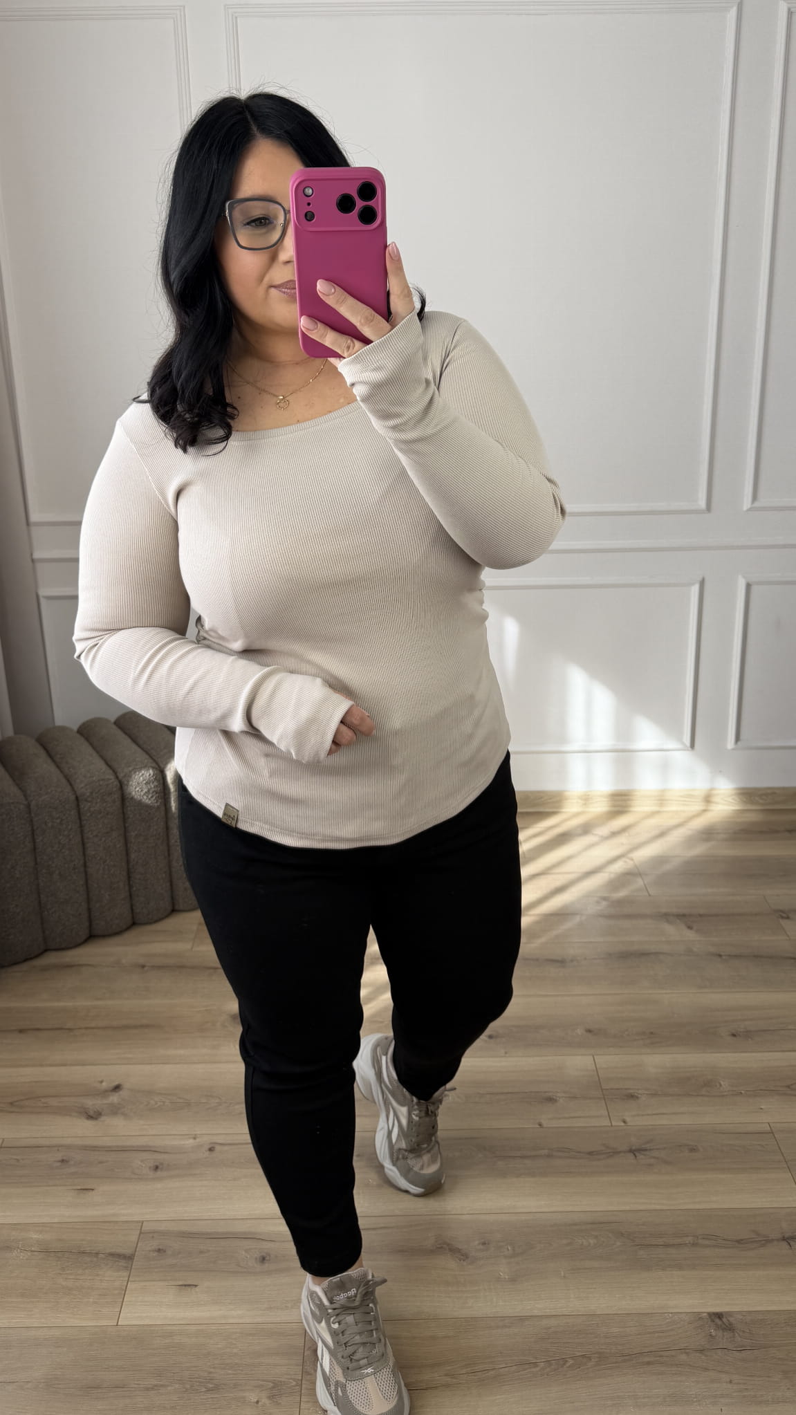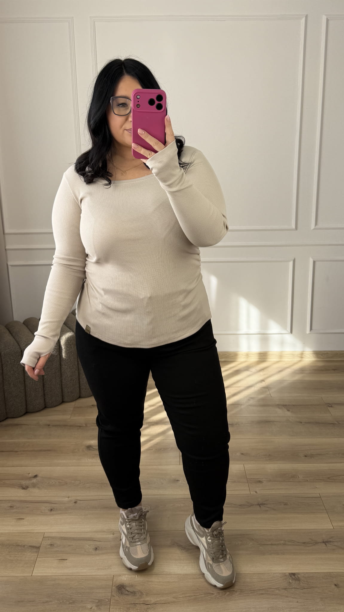 Klasyczna bluzka z grubej bawełny prążkowanej. Bluzka posiada dekolt w delikatne karo, długi rękaw z wycięciem na kciuk oraz maszczenie materiału po bokach przez co ładnie się układa na sylwetce. Model dzięki swojej uniwersalności świetnie sprawdzi się jako baza do większości wiosennych stylizacji.