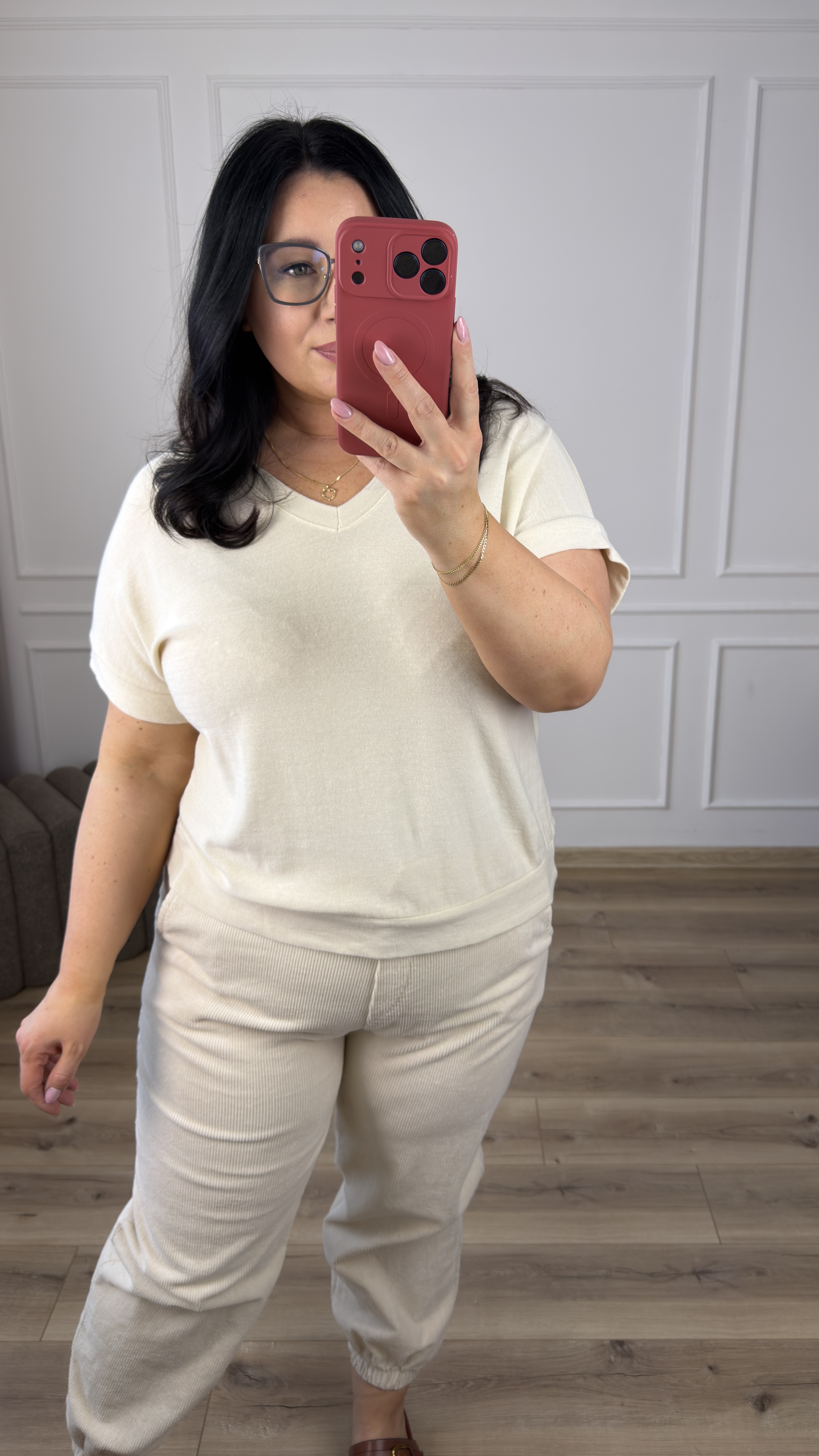Dzianinowa bluzka z krótkim rękawem, dekoltem w serek. Bluzka posiada wycięcie na plecach ozdobione haftowaną kokardą co nadaje jej dziewczęcego uroku. Model świetnie sprawdzi się w codziennych stylizacjach.