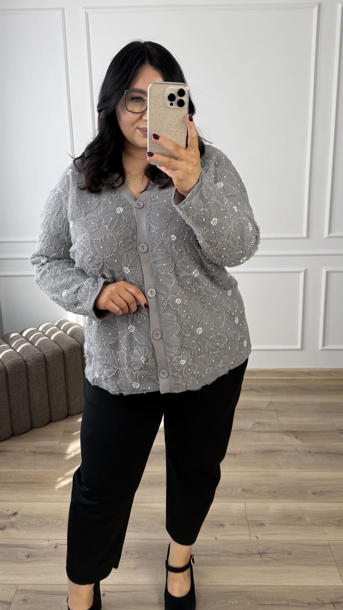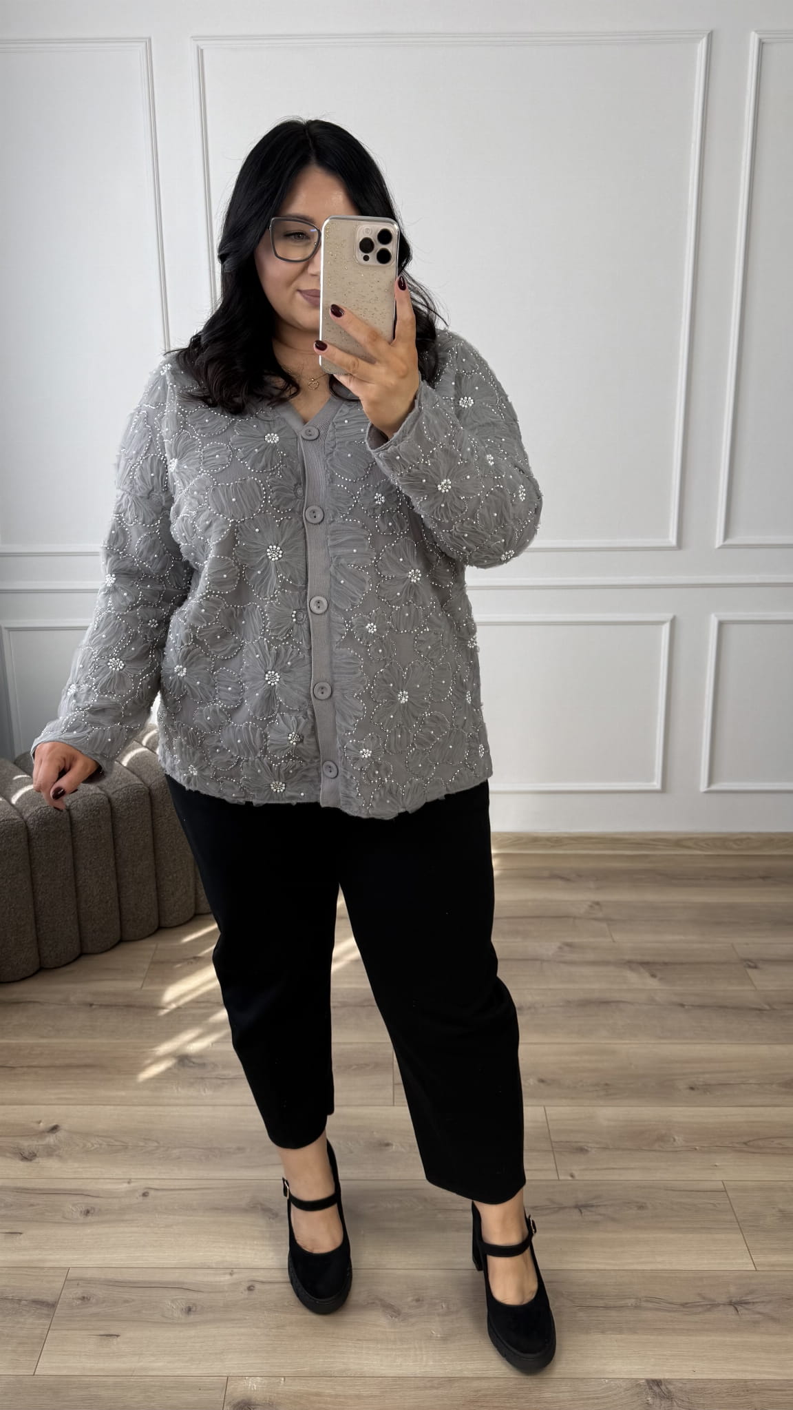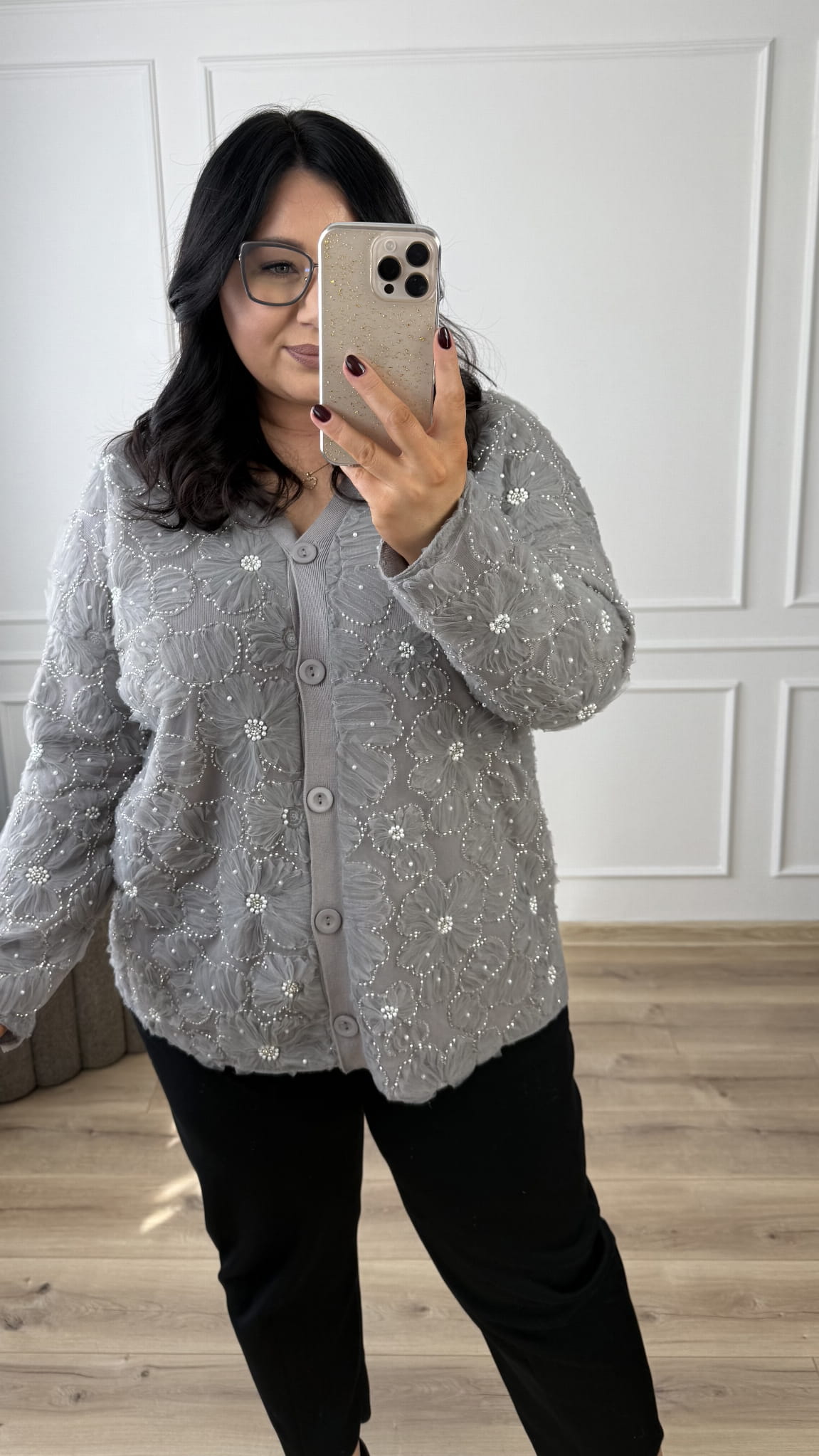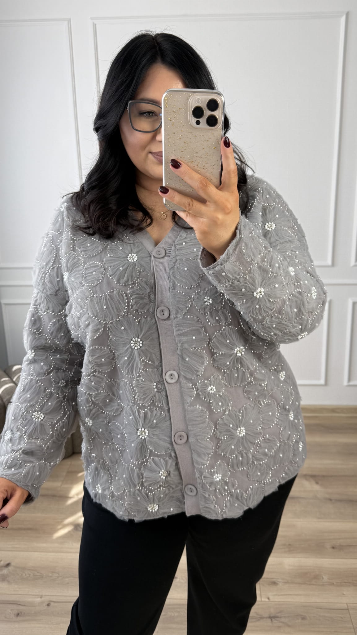 Ozdobny szary kardigan ze zdobieniem tiulowym i perełkami na przodzie oraz rękawach. Tył gładki. Dekolt w V, zapinany na duże guziki. Kardigan świetnie sprawdzi się na okazjonalne wyjścia. Ozdobny przód wzbudzi zachwyt koleżanek.