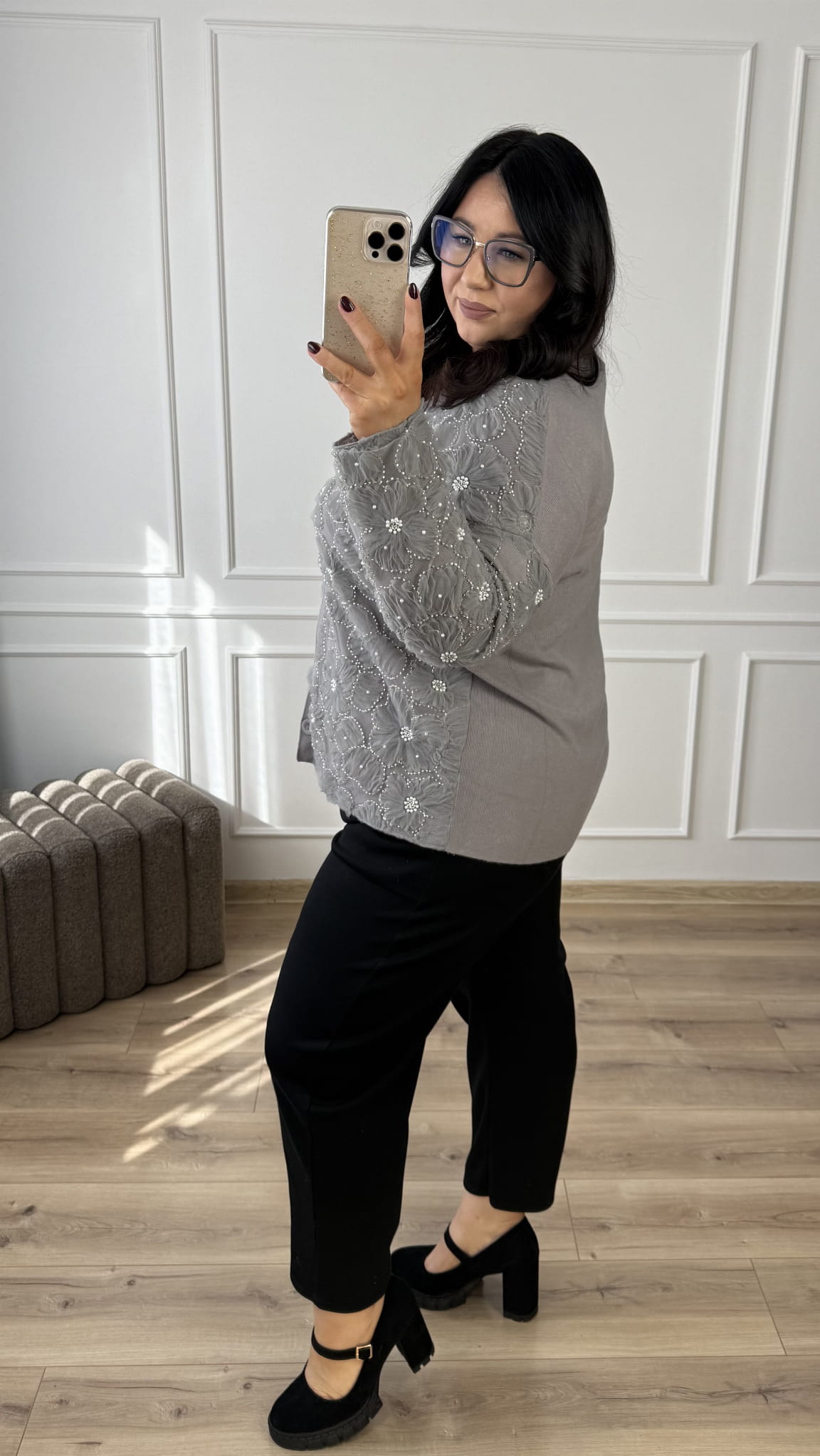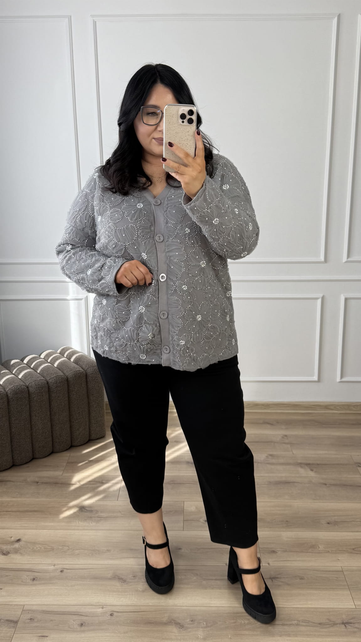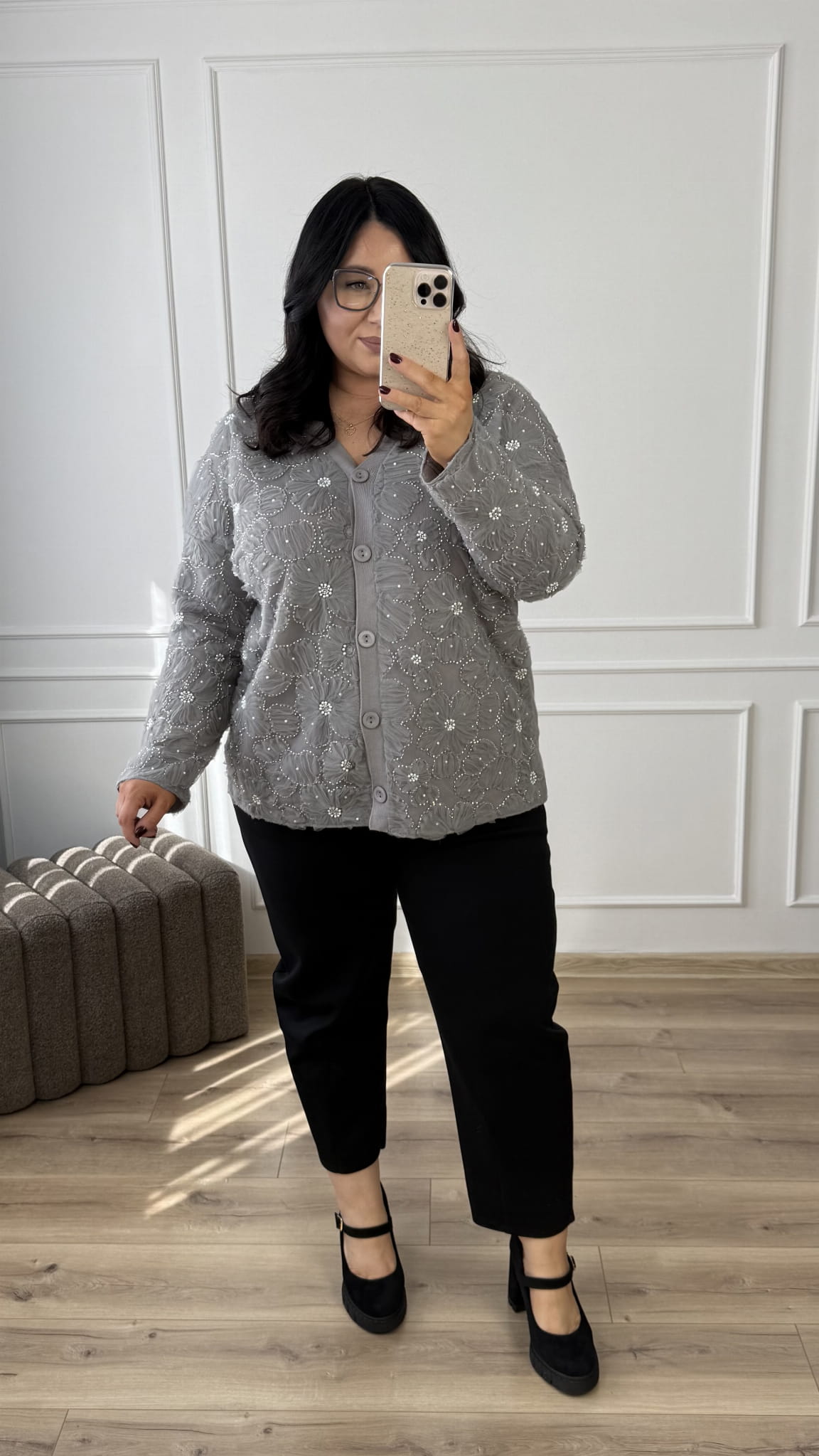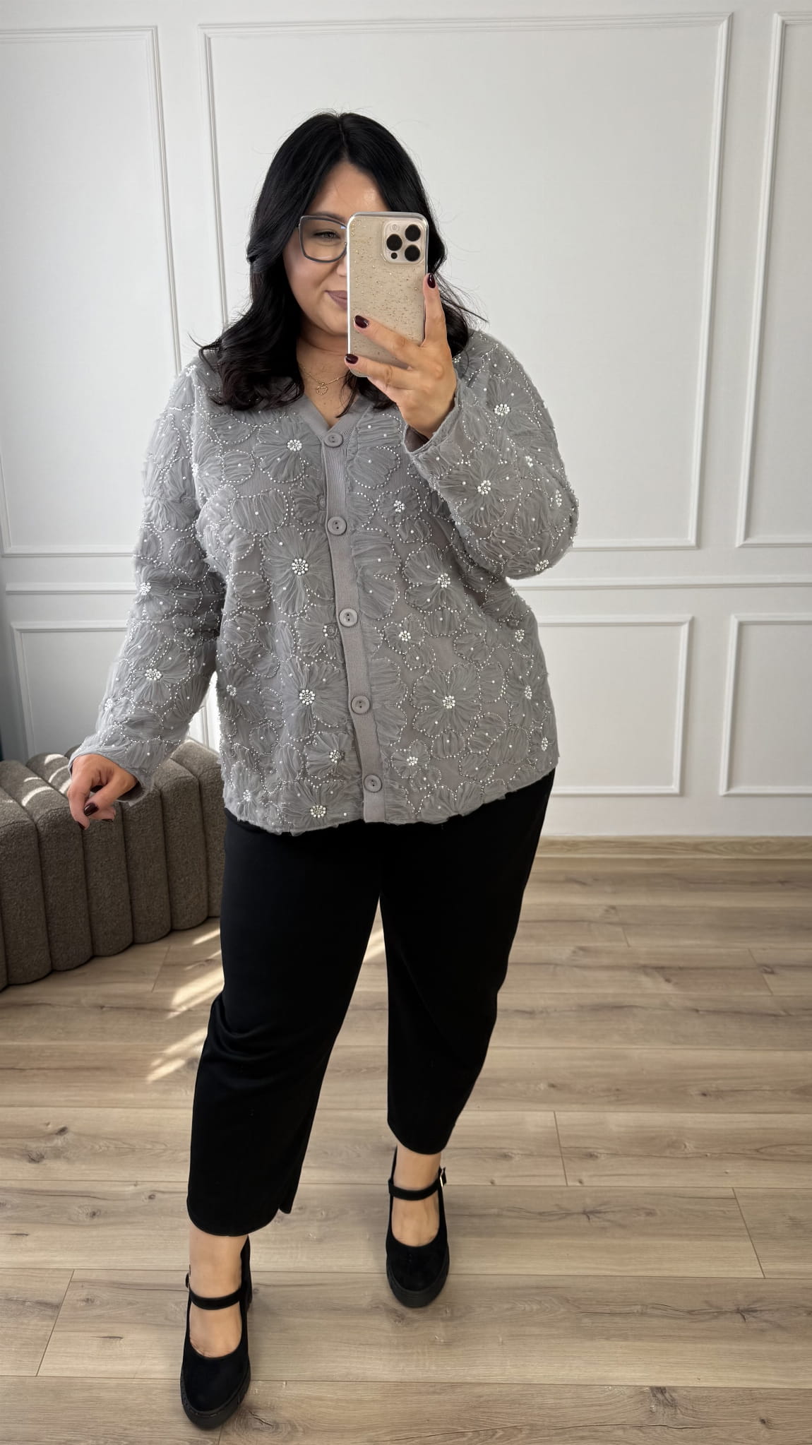 Ozdobny szary kardigan ze zdobieniem tiulowym i perełkami na przodzie oraz rękawach. Tył gładki. Dekolt w V, zapinany na duże guziki. Kardigan świetnie sprawdzi się na okazjonalne wyjścia. Ozdobny przód wzbudzi zachwyt koleżanek.