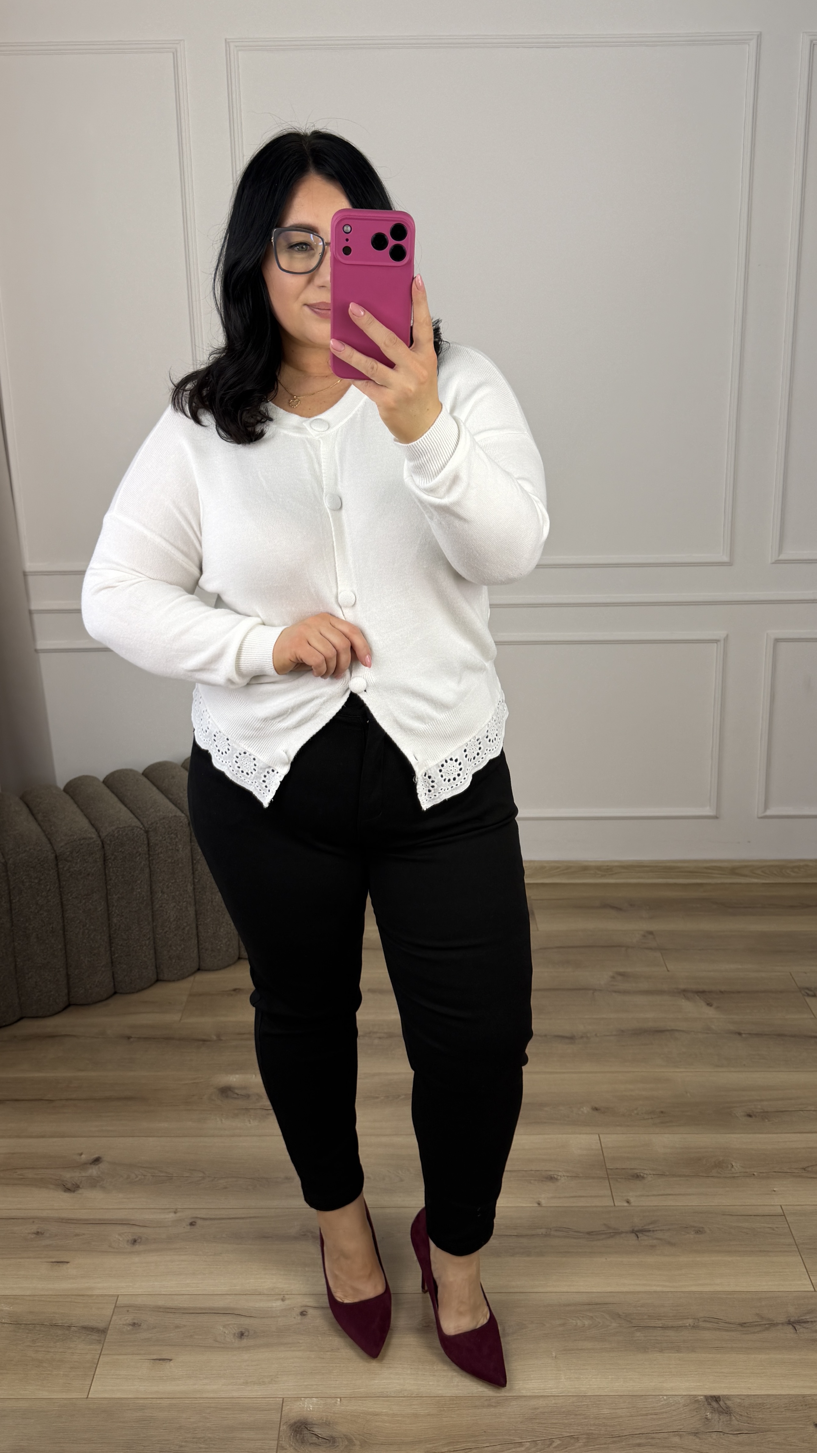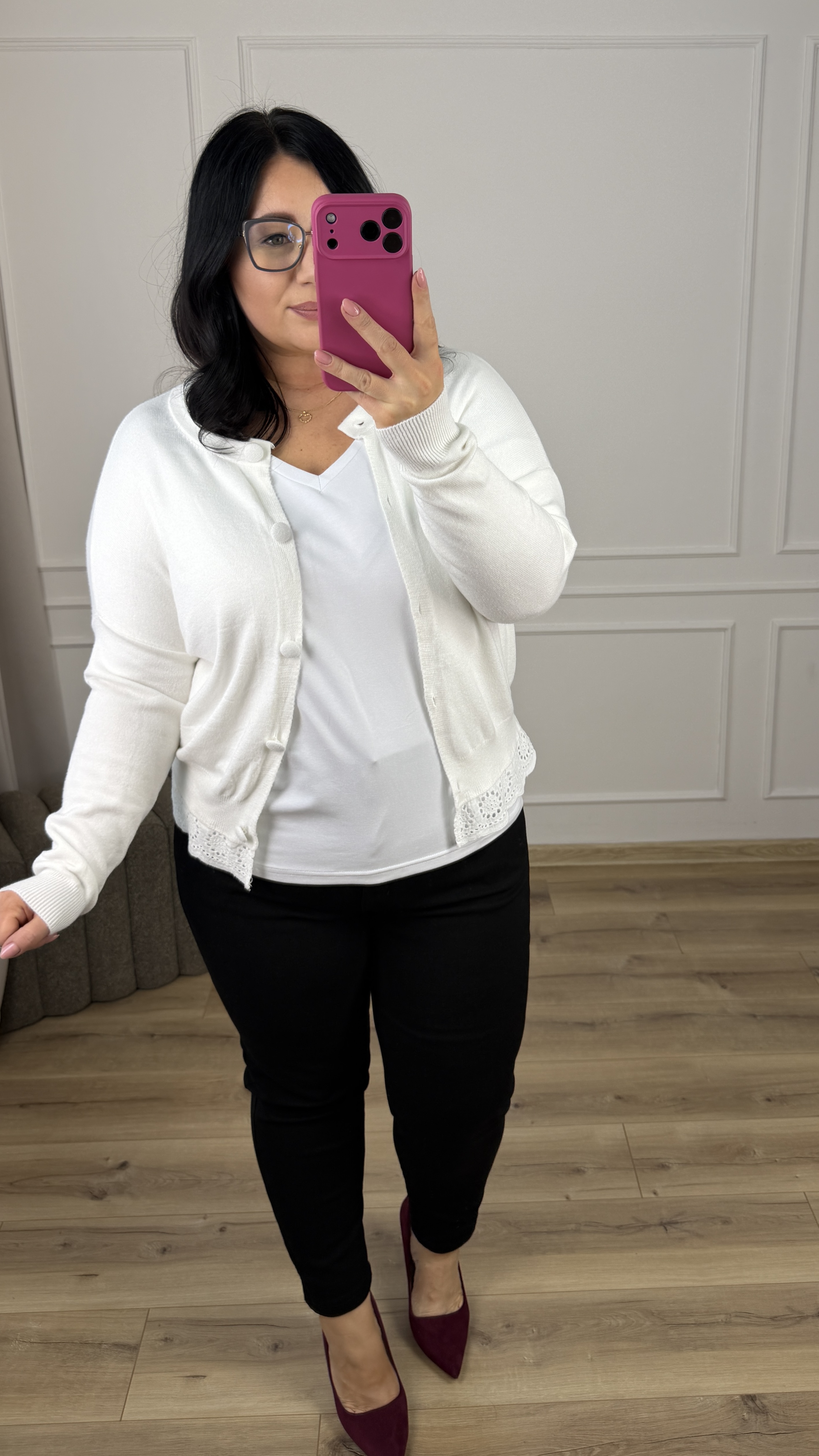 Krótki wiskozowy kardigan zapinany na duże guziki. Posiada długi rękaw oraz koronkowe wykończenie na dole.