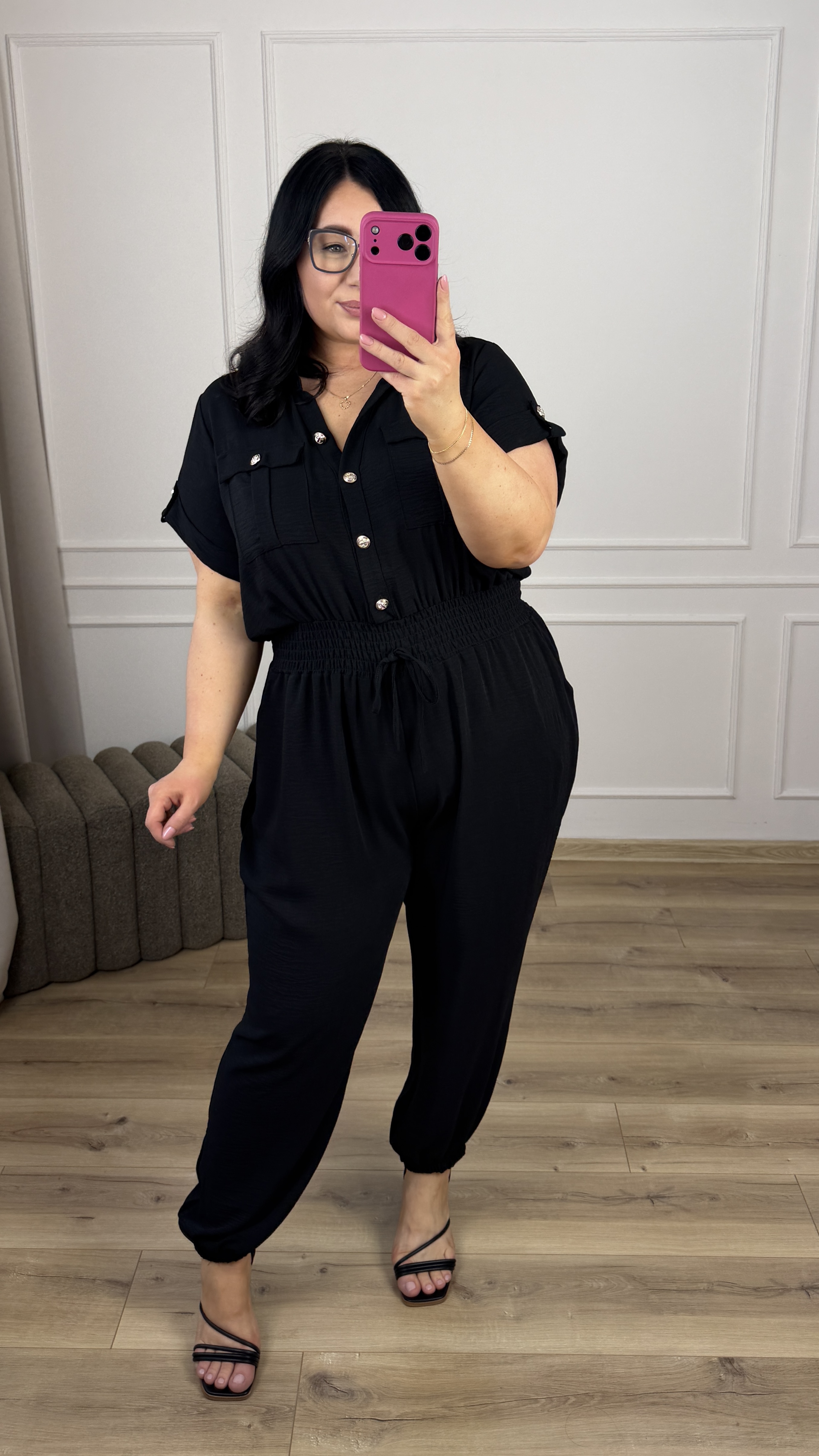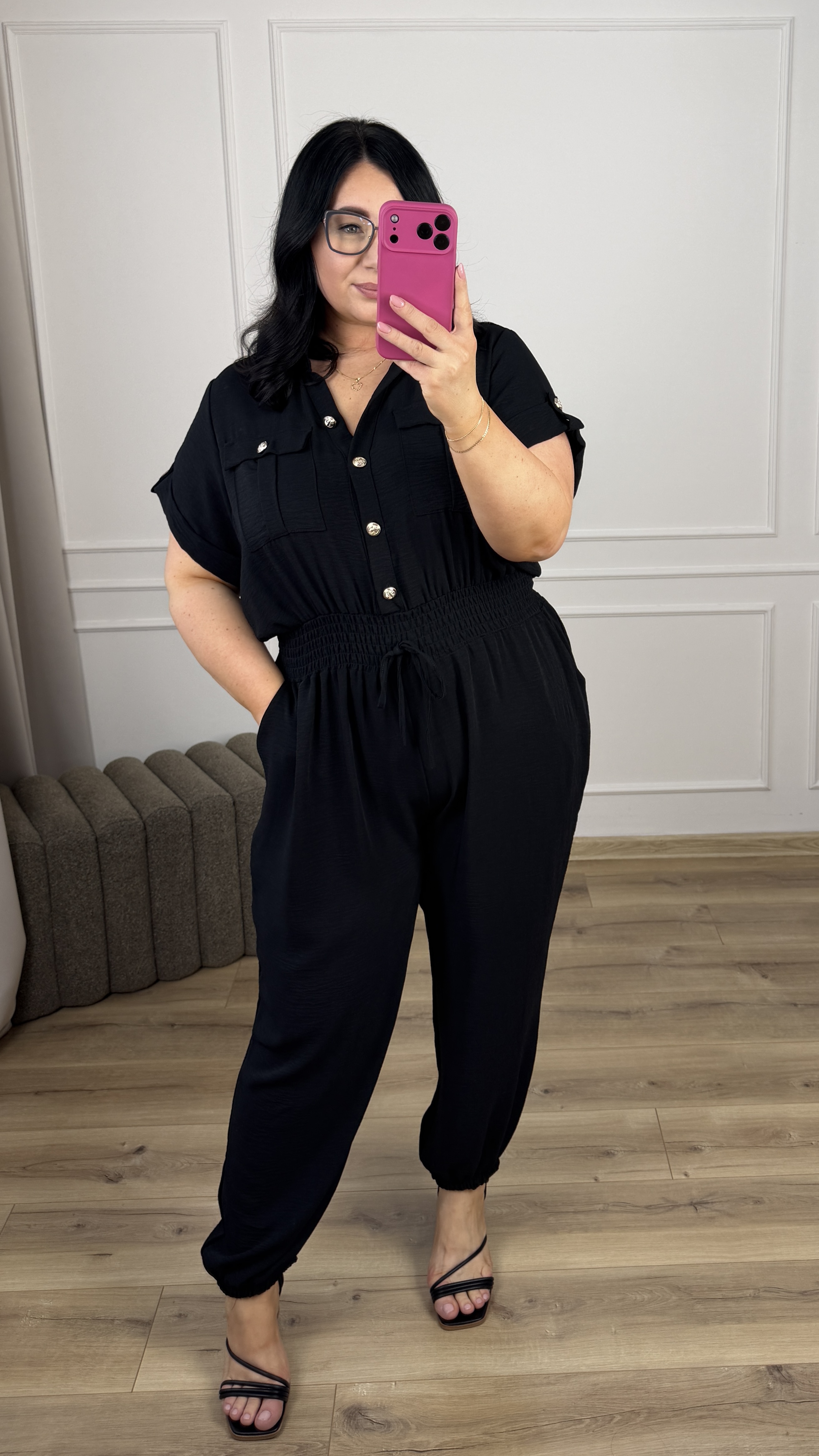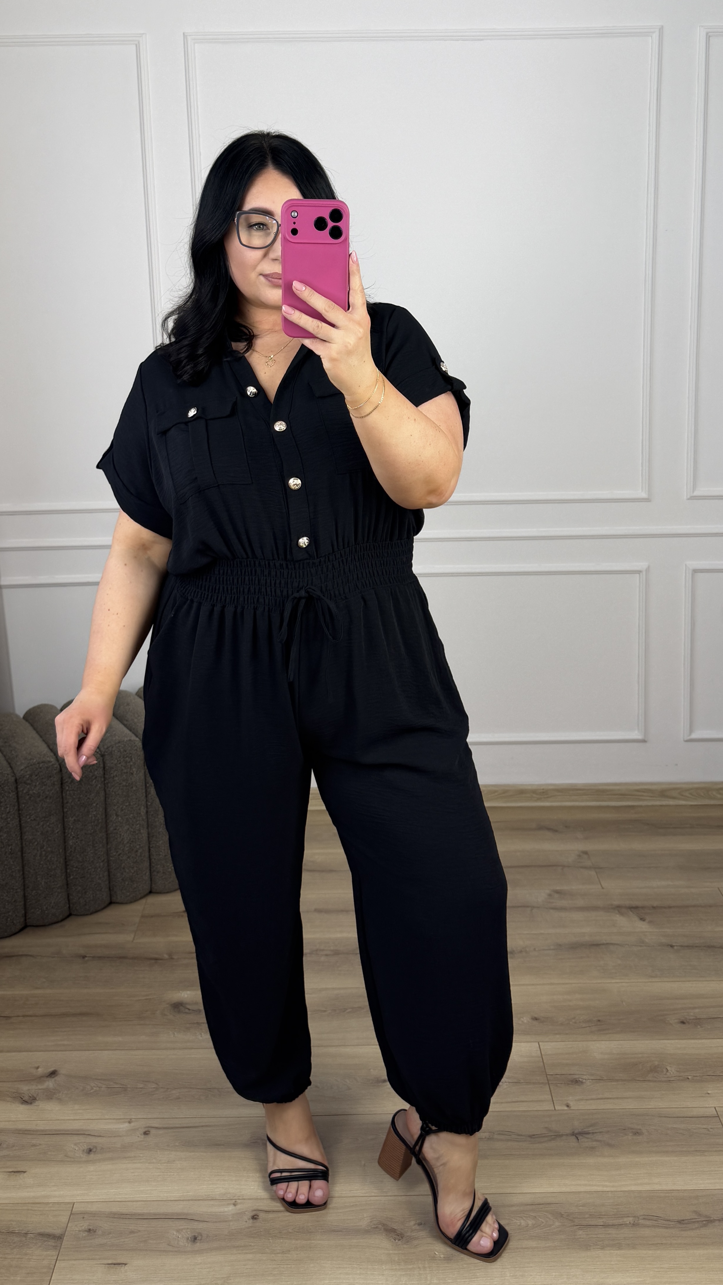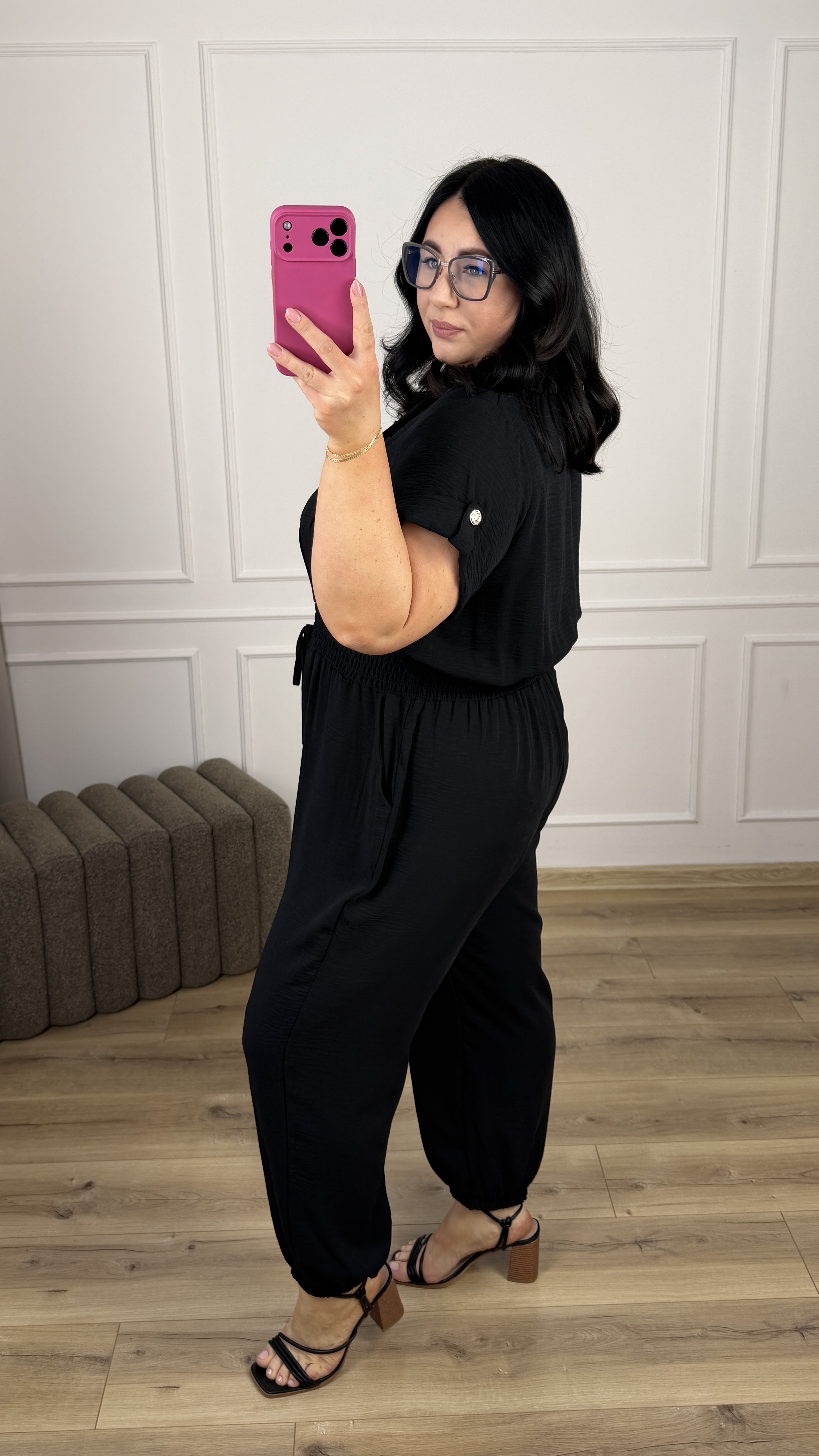 Kombinezon z szerokimi nogawkami oraz zwężającą gumką na dole. Góra zapinana na guziki z kołnierzykiem. Posiada krótki rękaw z wywinięciem oraz ozdobnym guzikiem. W pasie pas z gumek co świetnie podkreśla talię wraz z ozdobnym wiązaniem na kokardę. Kombinezon posiada dwie kieszenie na biuście.