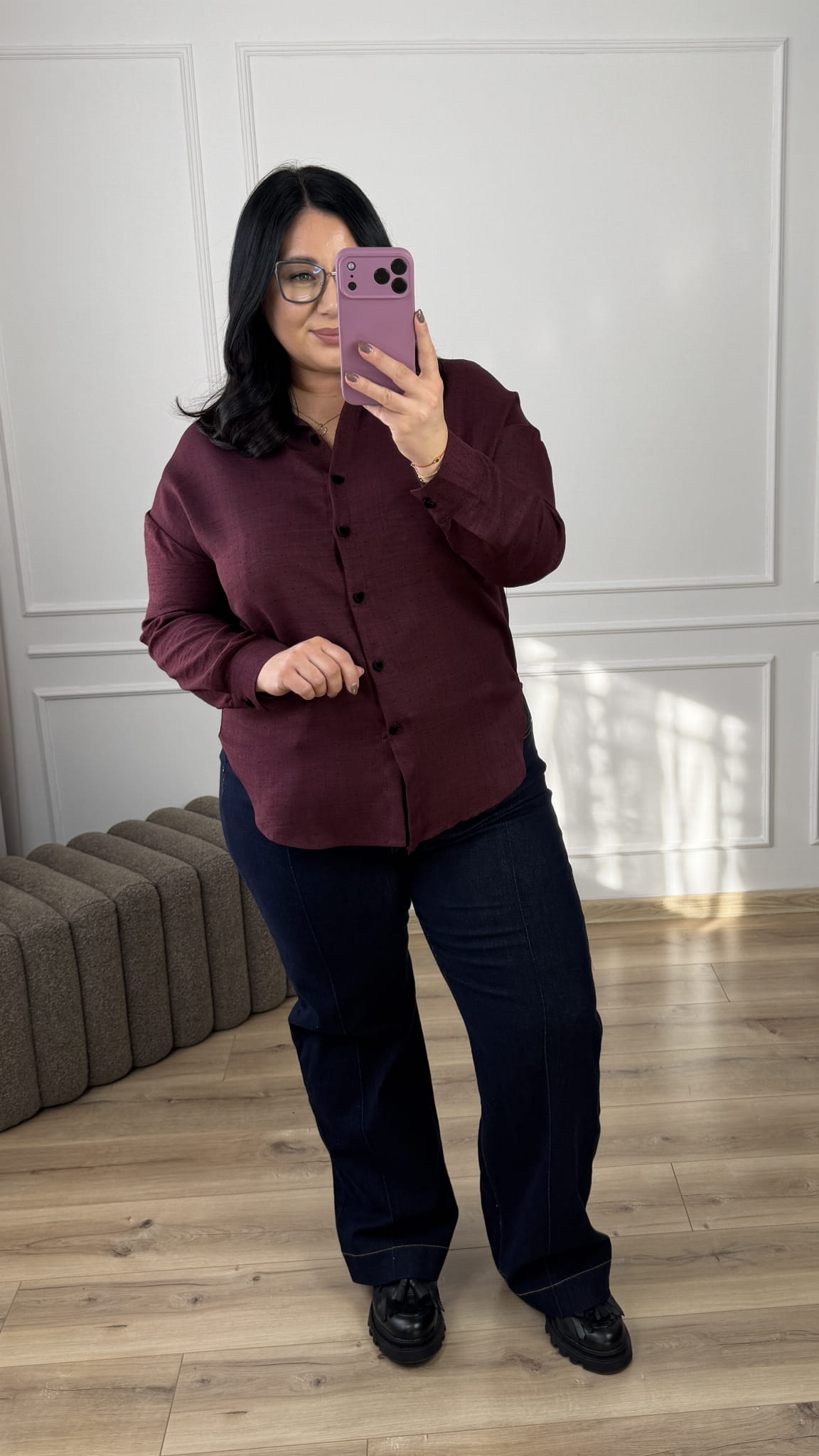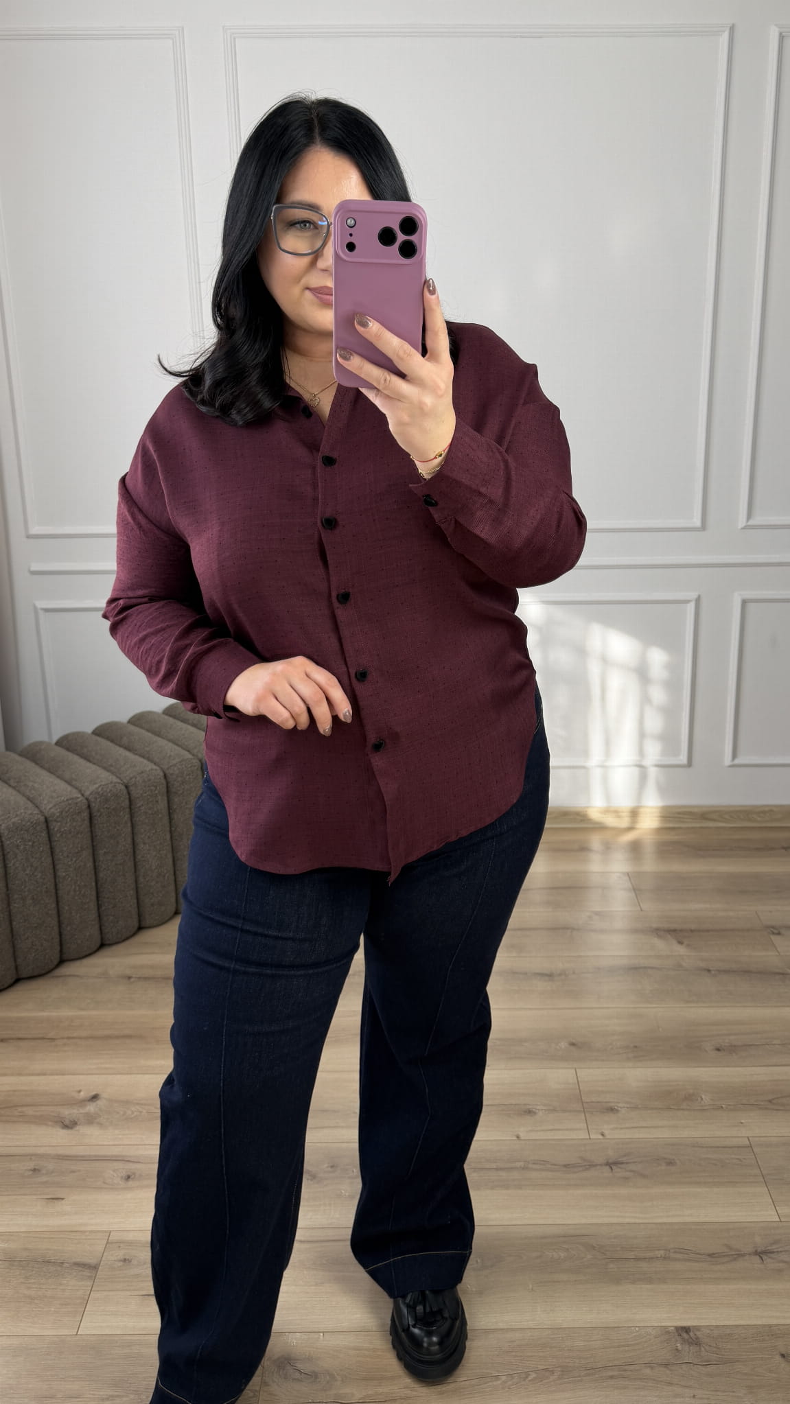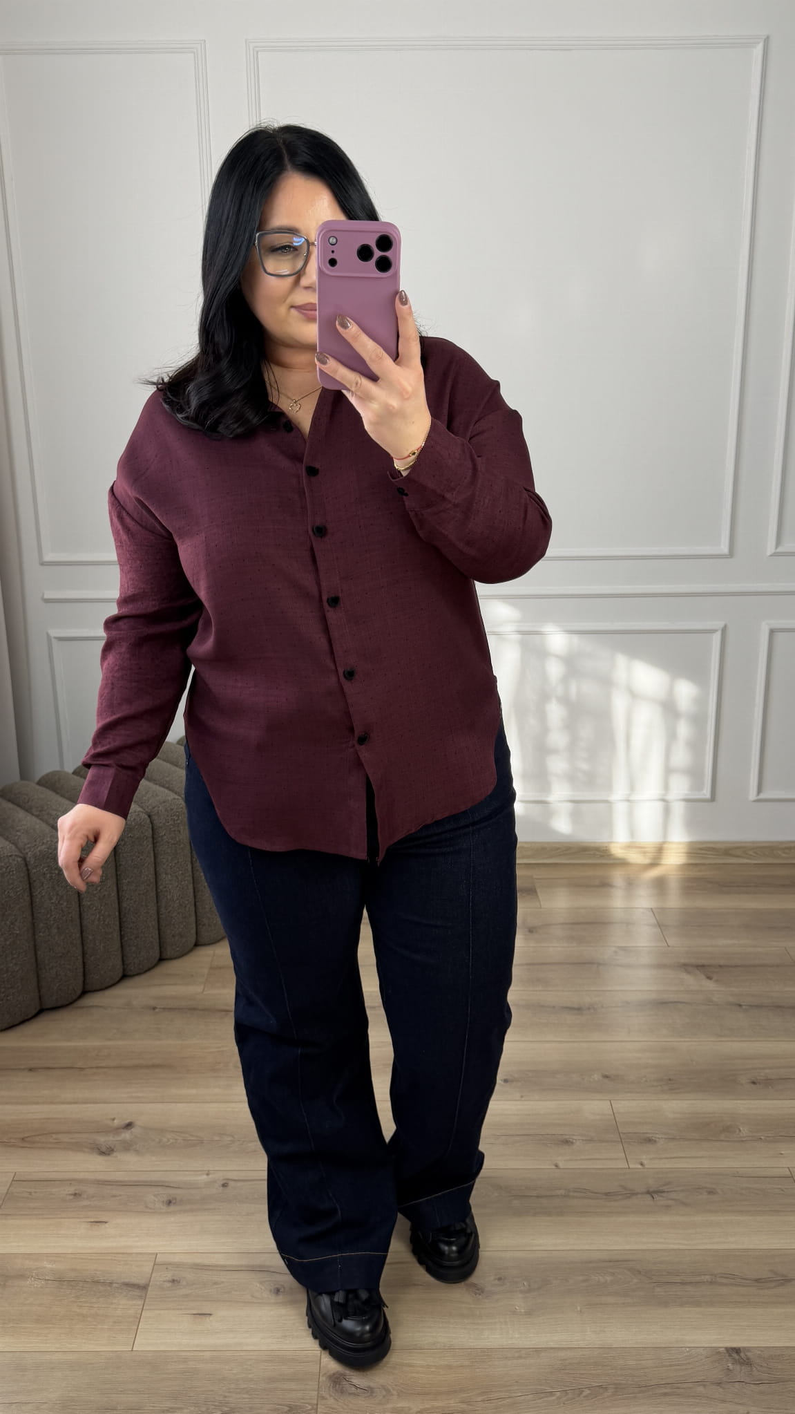 Taliowana koszula w groszki o klasycznym kroju z ozdobnymi guzikami w kształcie serca. Lekko dłuższy tył, posiada kołnierzyk, zapinana na rząd guzików. Koszula posiada welurowe guziki w kształcie serca. Długi rękaw zakończony mankietem i zapinanym na guzik. Model świetnie sprawdzi się na co dzień czy do pracy.