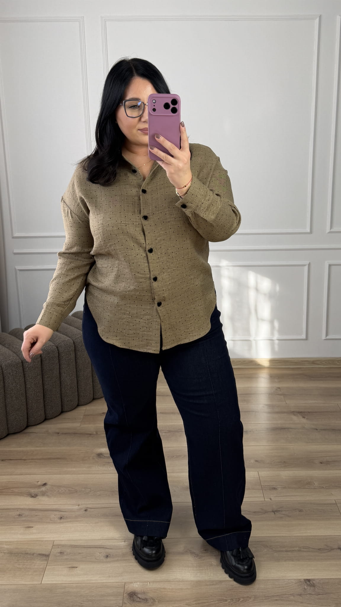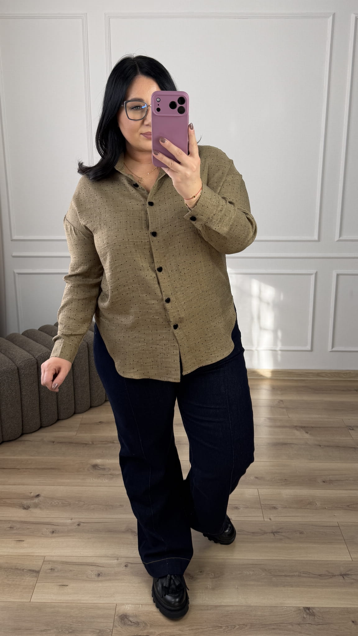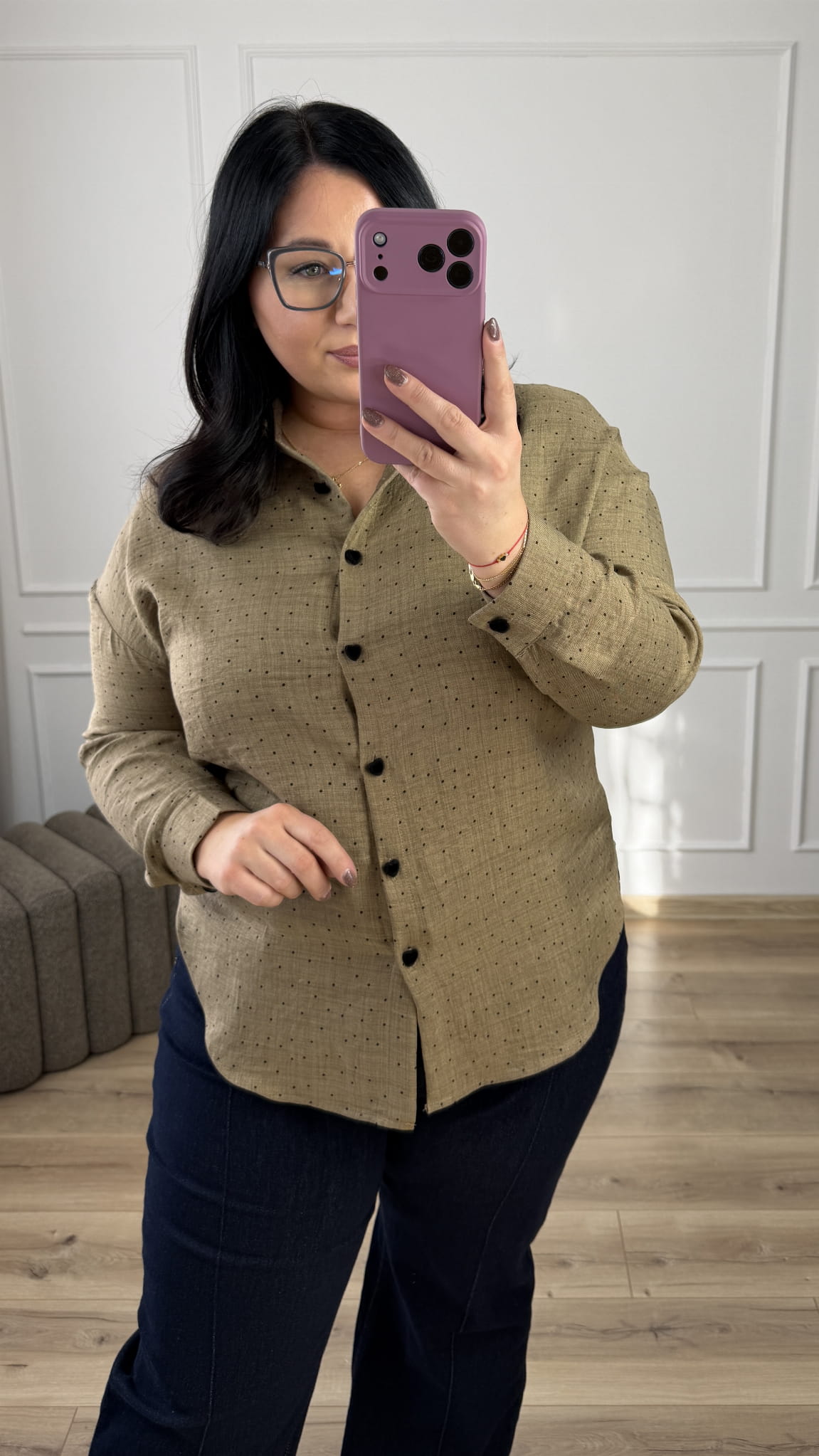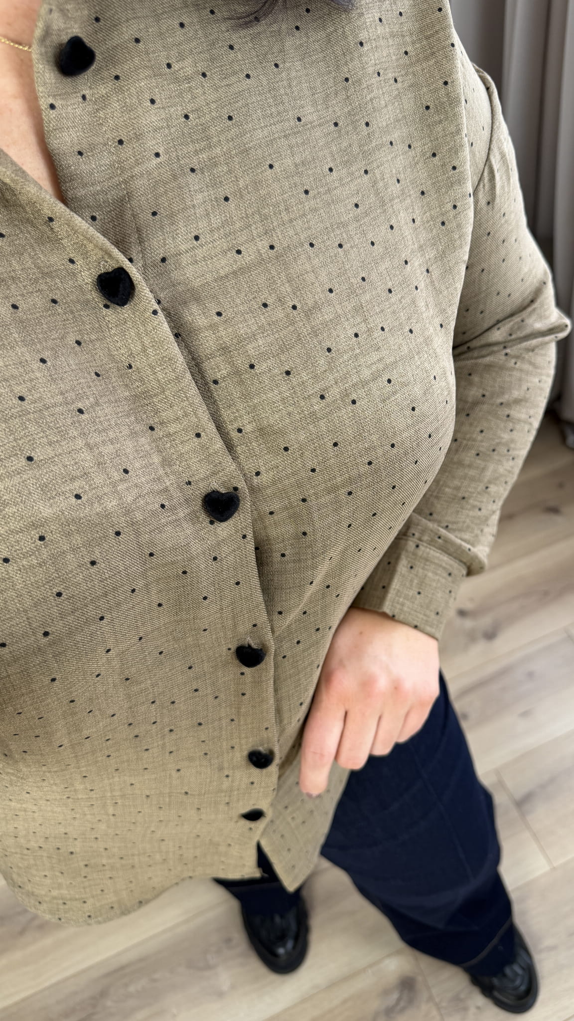 Taliowana koszula w groszki o klasycznym kroju z ozdobnymi guzikami w kształcie serca. Lekko dłuższy tył, posiada kołnierzyk, zapinana na rząd guzików. Koszula posiada welurowe guziki w kształcie serca. Długi rękaw zakończony mankietem i zapinanym na guzik. Model świetnie sprawdzi się na co dzień czy do pracy.