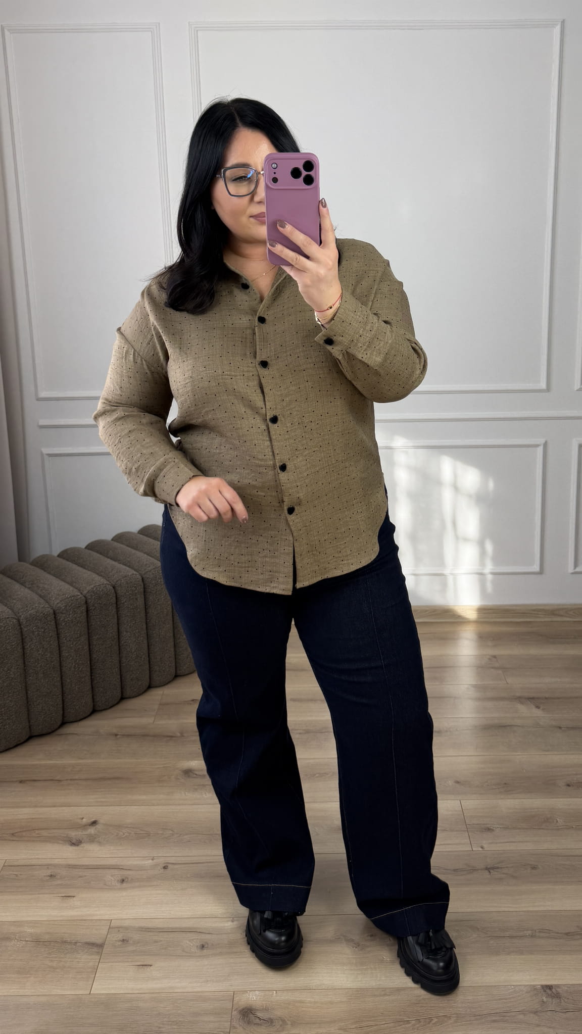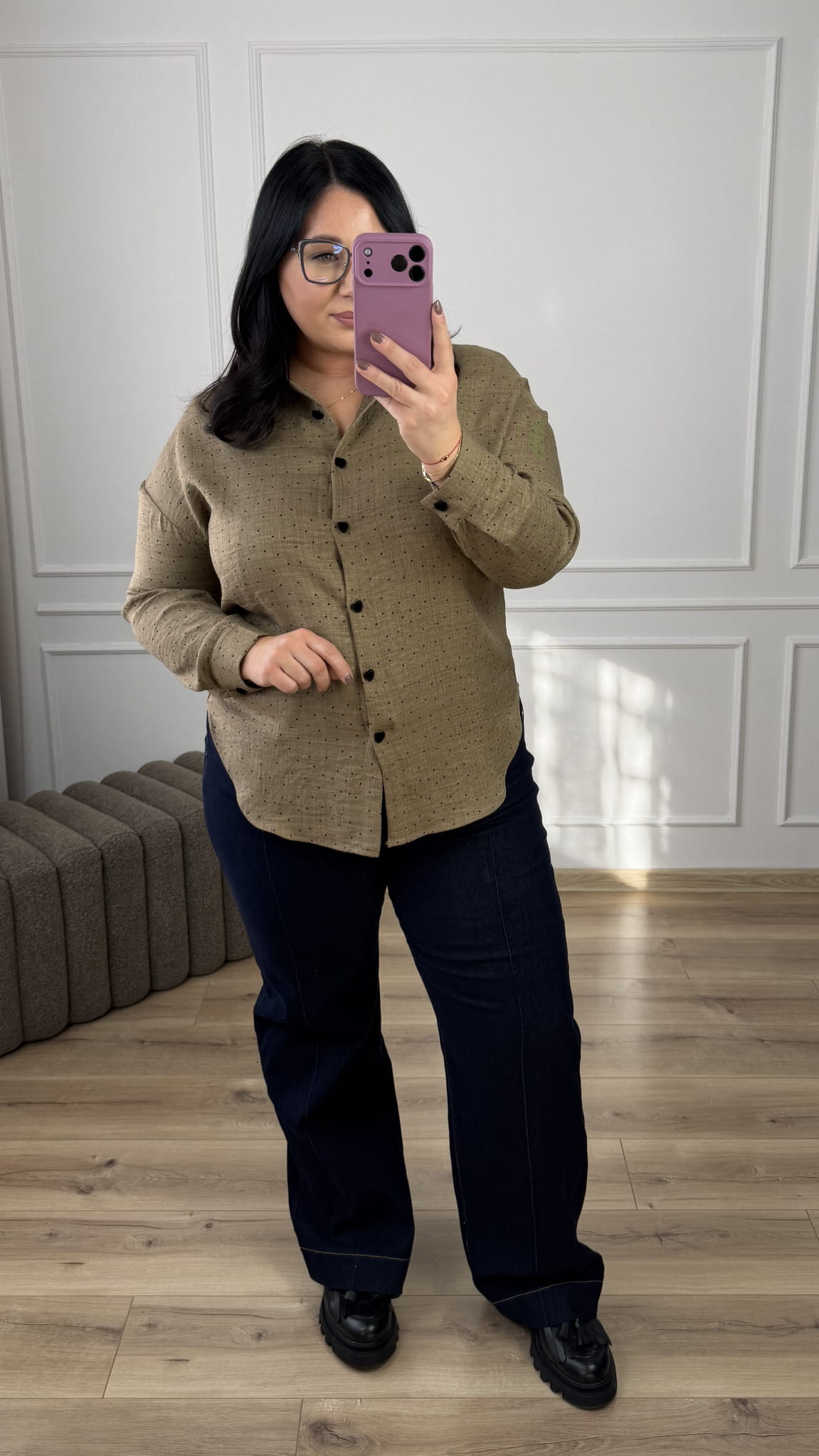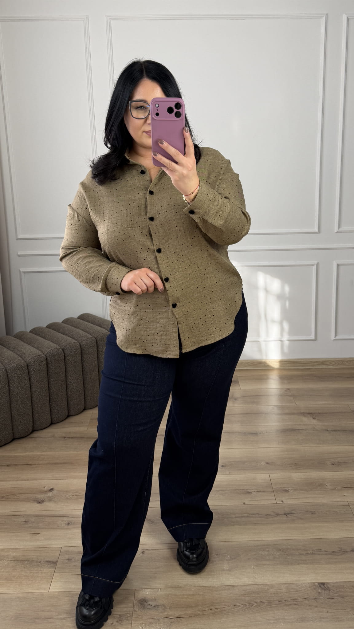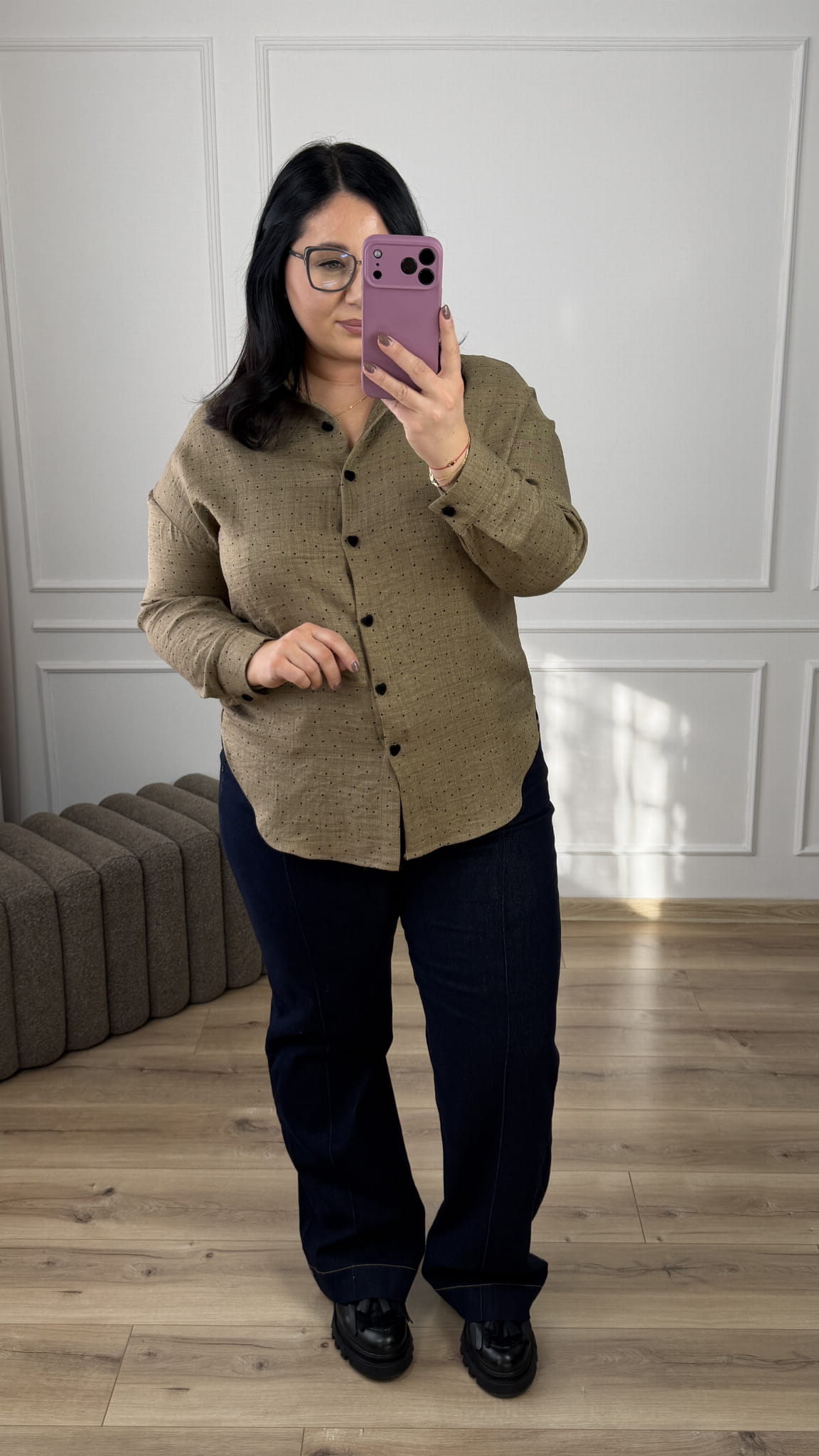 Taliowana koszula w groszki o klasycznym kroju z ozdobnymi guzikami w kształcie serca. Lekko dłuższy tył, posiada kołnierzyk, zapinana na rząd guzików. Koszula posiada welurowe guziki w kształcie serca. Długi rękaw zakończony mankietem i zapinanym na guzik. Model świetnie sprawdzi się na co dzień czy do pracy.
