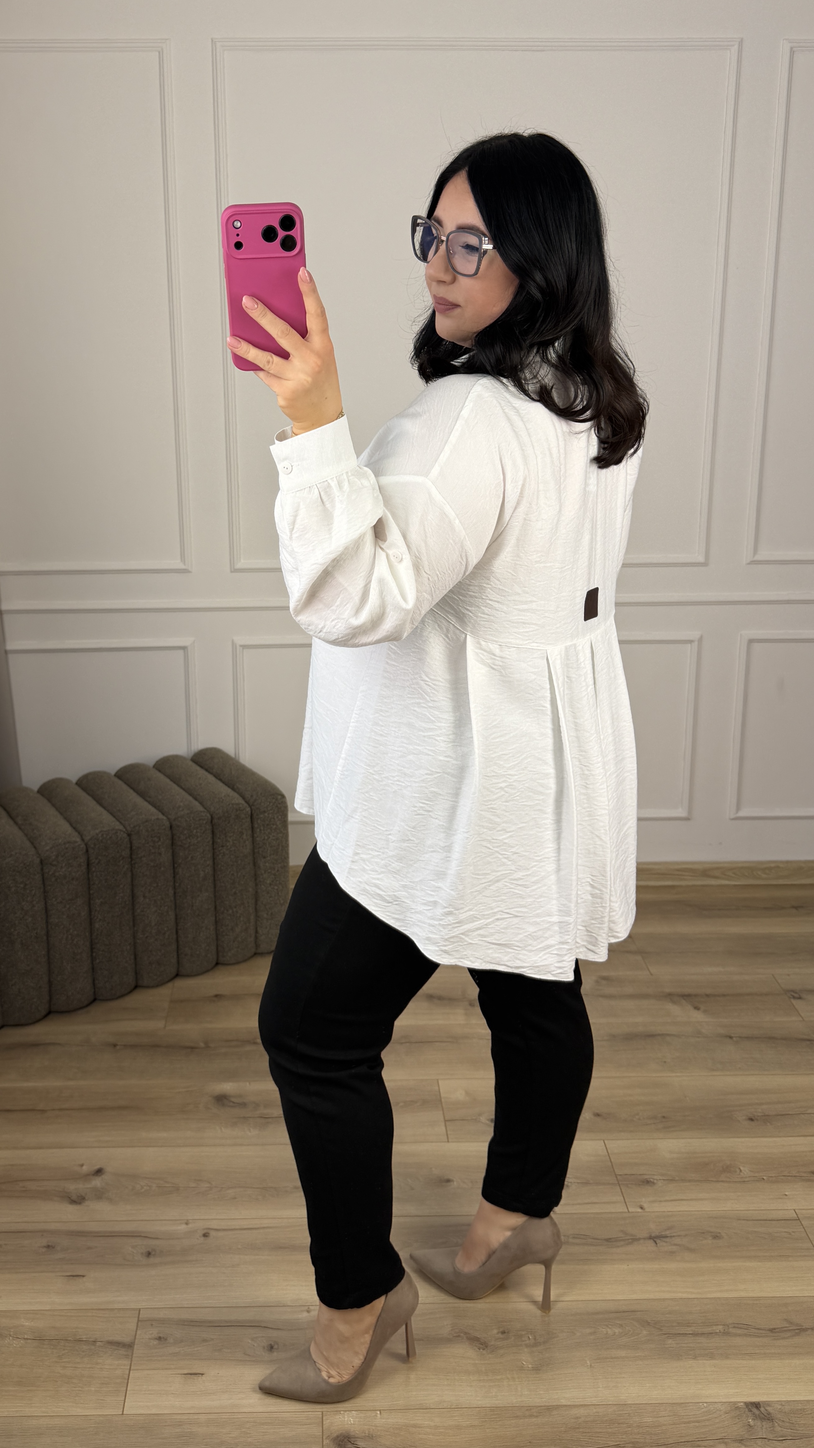 Świetna koszula polskiego producenta z naturalnego materiału, to stylowa i bardzo kobieca propozycja, która świetnie sprawdzi się w wielu stylizacjach. Koszula o klasycznym kroju lekko rozszerzana ku dołowi z efektownym tyłem. Koszula z tyłu posiada dłuższy, plisowany materiał. Koszula posiada kołnierz, zapinana na rząd guzików, posiada długi rękaw wykończony mankietem zapinanym na guzik.