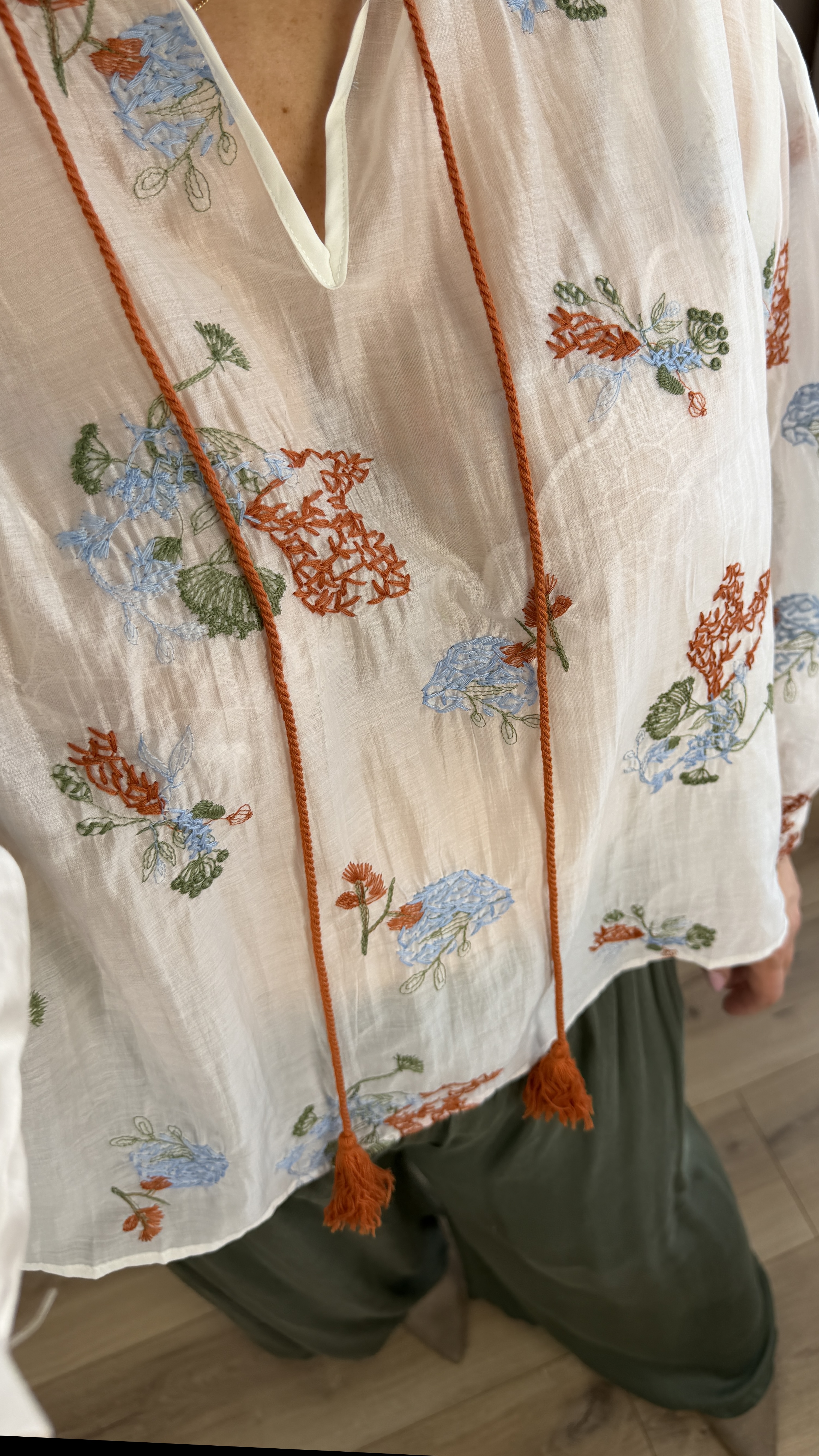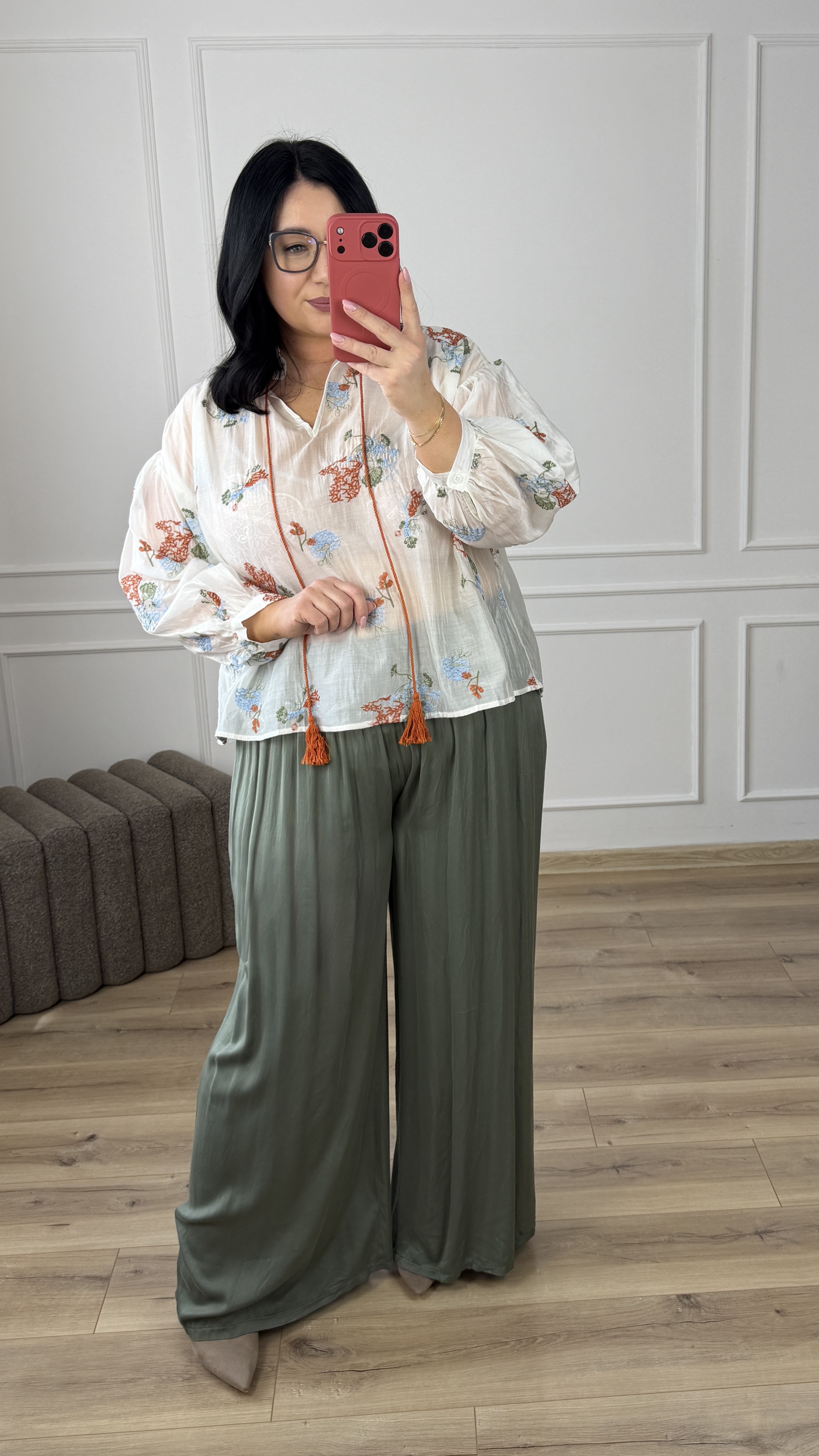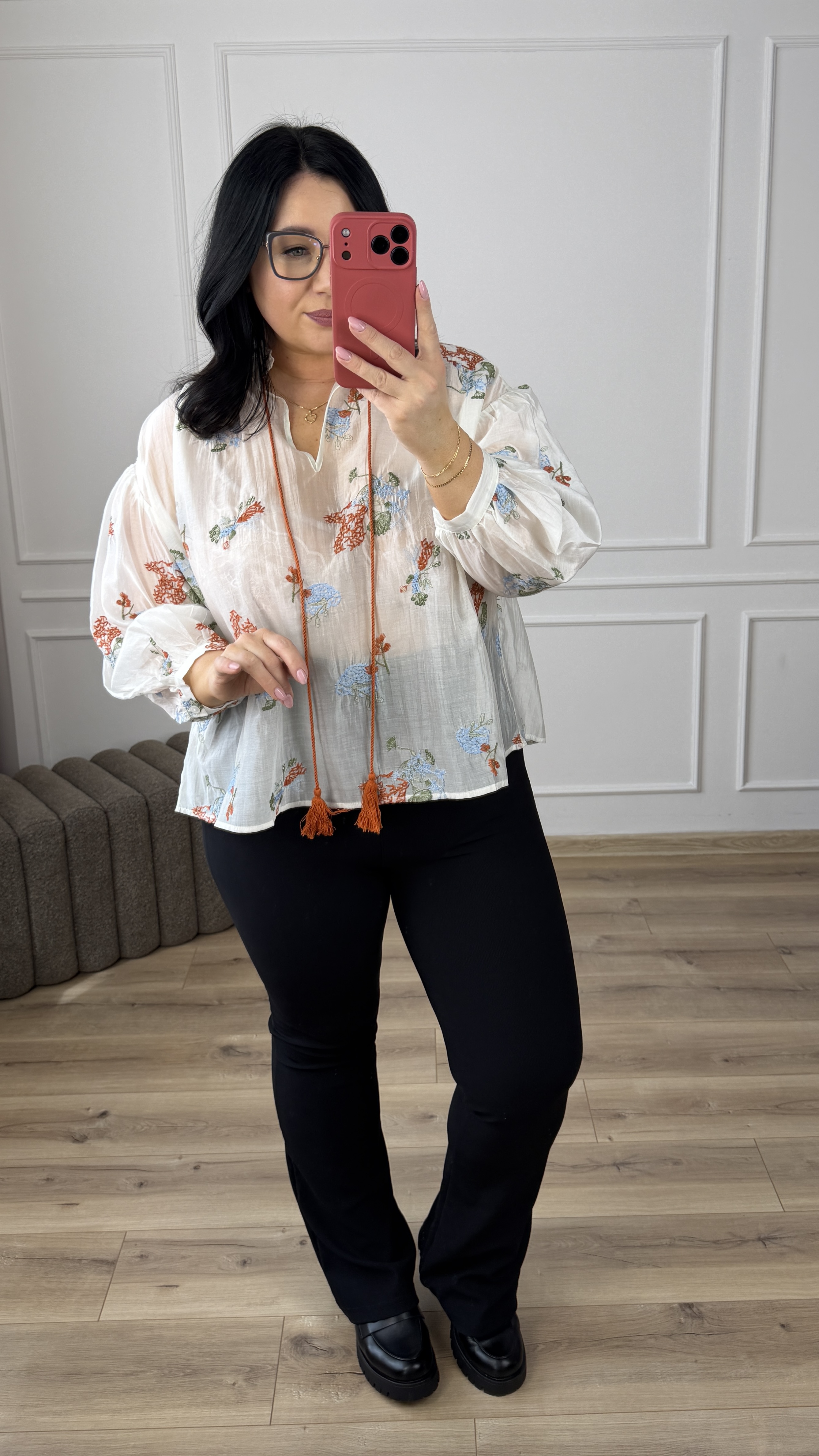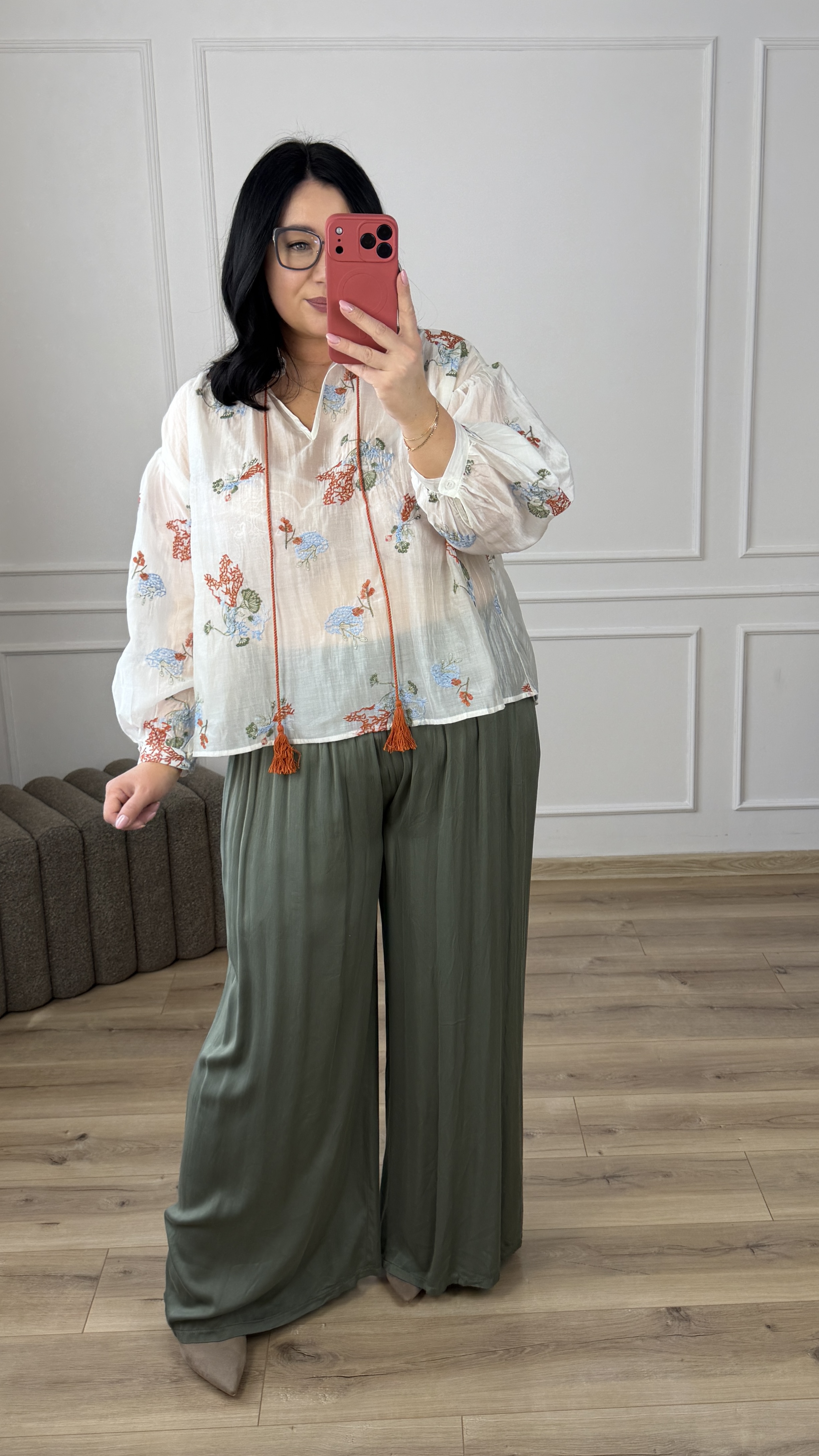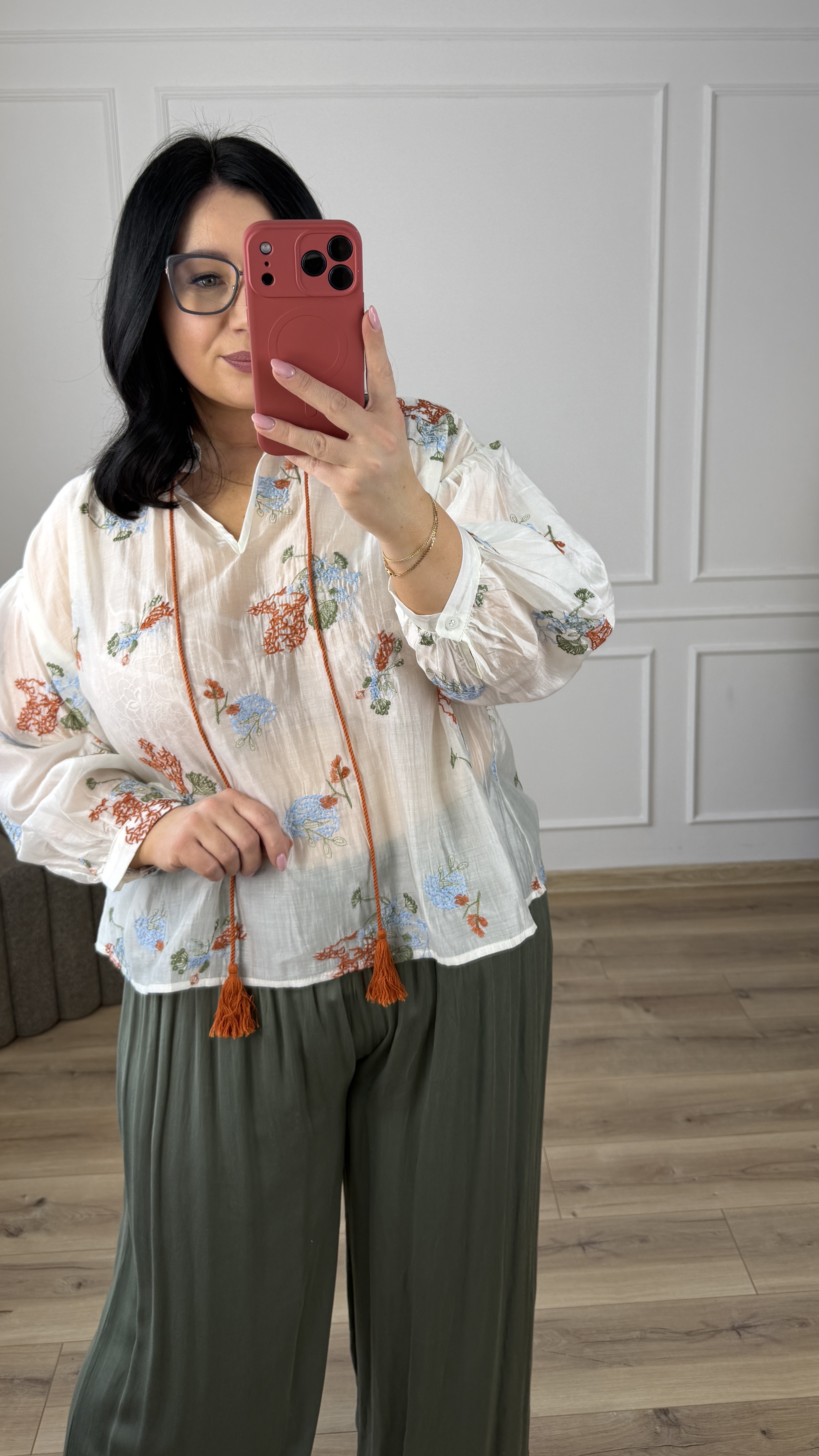 Luźna koszula z lyocellu z kolorowymi haftami. Koszula posiada delikatny dekolt w V wykończony stójką z falbanką oraz wiązanymi troczkami. Koszula o luźnym kroju, który idealnie sprawdzi się na co dzień, posiada długi rękaw z obniżoną linią ramion zakończony mankietem z zapięciem na guzik. Haftowane kolorowe kwiatki, gałązki dodają jej dziewczęcego uroku.