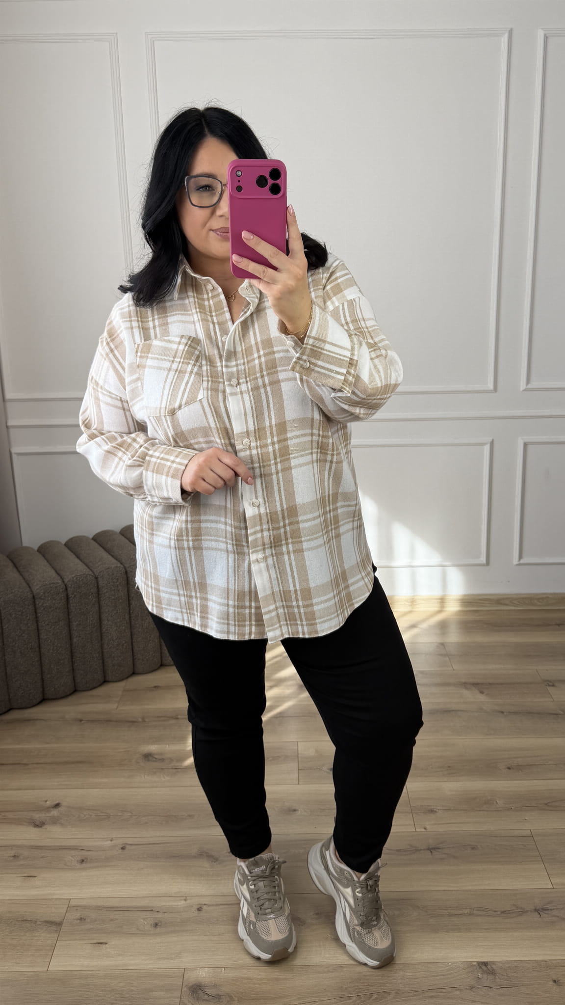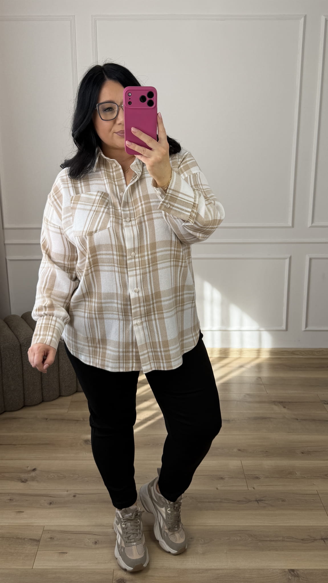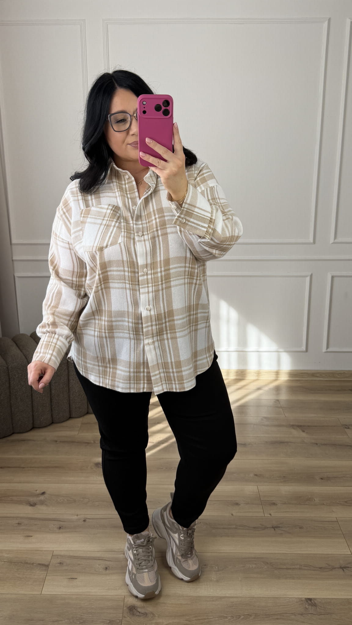 Luźna koszula wykonana z lekkiego i oddychającego materiału 85% tencel i 15% bawełna. Uniwersalny wzór w kratę, który nadaje całości lekkości i nowoczesnego charakteru.Klasyczny krój z lekko dłuższym tyłem, zapinany na rząd guzików, długi rękaw wykończony mankietem. To uniwersalny model, idealny do codziennych stylizacji.