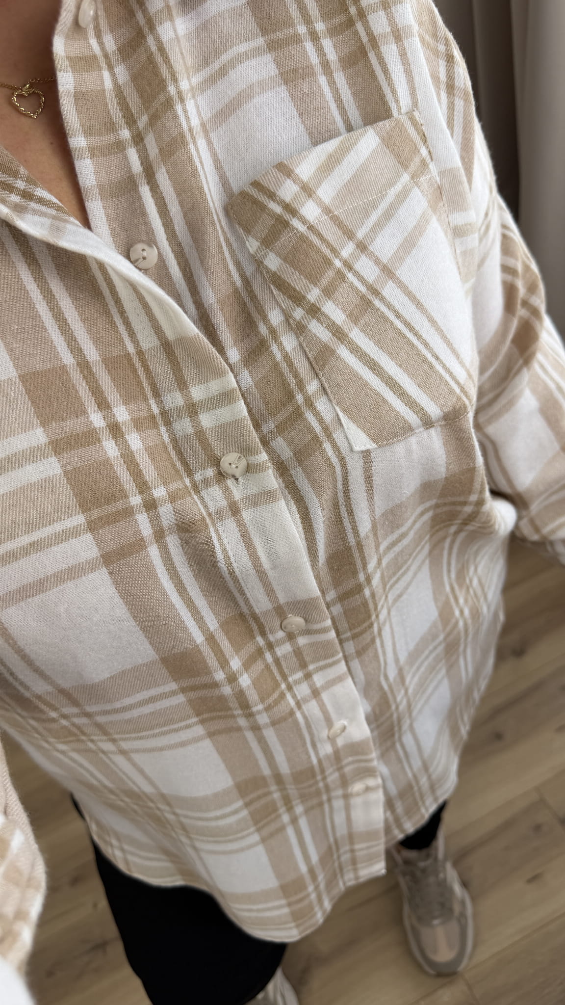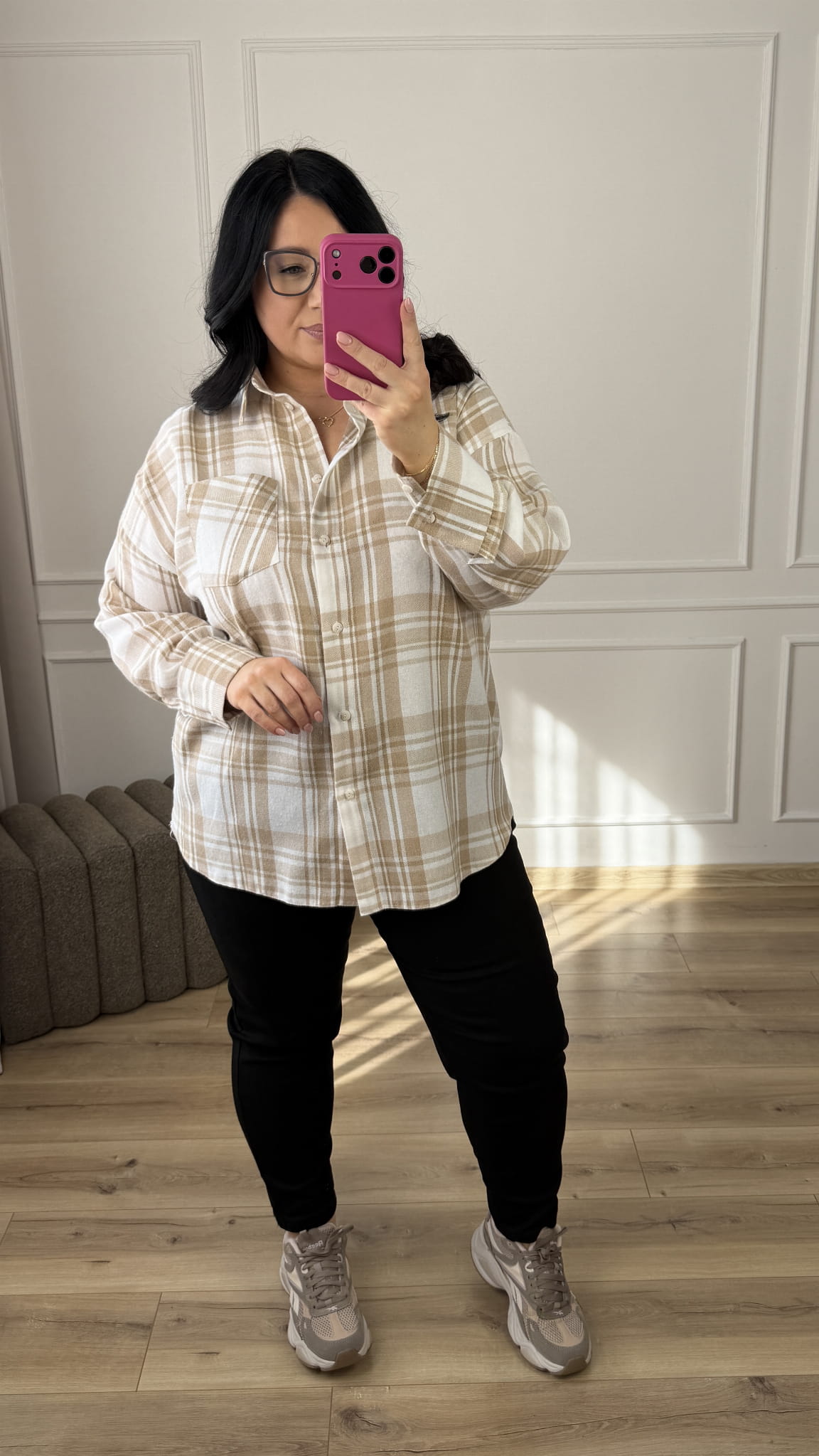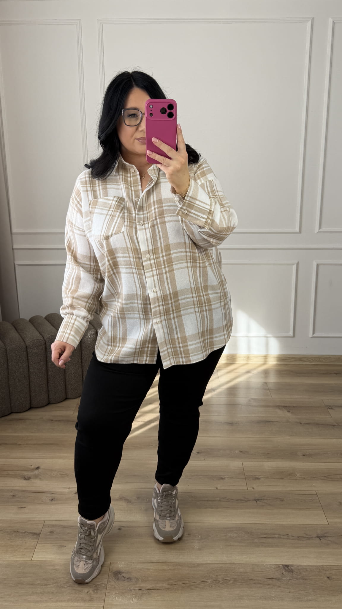 Luźna koszula wykonana z lekkiego i oddychającego materiału 85% tencel i 15% bawełna. Uniwersalny wzór w kratę, który nadaje całości lekkości i nowoczesnego charakteru.Klasyczny krój z lekko dłuższym tyłem, zapinany na rząd guzików, długi rękaw wykończony mankietem. To uniwersalny model, idealny do codziennych stylizacji.