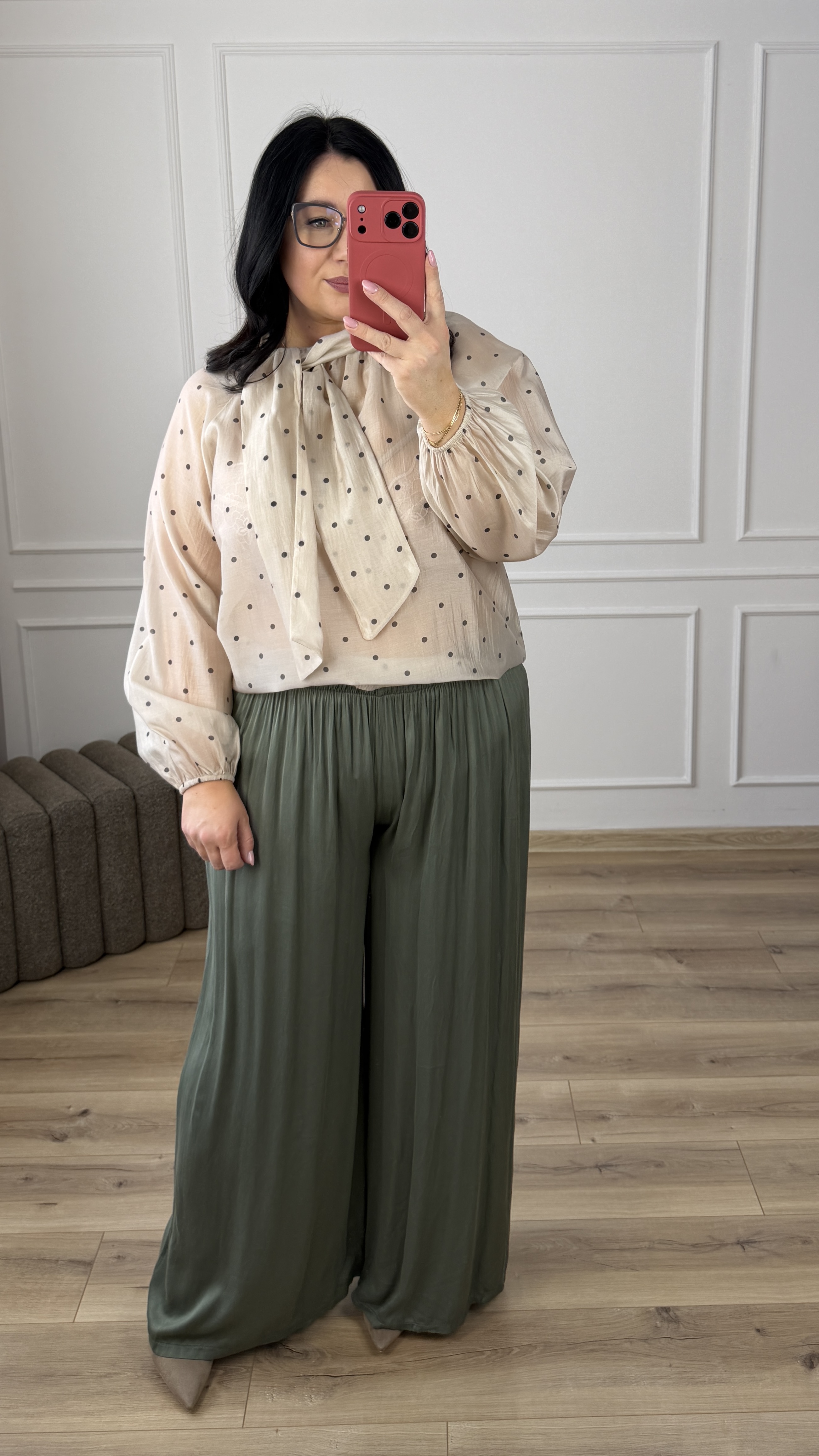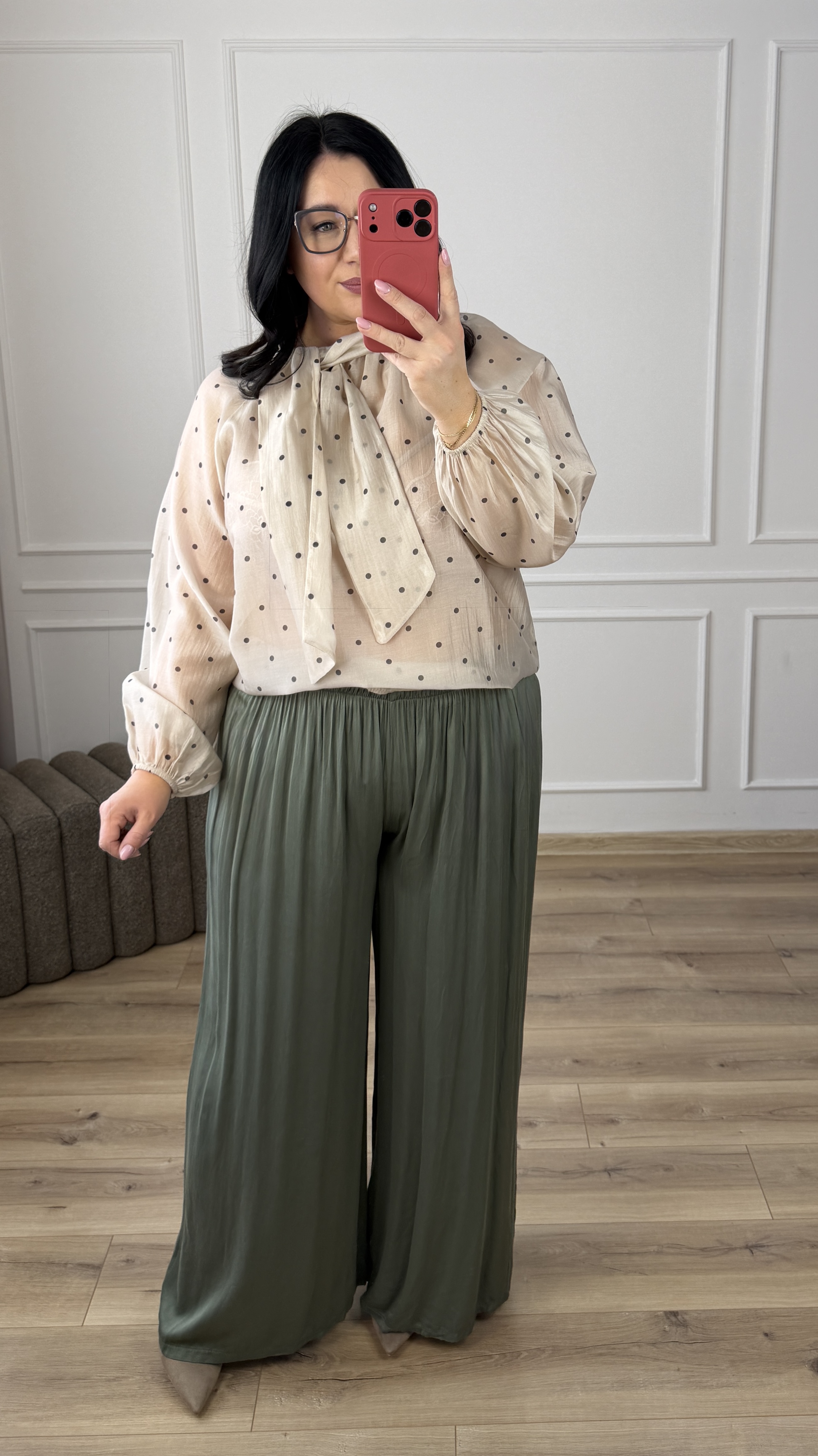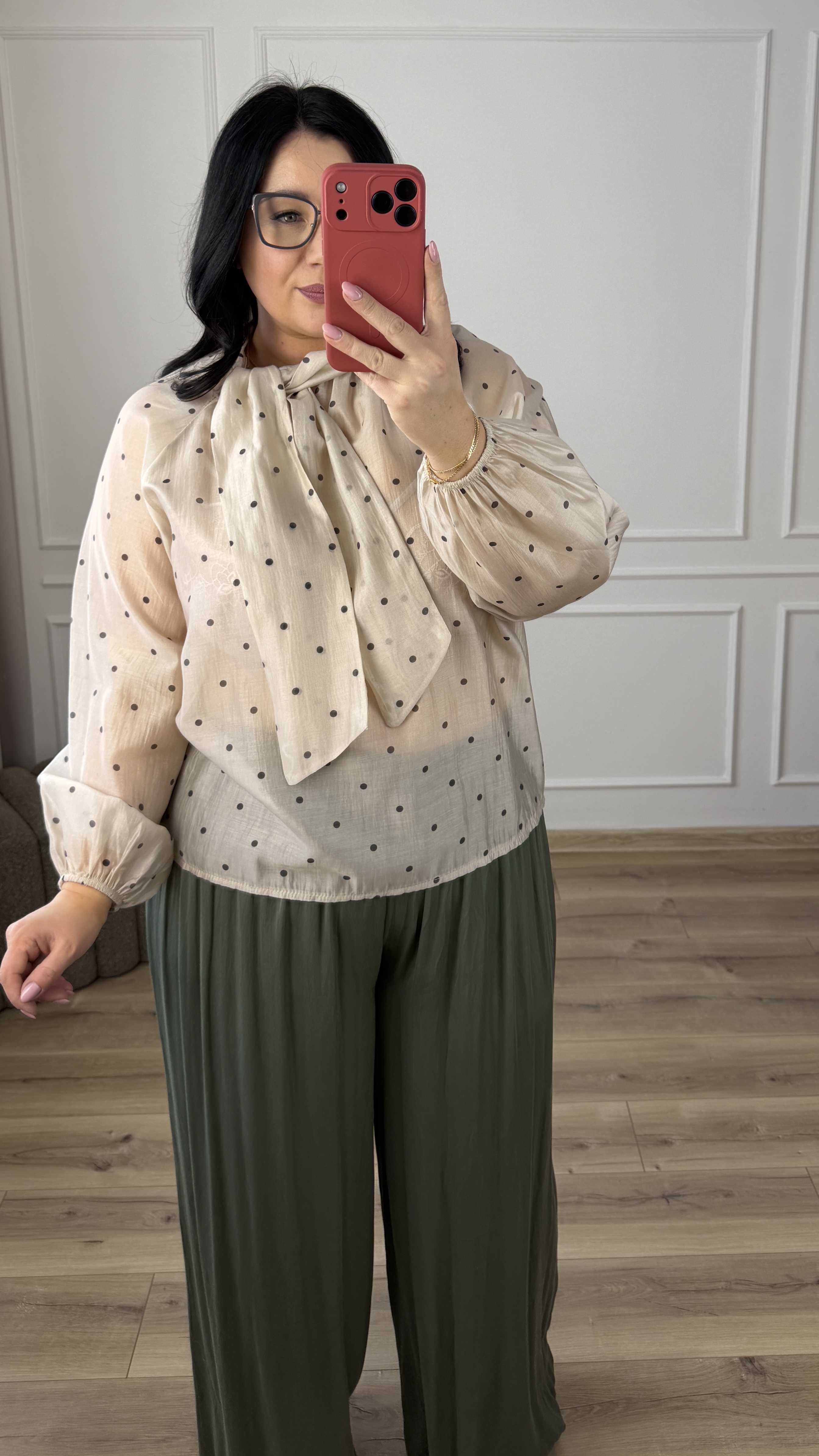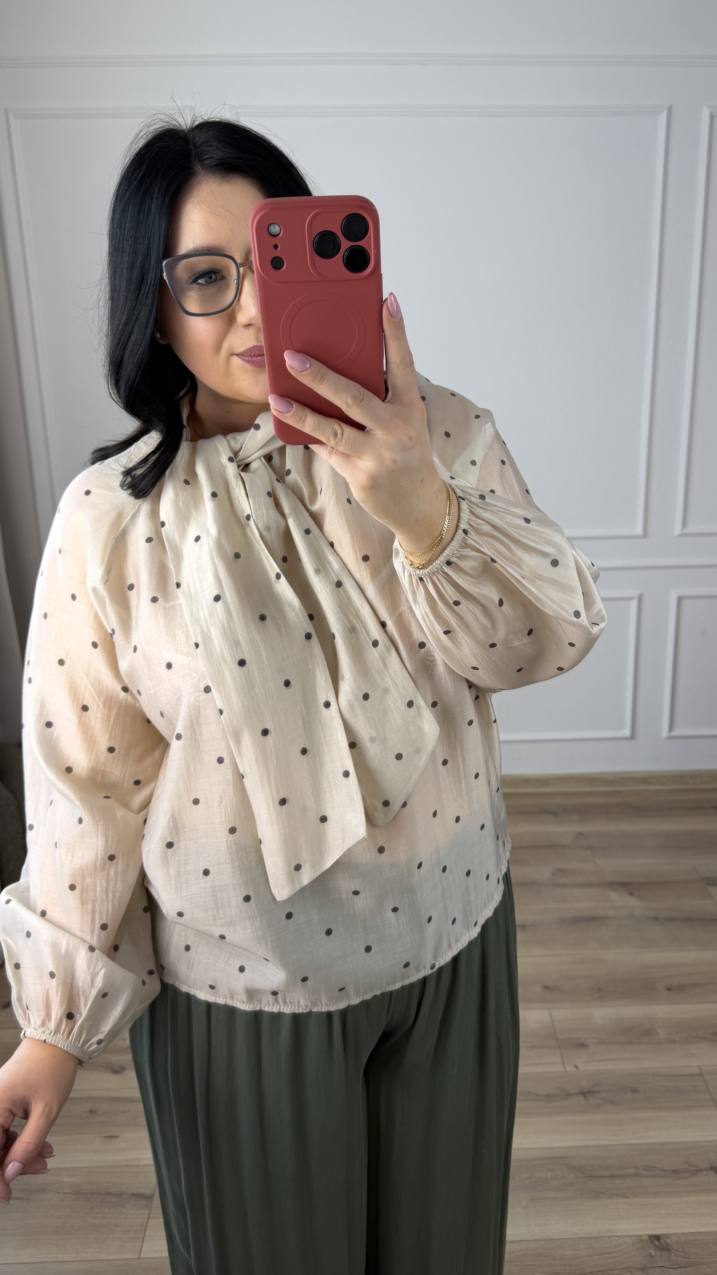 Transparentna koszula z oddychającego tencelu w groszki. Posiada wiązanie materiału przy dekolcie. Długi luźniejszy rękaw zakończony gumką. Model świetnie sprawdzi się w połączeniu ze spódnicą czy spodniami z wysokim stanem.