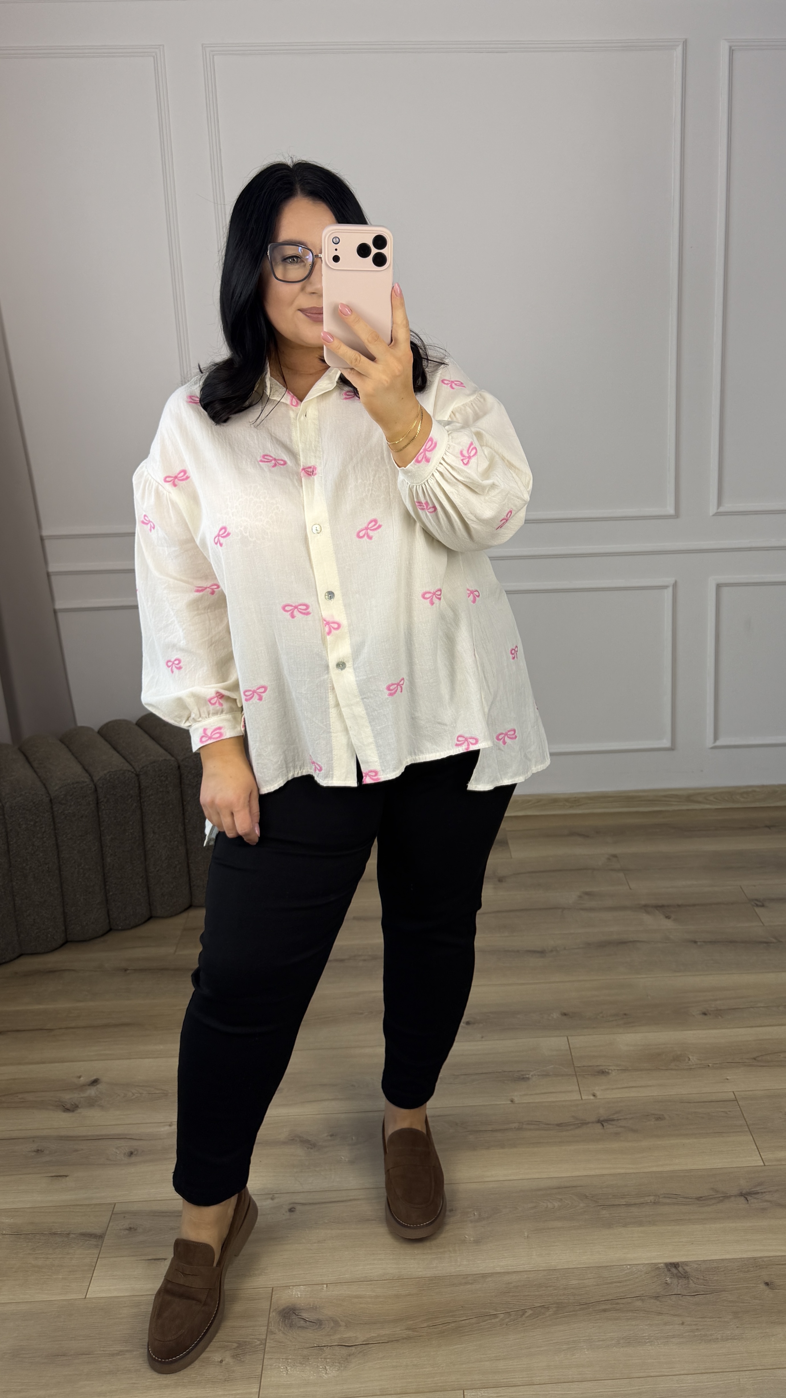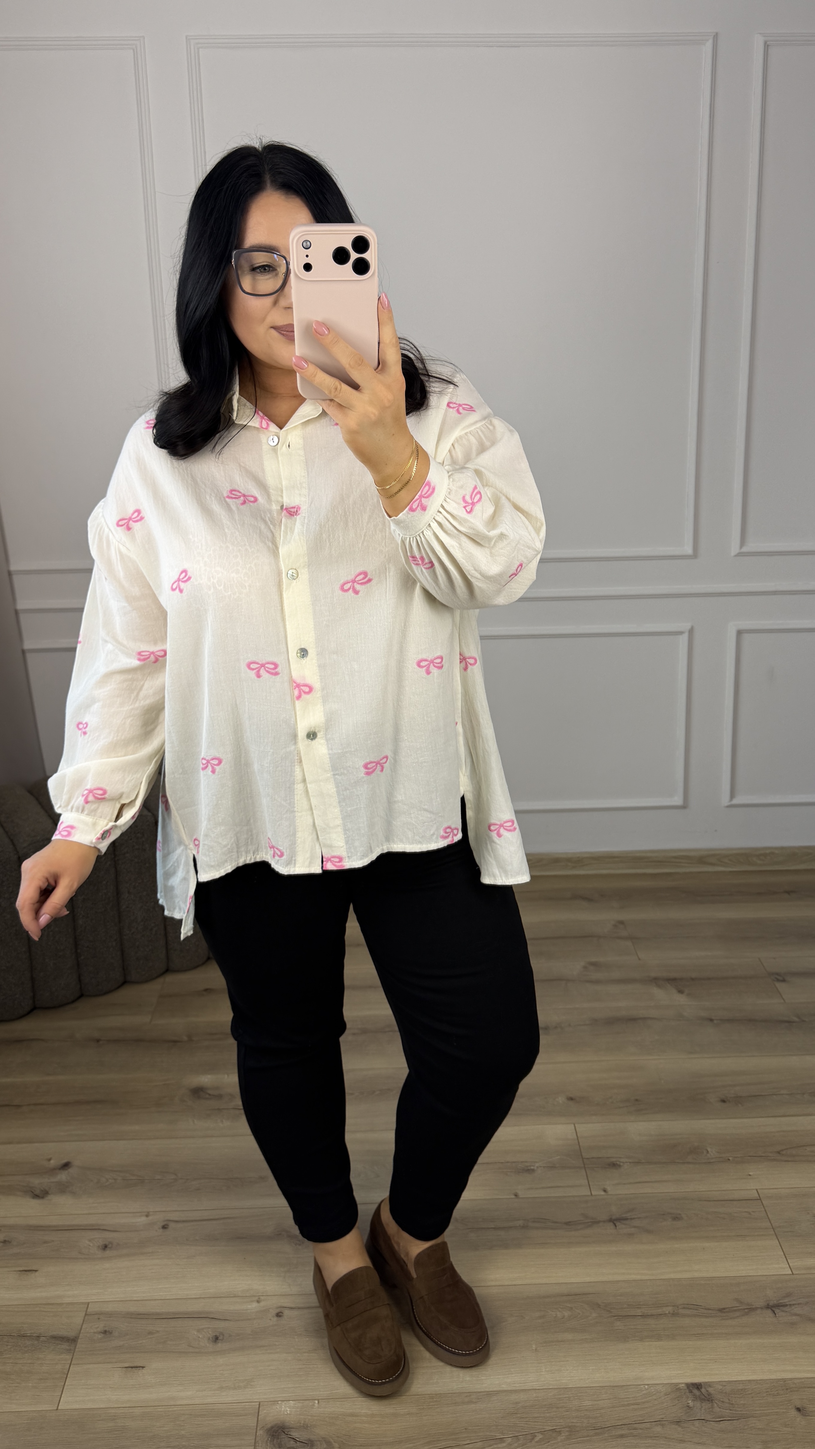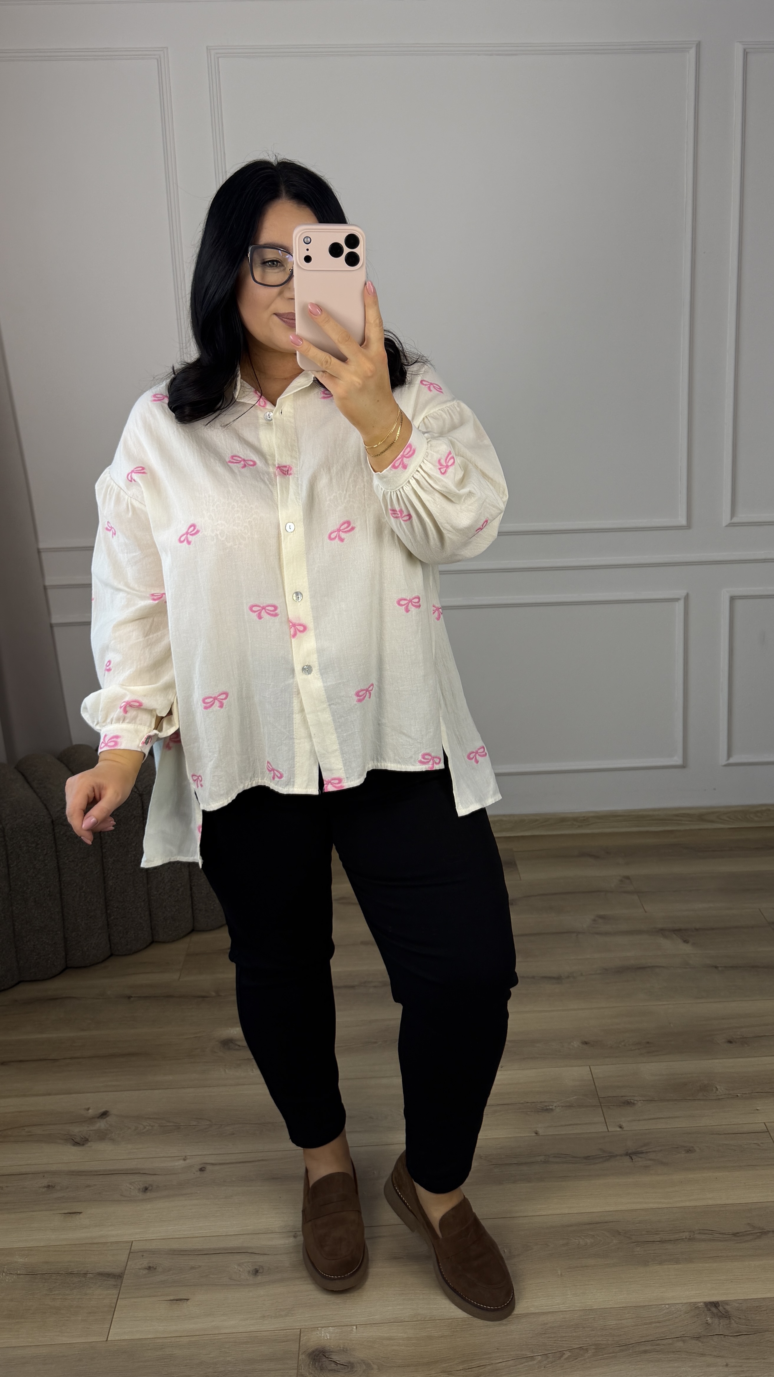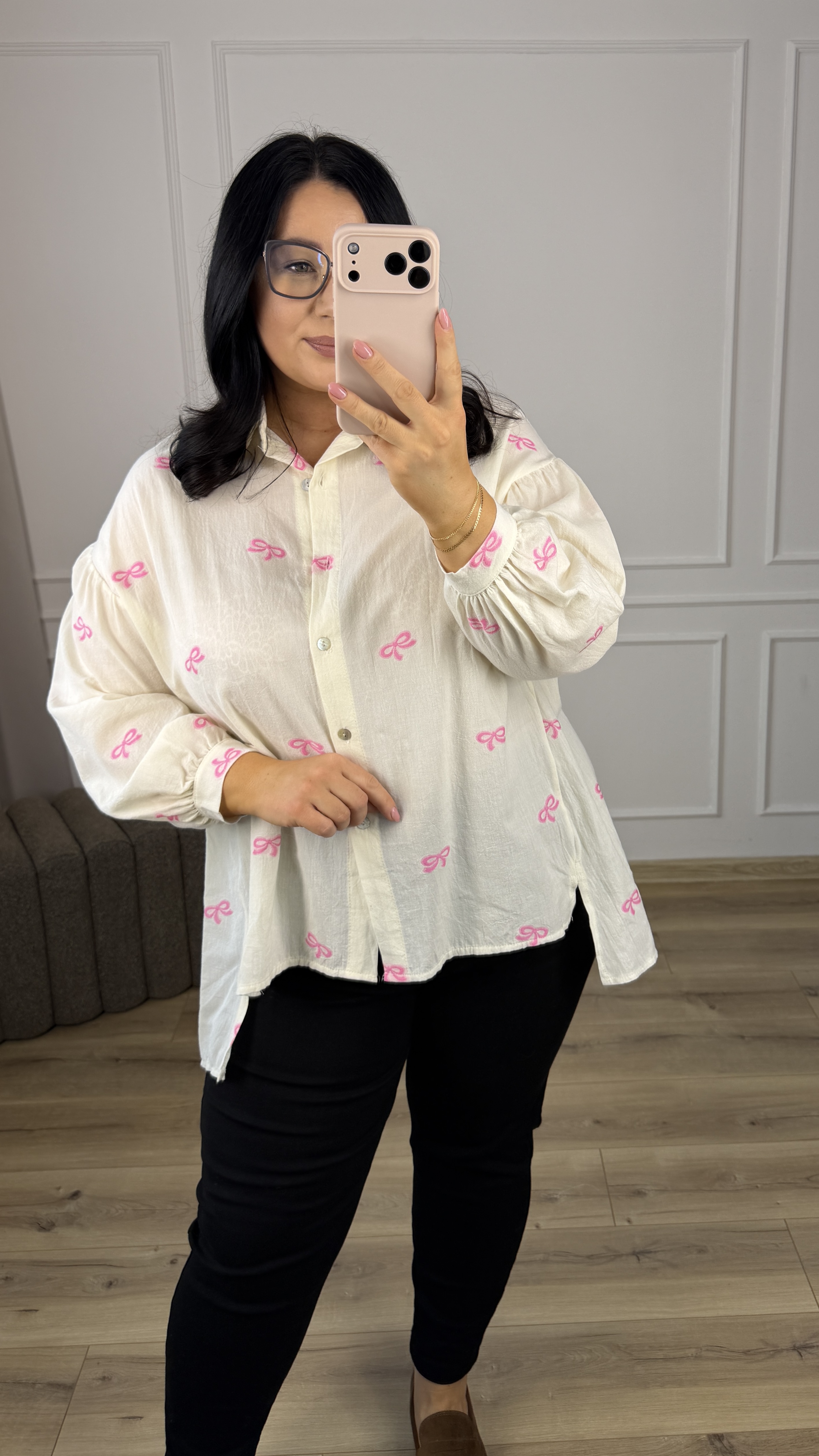 Bawełniana koszula o luźnym kroju z haftowanymi w materiale różowymi kokardkami. Klasyczny krój z lekko dłuższym tyłem, zapinany na rząd guzików, obniżony, długi rękaw wykończony mankietem. Model dzięki swojej uniwersalności świetnie sprawdzi się na co dzień jak i na większe wyjścia.