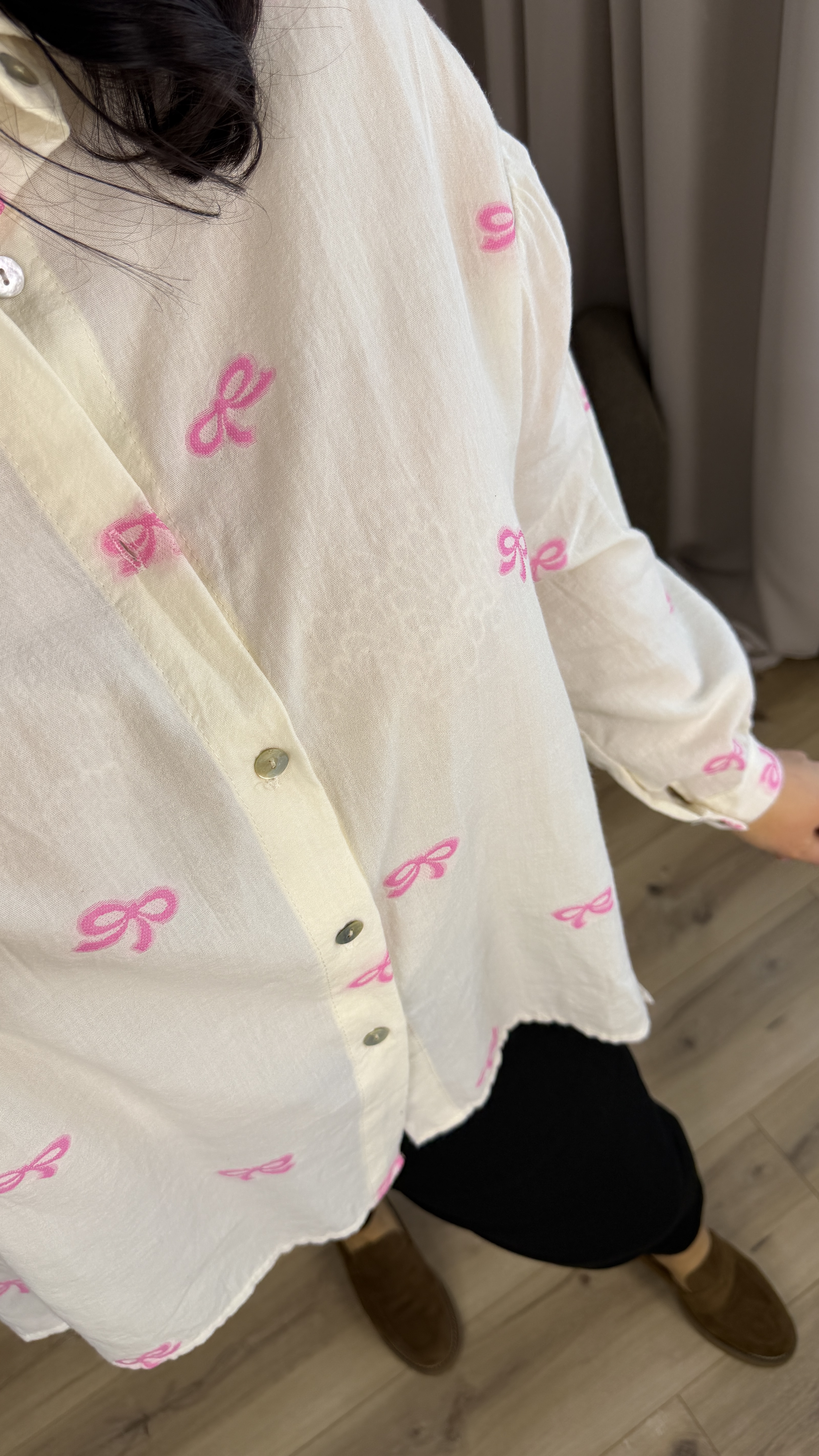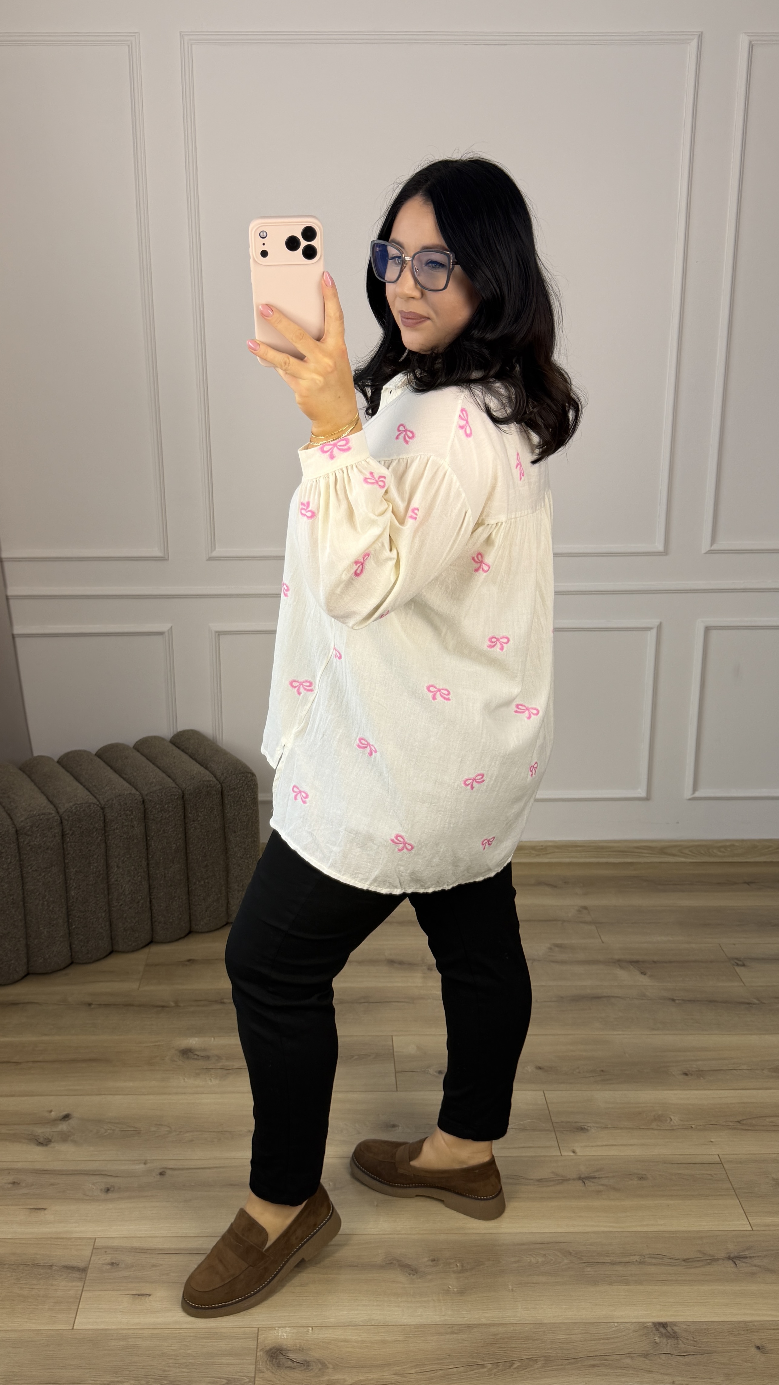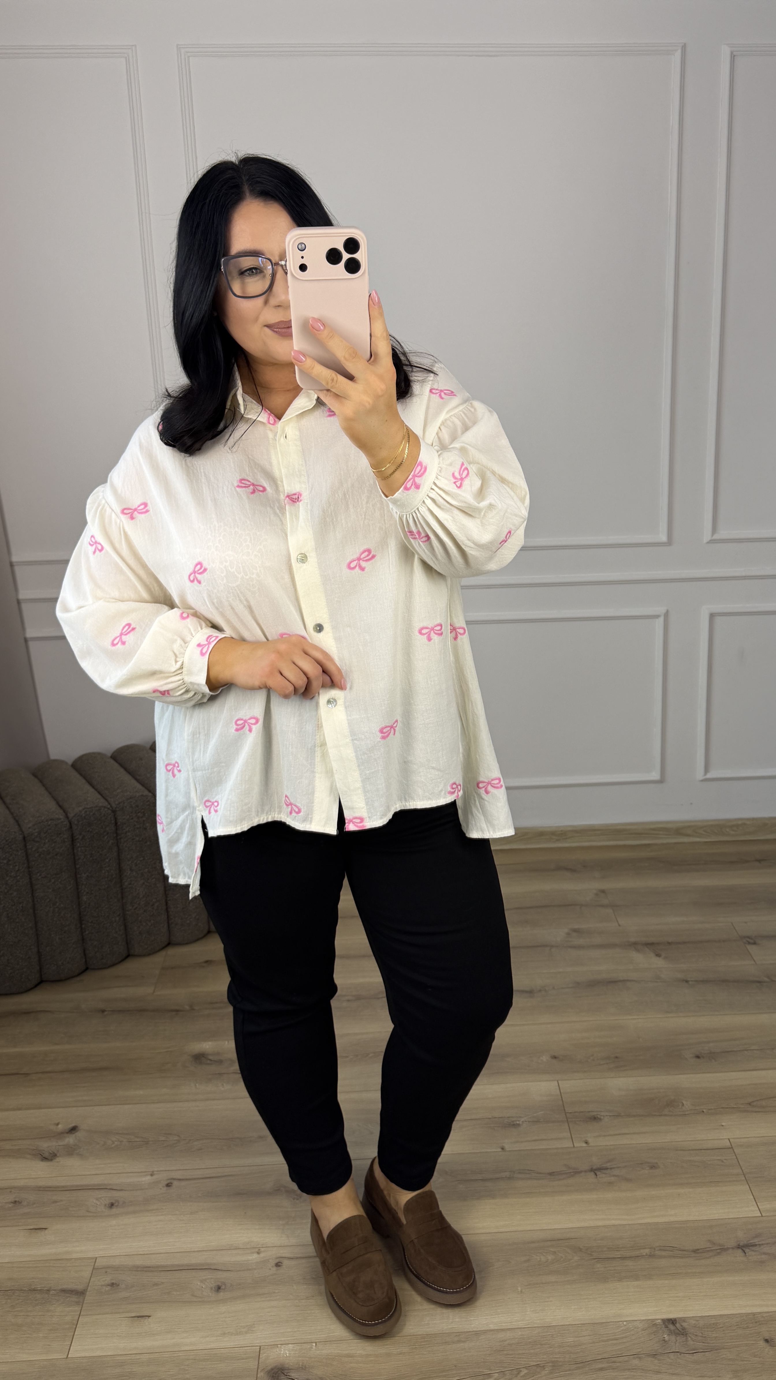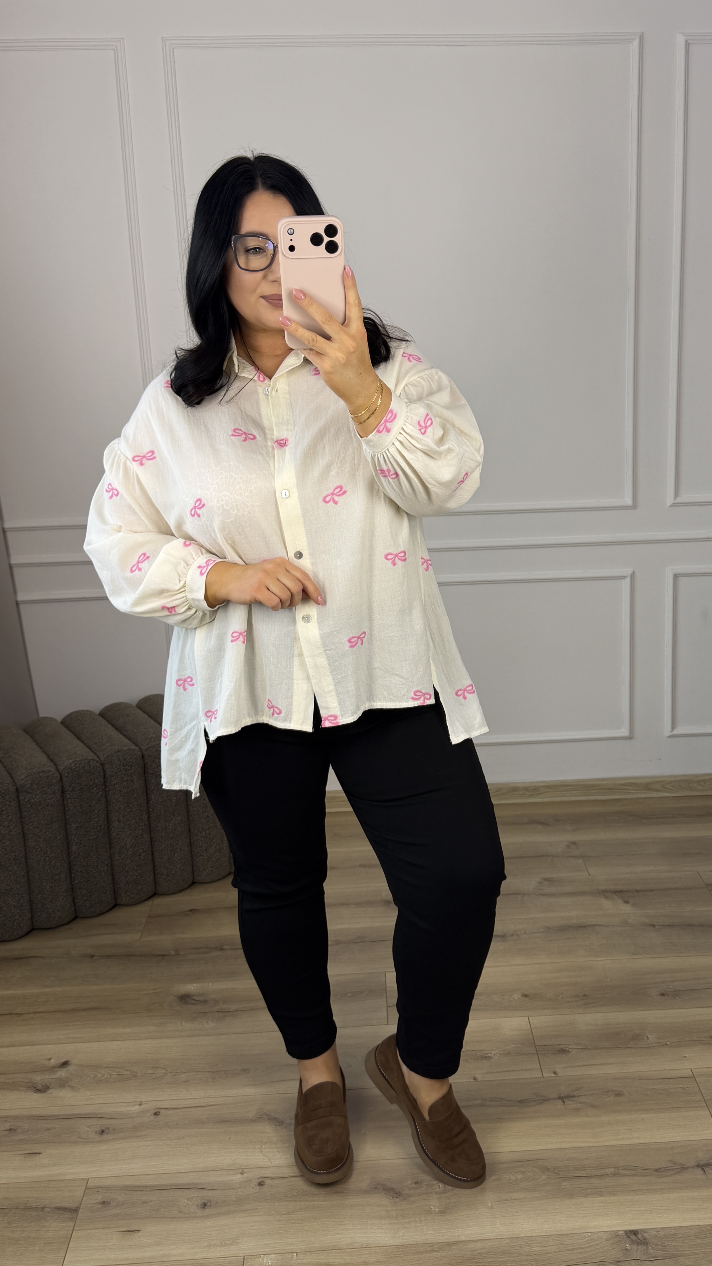 Bawełniana koszula o luźnym kroju z haftowanymi w materiale różowymi kokardkami. Klasyczny krój z lekko dłuższym tyłem, zapinany na rząd guzików, obniżony, długi rękaw wykończony mankietem. Model dzięki swojej uniwersalności świetnie sprawdzi się na co dzień jak i na większe wyjścia.