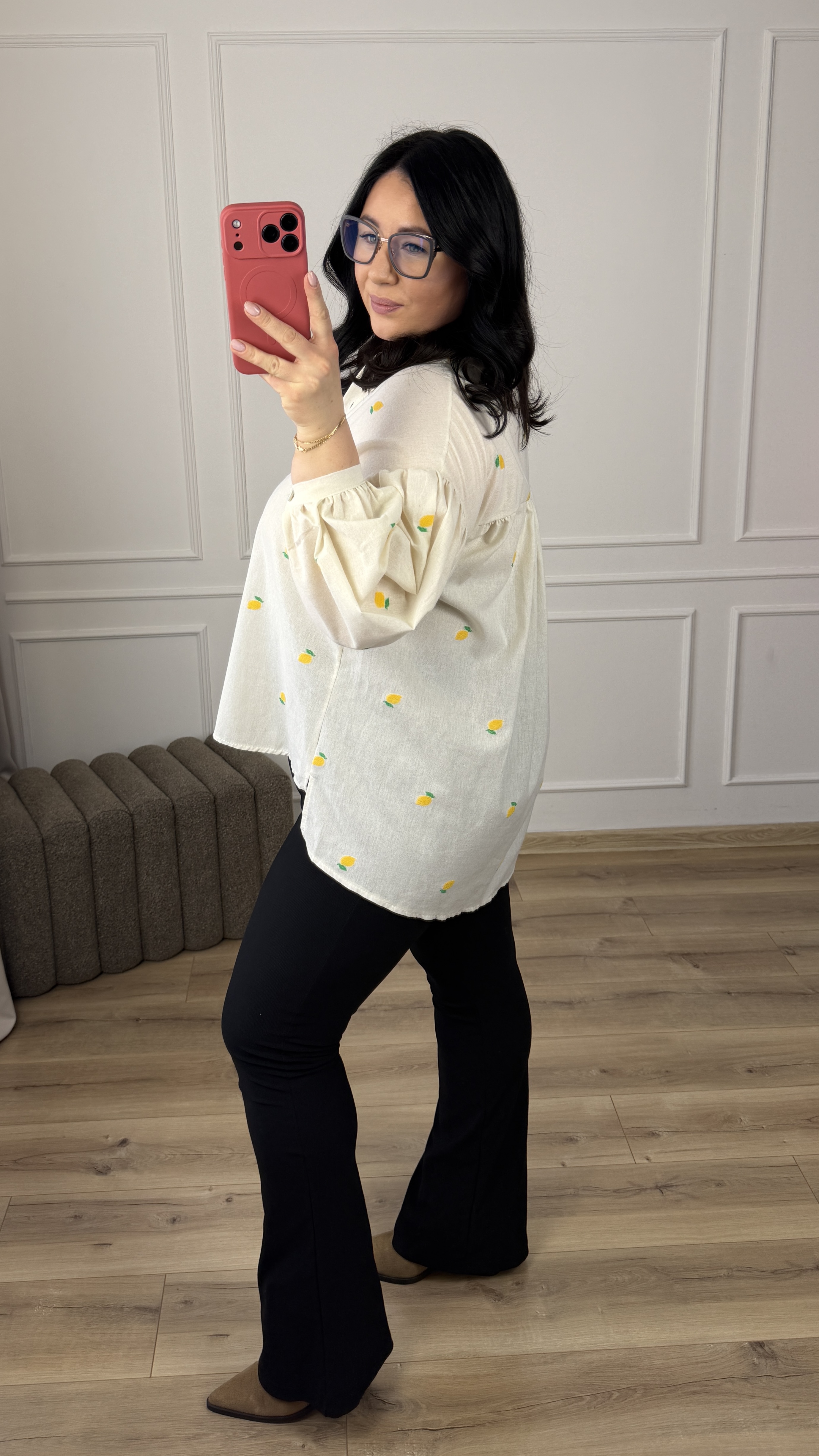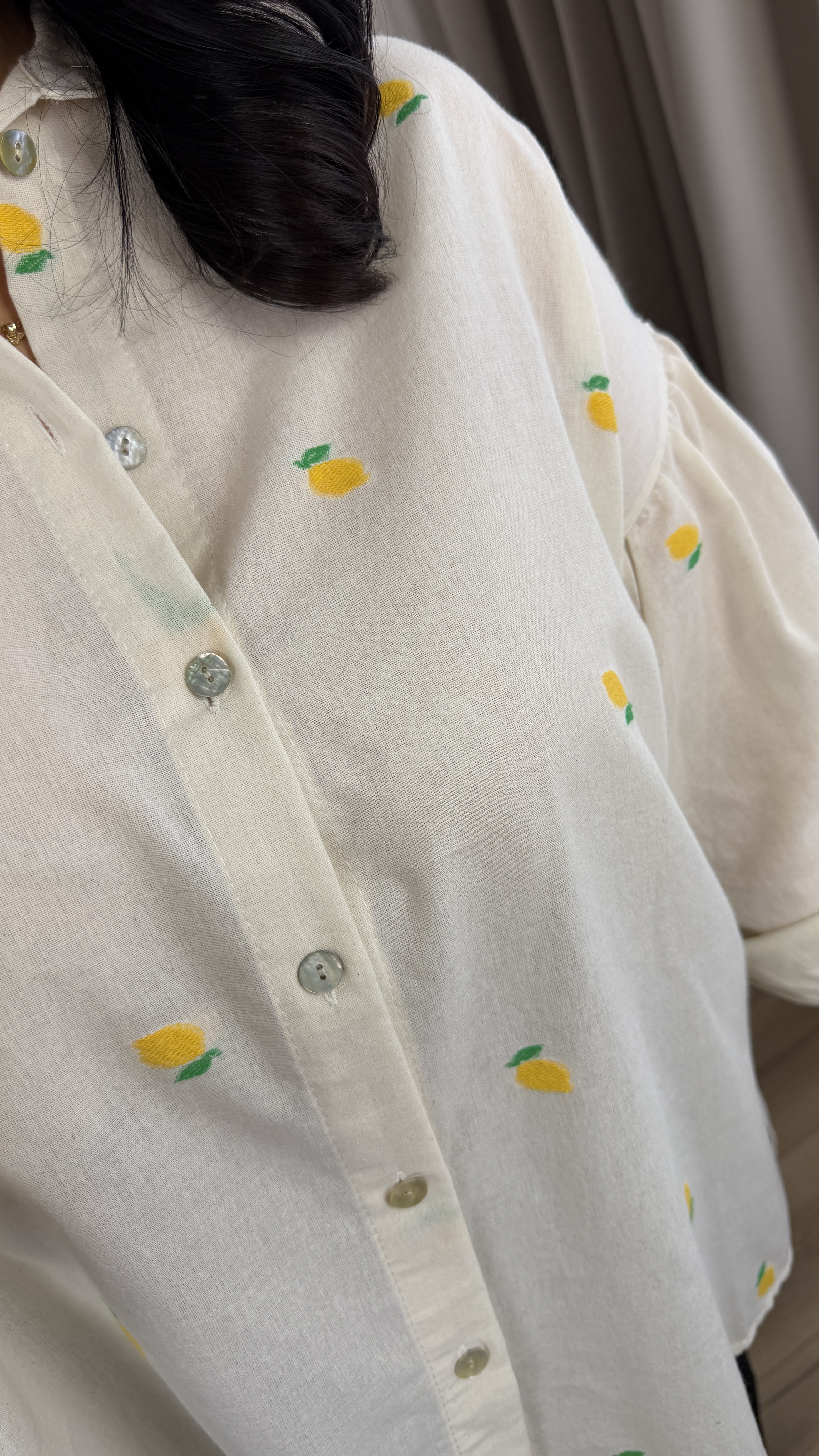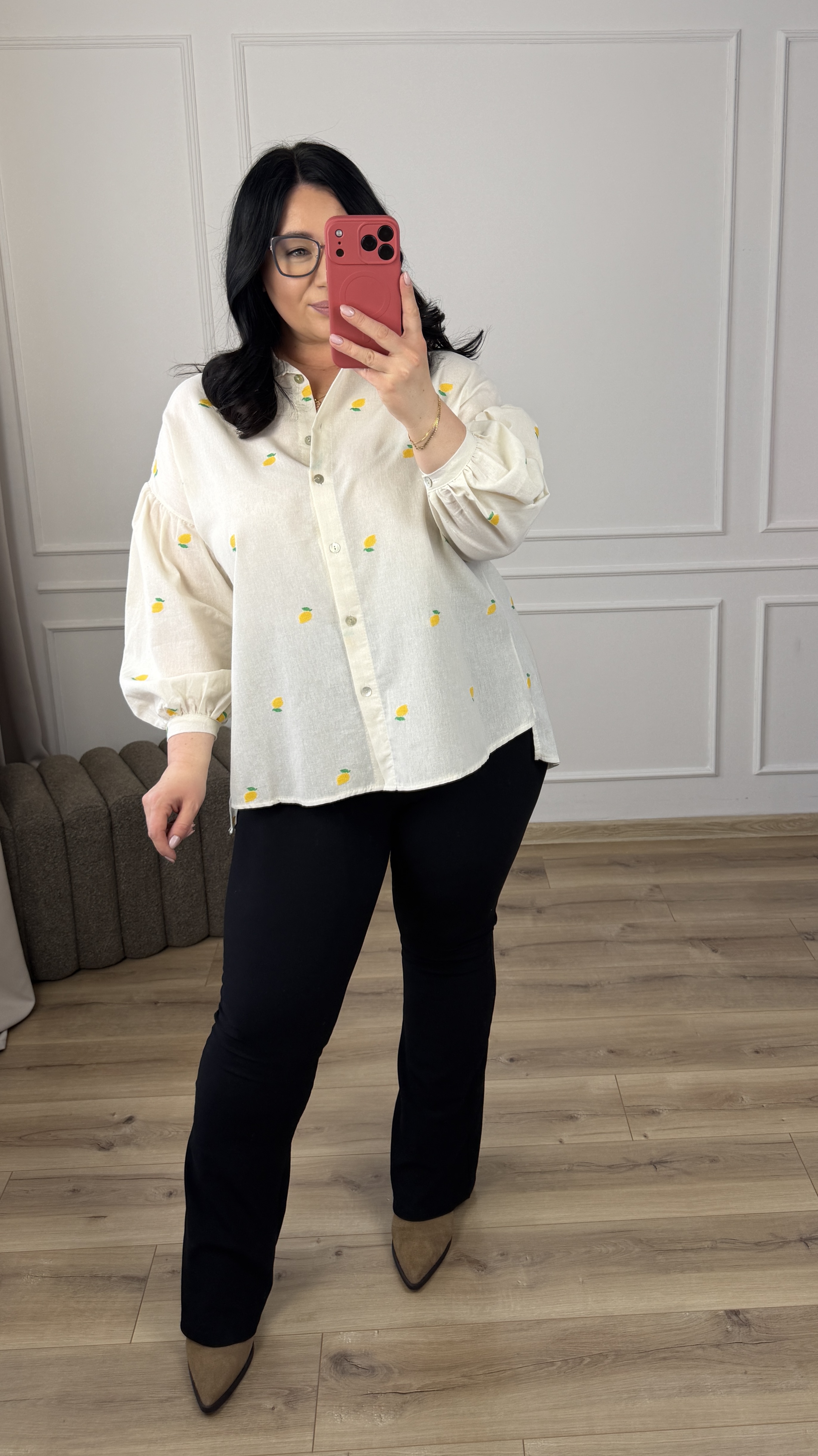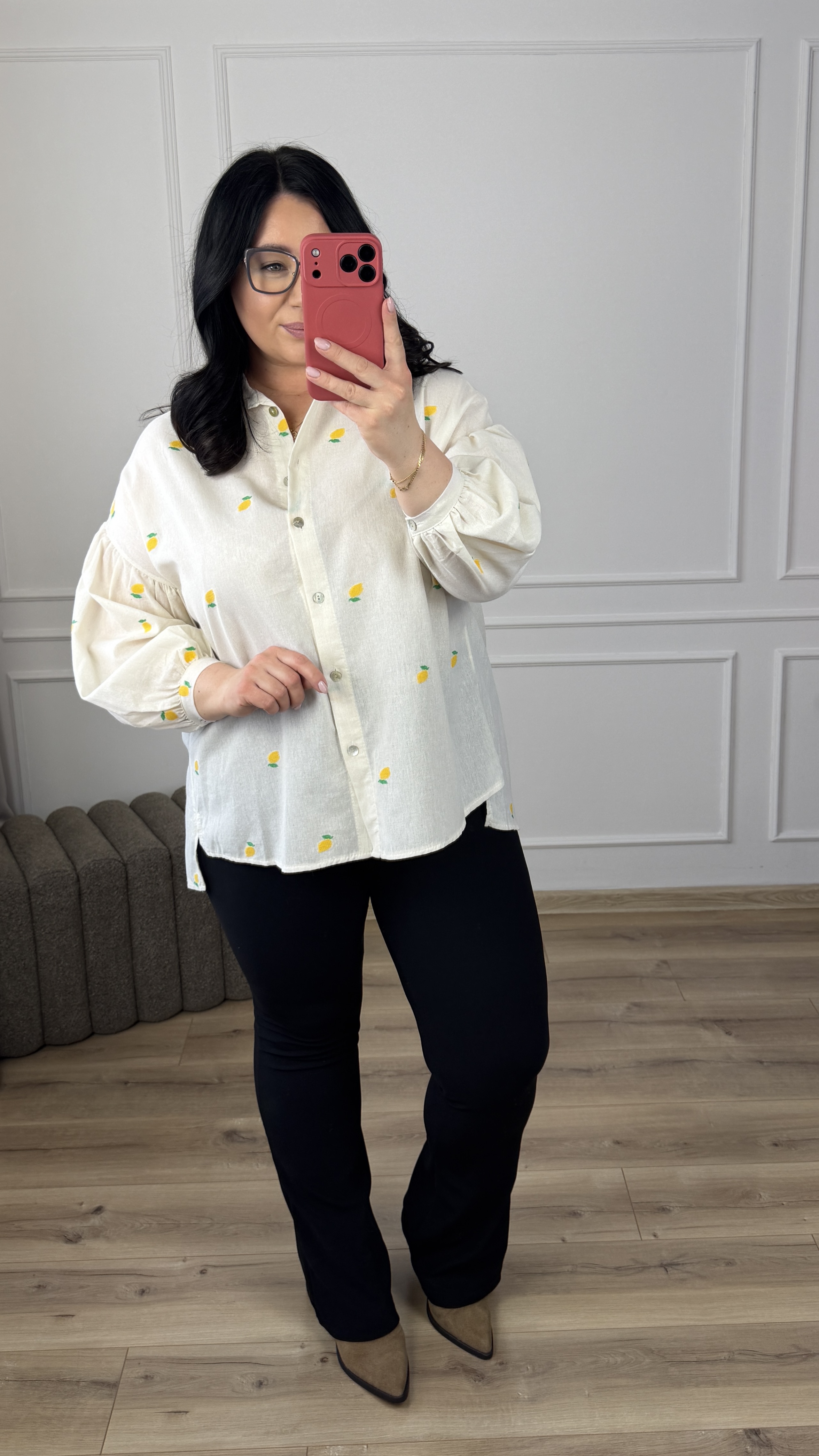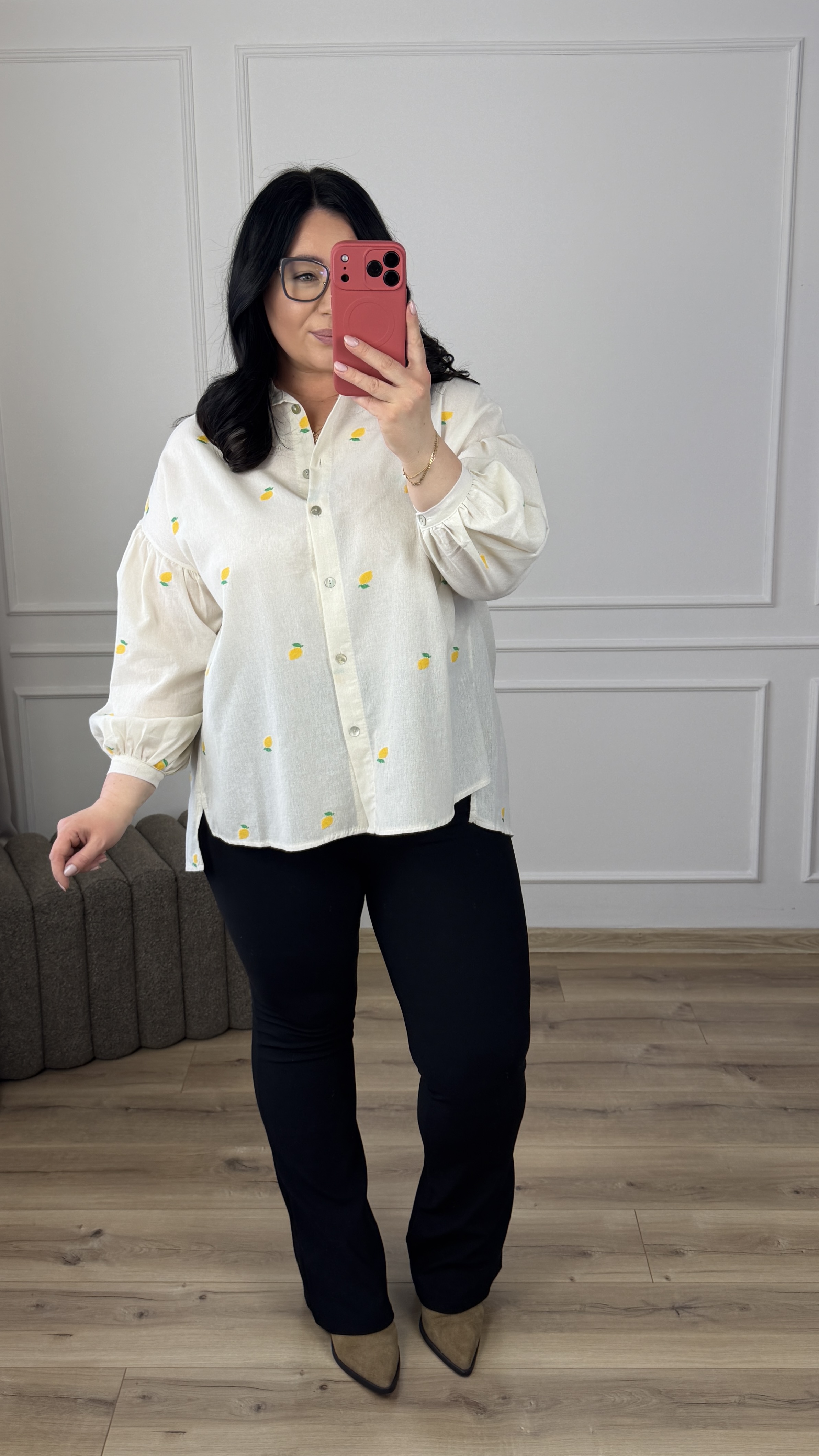 Bawełniana koszula o luźnym kroju z haftowanymi w materiale cytrynami. Klasyczny krój z lekko dłuższym tyłem, zapinany na rząd guzików, obniżony, długi rękaw wykończony mankietem. Model dzięki swojej uniwersalności świetnie sprawdzi się na co dzień jak i na większe wyjścia.