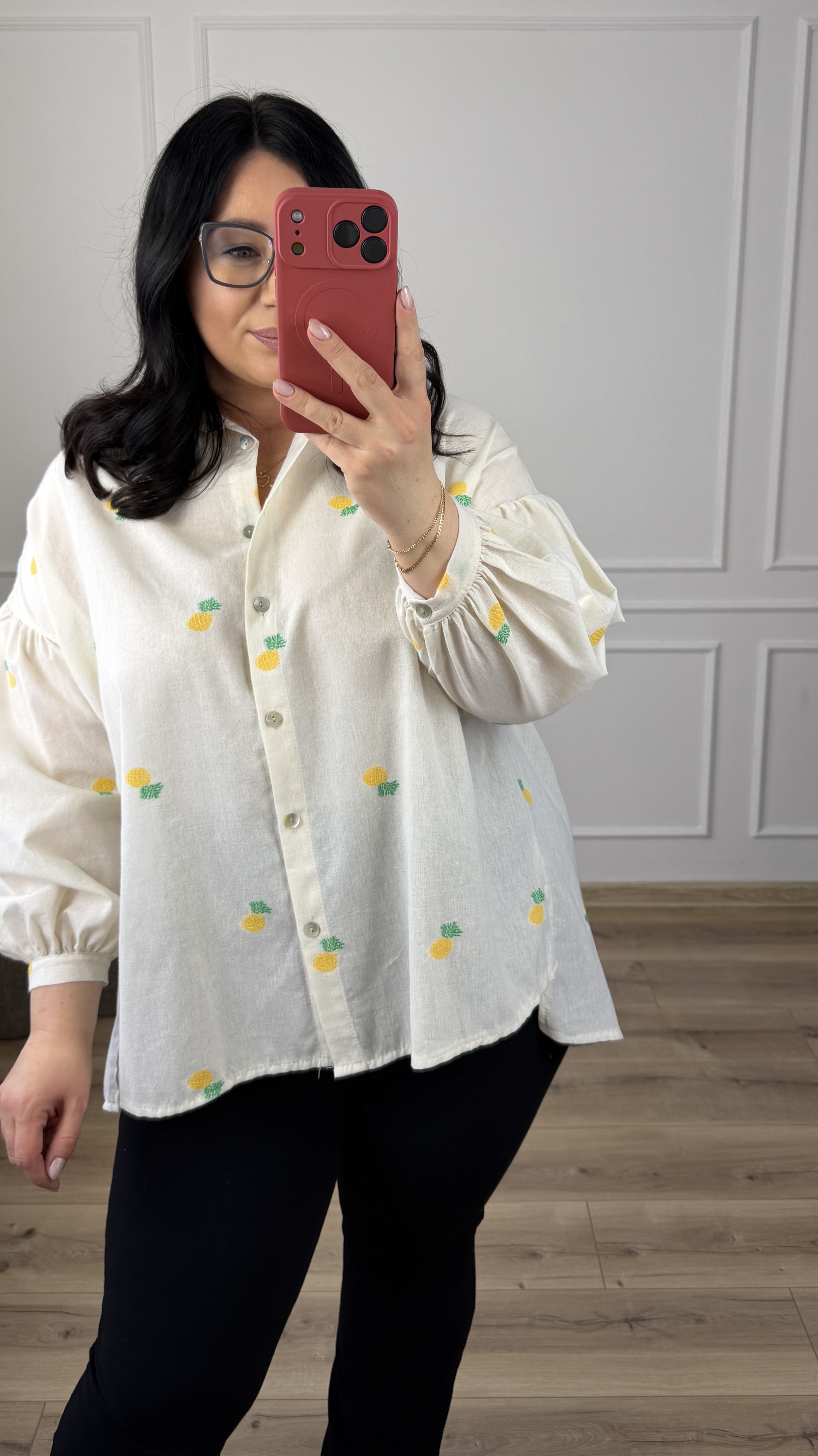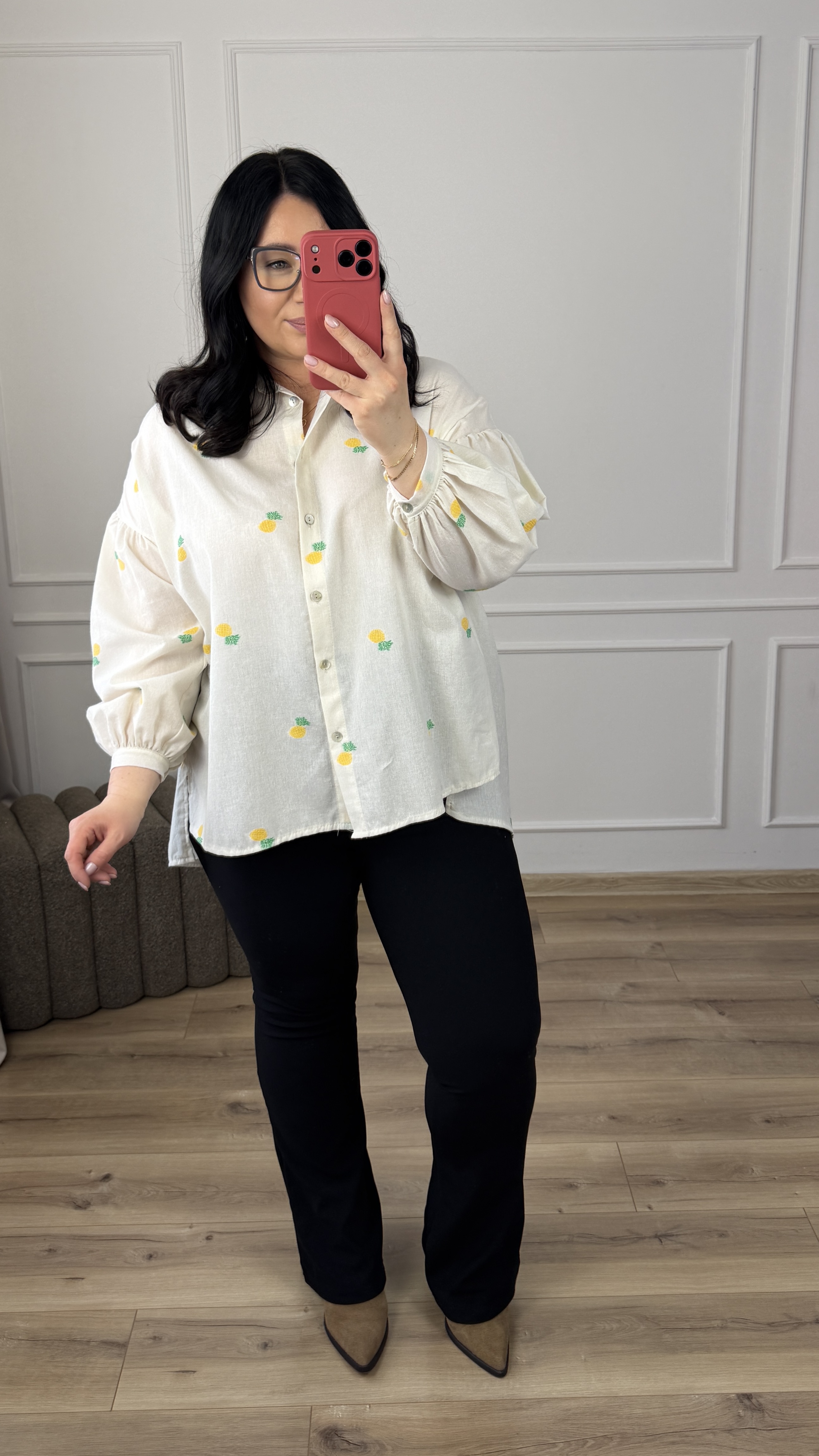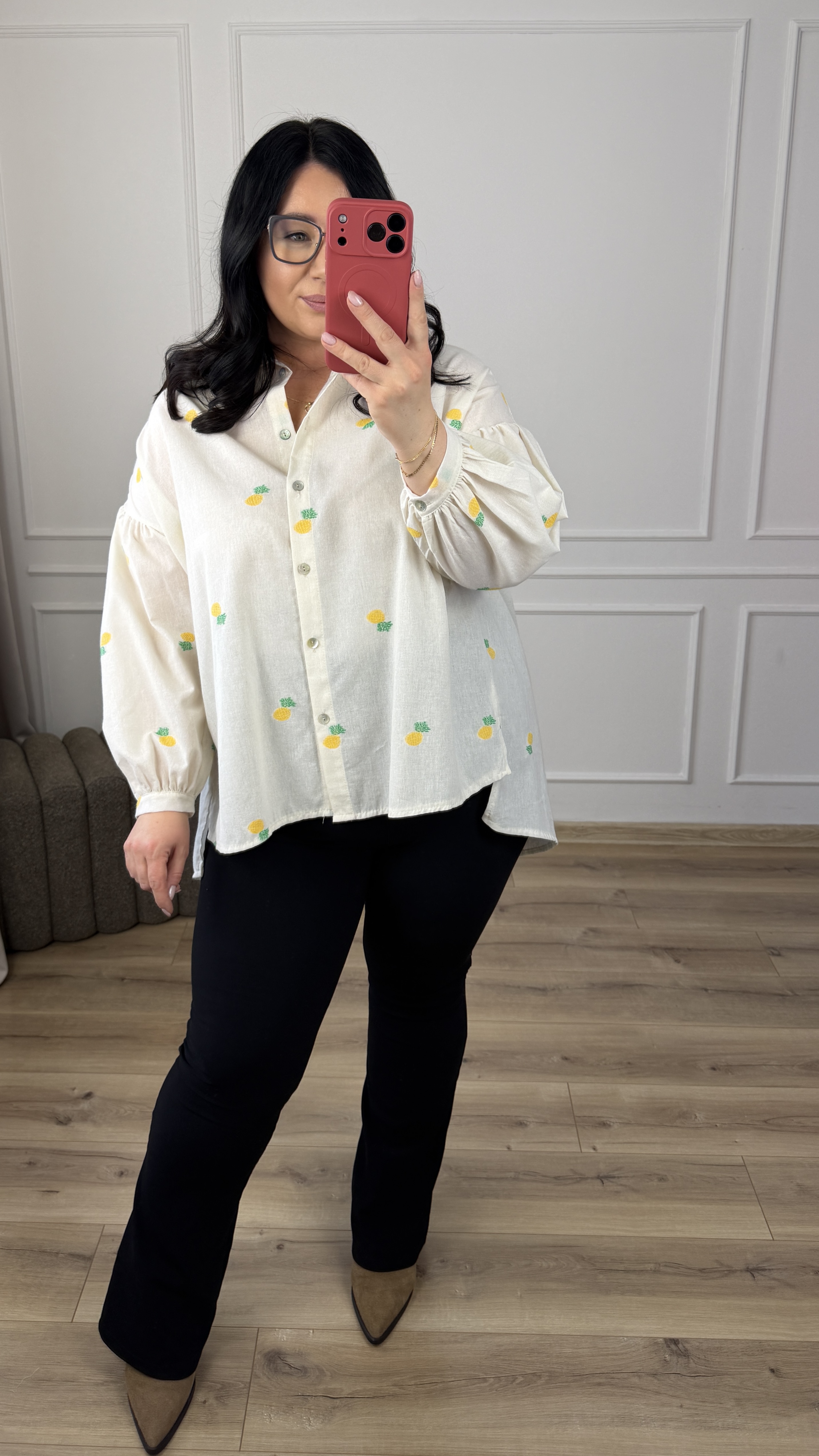 Bawełniana koszula o luźnym kroju z haftowanymi w materiale ananasami. Klasyczny krój z lekko dłuższym tyłem, zapinany na rząd guzików, obniżony, długi rękaw wykończony mankietem. Model dzięki swojej uniwersalności świetnie sprawdzi się na co dzień jak i na większe wyjścia.