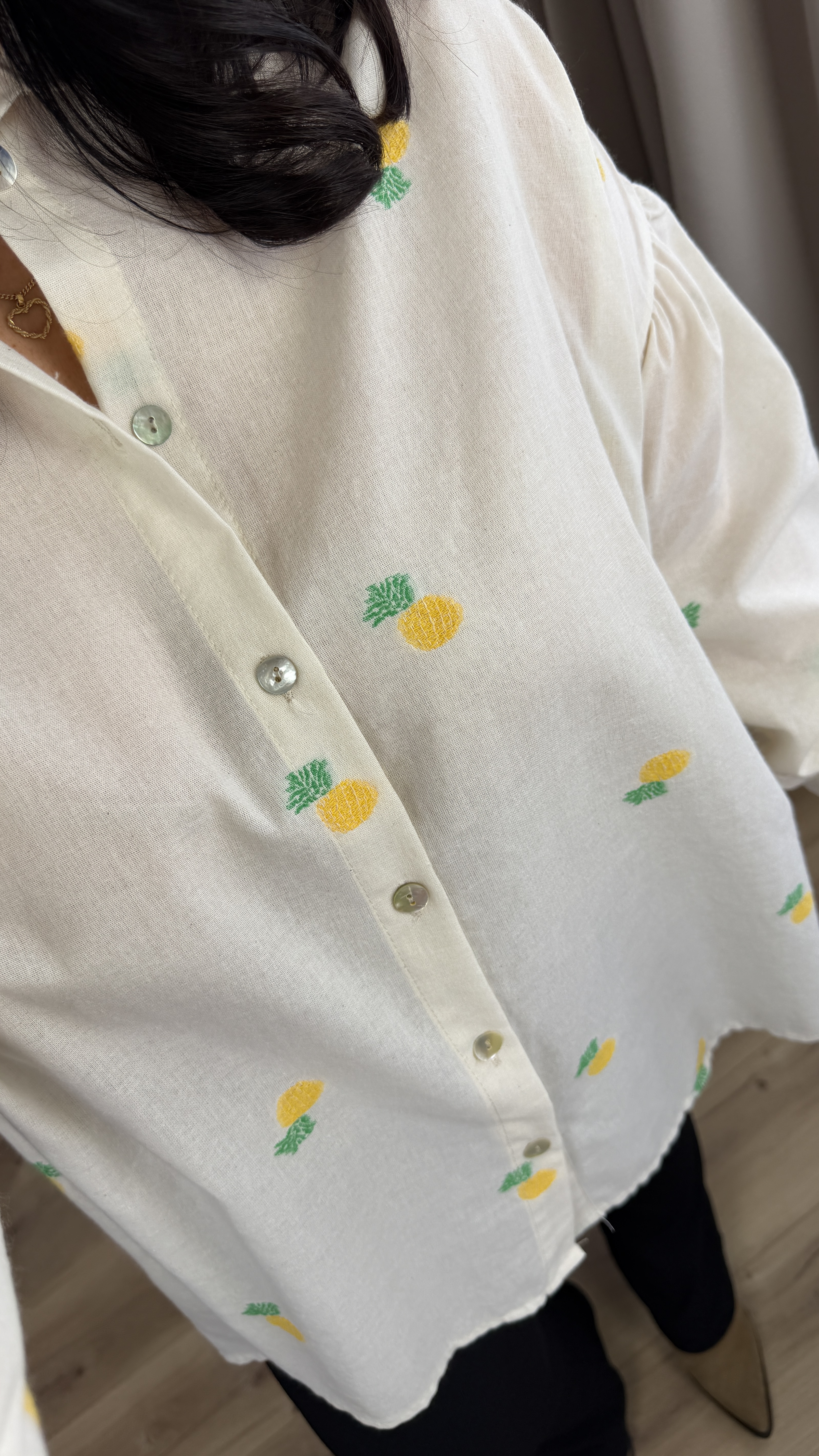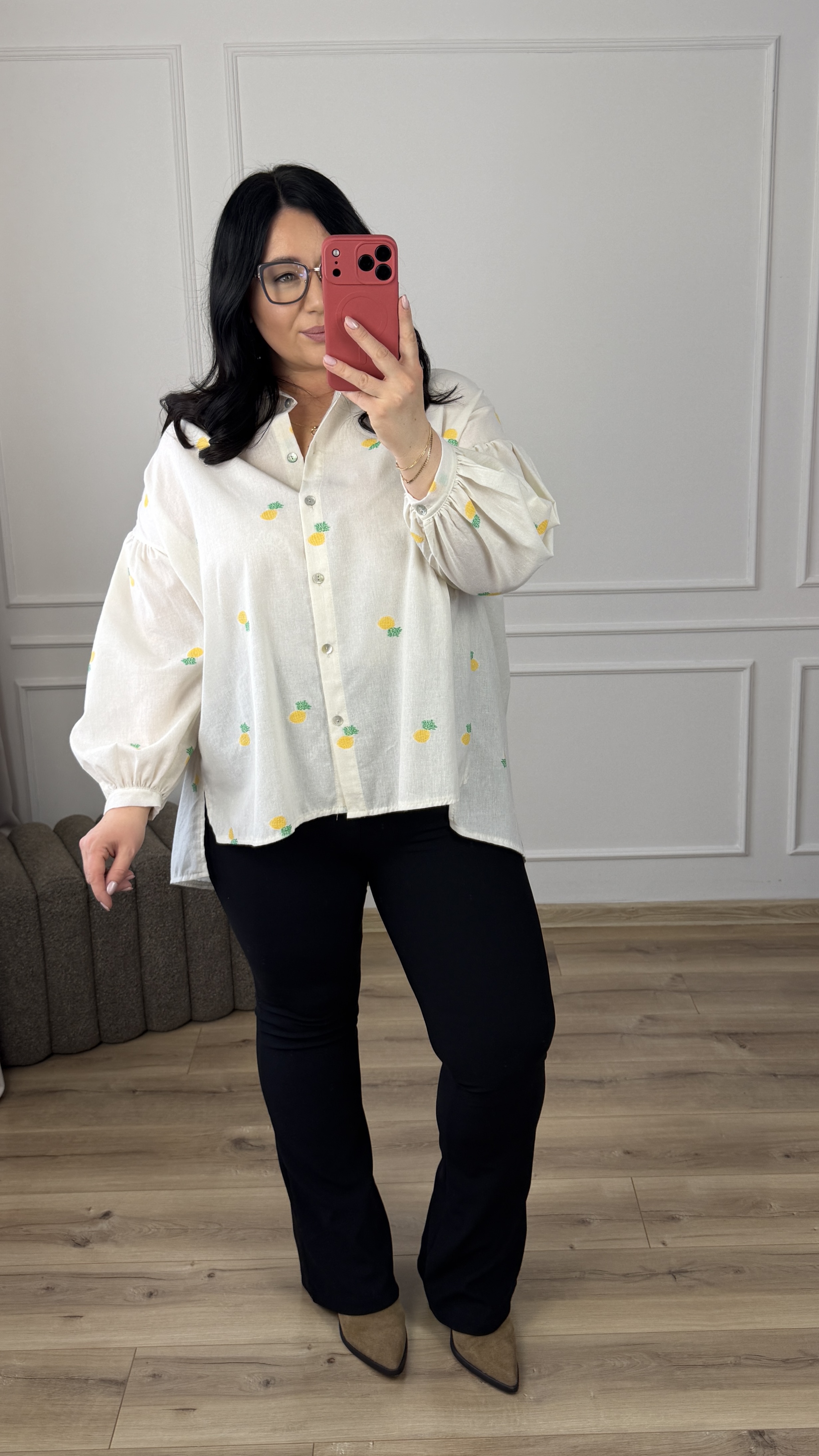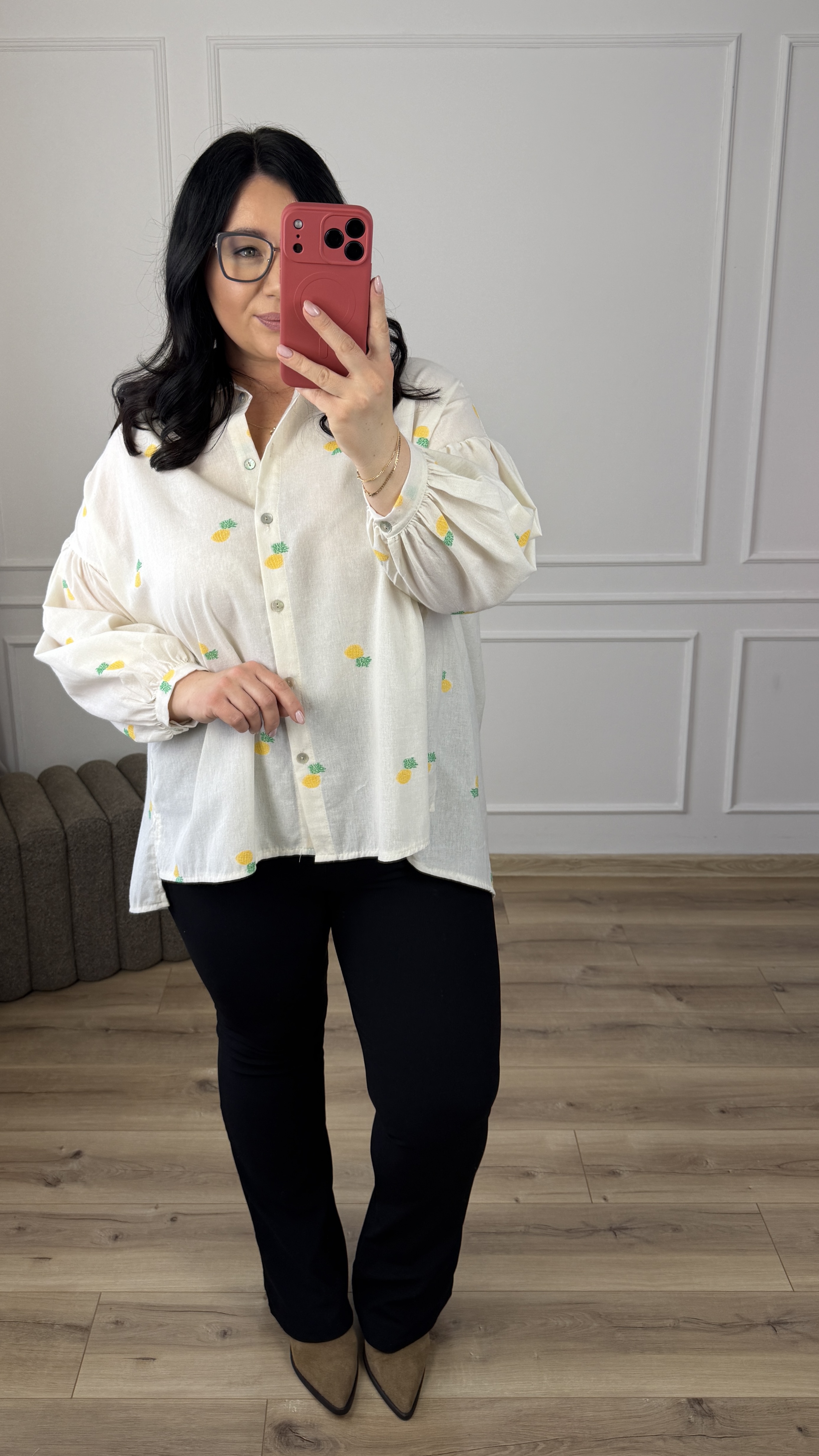 Bawełniana koszula o luźnym kroju z haftowanymi w materiale ananasami. Klasyczny krój z lekko dłuższym tyłem, zapinany na rząd guzików, obniżony, długi rękaw wykończony mankietem. Model dzięki swojej uniwersalności świetnie sprawdzi się na co dzień jak i na większe wyjścia.