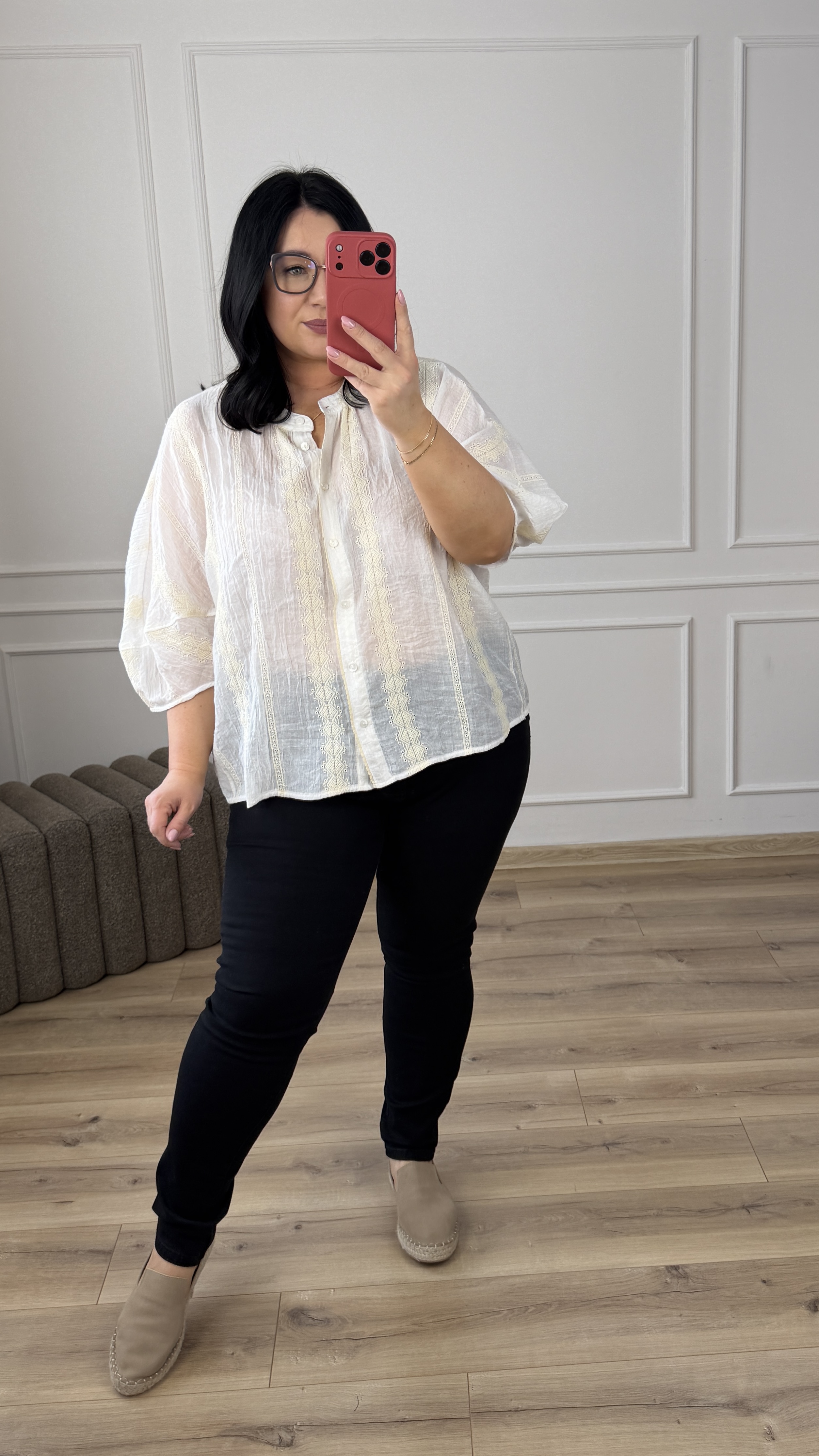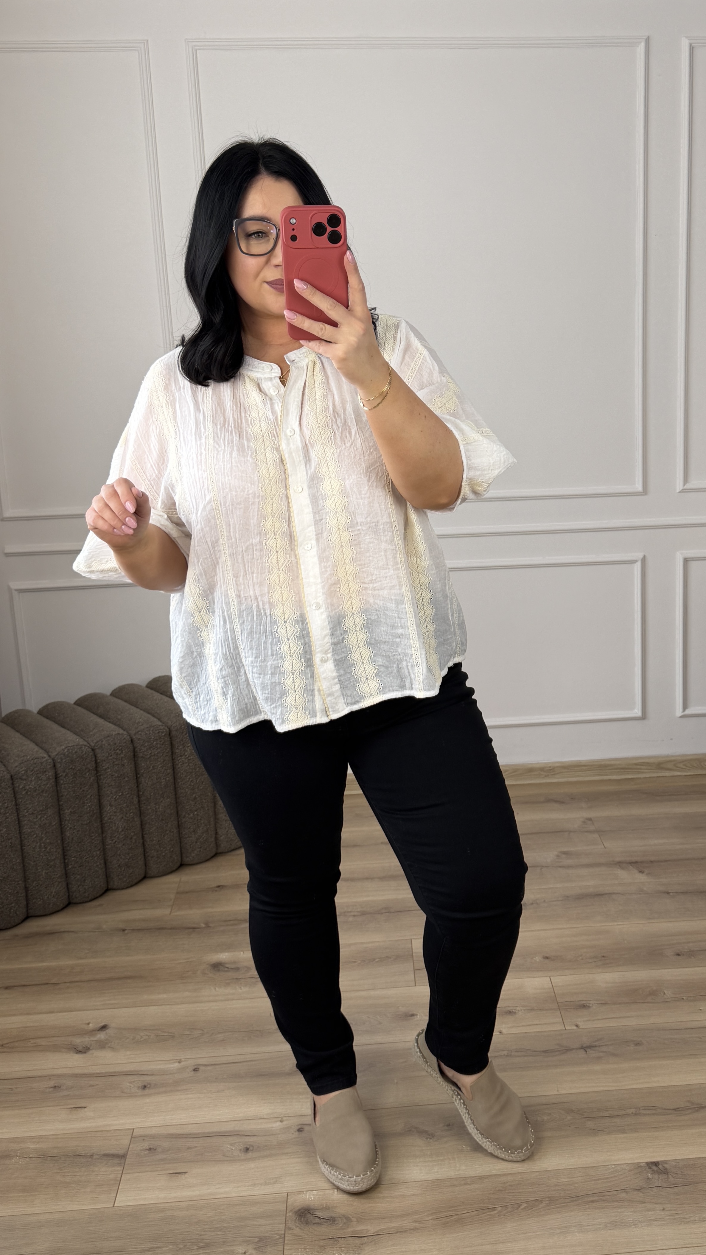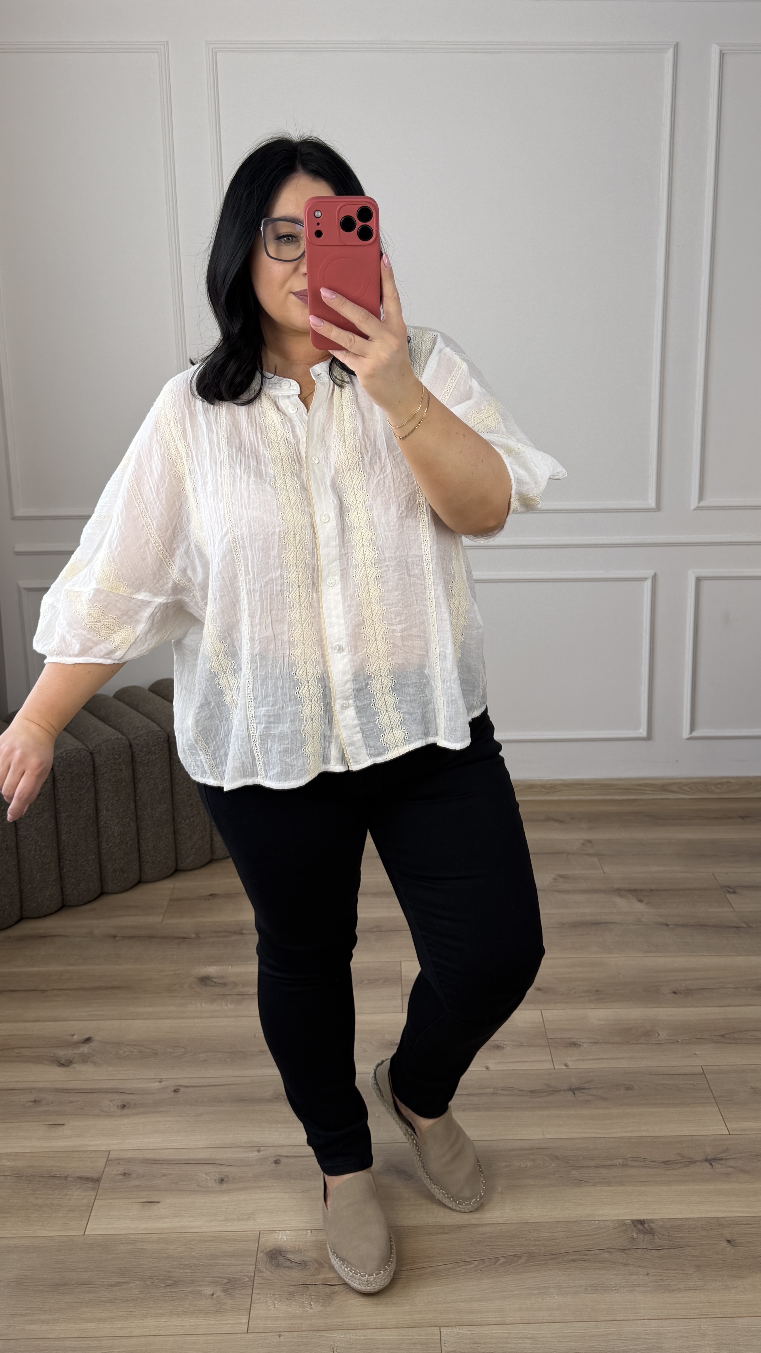 Świetny model koszuli o luźnym, oversizowym kroju który idealnie sprawdzi się na co dzień. Koszula posiada haftowane wzory w odcieniu beżowym, oraz totalnie ekstrawaganckie rękawy które nadają jej nowoczesnej formy. Koszula dzięki swojej uniwersalności świetnie sprawdzi się w połączeniu z legginsami czy jeansami.