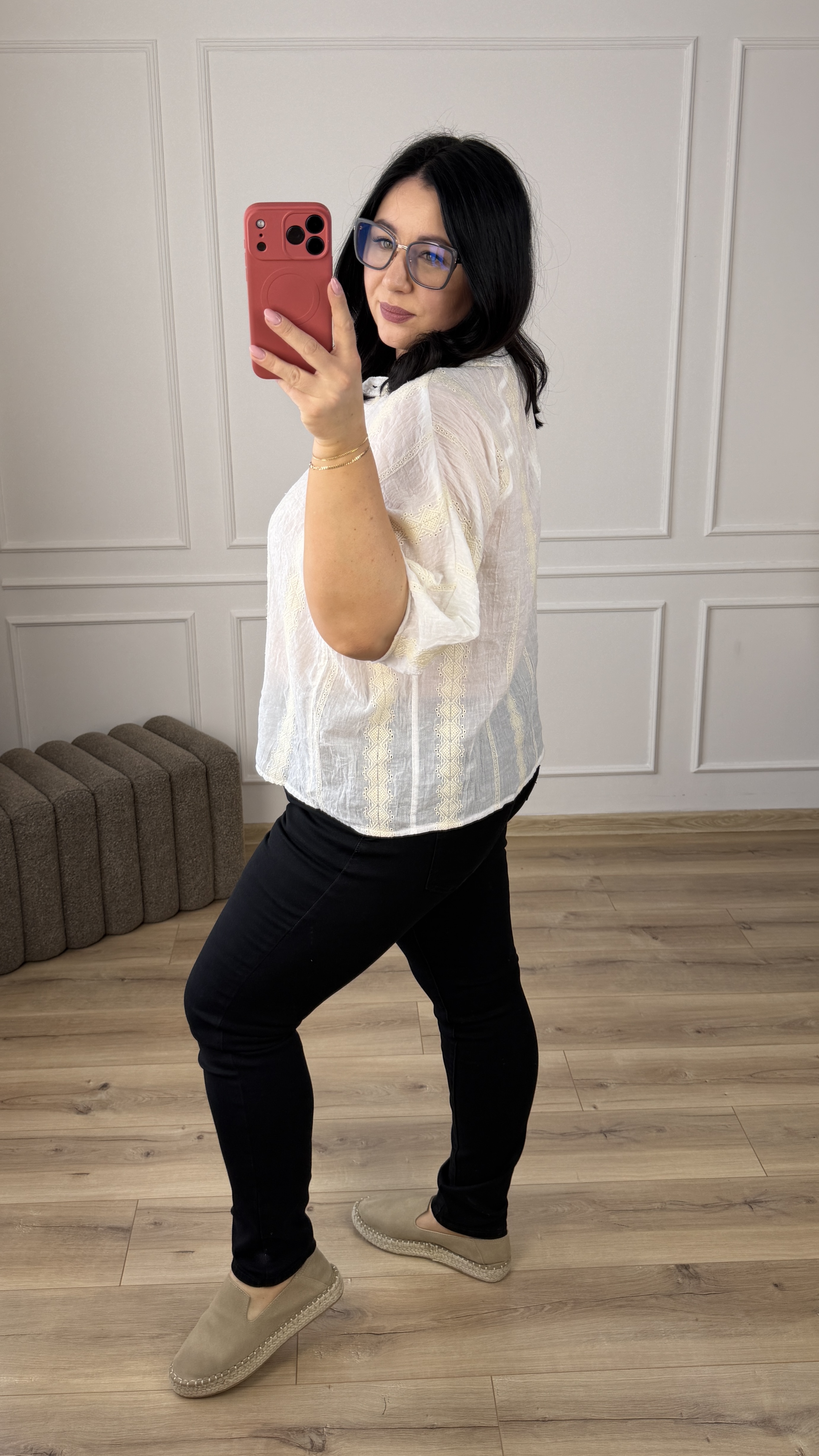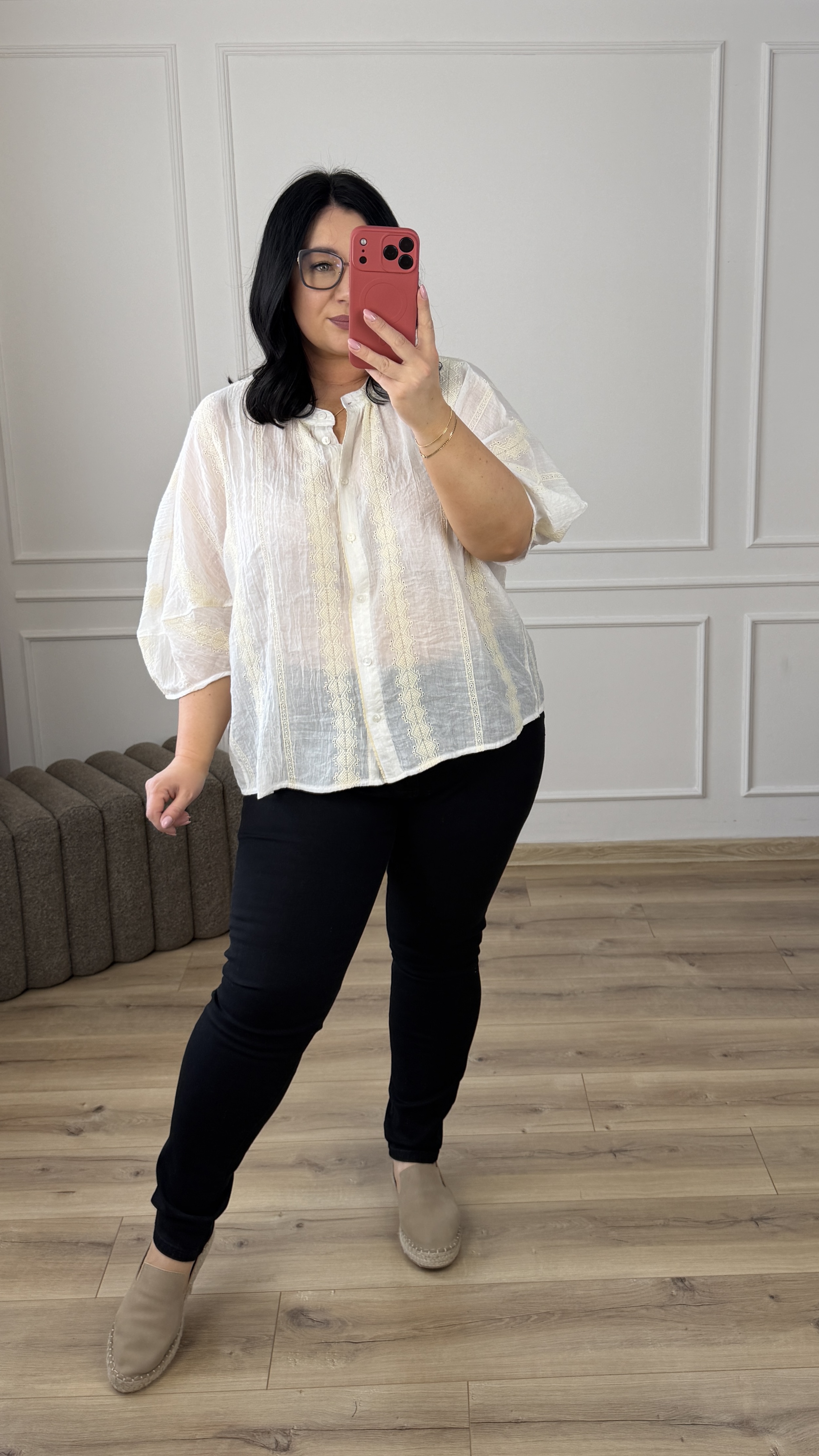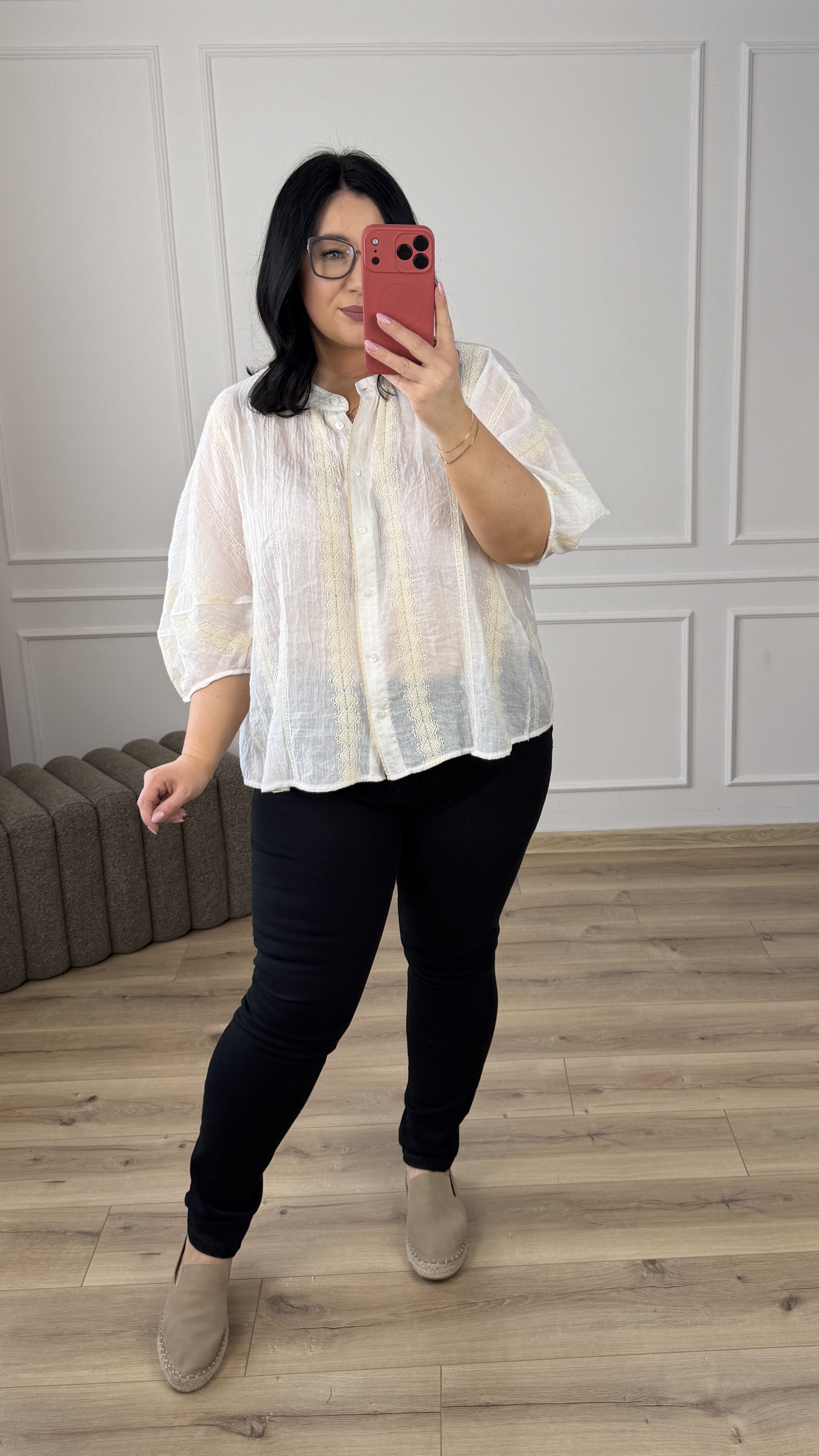 Świetny model koszuli o luźnym, oversizowym kroju który idealnie sprawdzi się na co dzień. Koszula posiada haftowane wzory w odcieniu beżowym, oraz totalnie ekstrawaganckie rękawy które nadają jej nowoczesnej formy. Koszula dzięki swojej uniwersalności świetnie sprawdzi się w połączeniu z legginsami czy jeansami.