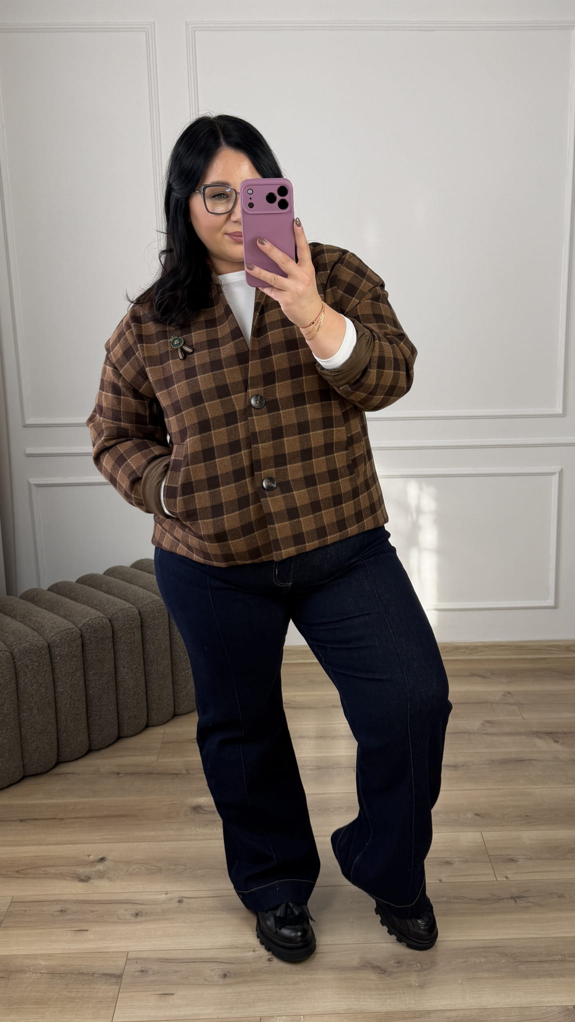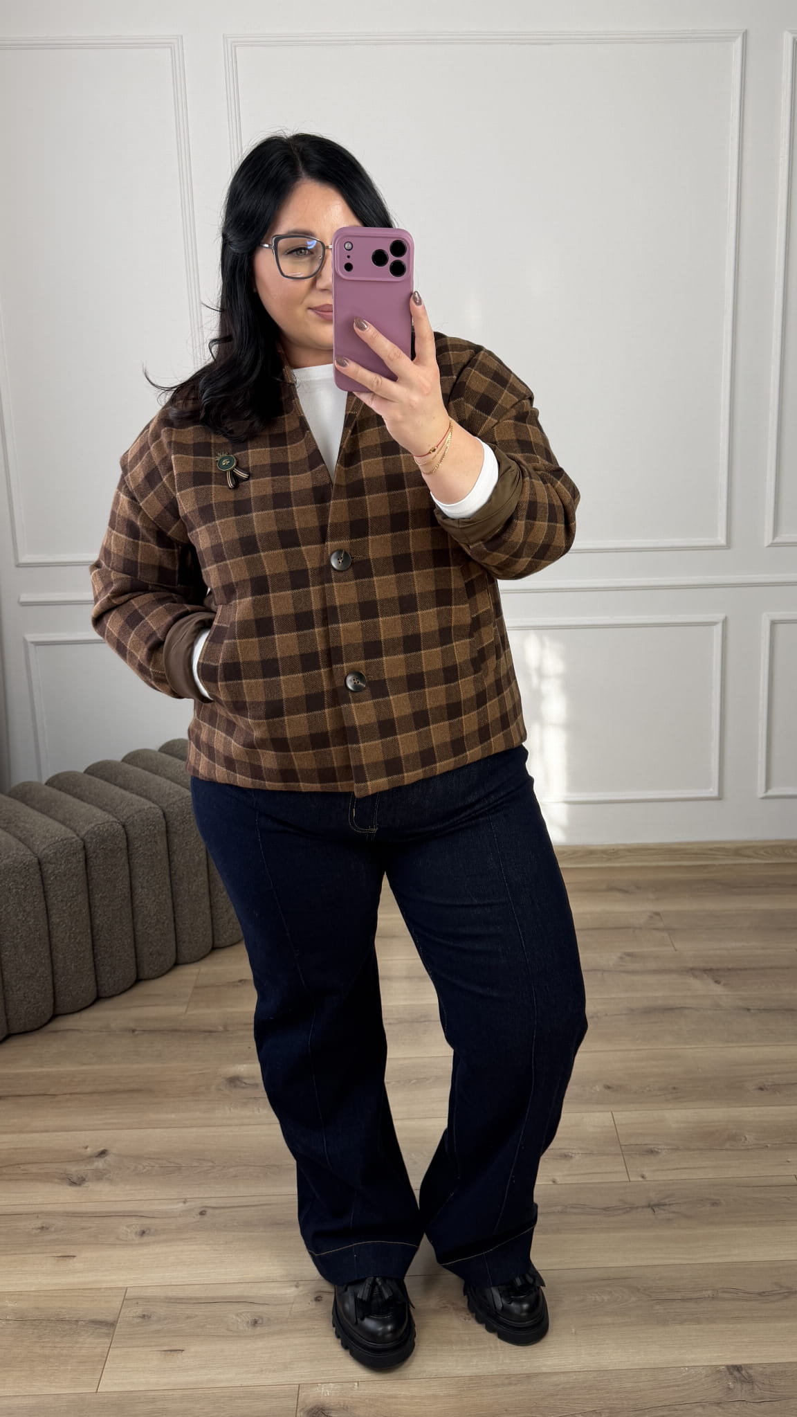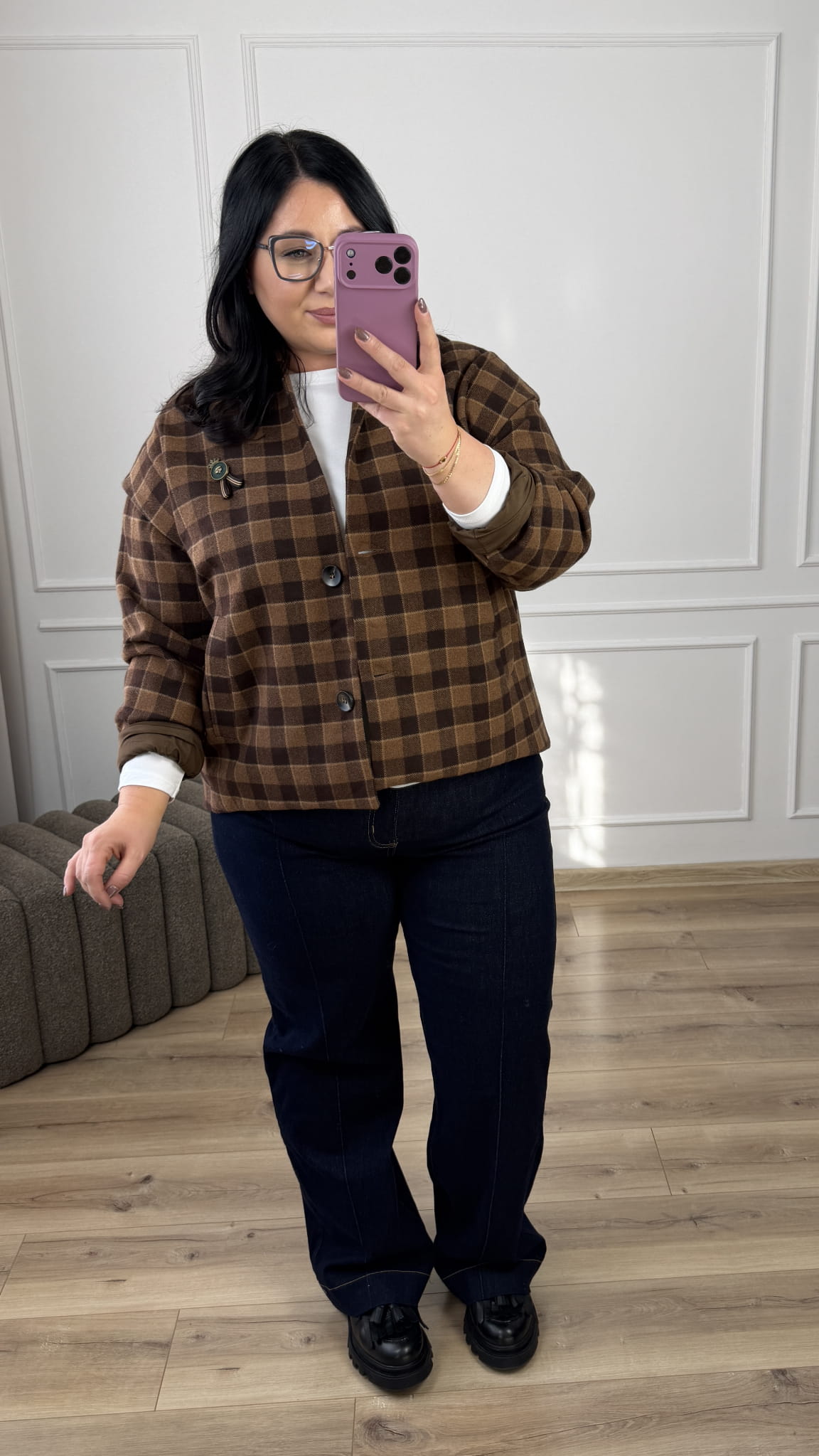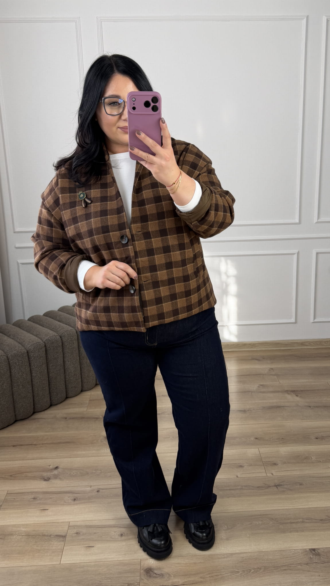 Krótka kurtka przejściowa w kratę. Posiada niezwykle nowoczesny krój z minimalnym kołnierzem. Zapinana na dwa duże guziki. Kurtka posiada podszewkę, oraz efektownie wykończone ramiona. Kurtka posiada kieszenie oraz ozdobną broszkę. Modny krój idealnie sprawdzi się do wiosennych casualowych stylizacji.
