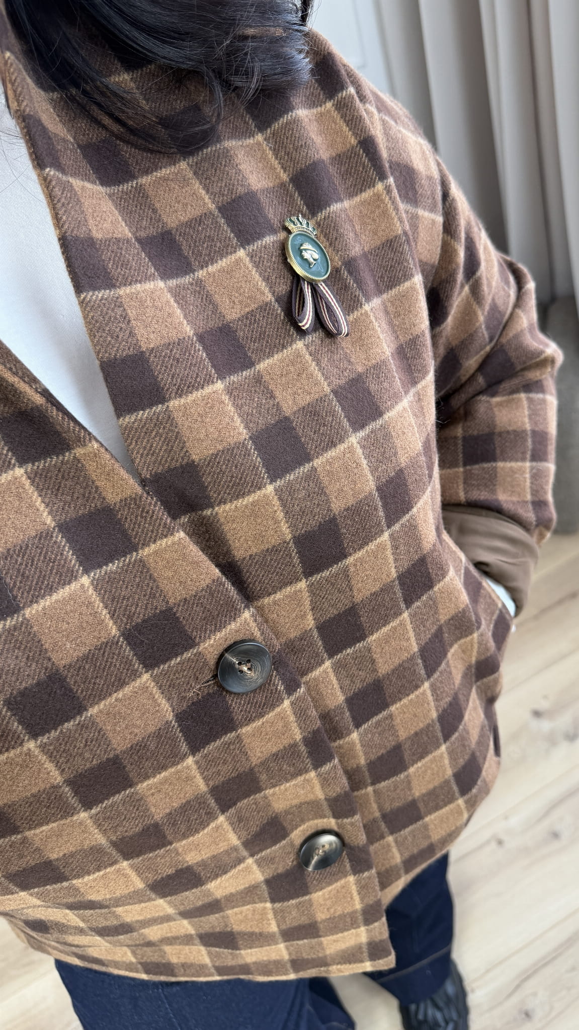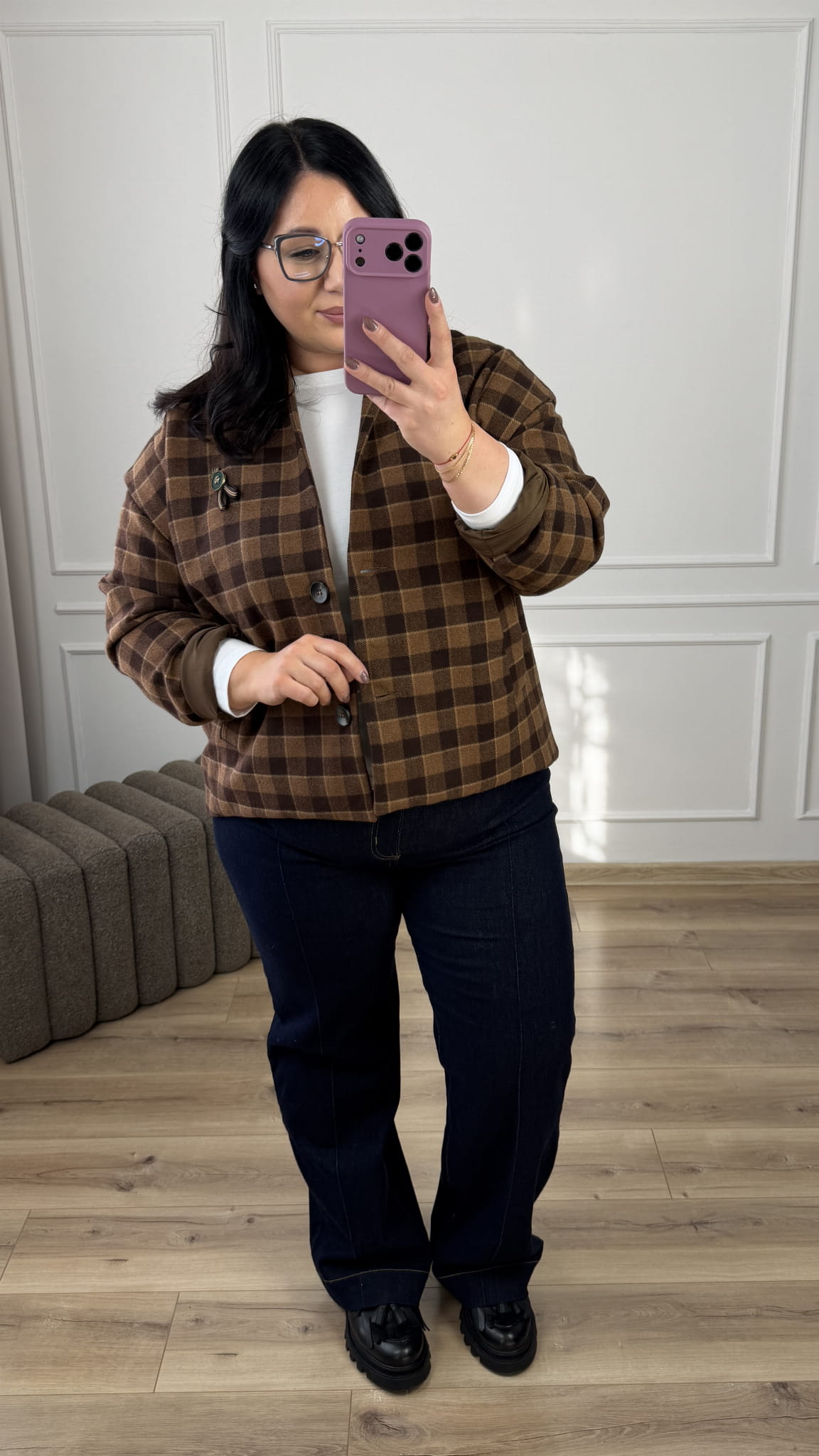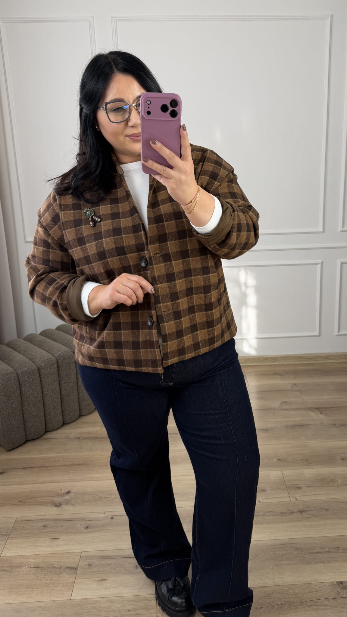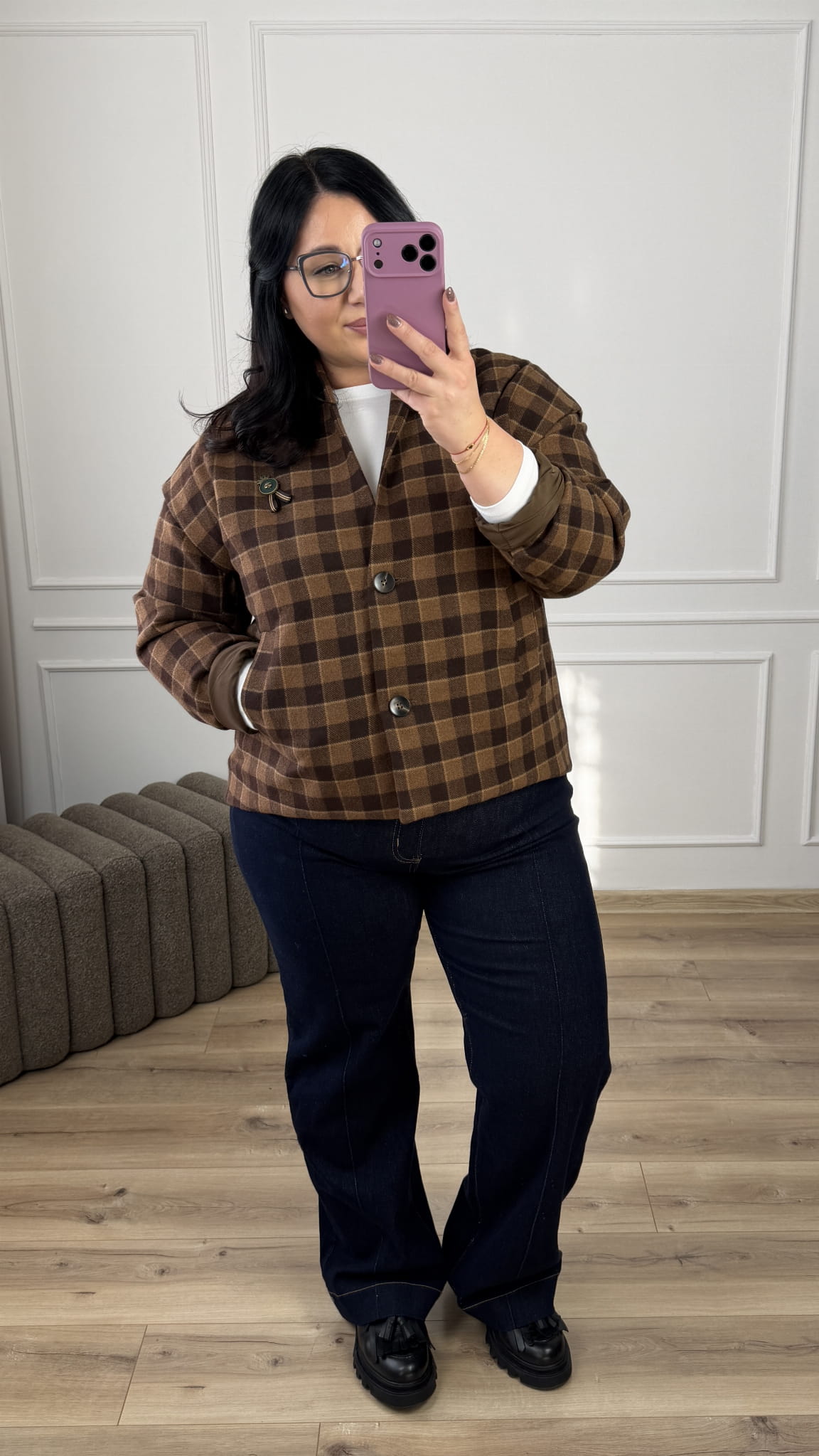 Krótka kurtka przejściowa w kratę. Posiada niezwykle nowoczesny krój z minimalnym kołnierzem. Zapinana na dwa duże guziki. Kurtka posiada podszewkę, oraz efektownie wykończone ramiona. Kurtka posiada kieszenie oraz ozdobną broszkę. Modny krój idealnie sprawdzi się do wiosennych casualowych stylizacji.