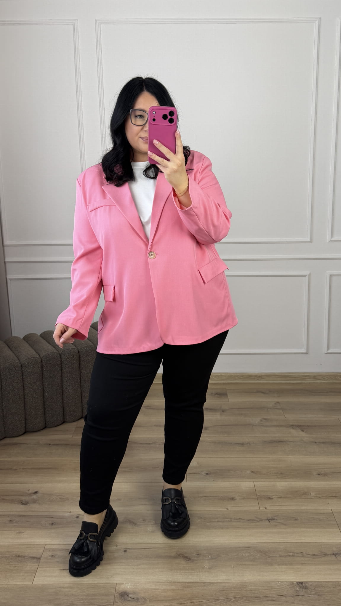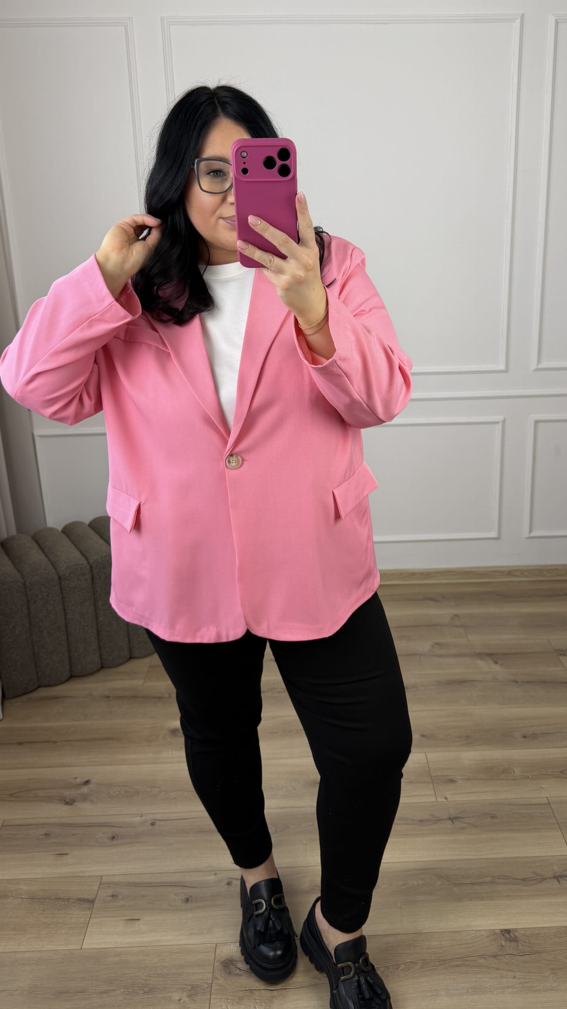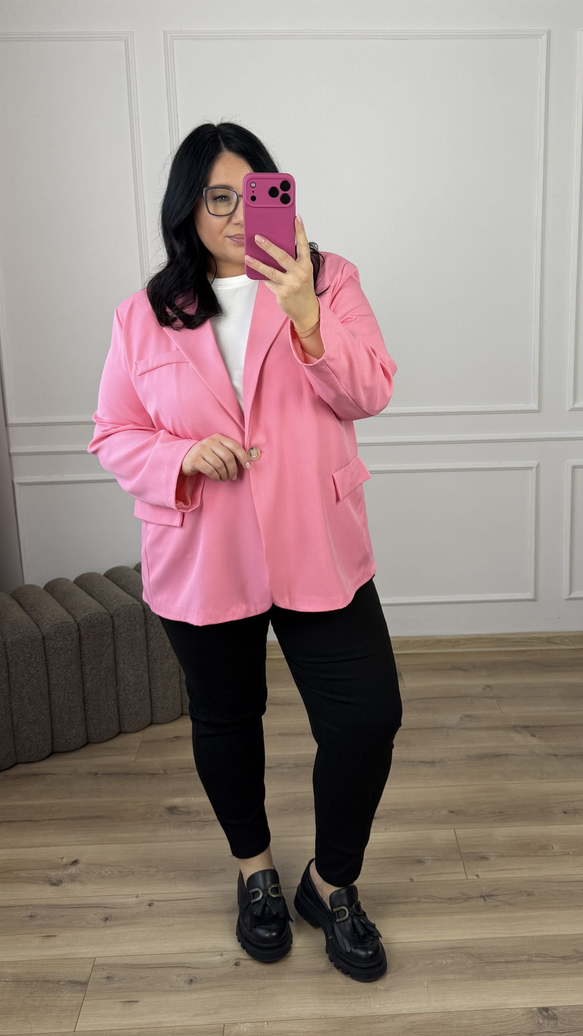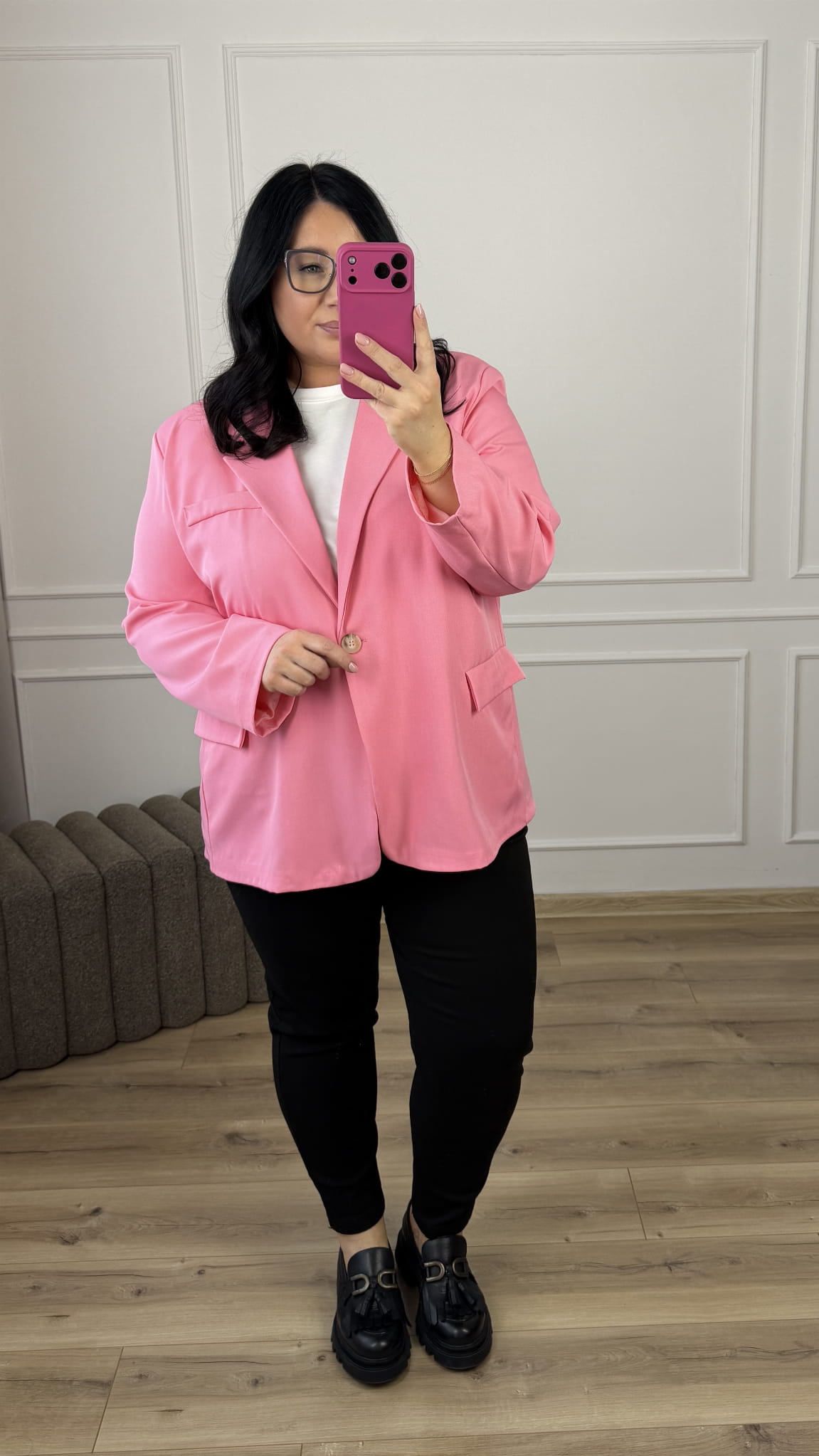 Marynarka o prostym kroju oversize, zapinana na jeden guzik. Marynarka posiada podszewkę oraz kieszenie. Świetny model który idealnie sprawdzi się do wiosennych stylizacji.