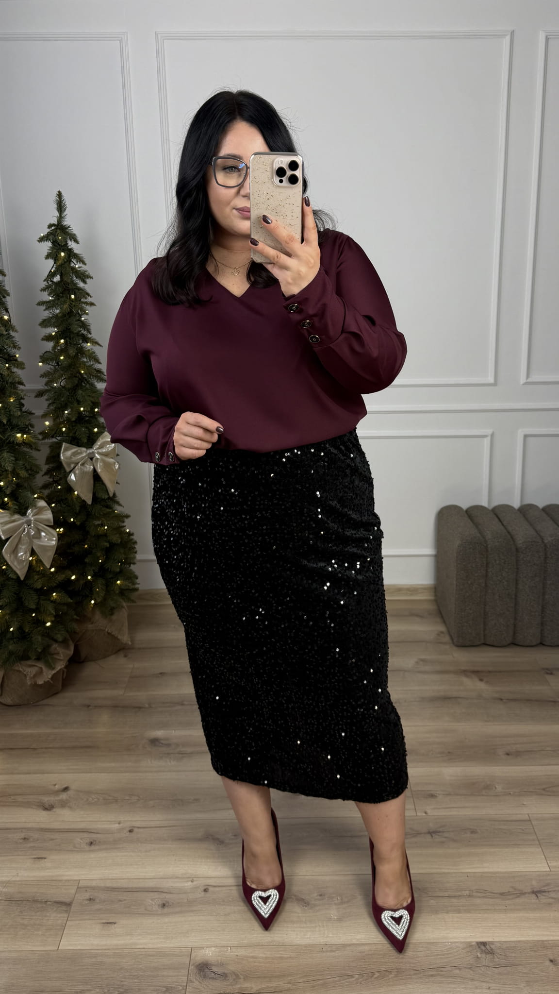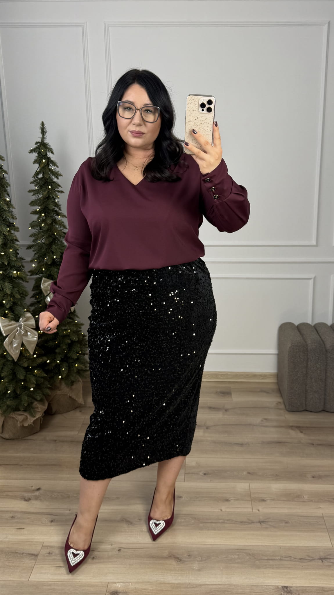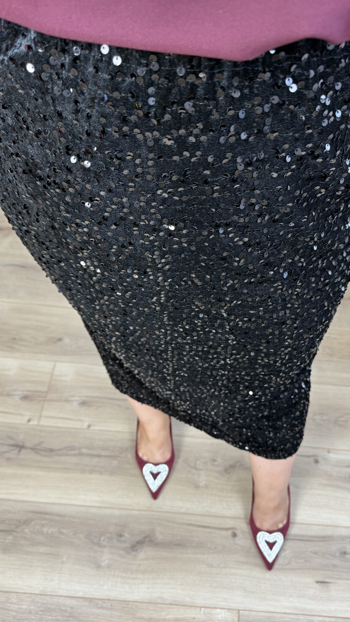 Efektowna prosta spódnica cekinowa o długości midi. Spódnica posiada gumkę w pasie oraz rozcięcie z tyłu. Spódnica dopasowuje się do sylwetki. Efektowne naszyte cekiny na podbiciu welurowym nadają spódnicy świątecznego klimatu. Spódnica idealnie sprawdzi się na kolację wigilijną czy na wieczorne wyjście. Spódnicę cekinową można połączyć z elegancką bluzką, luźniejszym swetrem czy z marynarką.