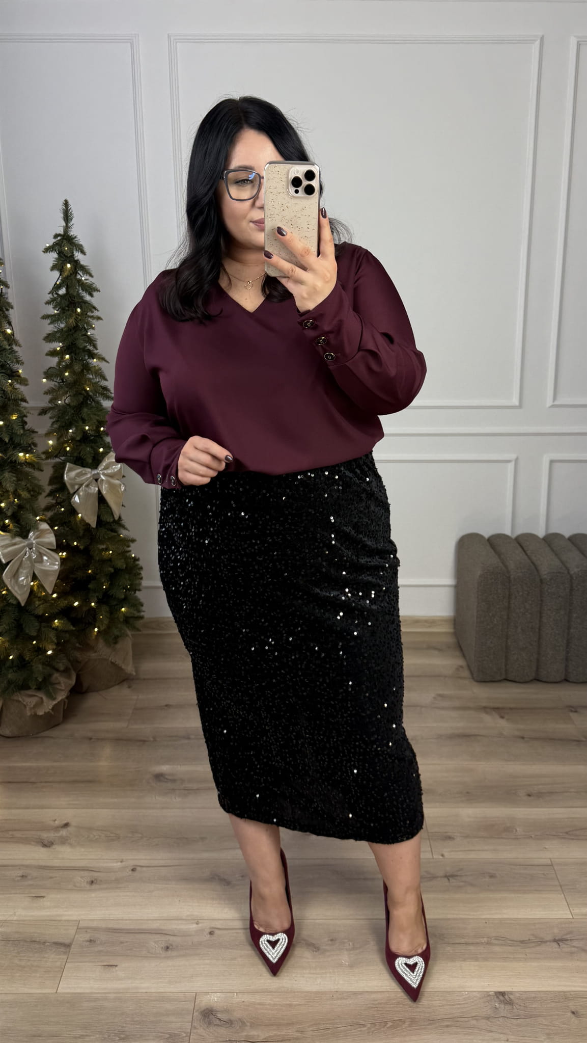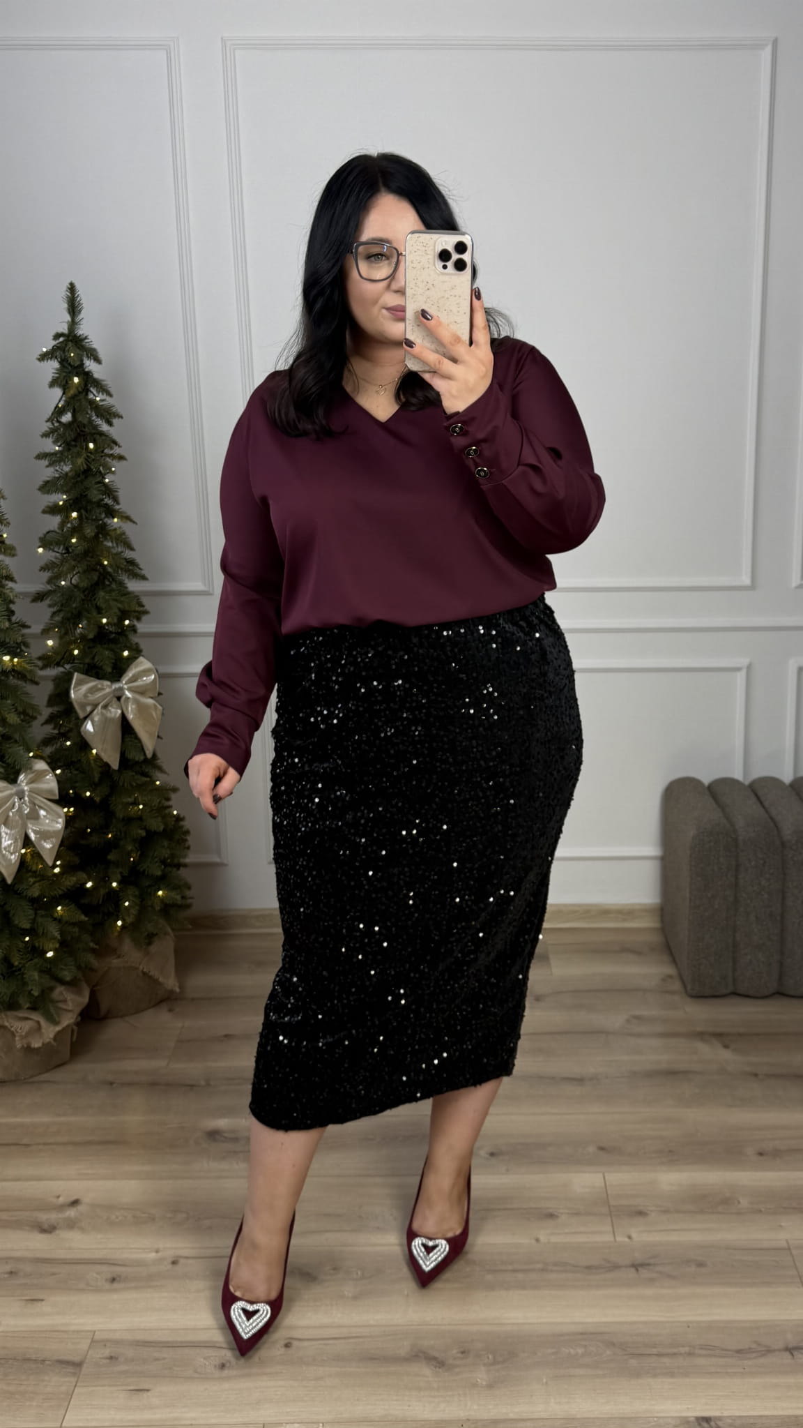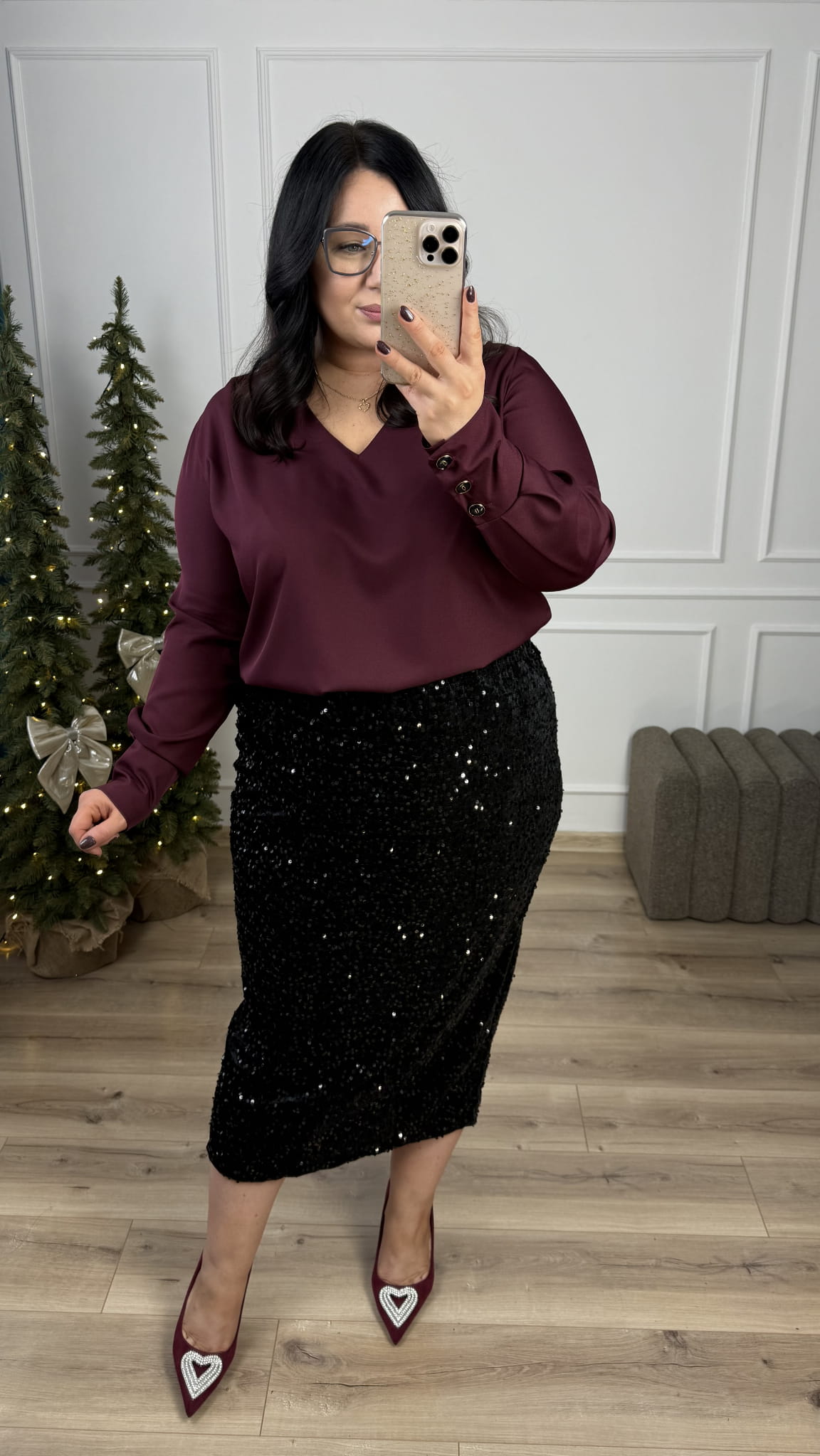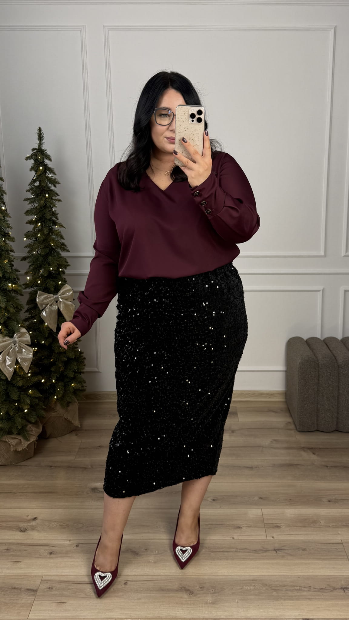 Efektowna prosta spódnica cekinowa o długości midi. Spódnica posiada gumkę w pasie oraz rozcięcie z tyłu. Spódnica dopasowuje się do sylwetki. Efektowne naszyte cekiny na podbiciu welurowym nadają spódnicy świątecznego klimatu. Spódnica idealnie sprawdzi się na kolację wigilijną czy na wieczorne wyjście. Spódnicę cekinową można połączyć z elegancką bluzką, luźniejszym swetrem czy z marynarką.
