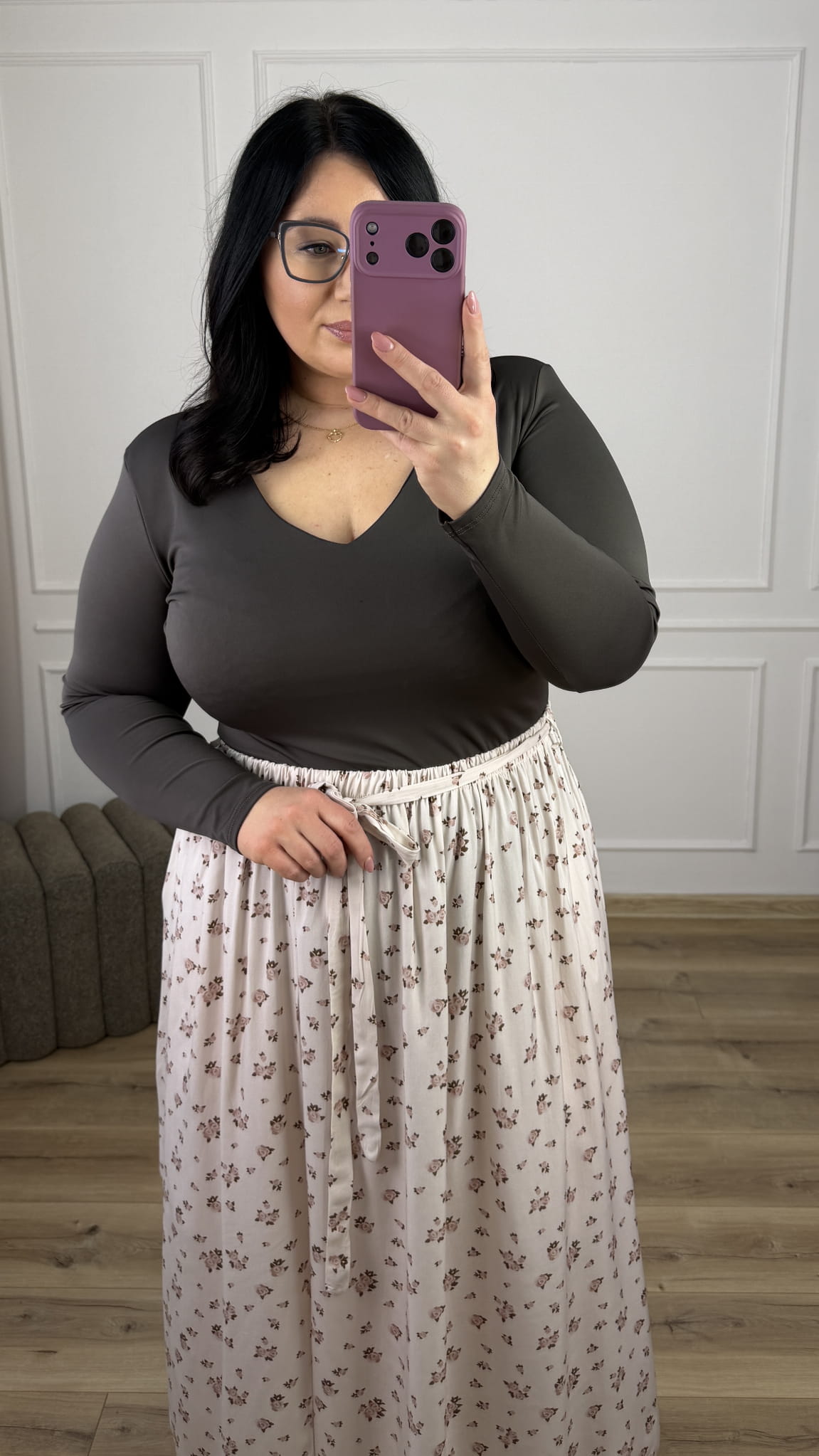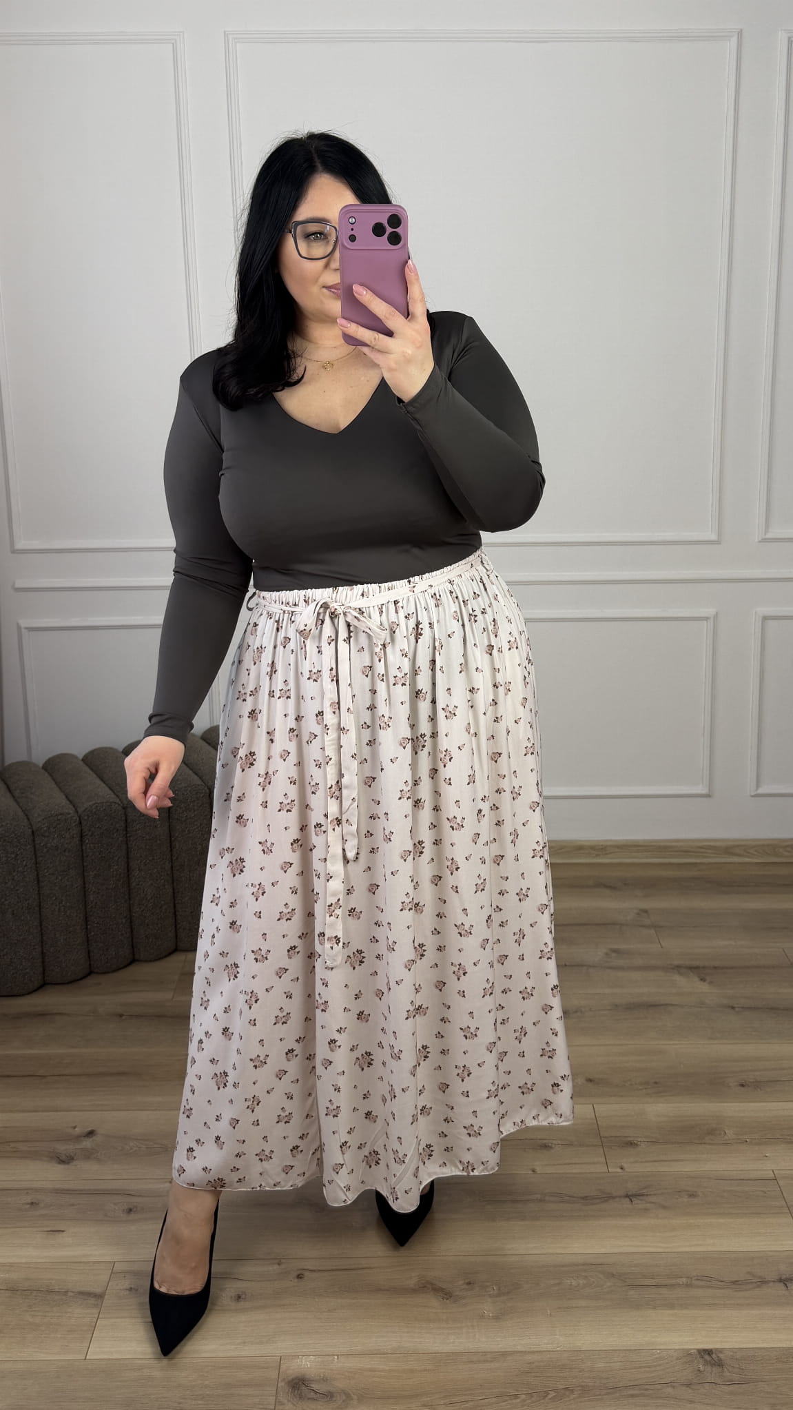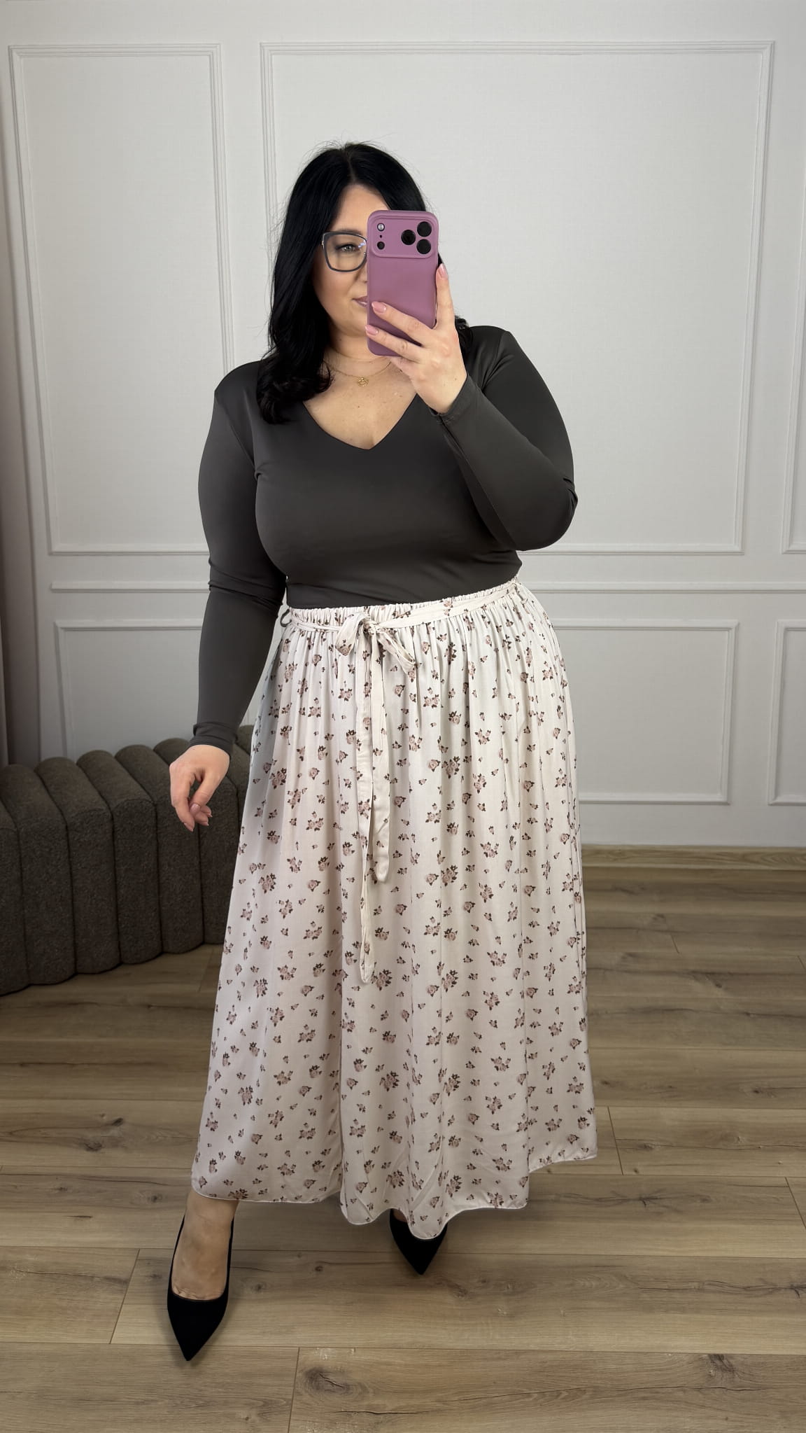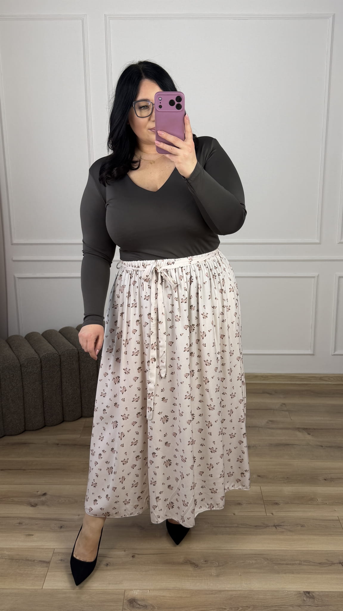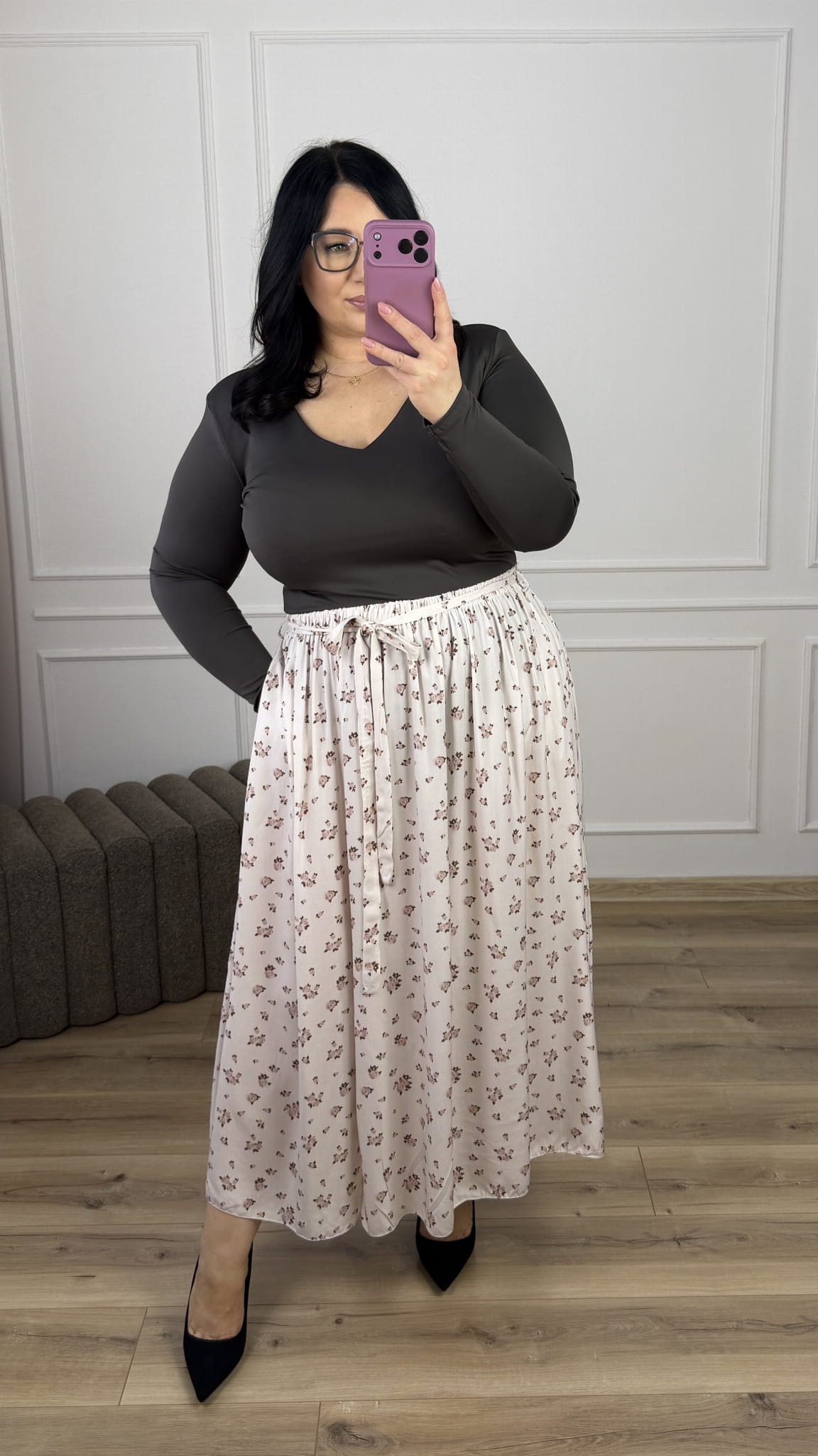 Wiskozowa spódnica długości 7/8, rozkloszowana ku dołowi. Spódnica posiada gumkę w pasie, rozcięcie po boku oraz wiązany pasek w pasie. Idealna do wielu stylizacji.