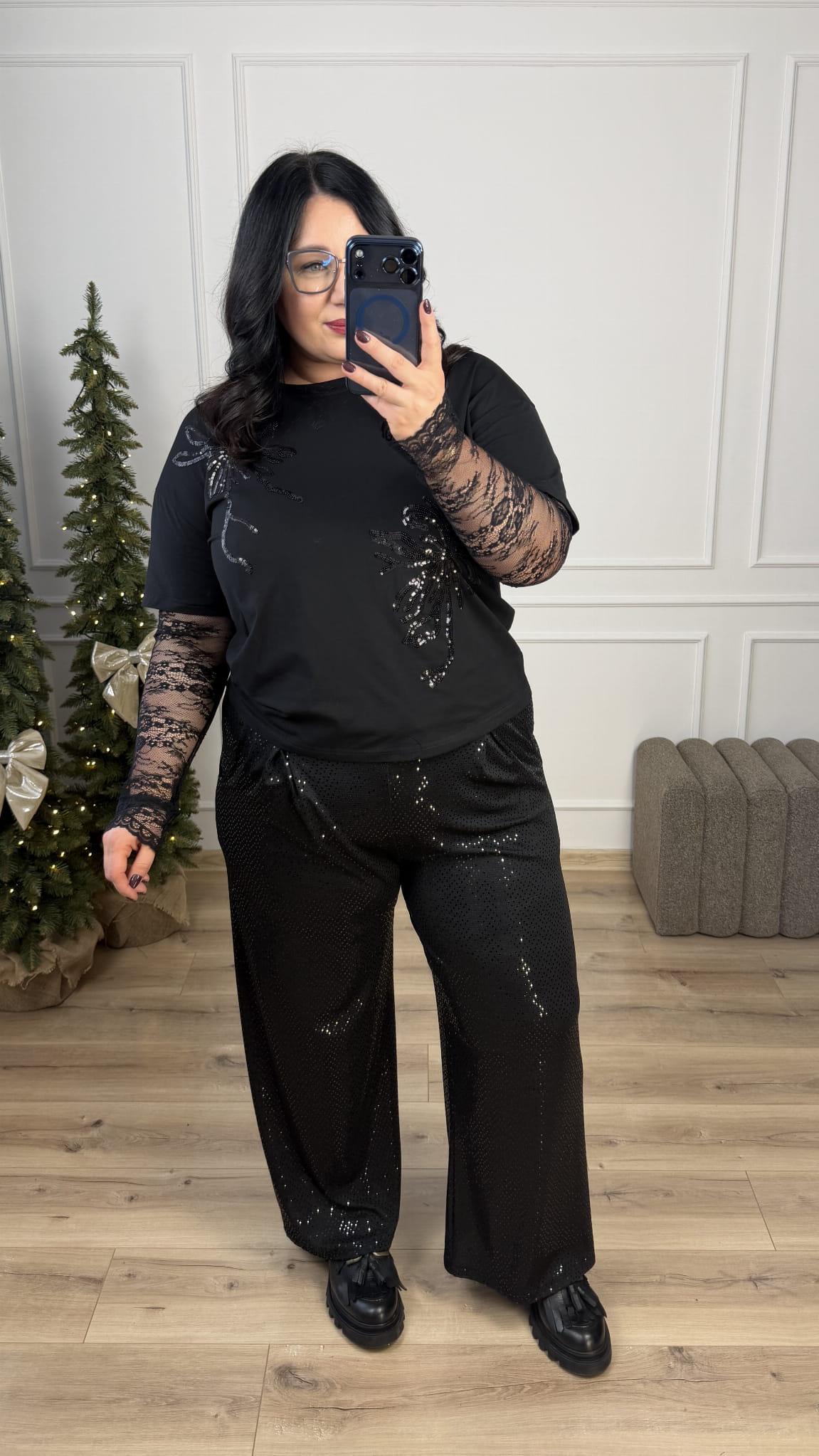 Spodnie lejącego materiału z błyszczącą fakturą oraz szeroką nogawką. Spodnie posiadają delikatne zaszewki w pasie. Spodnie posiadają wysoki stan przez co idealnie dopasowują się do sylwetki. Spodnie idealnie sprawdzą się do świątecznych stylizacji.