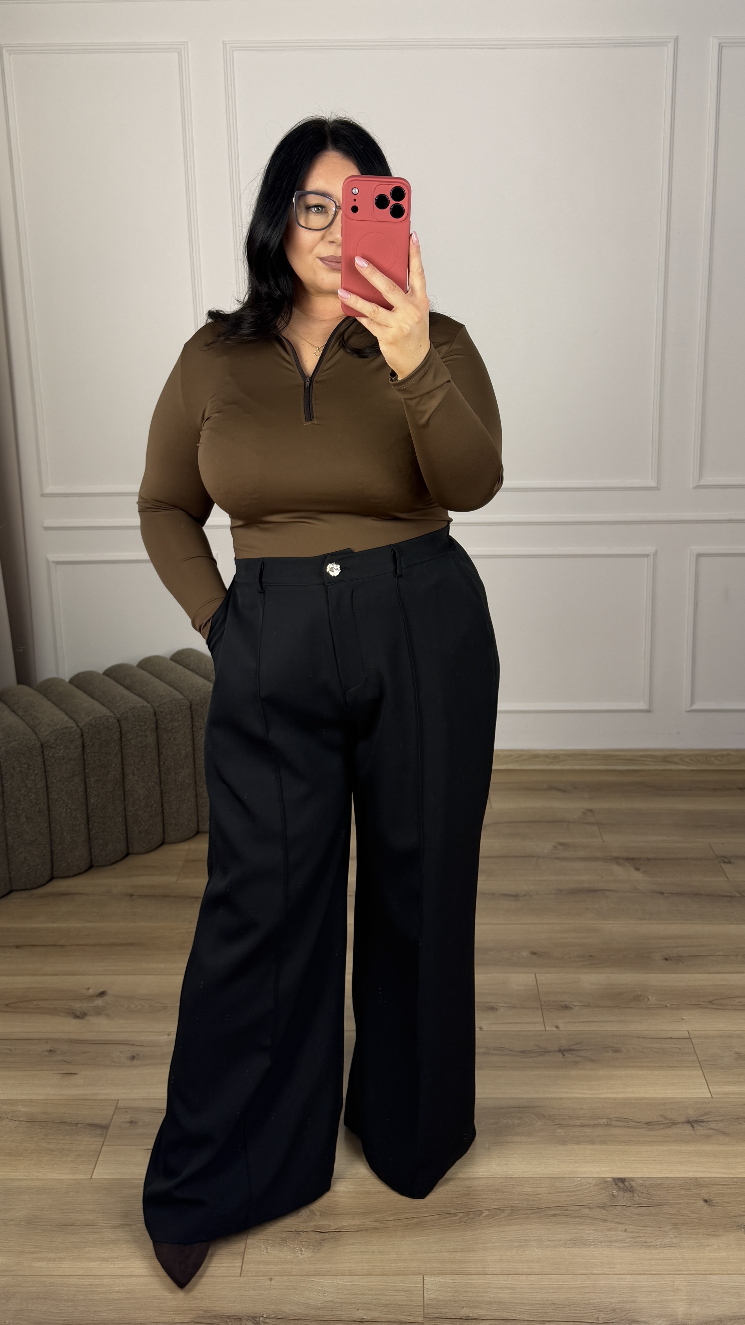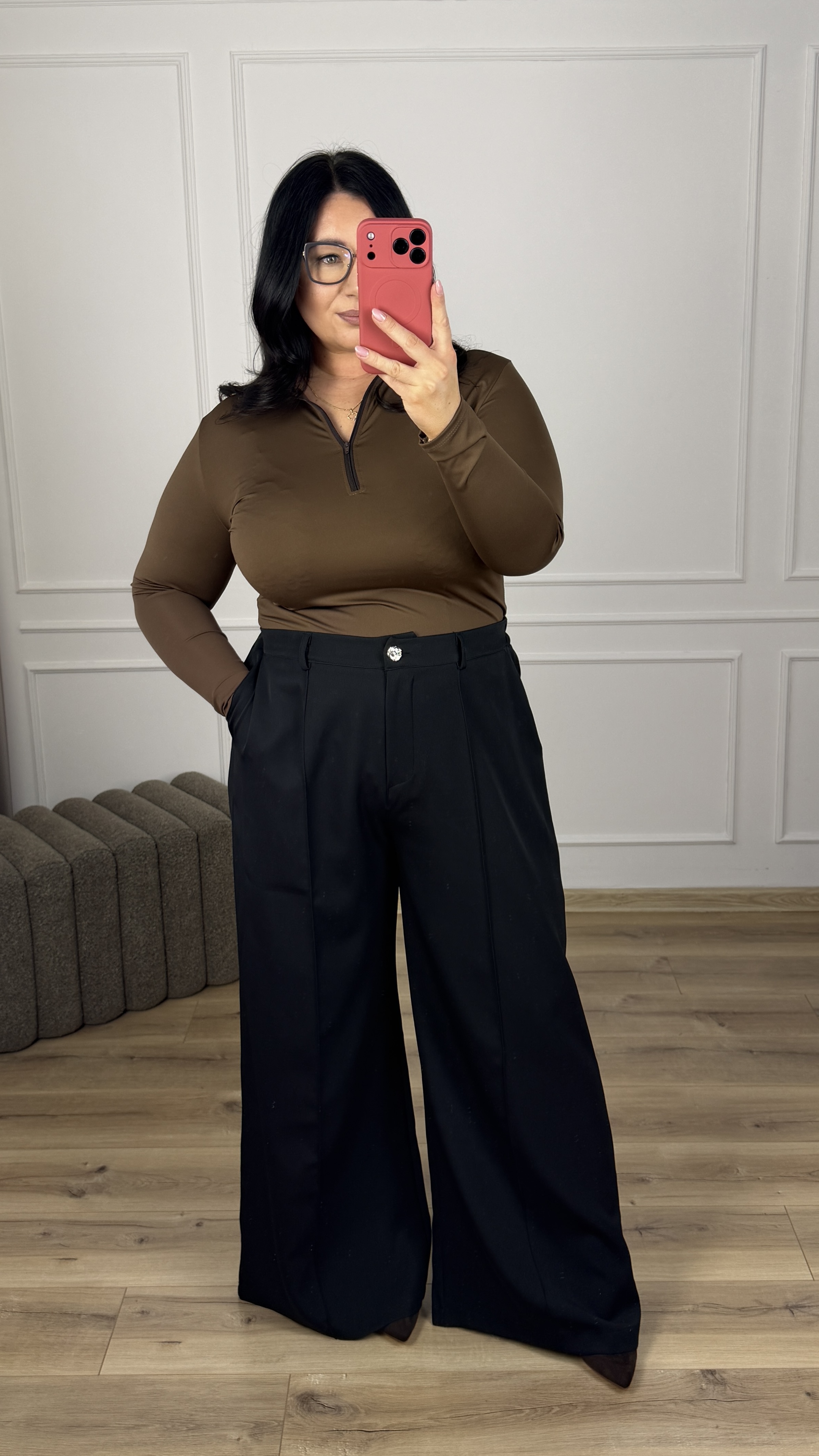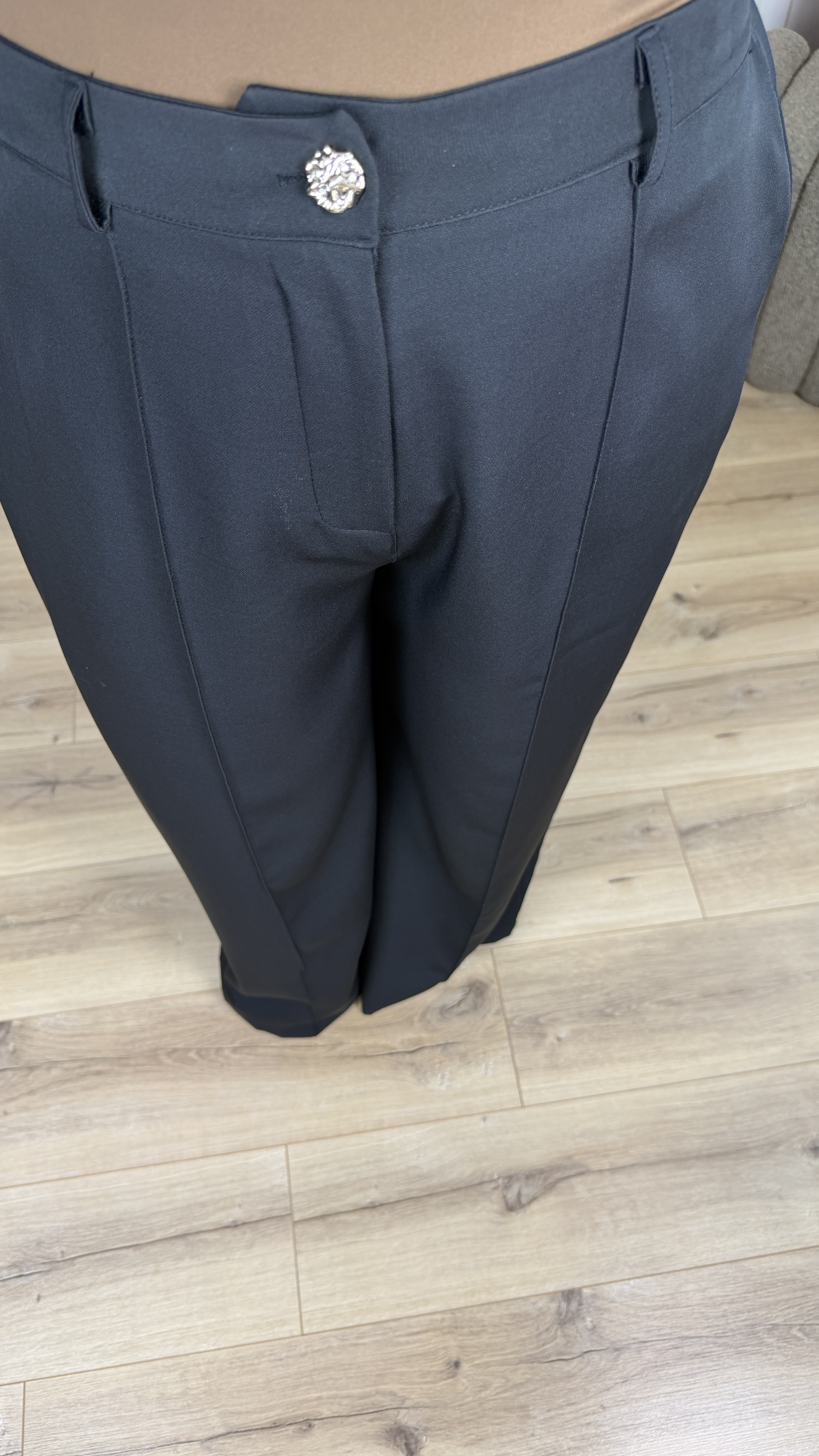 Eleganckie spodnie z szeroką nogawką z przeszyciem materiału z przodu. Model posiada zapinanie na zamek oraz guzik dodatkowo posiada gumkę z tyłu, dzięki czemu ładnie dopasowuje się do talii. Spodnie posiadają kieszenie. Model dzięki swojej uniwersalności świetnie sprawdzi się w casualowym wydaniu jak i bardziej eleganckim.