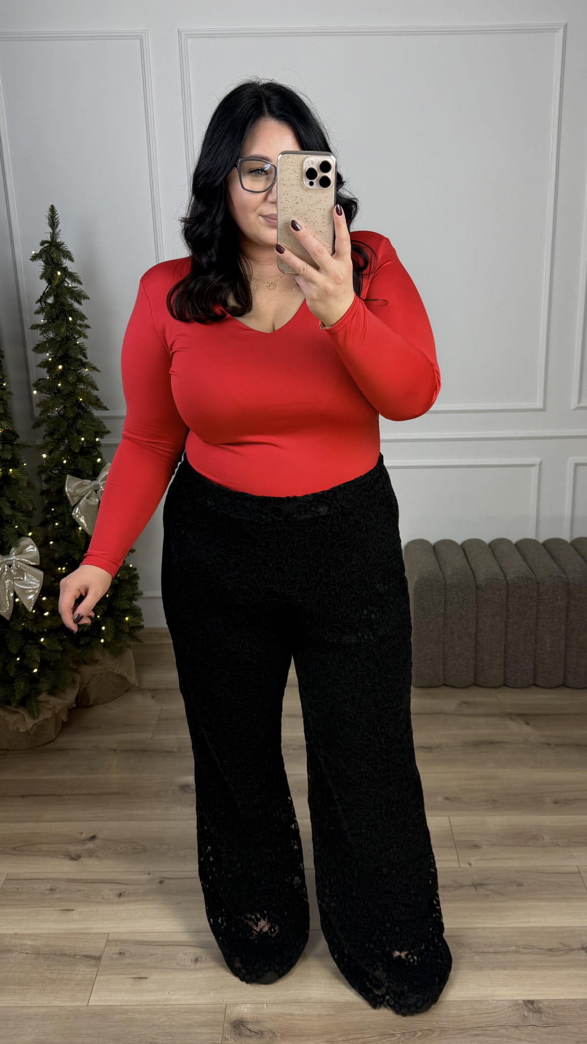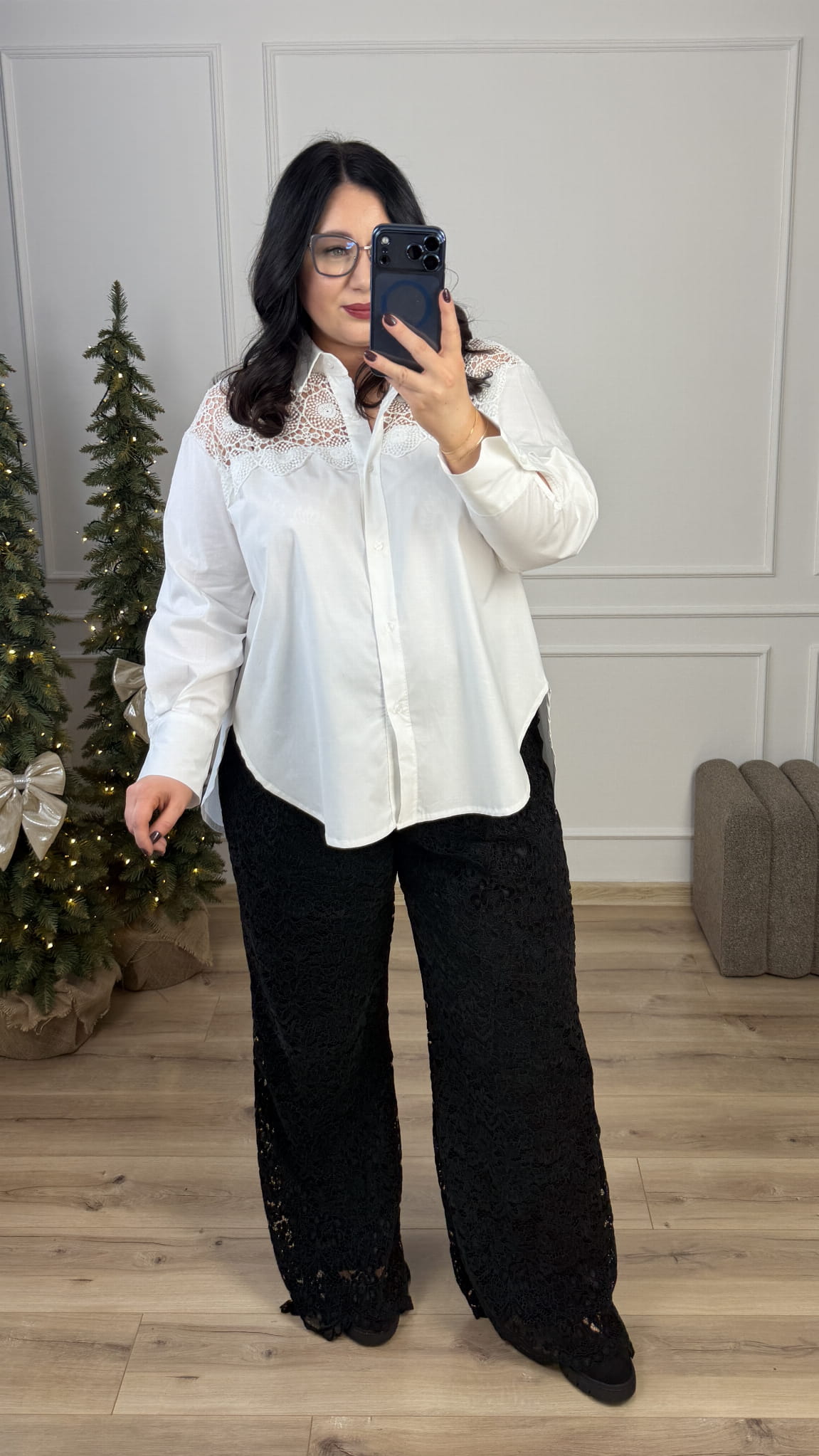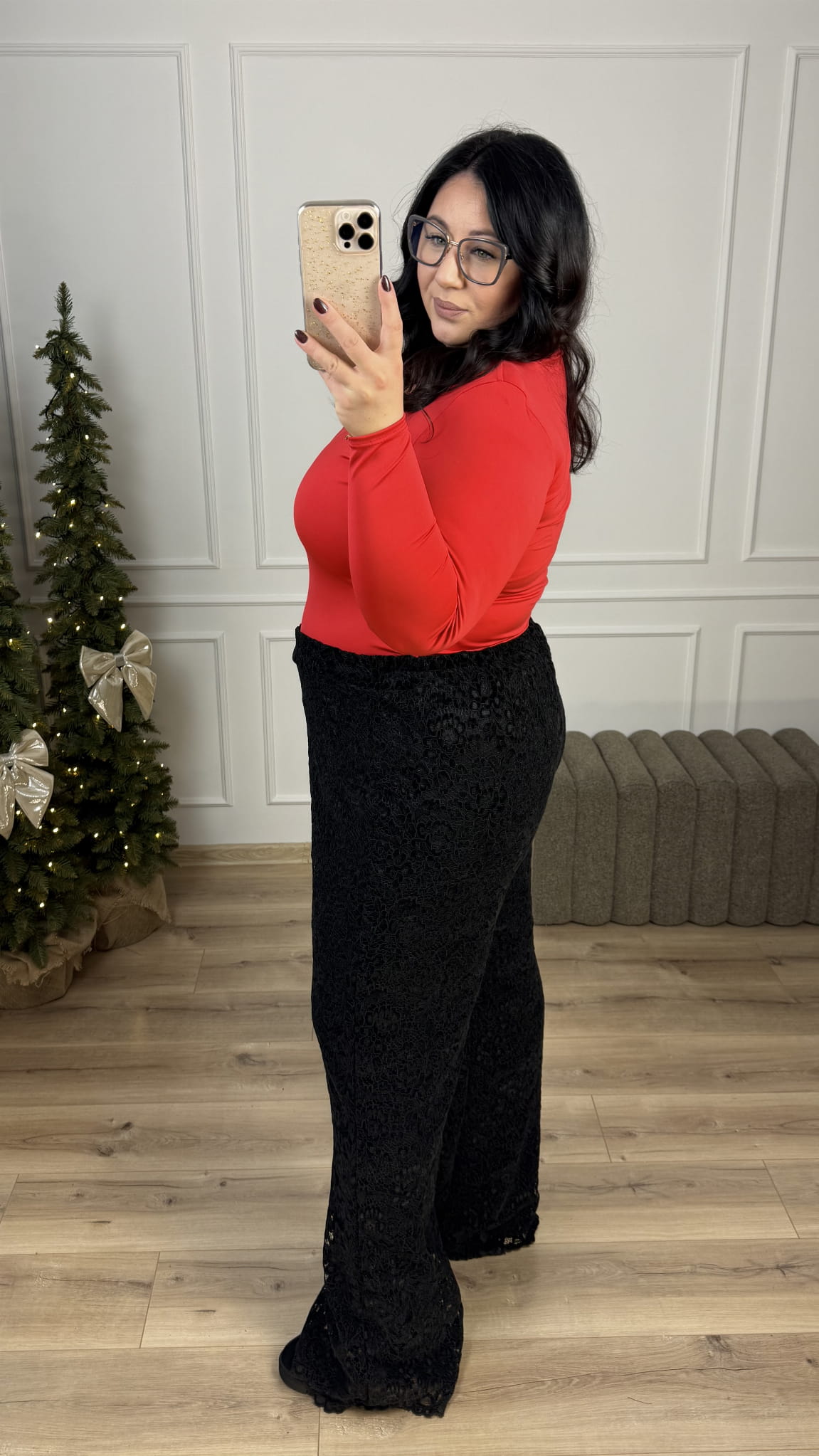 Spodnie koronkowe z wysokim stanem. Spodnie koronkowe o kroju typu flare z wysokim stanem. Spodnie posiadają prosty pas z przodu oraz gumkę z tyłu przez co dopasowują się do sylwetki. Spodnie posiadają podszewkę. Spodnie zdecydowanie dla wysokich dziewczyn ponieważ posiadają długie nogawki. Koronkowe spodnie świetnie nadadzą się do stylizacji andrzejkowych, świątecznych czy sylwestrowych.