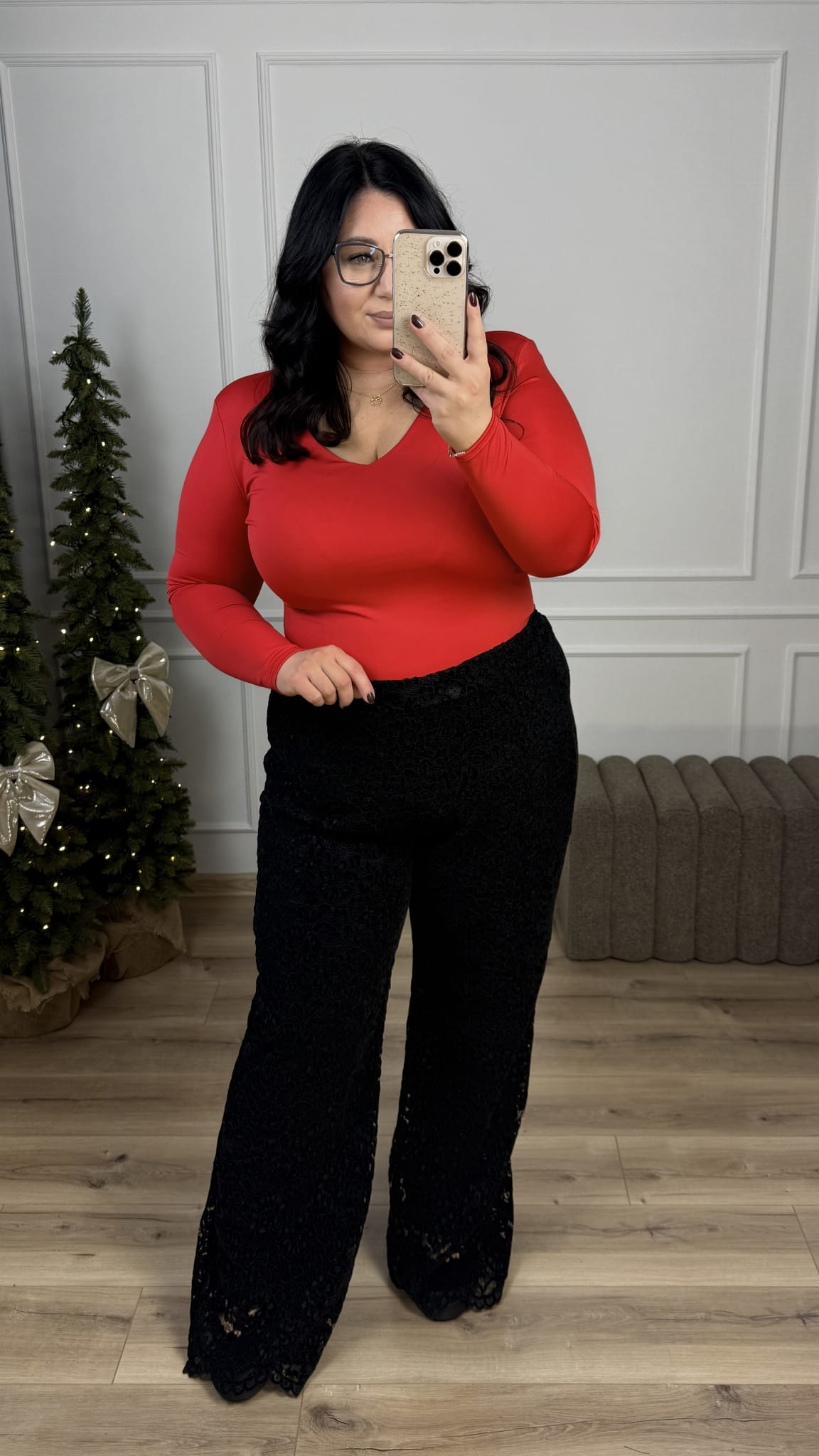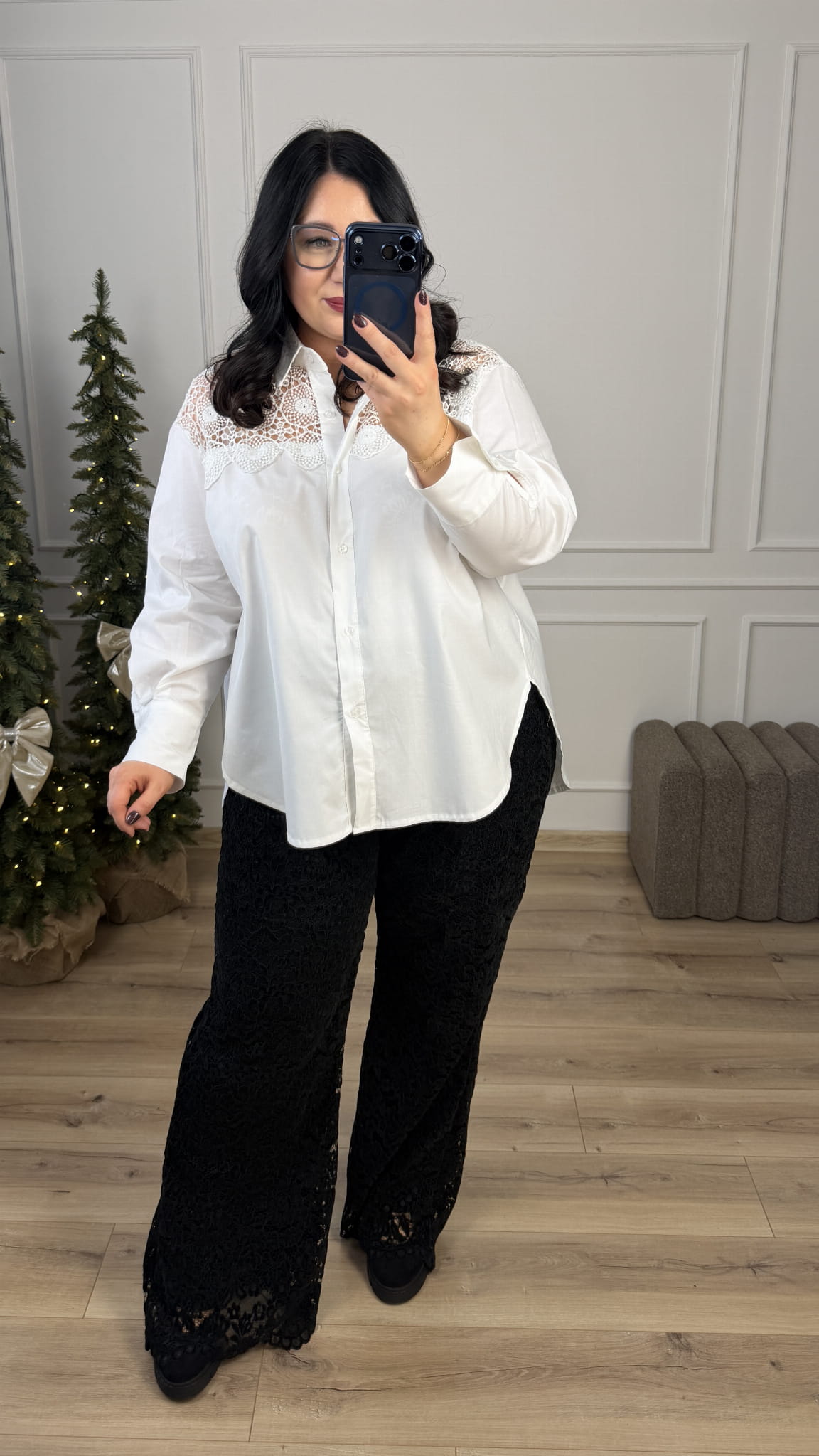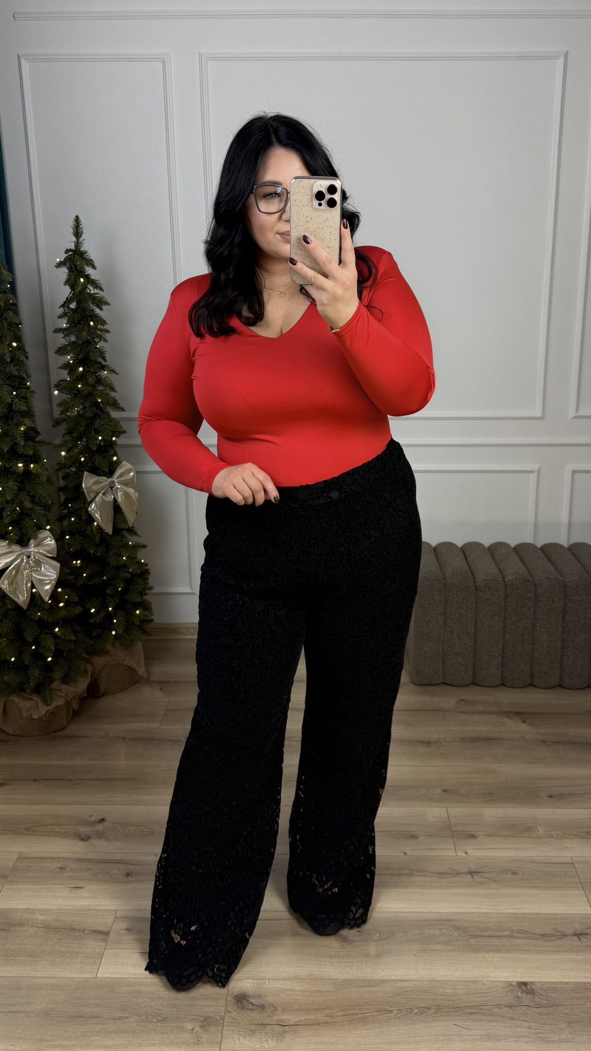 Spodnie koronkowe z wysokim stanem. Spodnie koronkowe o kroju typu flare z wysokim stanem. Spodnie posiadają prosty pas z przodu oraz gumkę z tyłu przez co dopasowują się do sylwetki. Spodnie posiadają podszewkę. Spodnie zdecydowanie dla wysokich dziewczyn ponieważ posiadają długie nogawki. Koronkowe spodnie świetnie nadadzą się do stylizacji andrzejkowych, świątecznych czy sylwestrowych.
