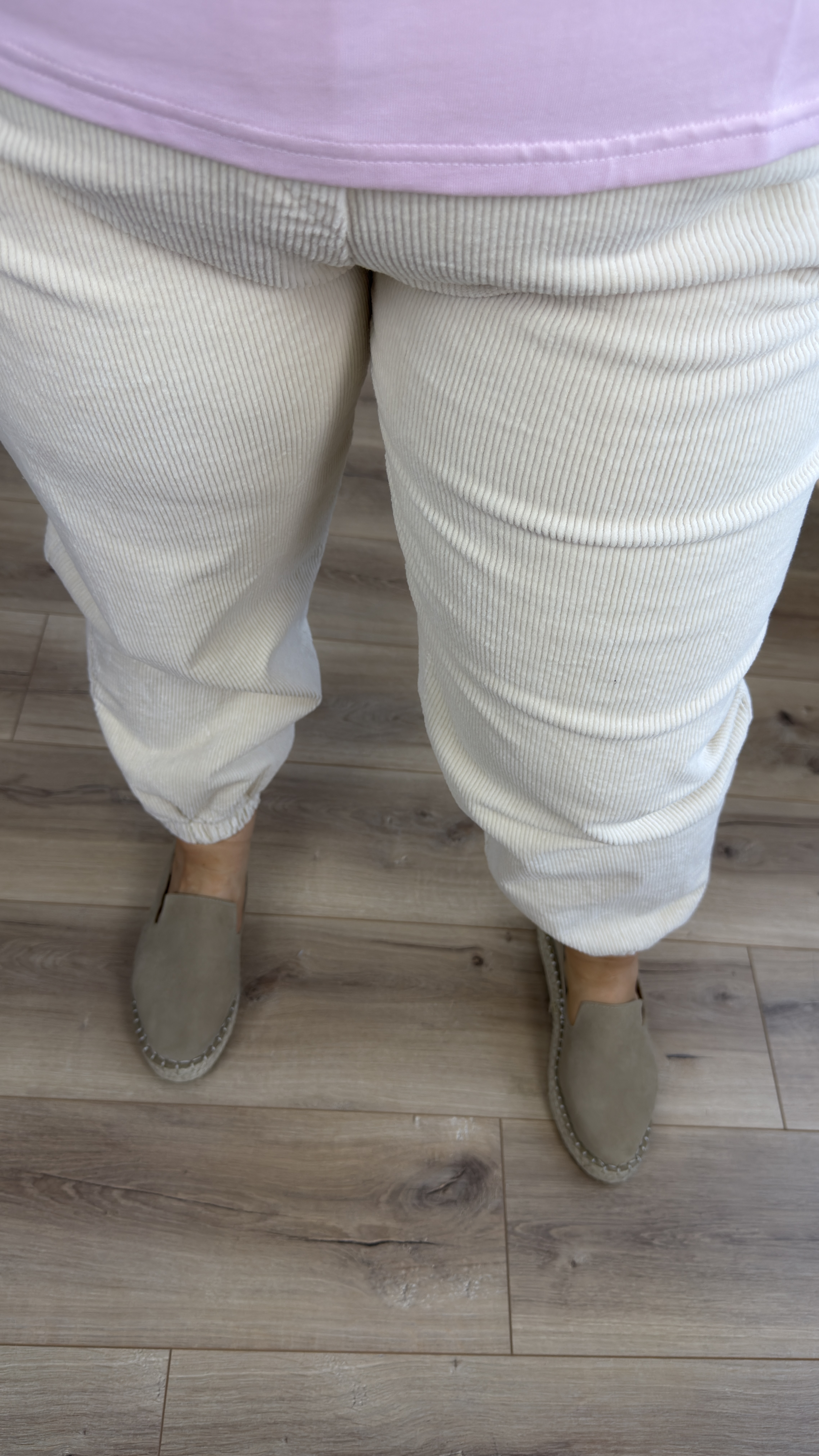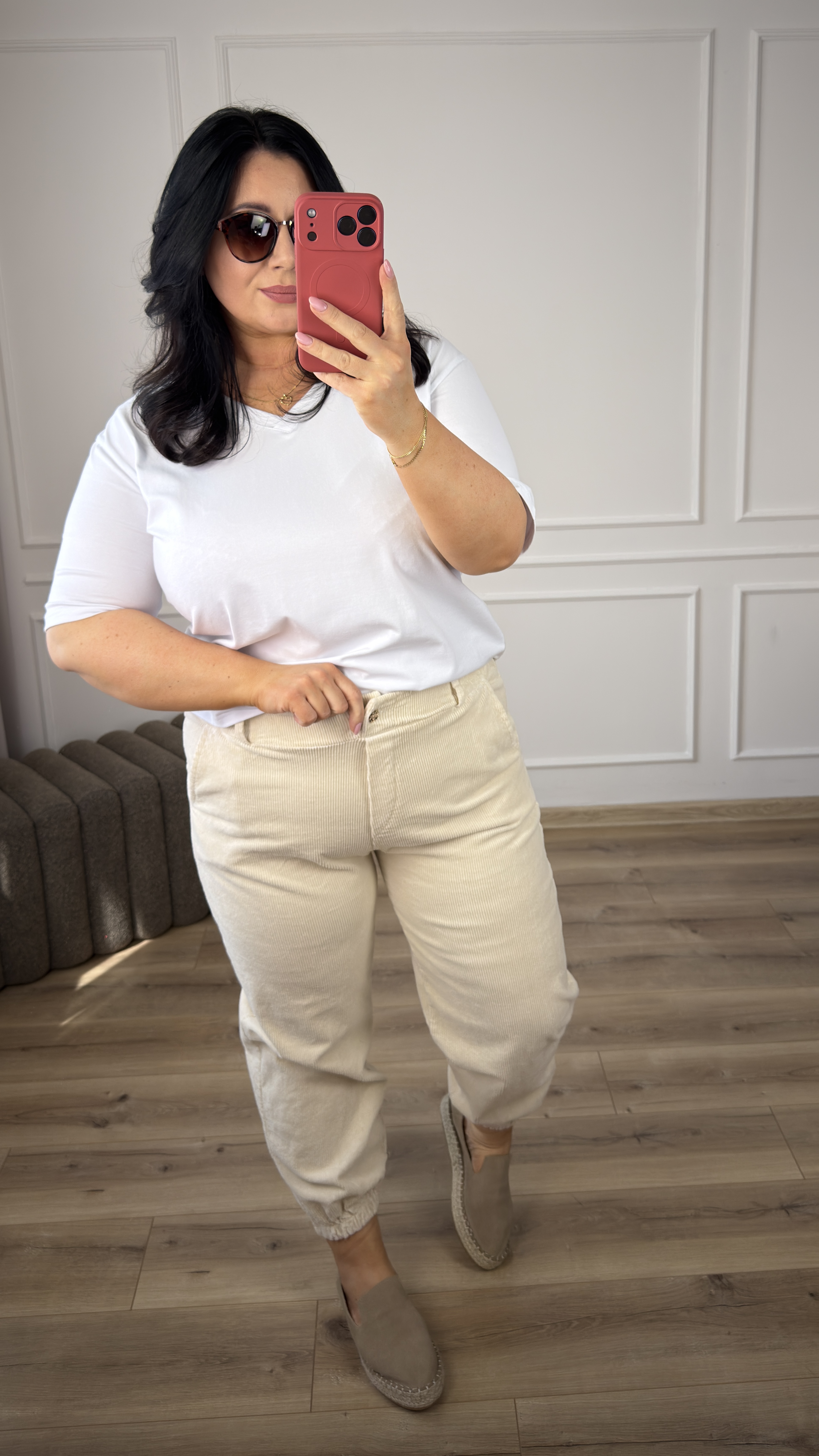 Świetny model spodni z grubszego sztruksu. Model posiada gumkę w pasie - dzięki czeku idealnie dopasuje się do sylwetki. Model posiada ozdobny guzik. Luźniejsza nogawka, zakończona gumką na dole. Spodnie posiadają kieszenie.