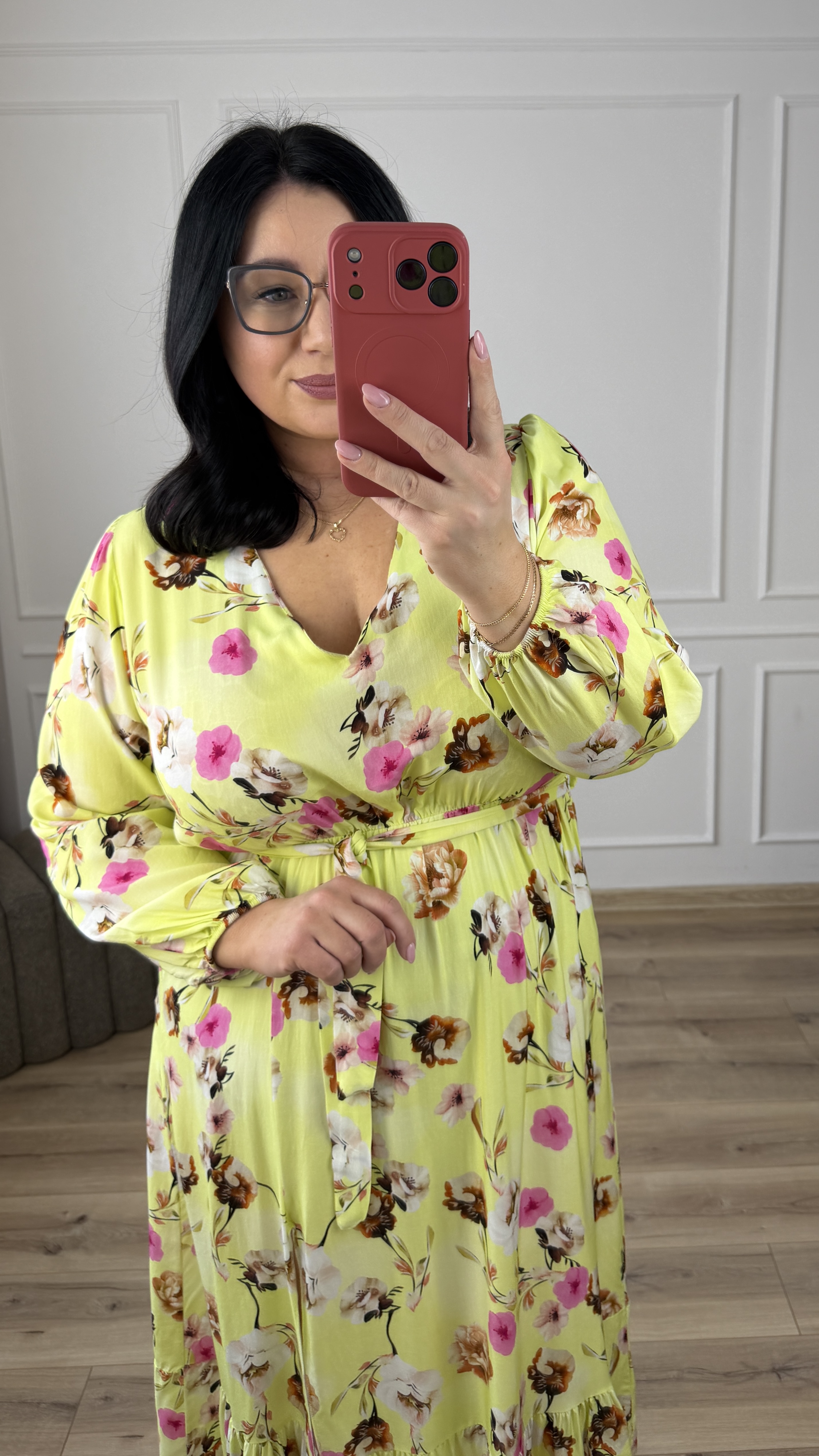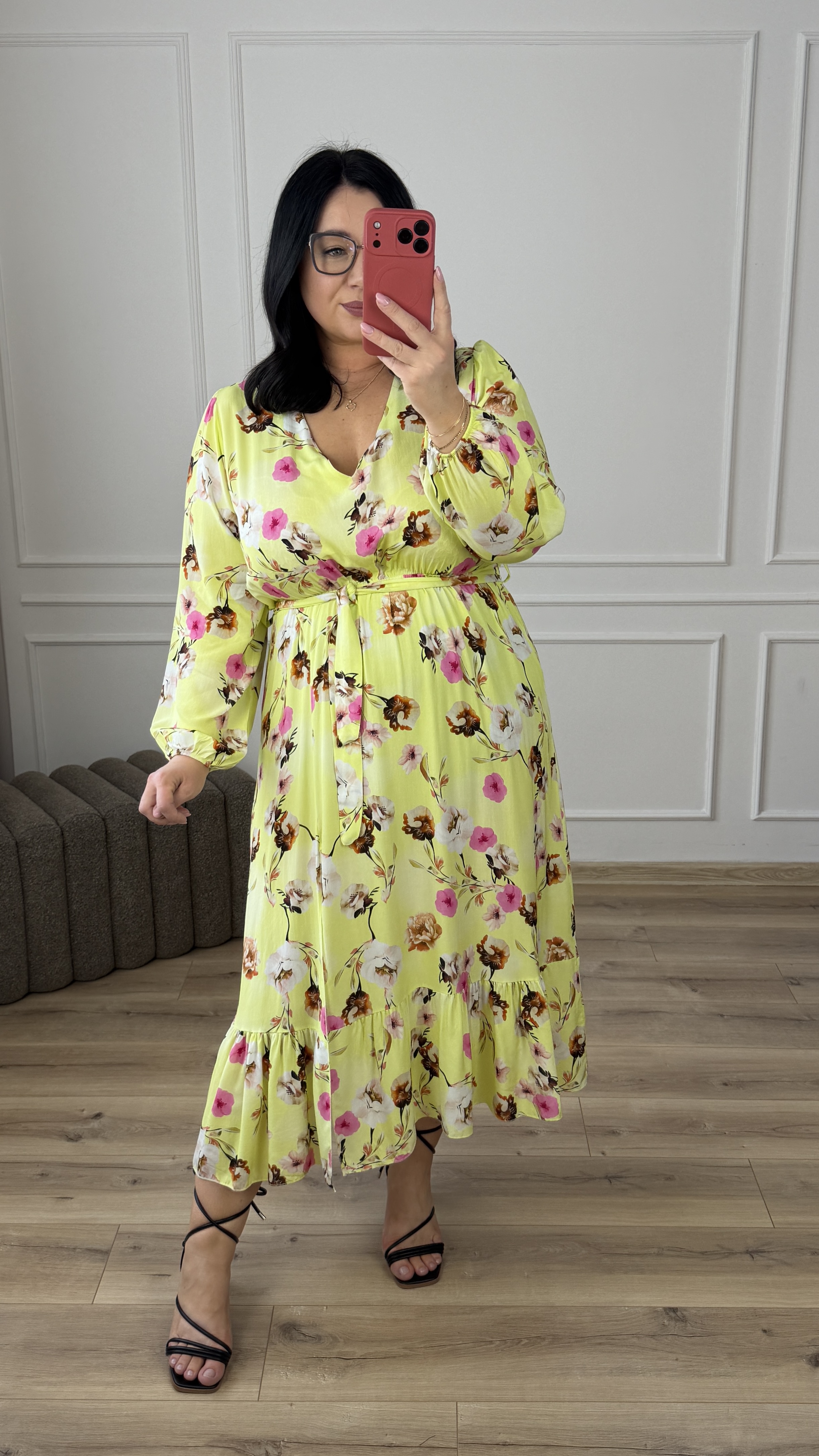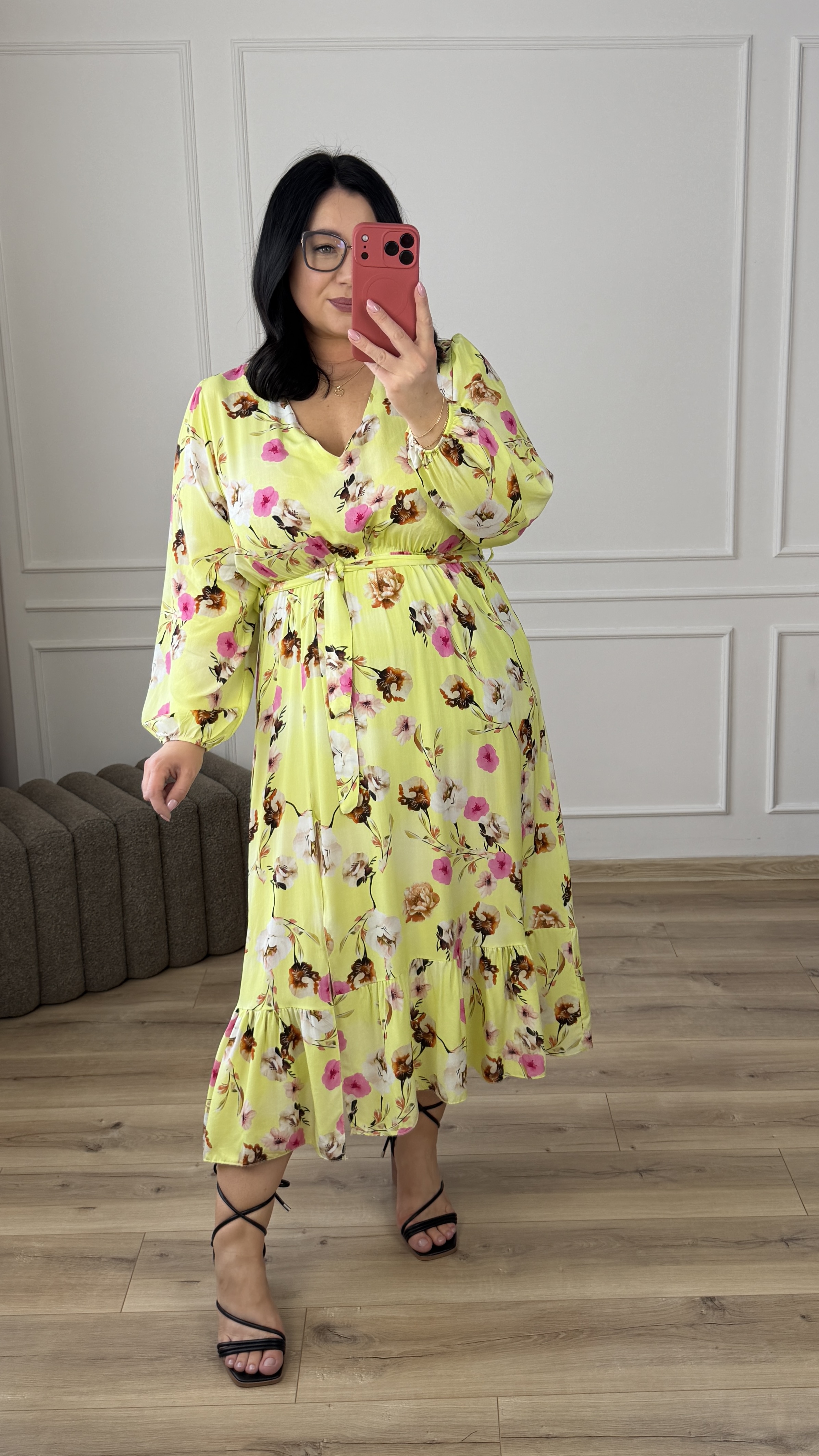 Rozkloszowana spódnica długości midi, nadaje jej lekkości i dziewczęcego wdzięku. Sukienka świetnie sprawdzi się na okazjonalne wyjścia jak i również na co dzień.