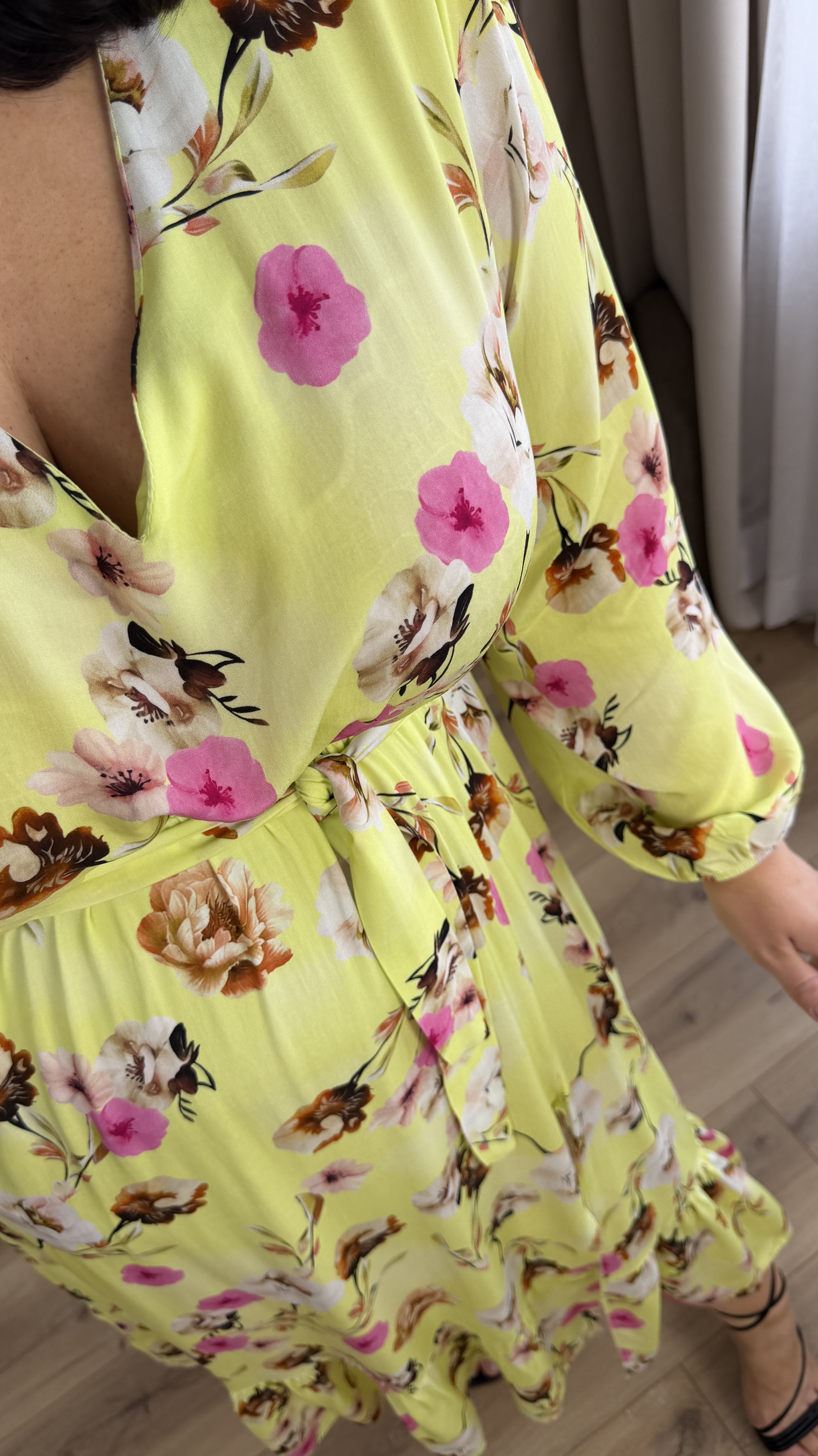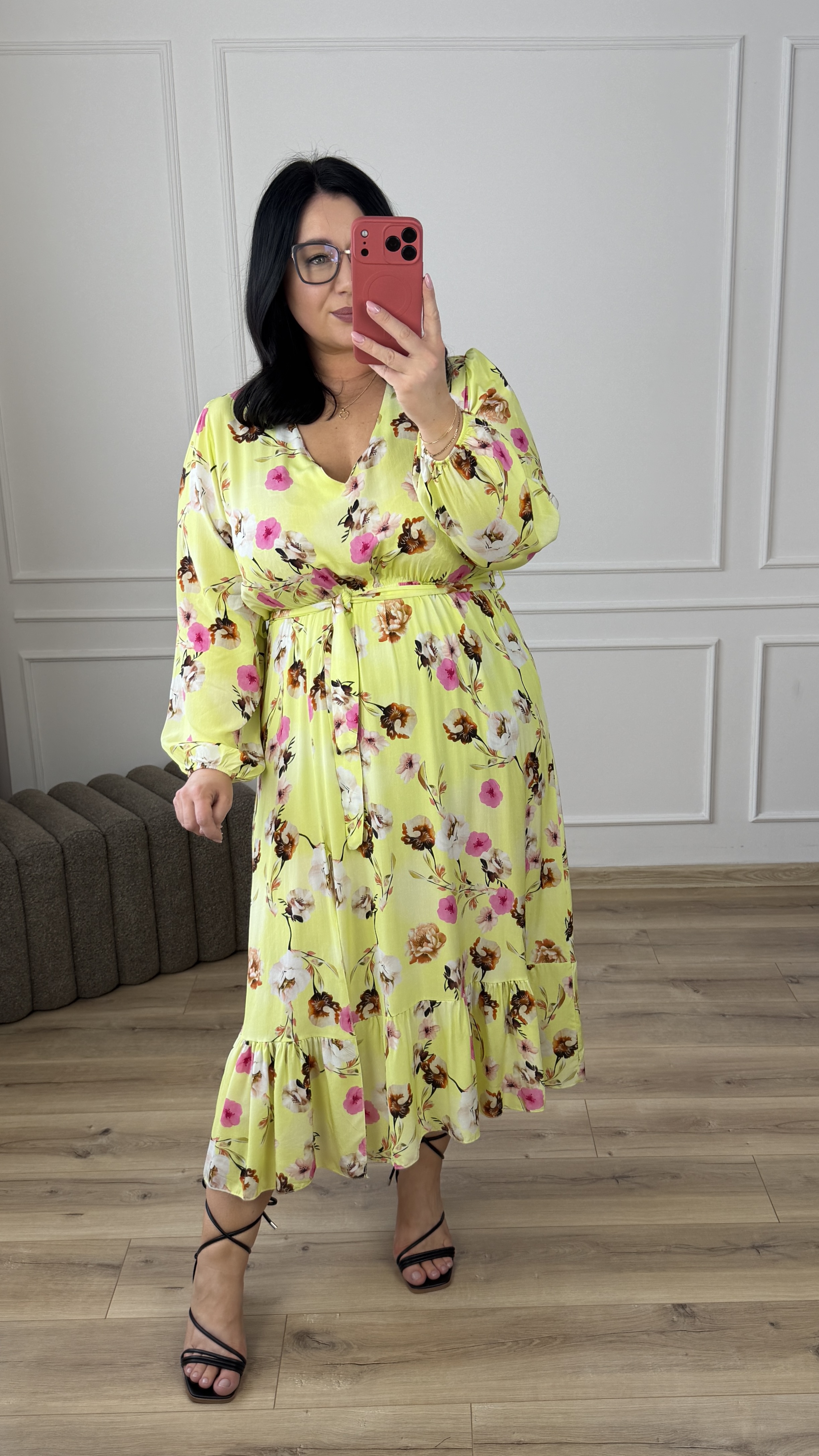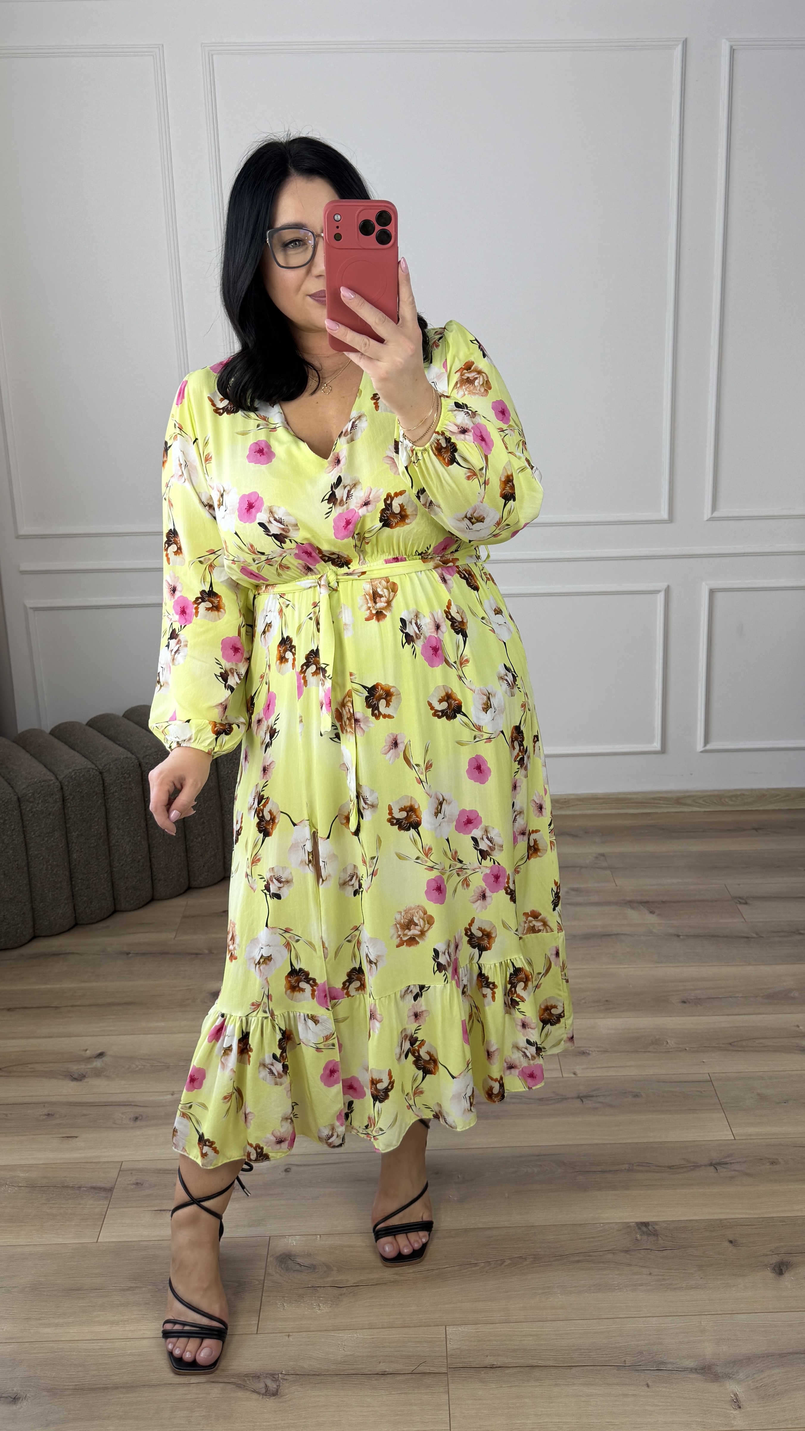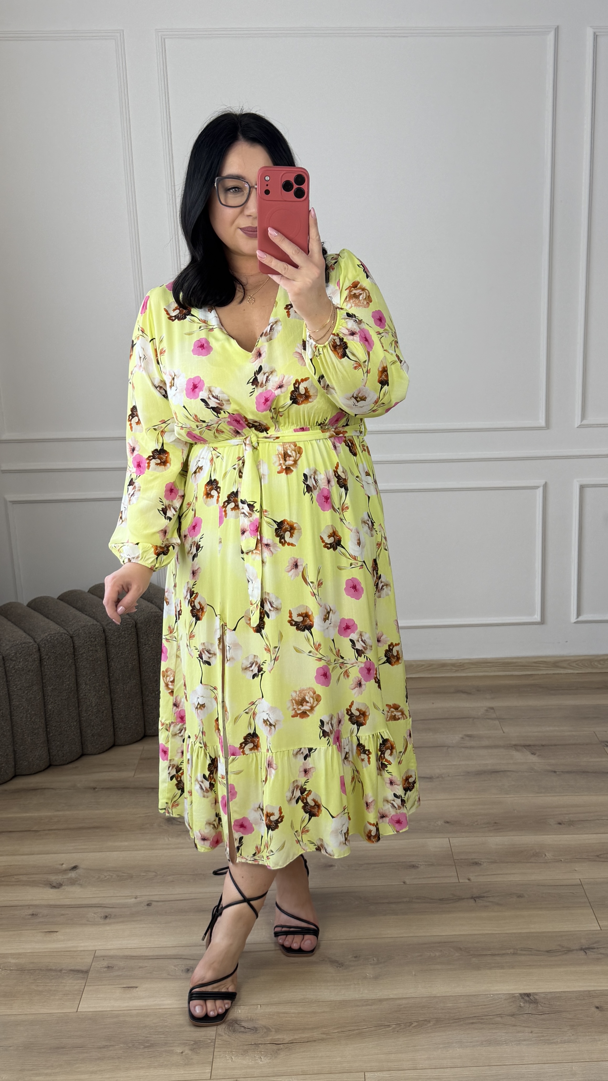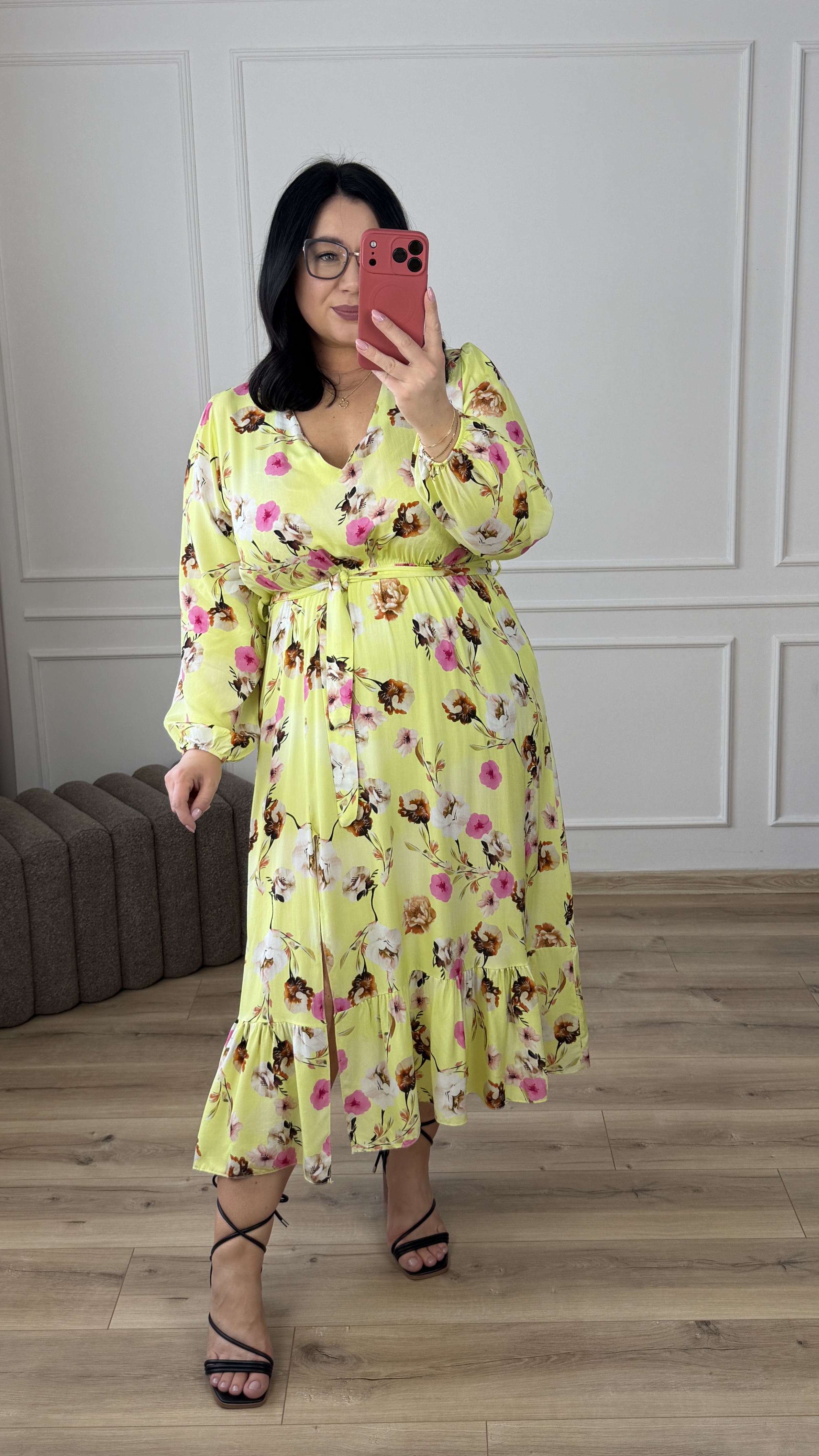 Elegancka sukienka z wiskozy z uroczym rozcięciem przy spódnicy. Sukienka posiada delikatny dekolt w serek, długi rękaw zakończony gumką. Sukienka posiada gumkę w pasie oraz wiązany pasek, dzięki czemu ładnie podkreśla talię.