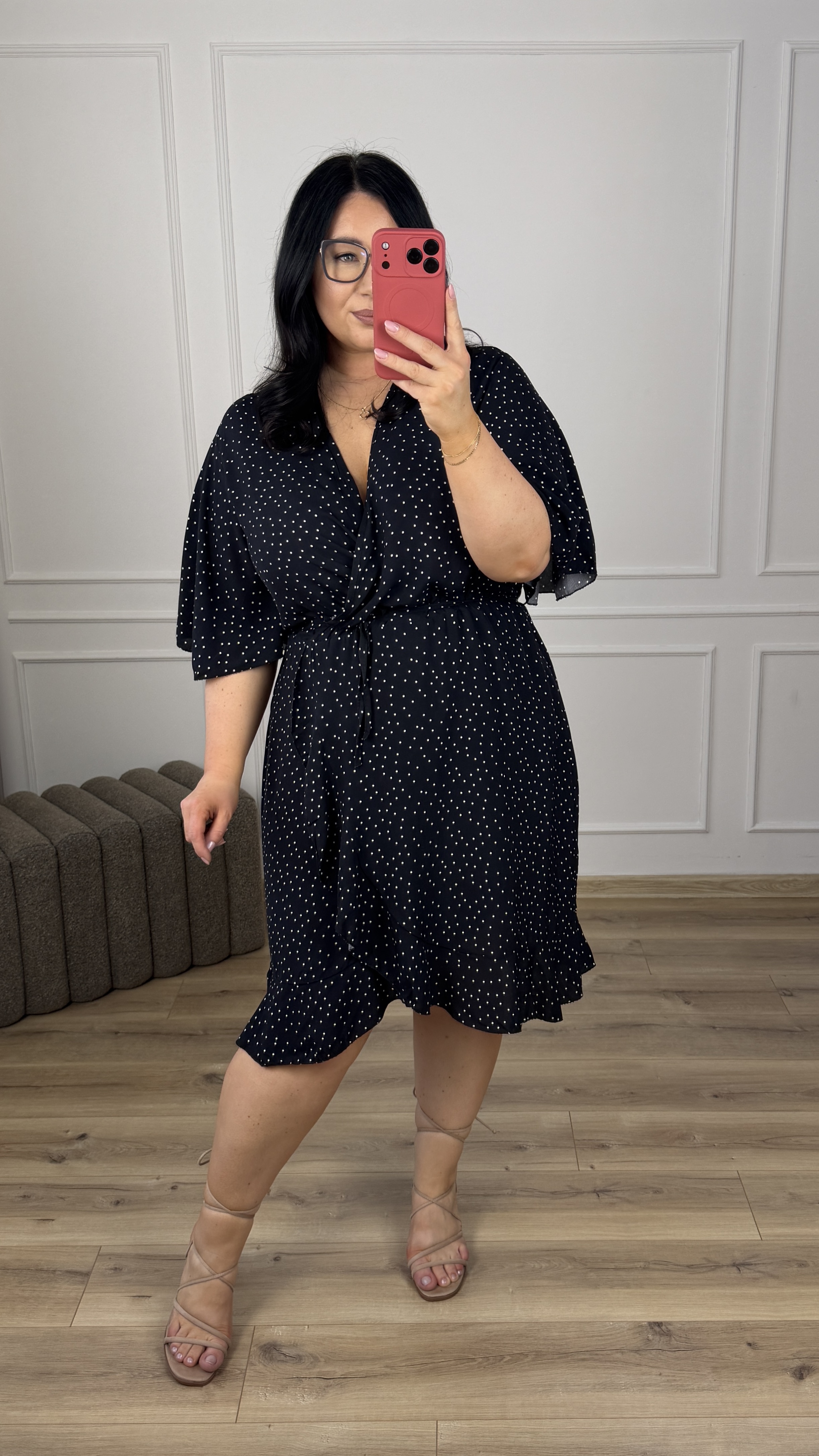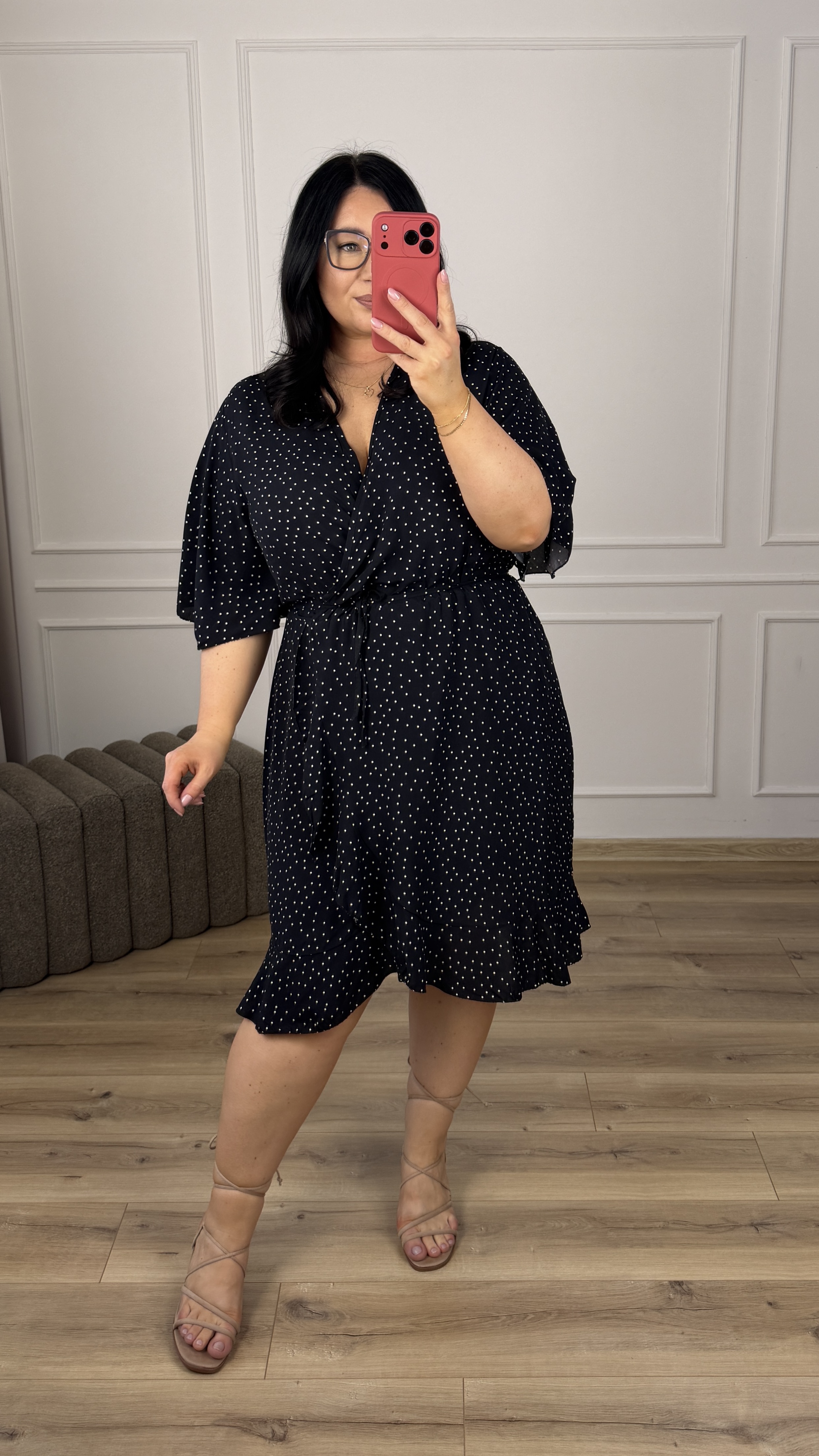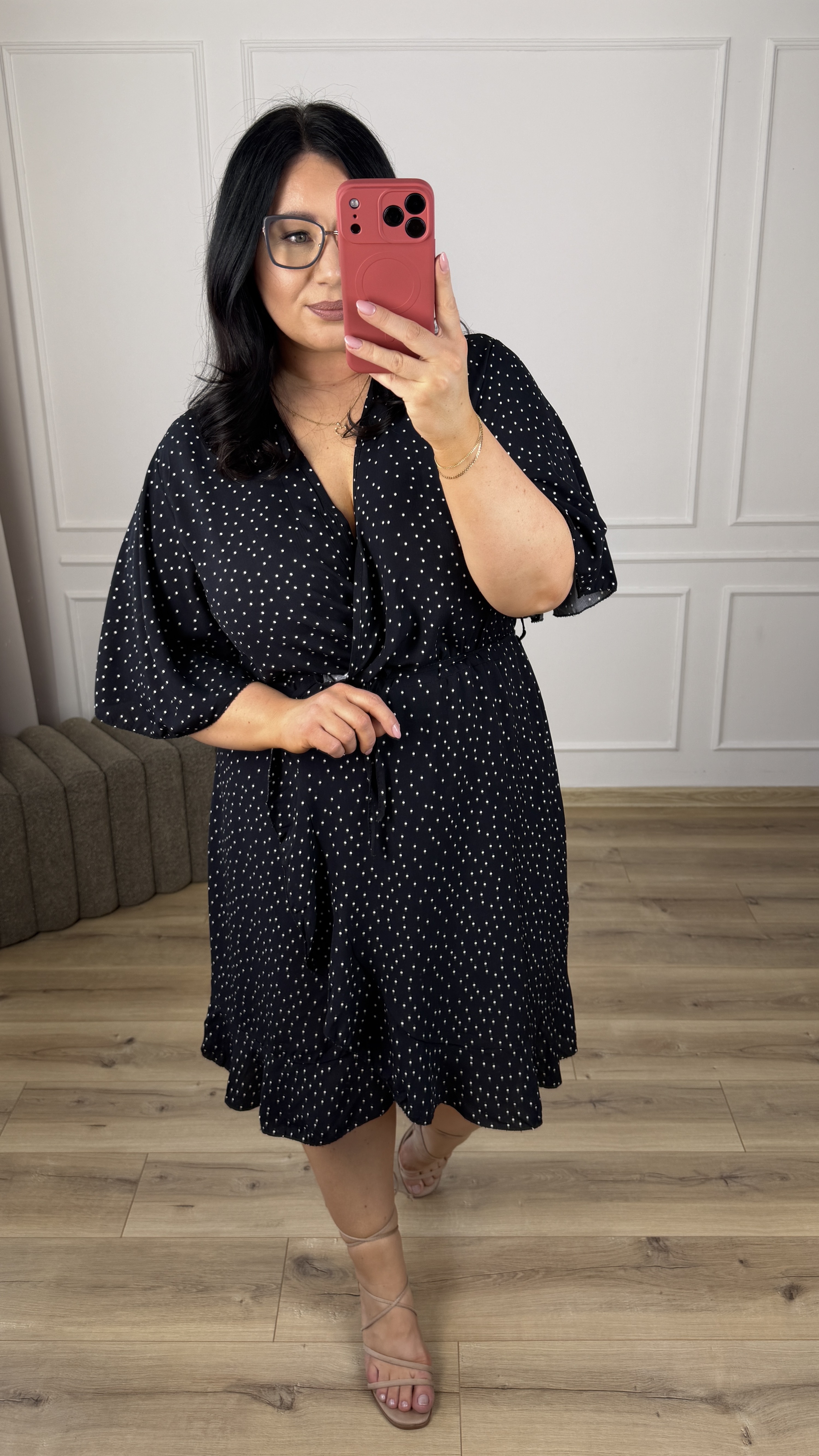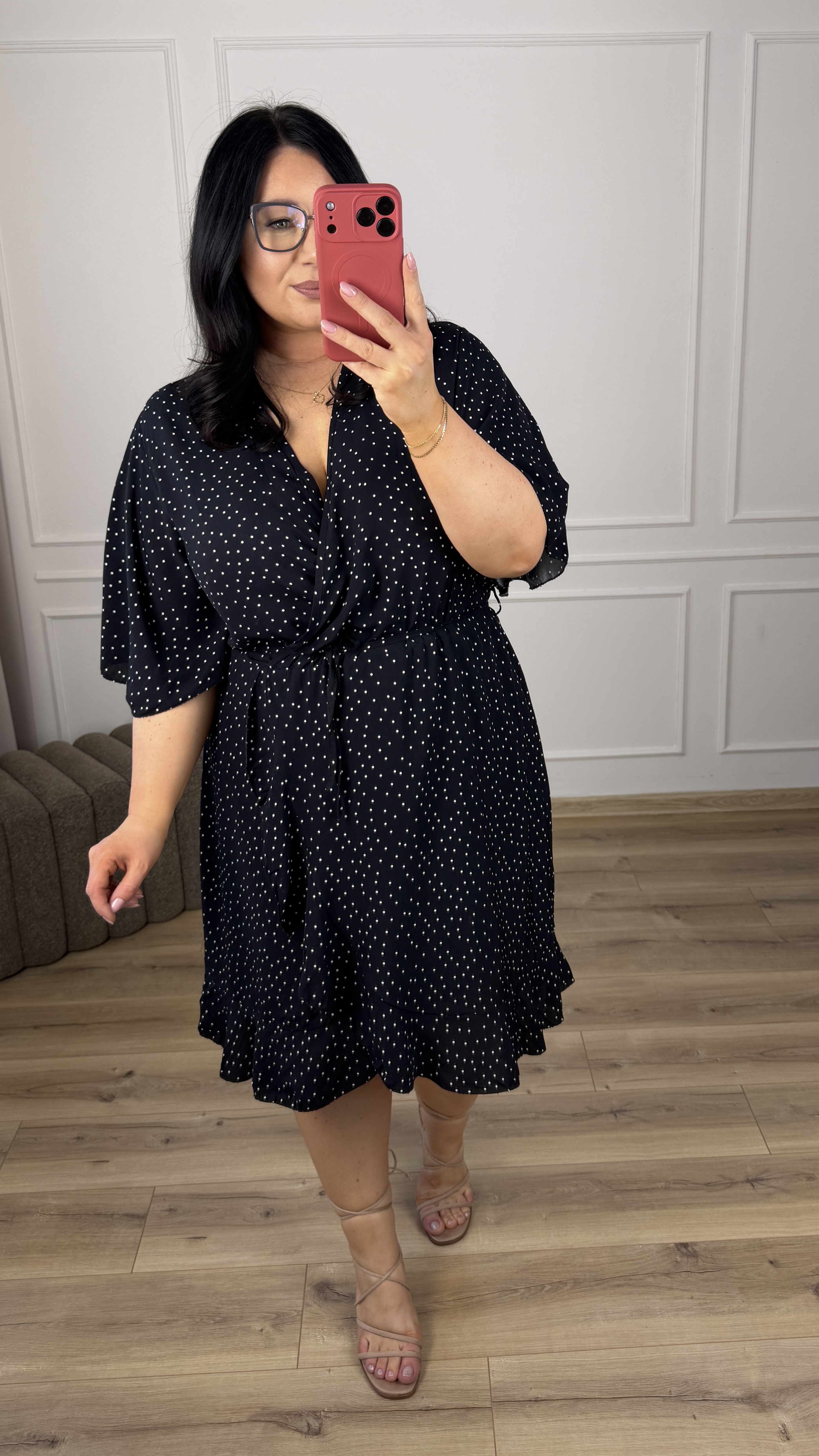 Klasyczna wiskozowa sukienka. Model z zakładanym większym dekoltem. Krótki motylkowy rękaw, gumka w pasie oraz delikatny wiązany pasek. Spódnica o prostym kroju delikatnie rozszerzana ku dołowi, zakładana - wykończona falbaną. Sukienka dzięki swojej uniwersalności idealnie sprawdzi się na co dzień jak i również na większe wyjścia.
