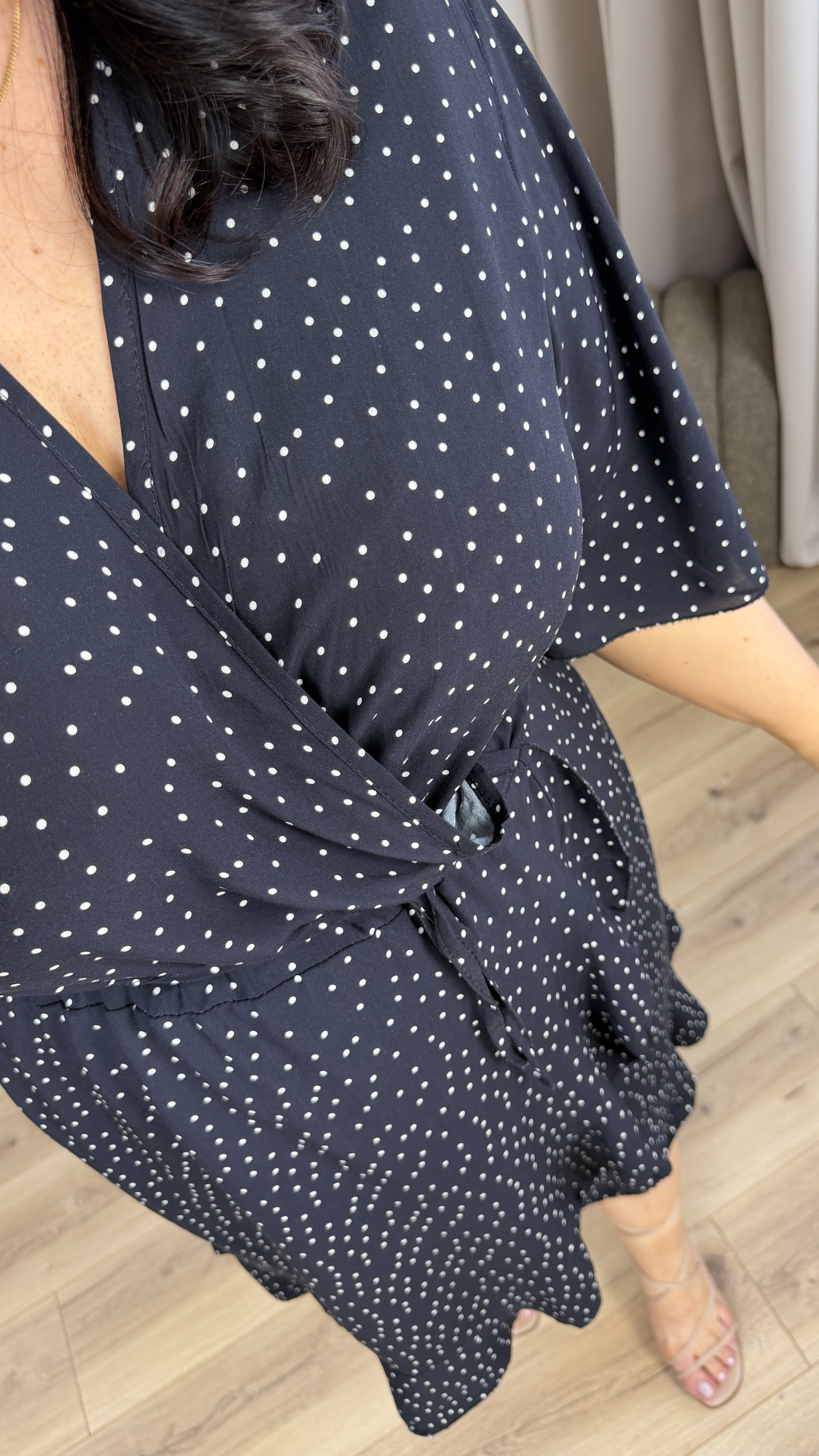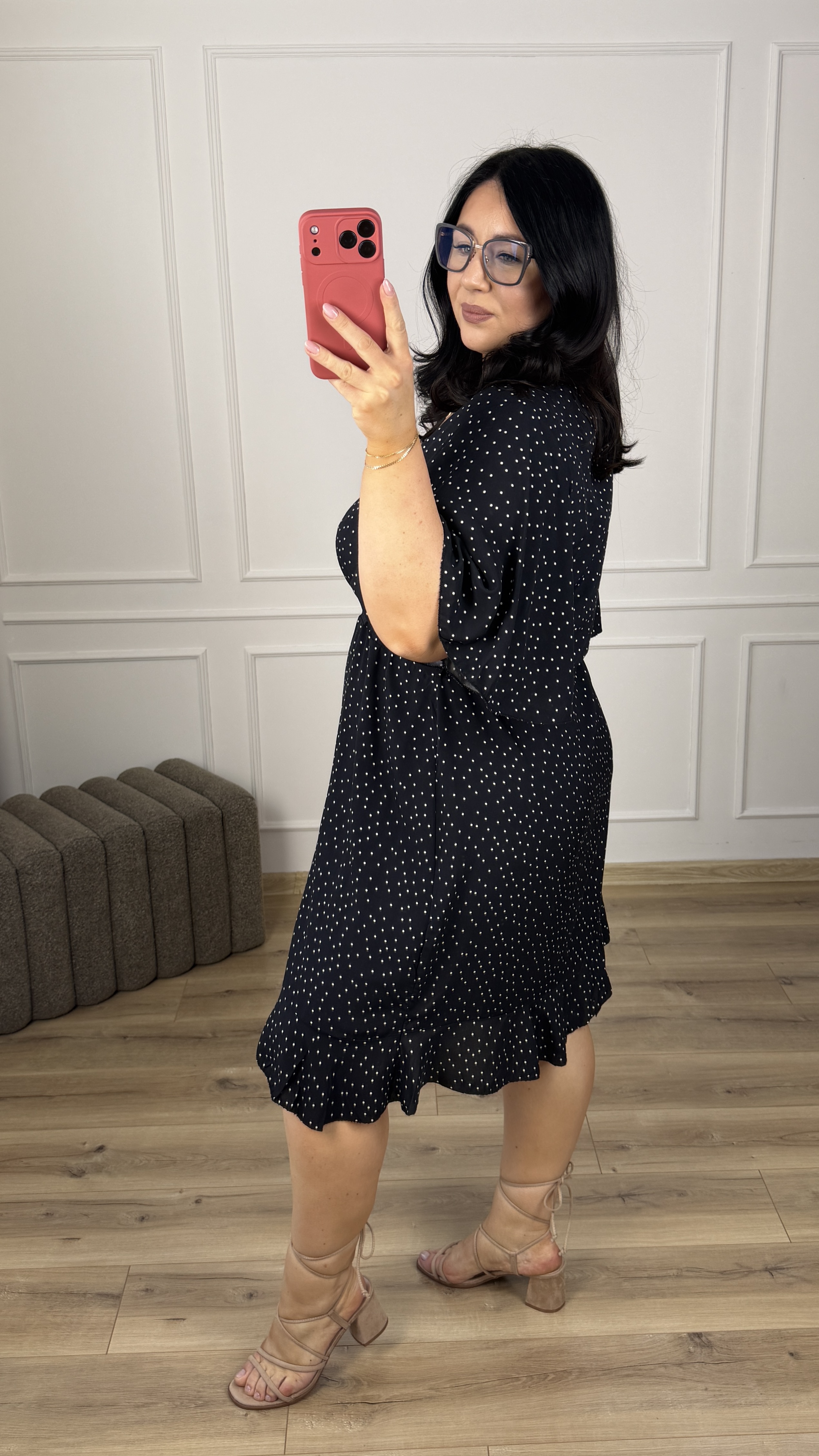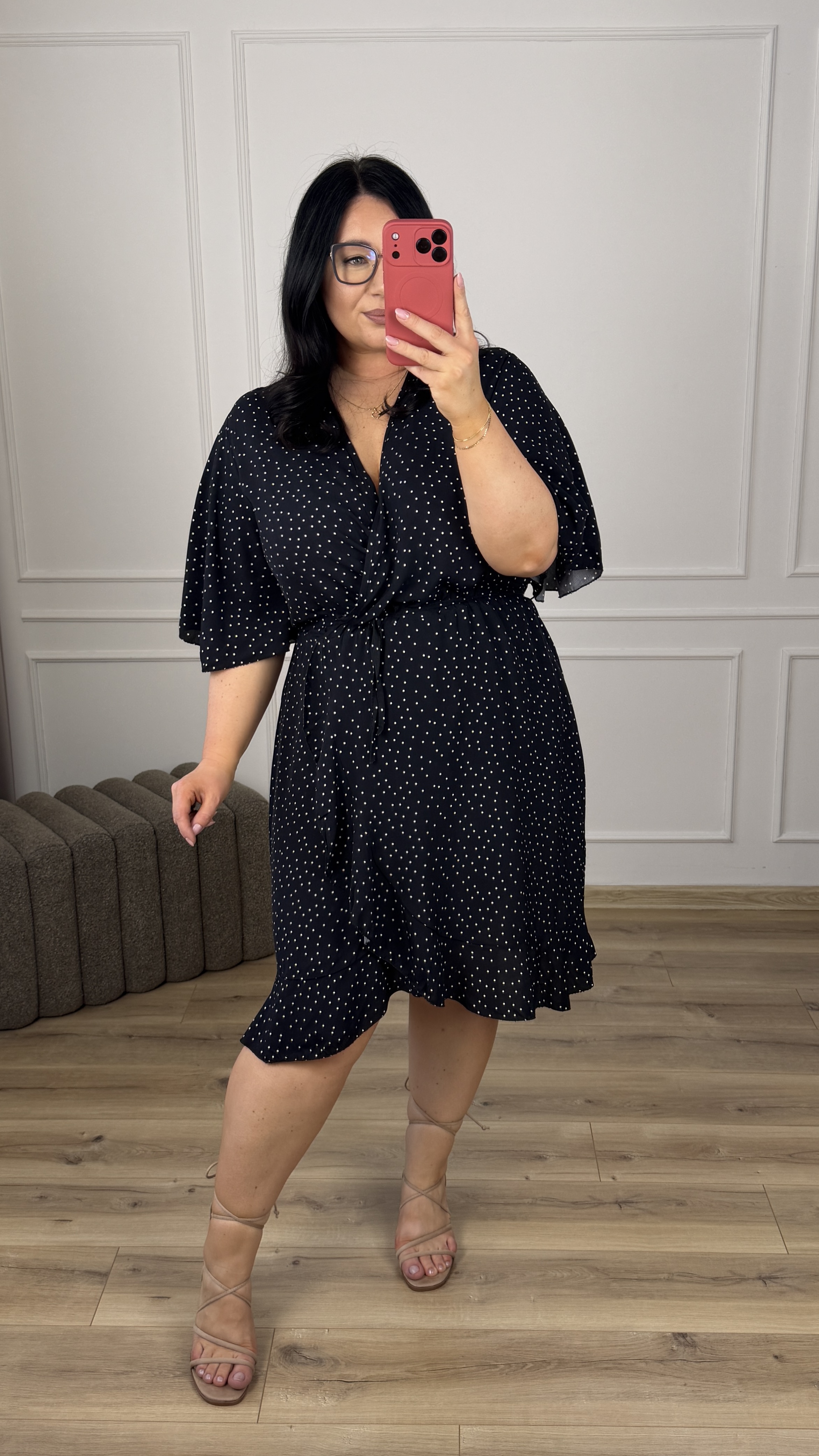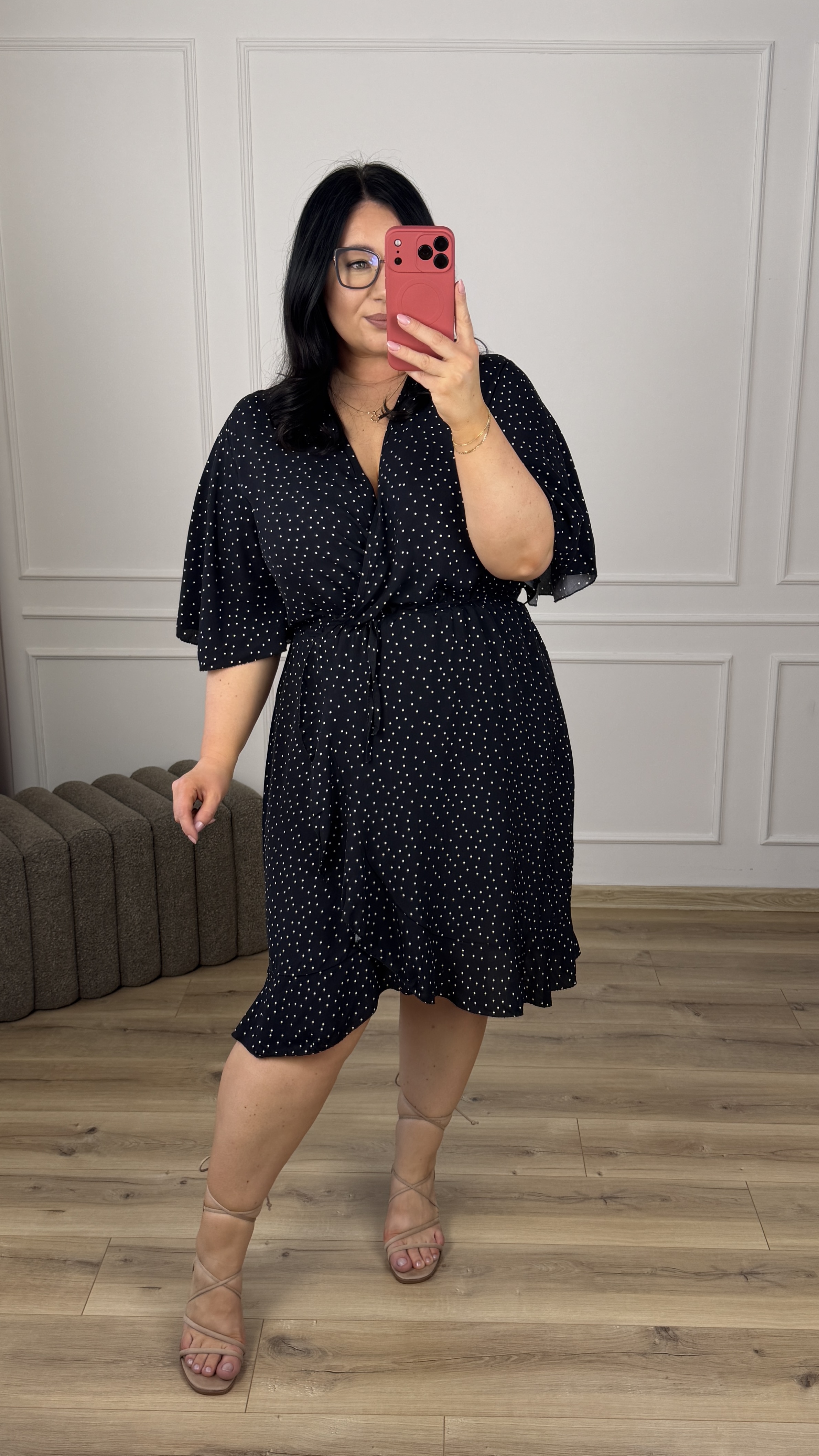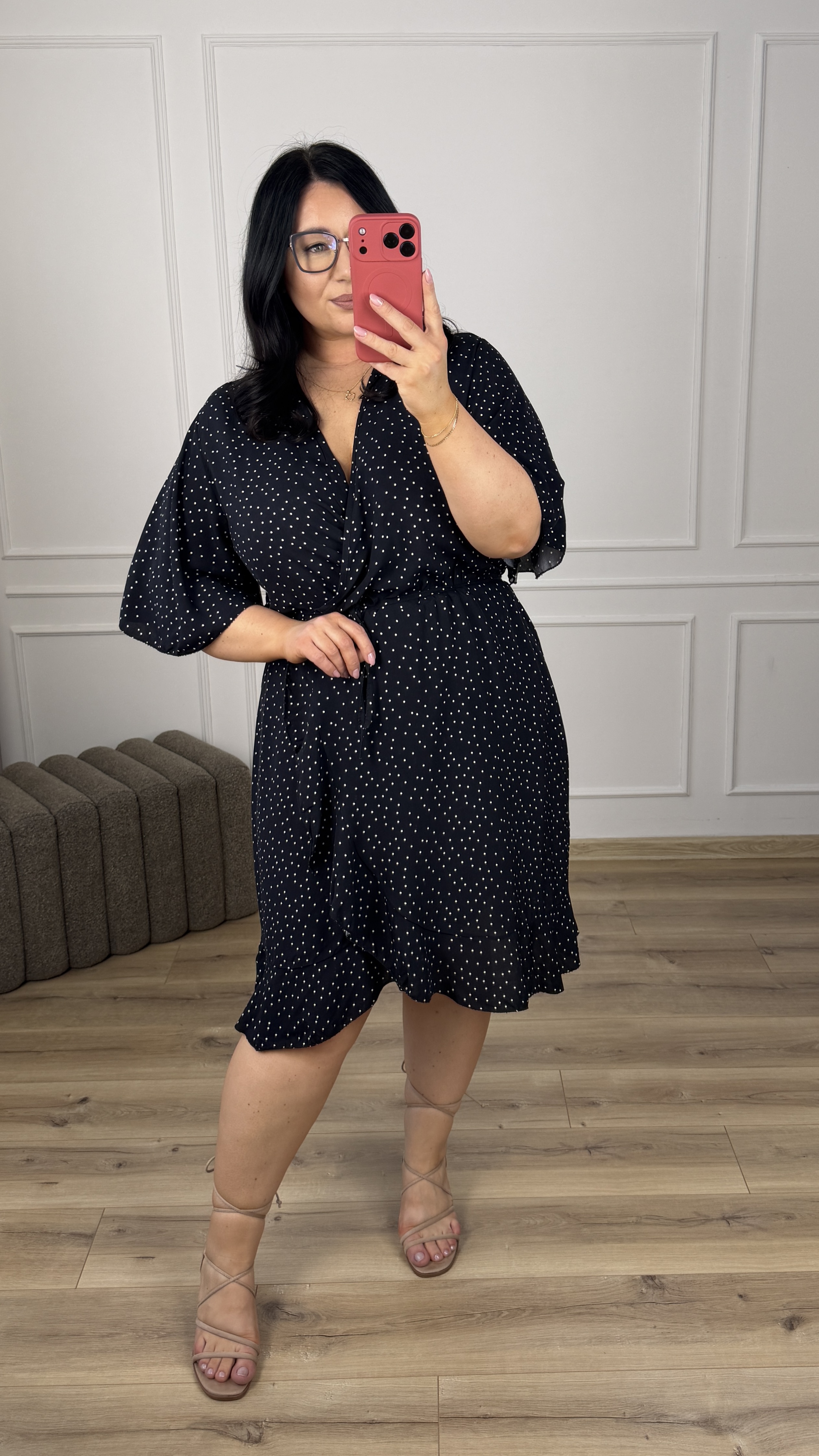 Klasyczna wiskozowa sukienka. Model z zakładanym większym dekoltem. Krótki motylkowy rękaw, gumka w pasie oraz delikatny wiązany pasek. Spódnica o prostym kroju delikatnie rozszerzana ku dołowi, zakładana - wykończona falbaną. Sukienka dzięki swojej uniwersalności idealnie sprawdzi się na co dzień jak i również na większe wyjścia.