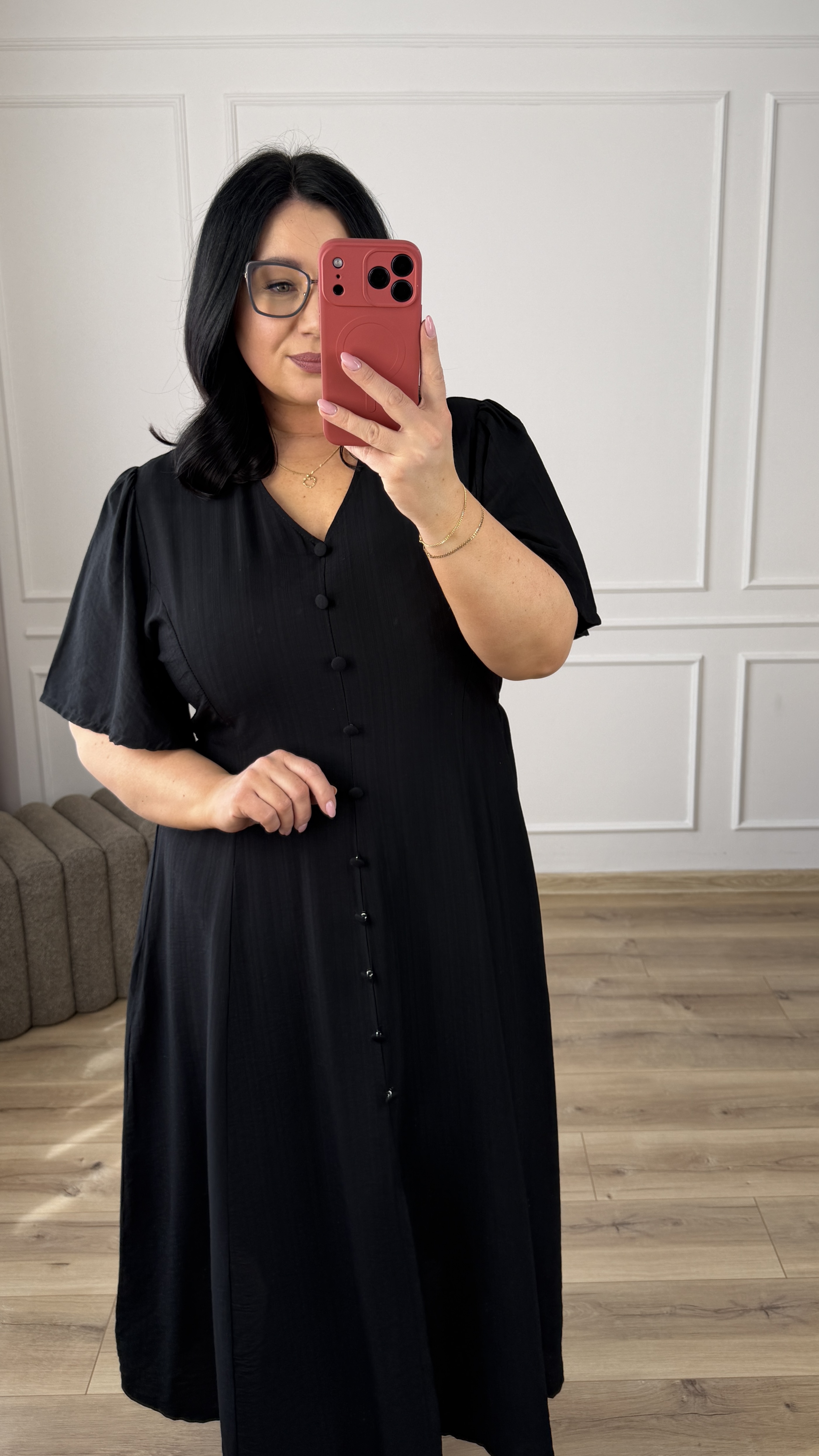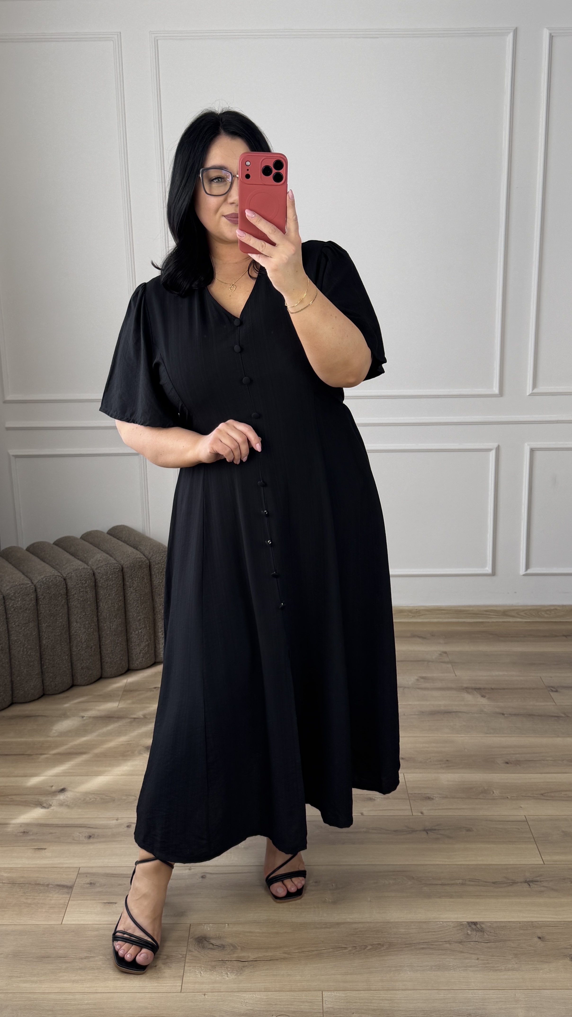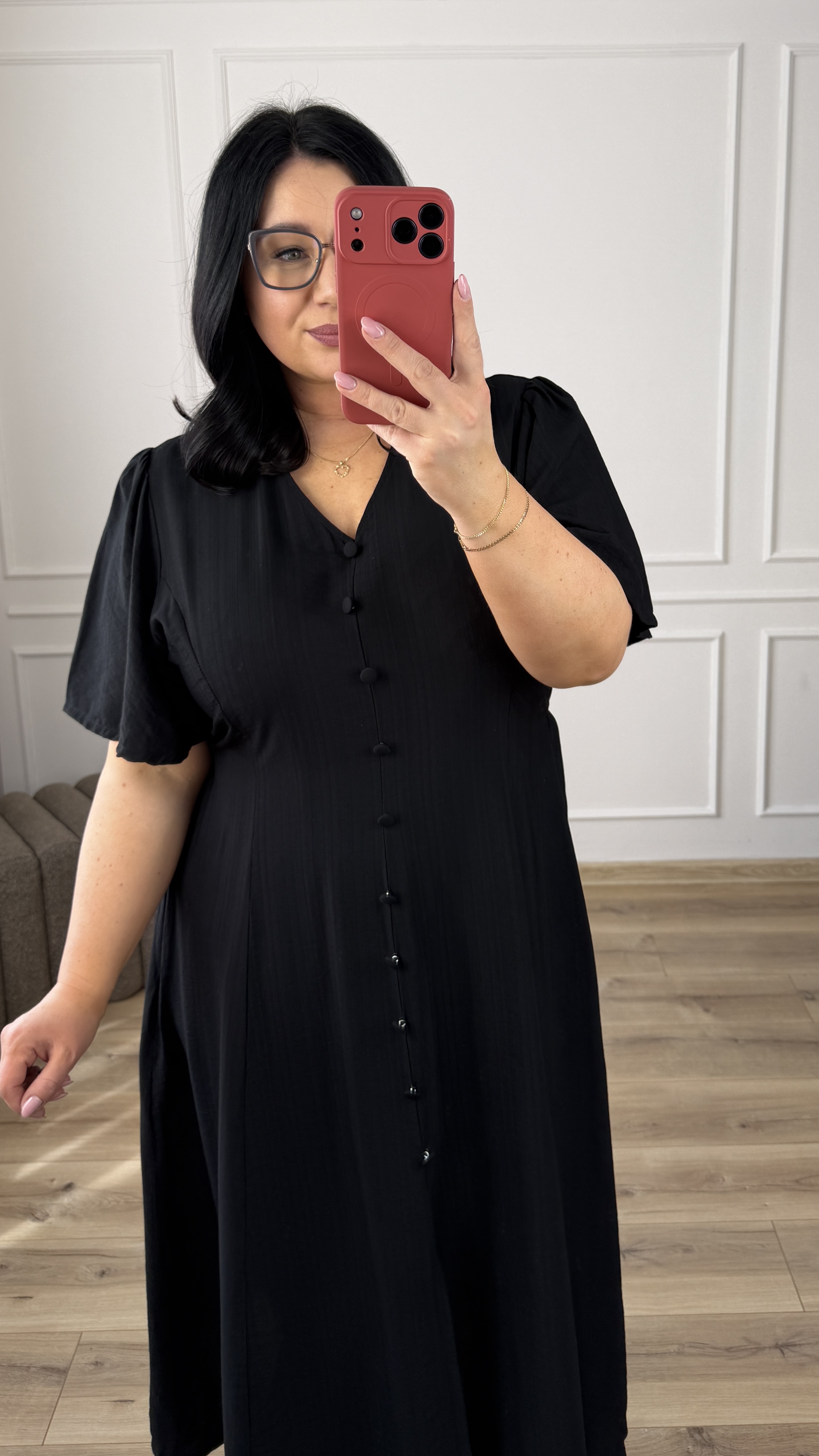 Elegancka sukienka z wiskozy z ozdobnymi guzikami z przodu. Model z podkreśloną talią oraz rozkloszowaną spódnicą długości midi. Spódnica posiada rozcięcie z przodu. Krótki rękaw delikatnie rozkloszowany, świetnie podkreśla ramiona. Model o swobodnym fasonie zapewnia swobodę ruchu i komfort noszenia. Sukienka posiada delikatny dekolt w serek. Rozkloszowana spódnica nadaje jej lekkości i dziewczęcego wdzięku. Sukienka świetnie sprawdzi się na okazjonalne wyjścia jak i również na co dzień.