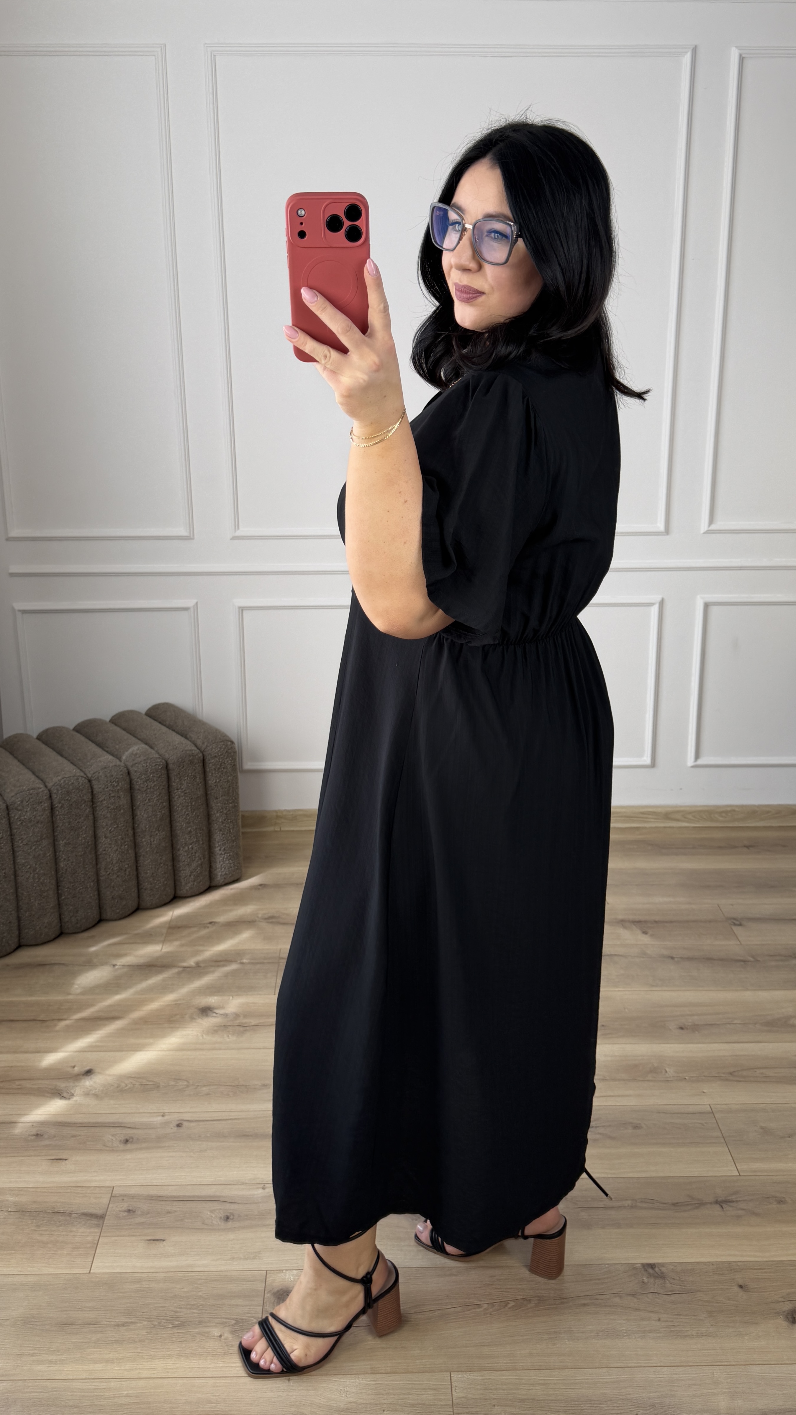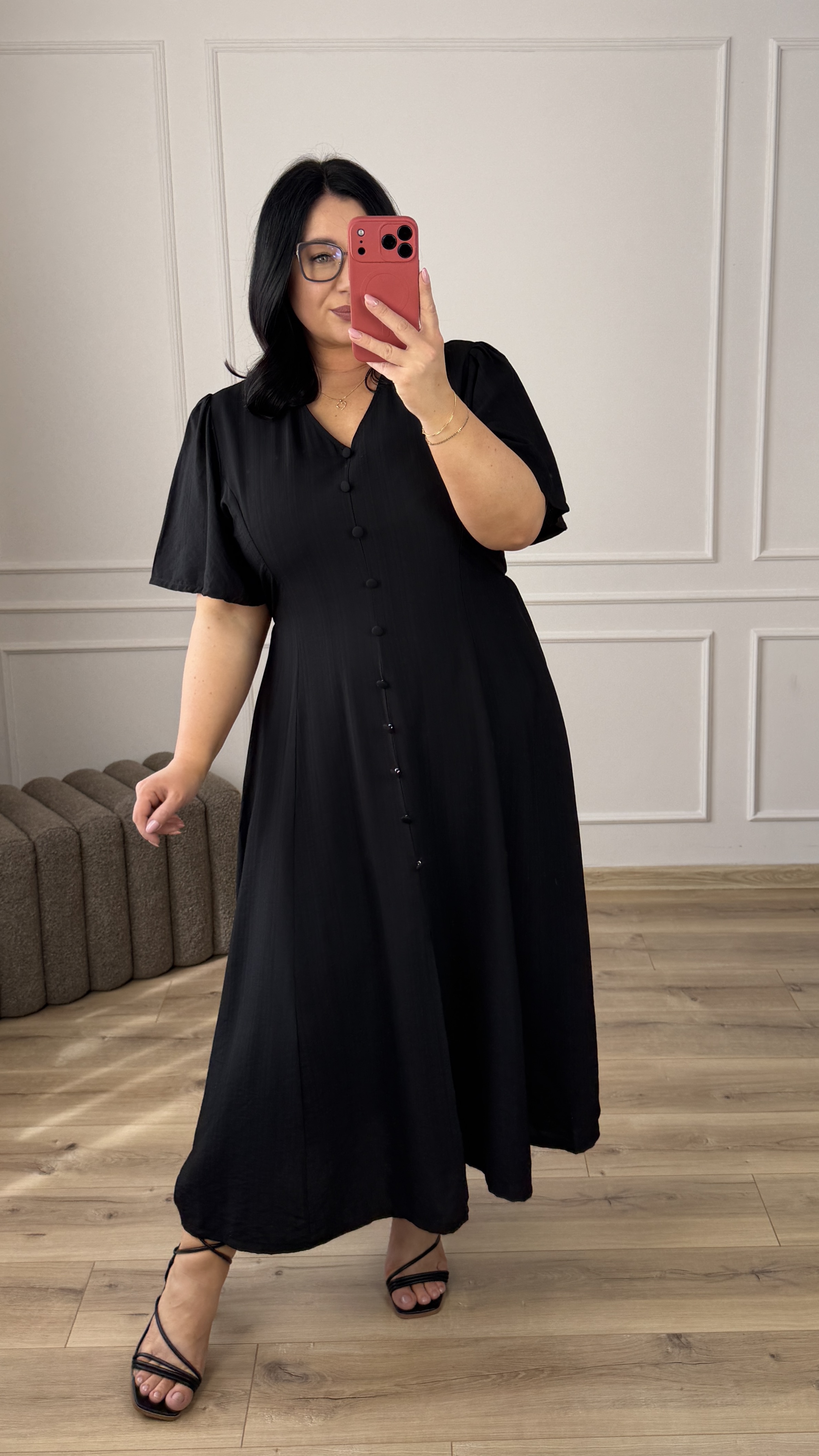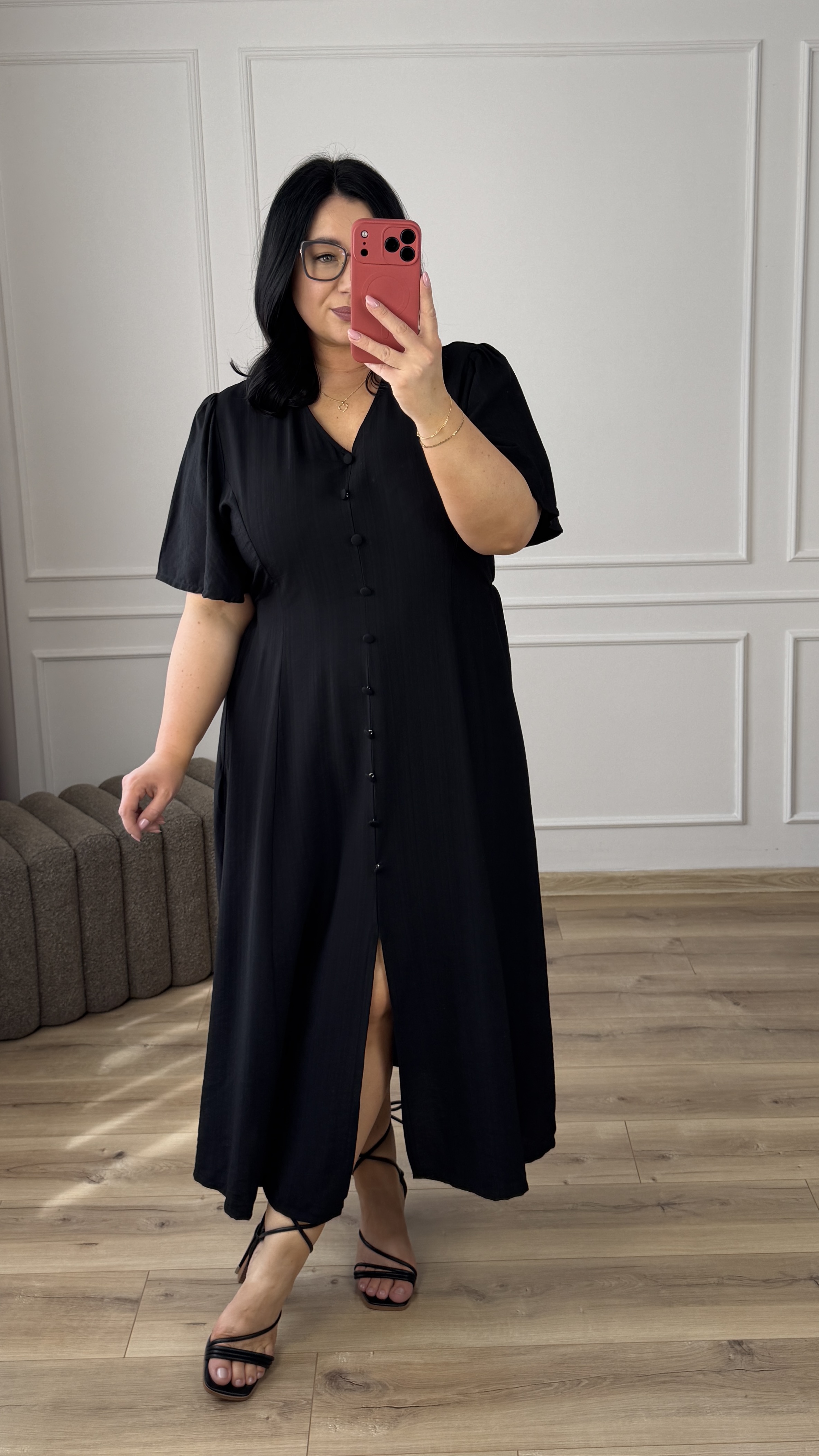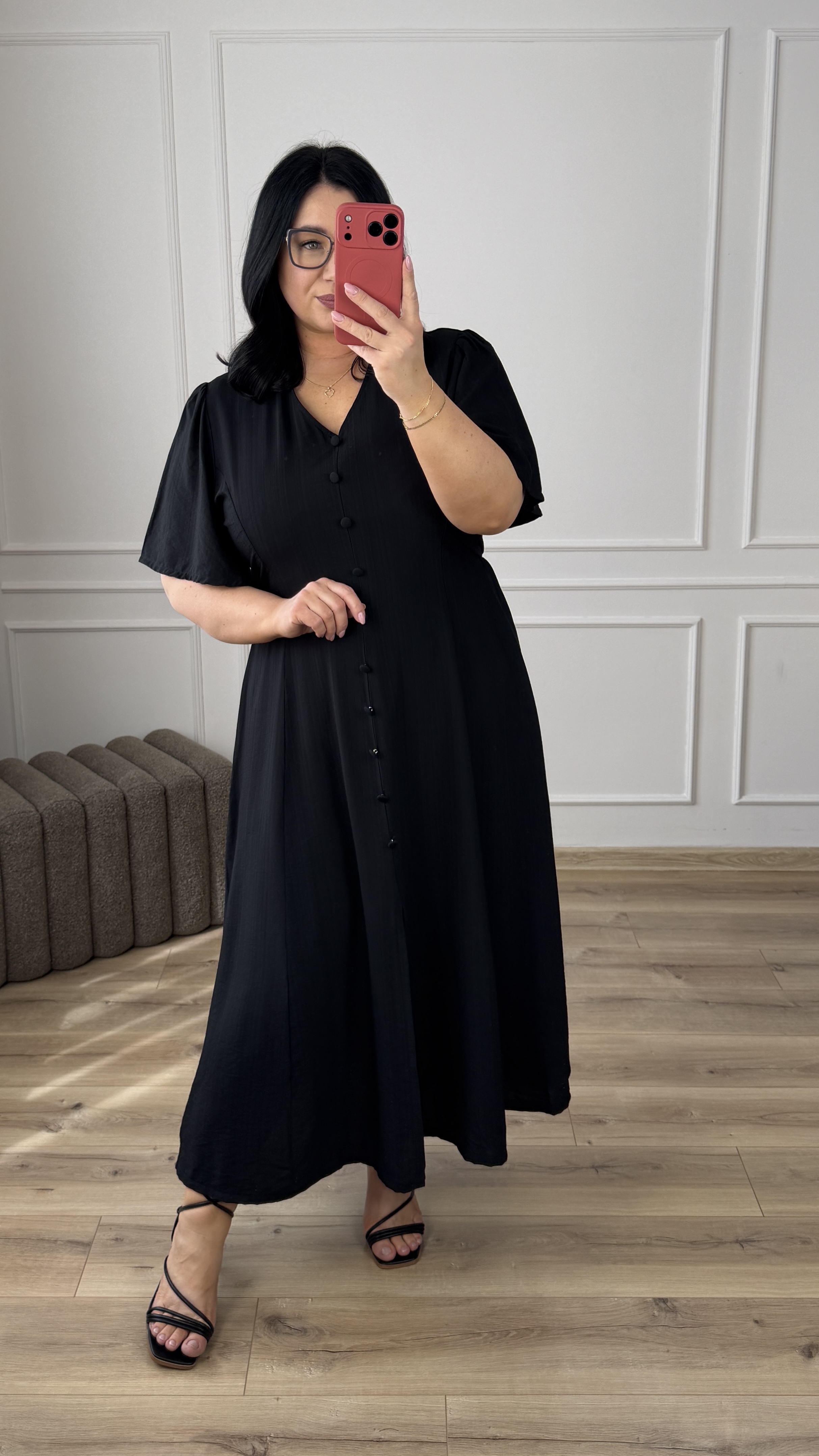 Elegancka sukienka z wiskozy z ozdobnymi guzikami z przodu. Model z podkreśloną talią oraz rozkloszowaną spódnicą długości midi. Spódnica posiada rozcięcie z przodu. Krótki rękaw delikatnie rozkloszowany, świetnie podkreśla ramiona. Model o swobodnym fasonie zapewnia swobodę ruchu i komfort noszenia. Sukienka posiada delikatny dekolt w serek. Rozkloszowana spódnica nadaje jej lekkości i dziewczęcego wdzięku. Sukienka świetnie sprawdzi się na okazjonalne wyjścia jak i również na co dzień.